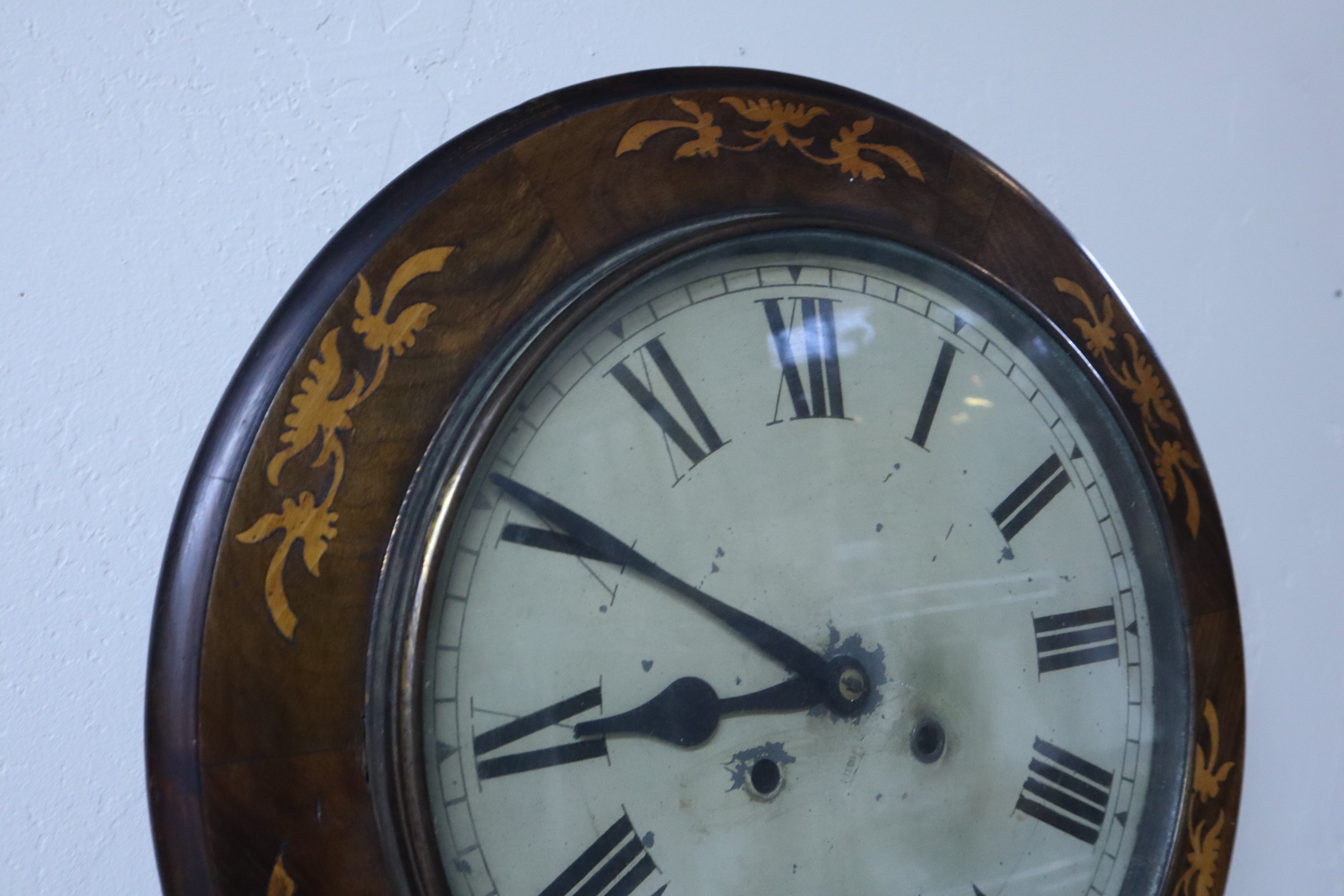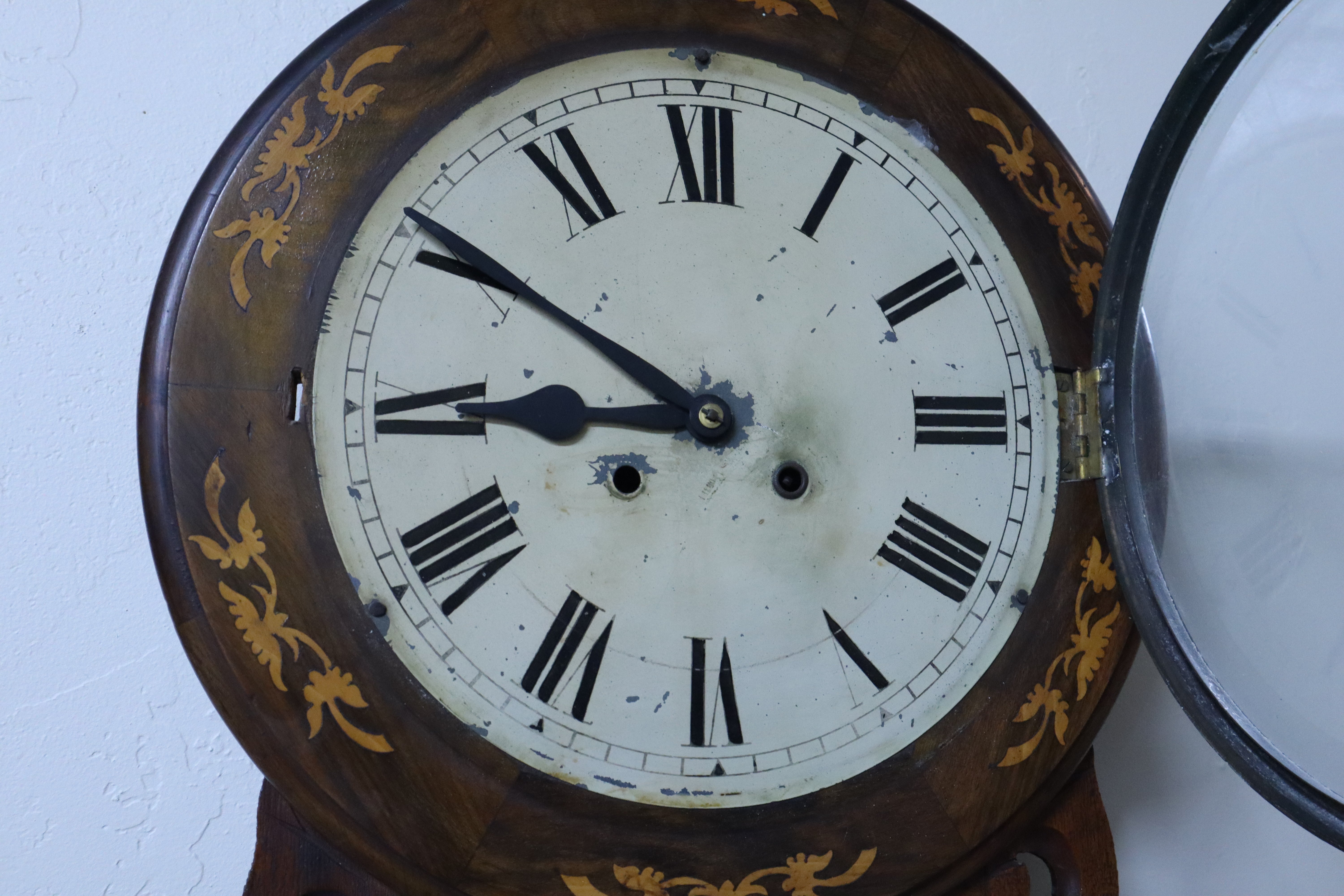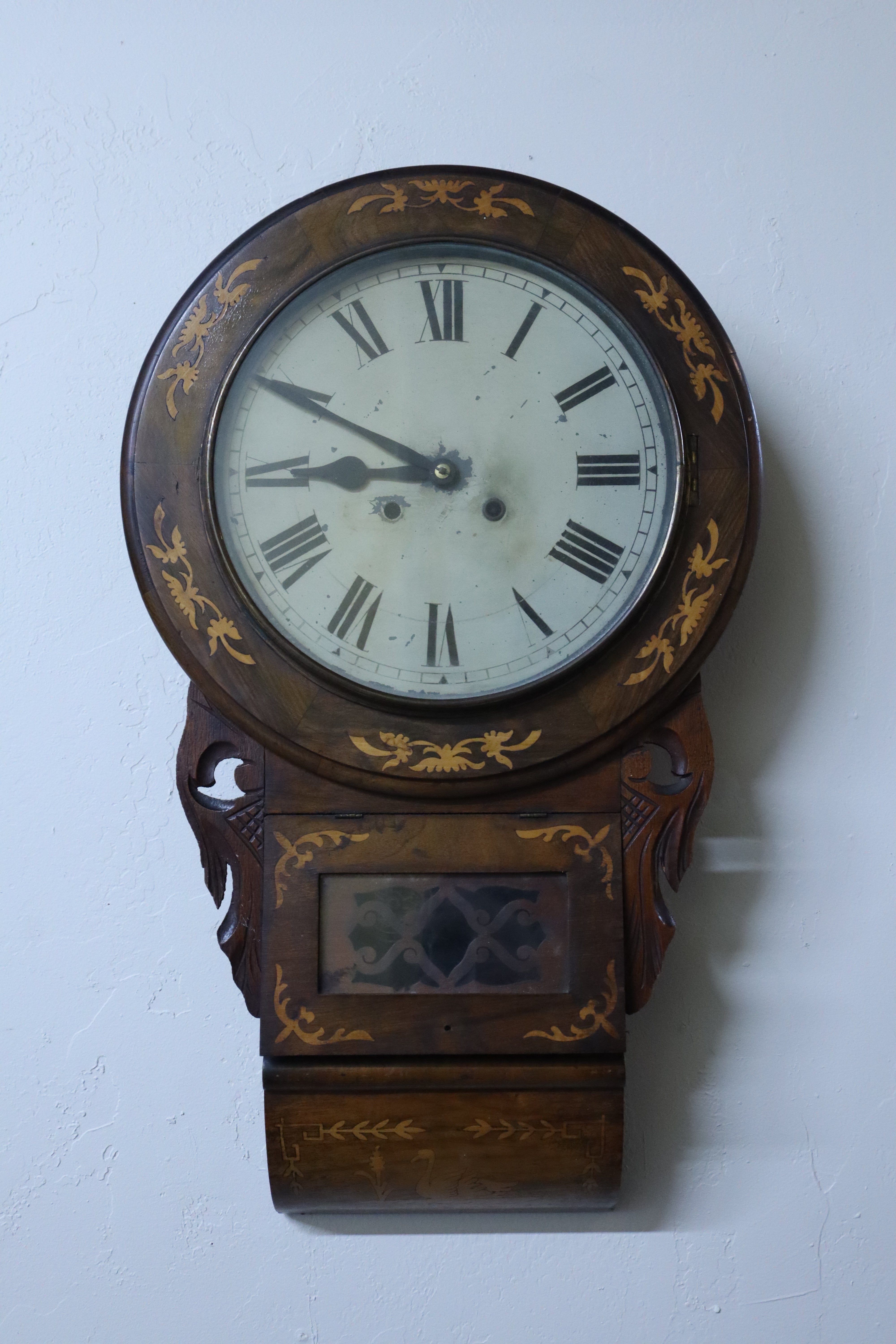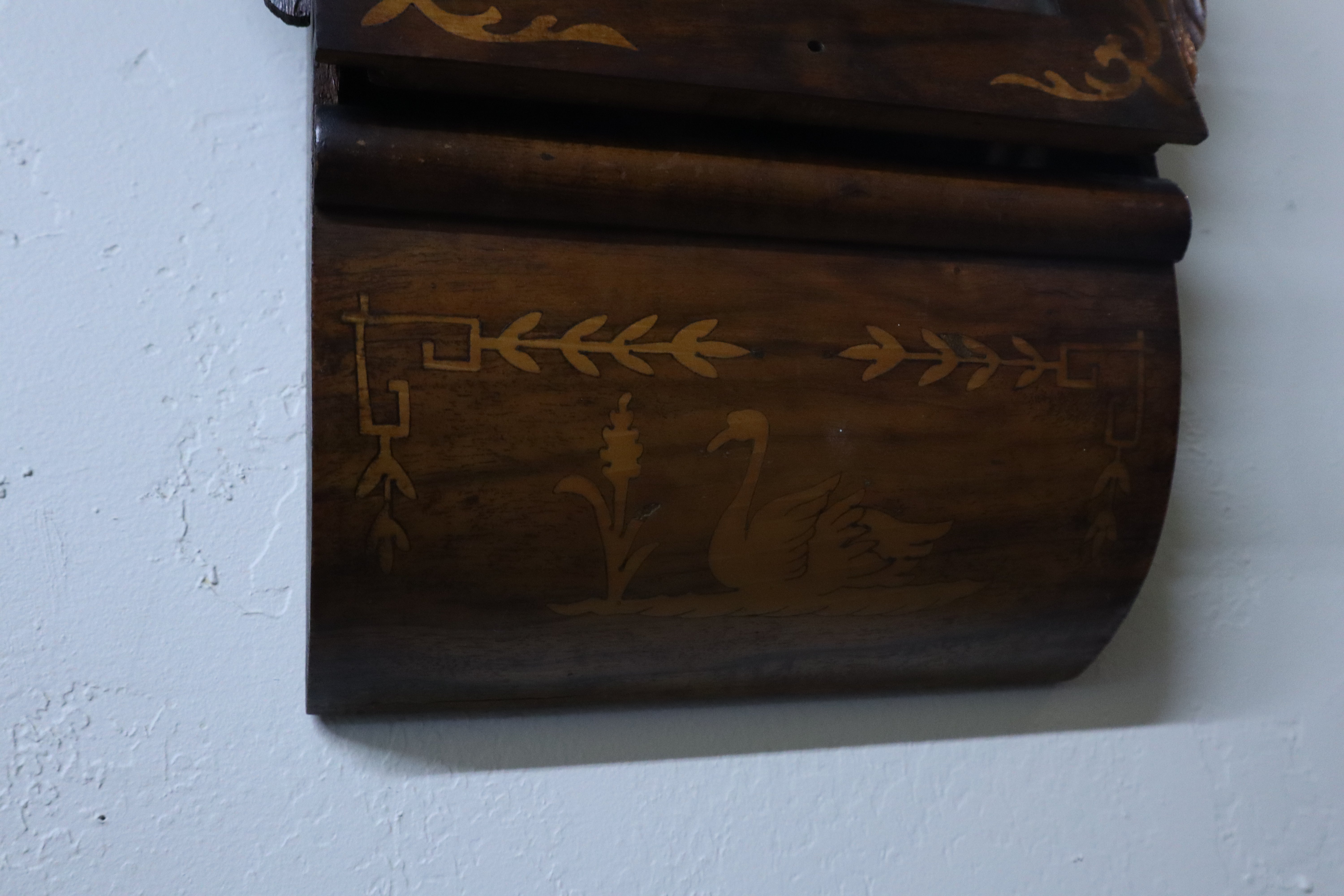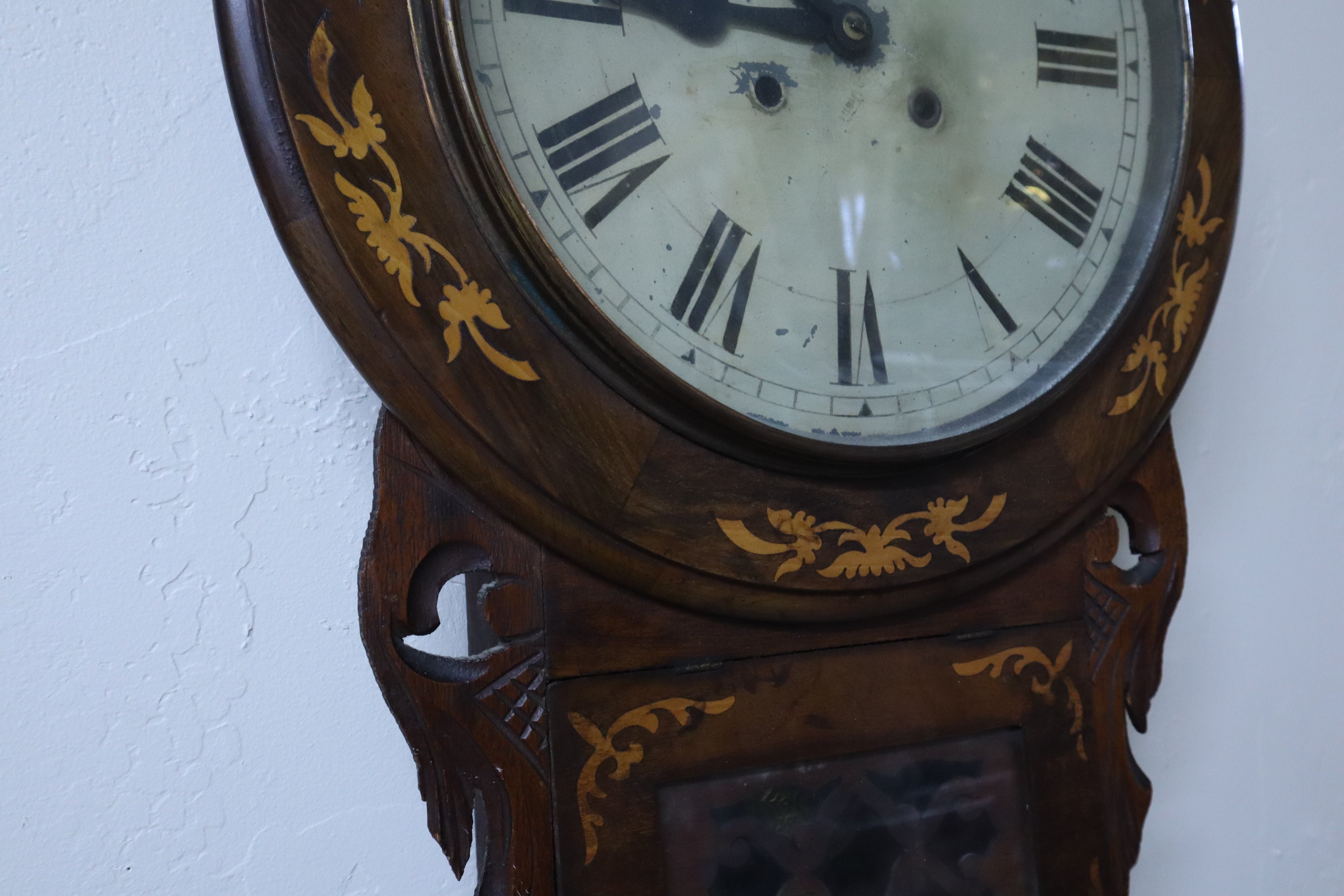 Classic 19th century marquetry hanging wall clock with beautiful wood inlay around the face. The original key is included! You can see it inserted in the winding key hole in one of the photos. The clock winds but doesn't chime, needs repair.