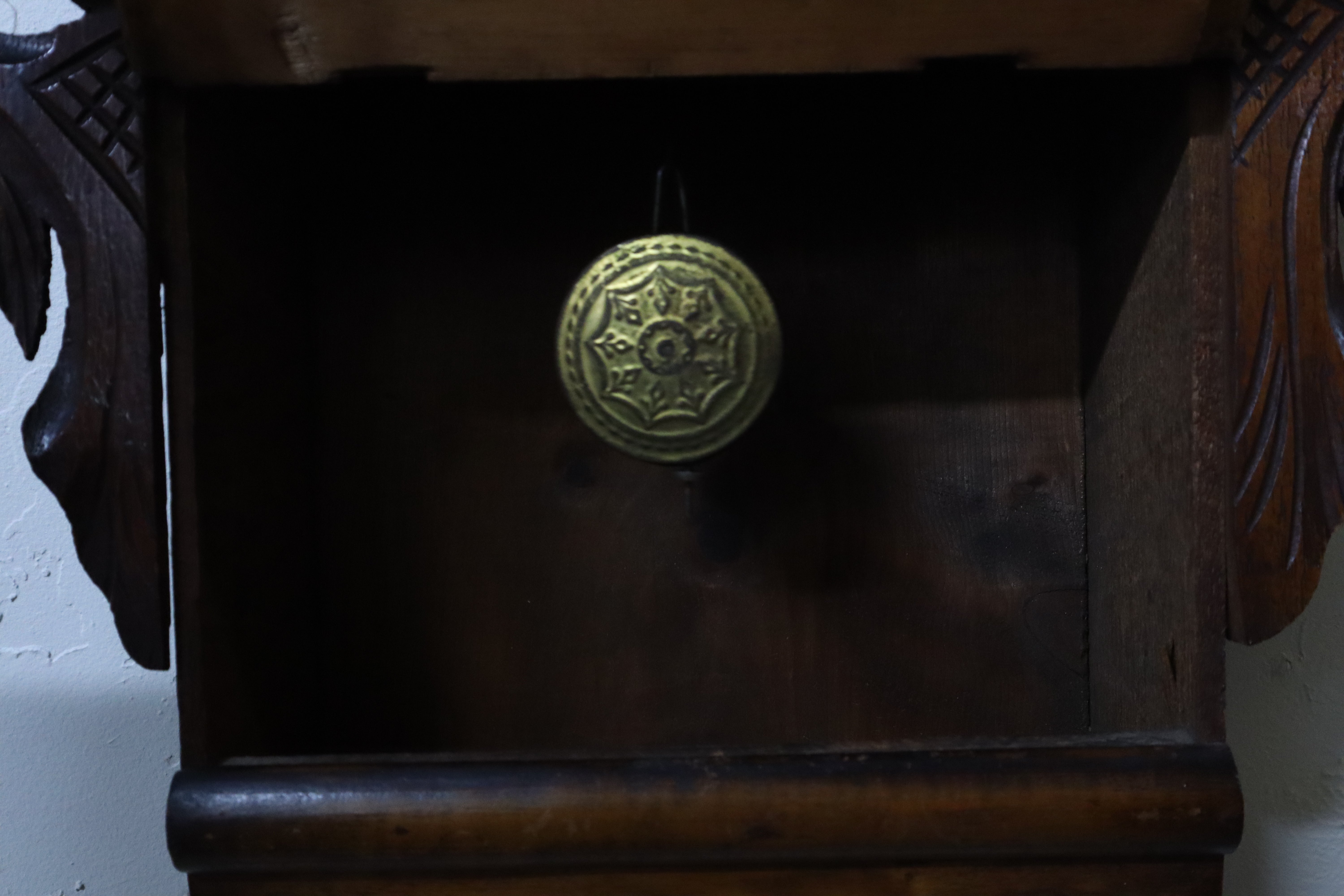 Ok condition, clock mechanism needs repair. Wood flap that opens to the compartment that holds the weight does not stay closed, missing its slide lock/knob.