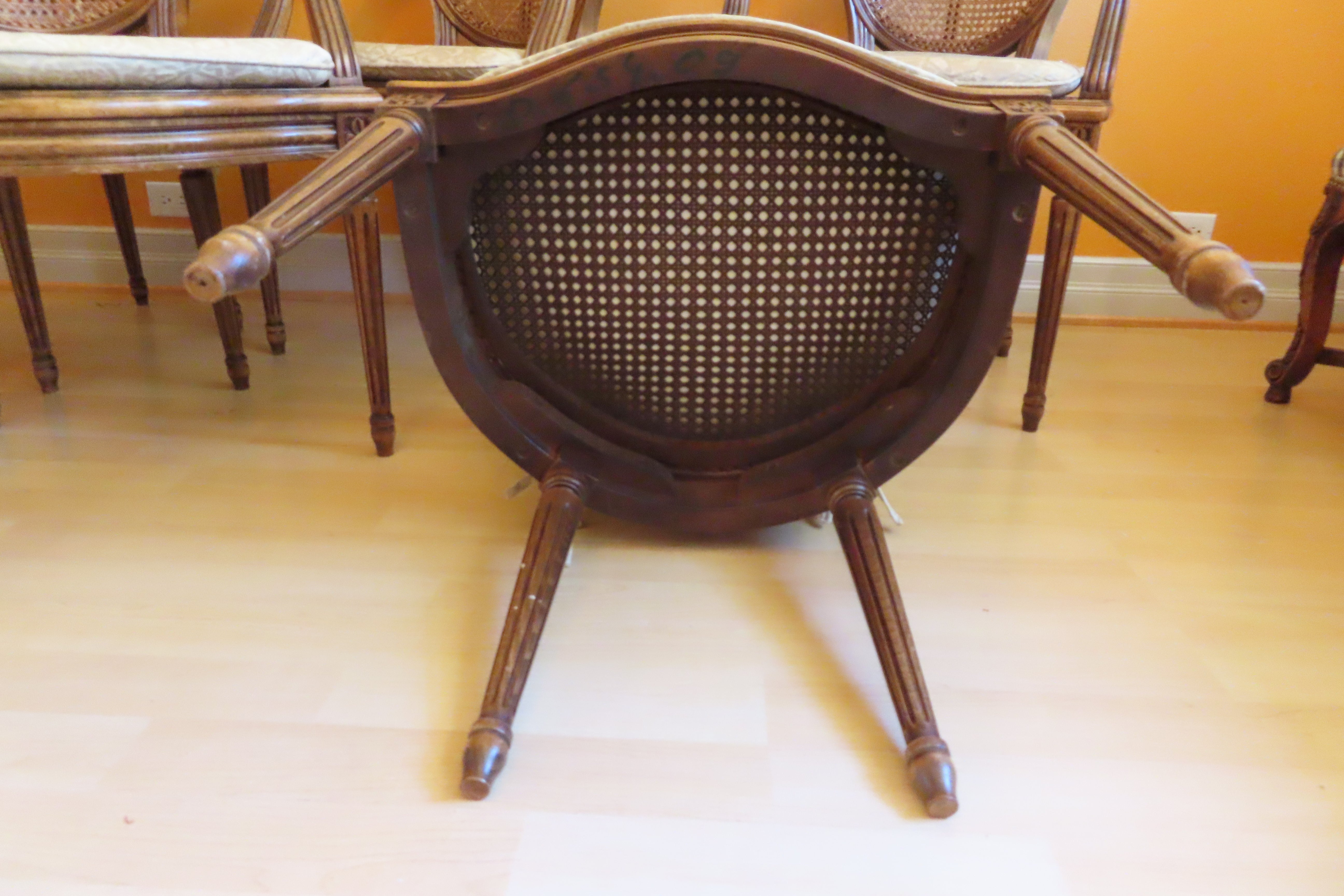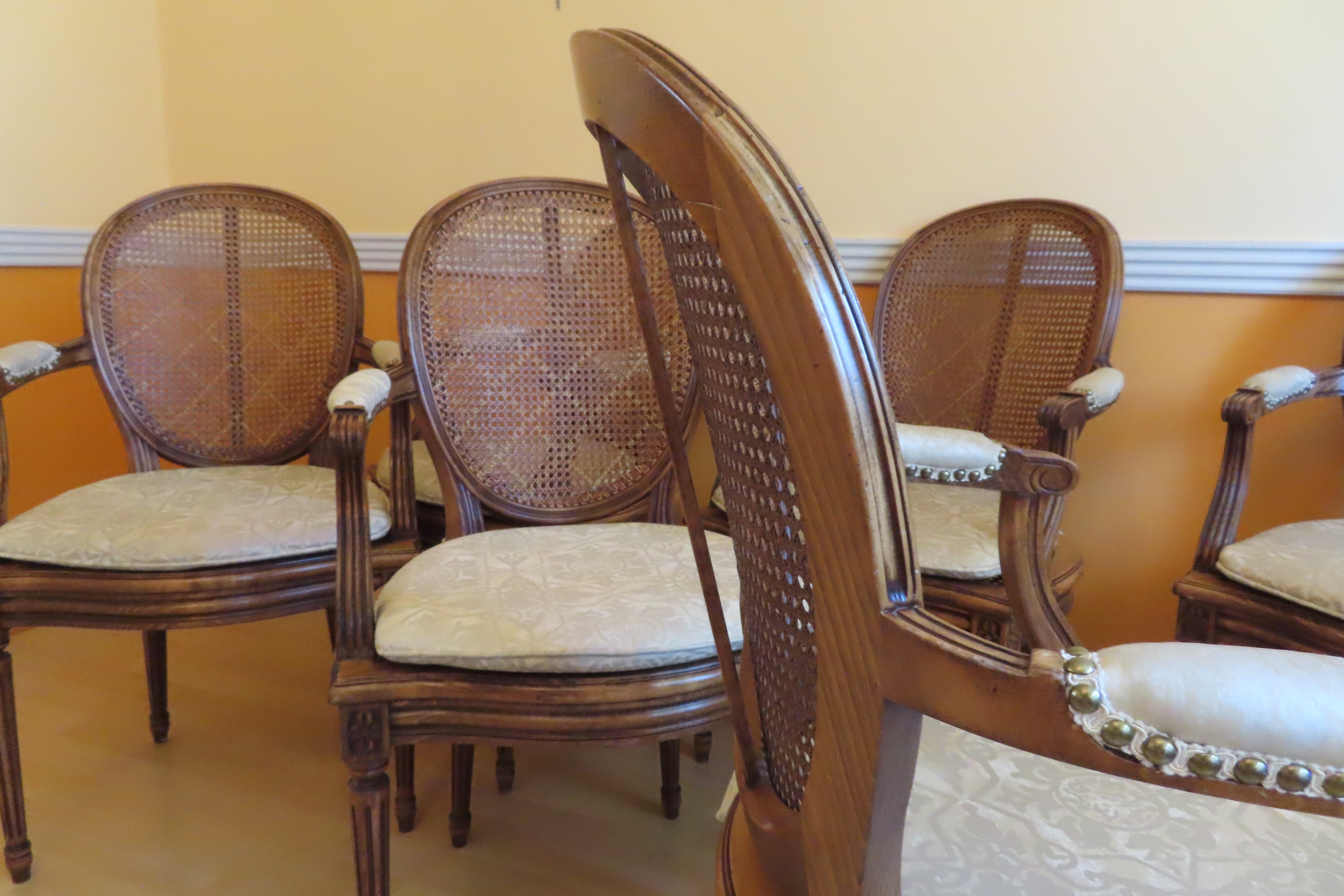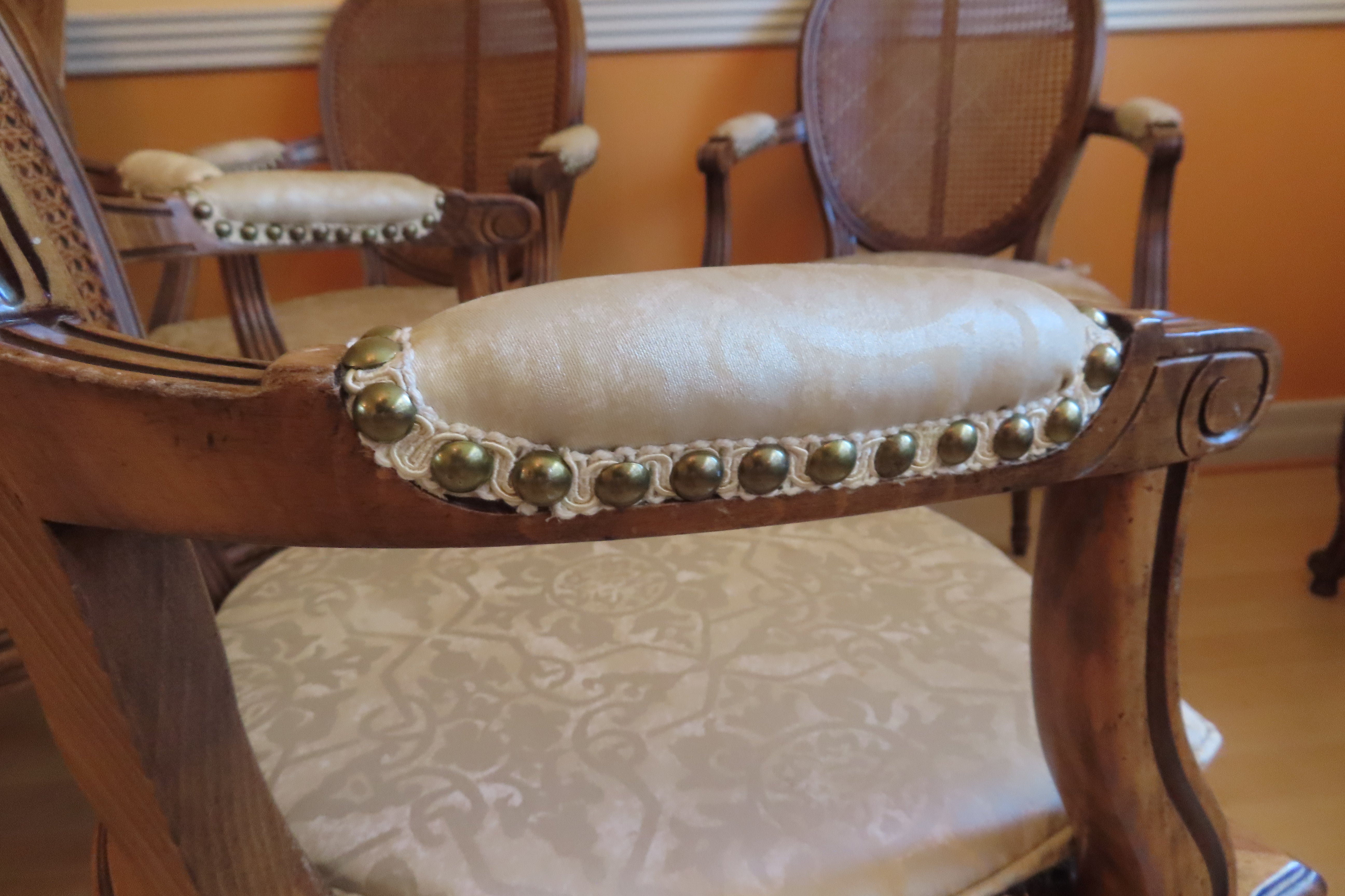 6 French Louis XVI Dining Room Arm Chairs With Medallion Backs & Matching Custom Upholstery