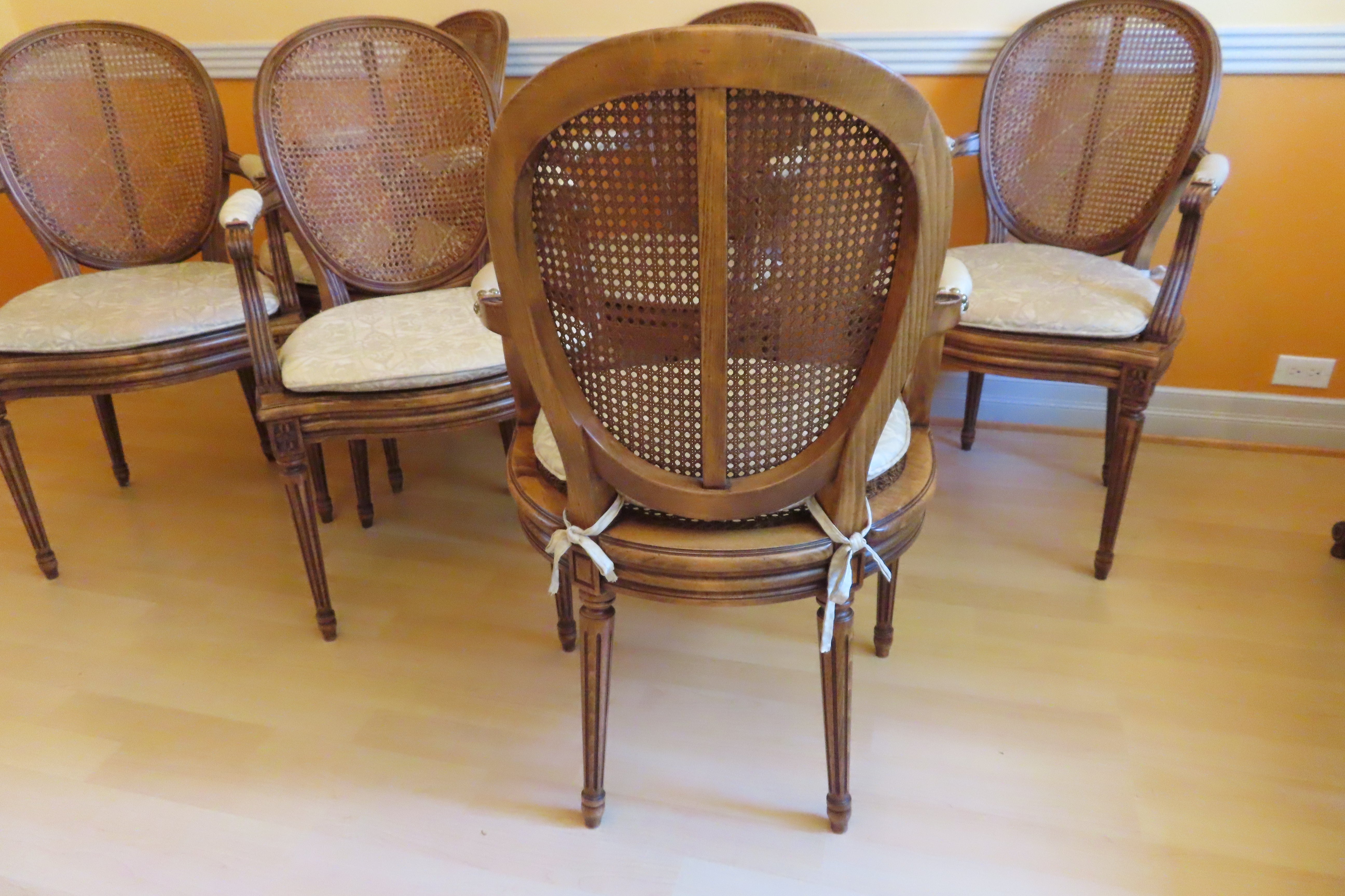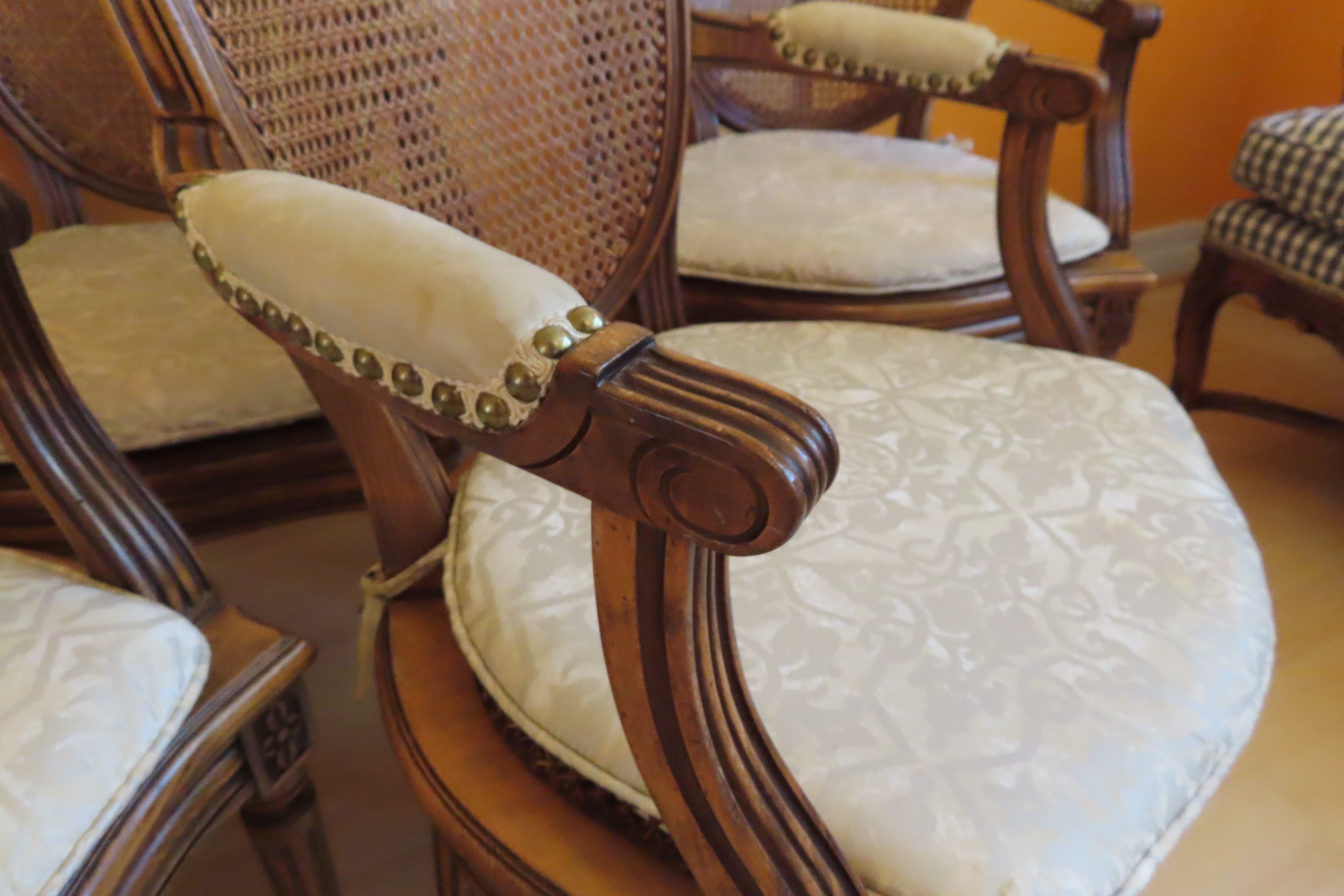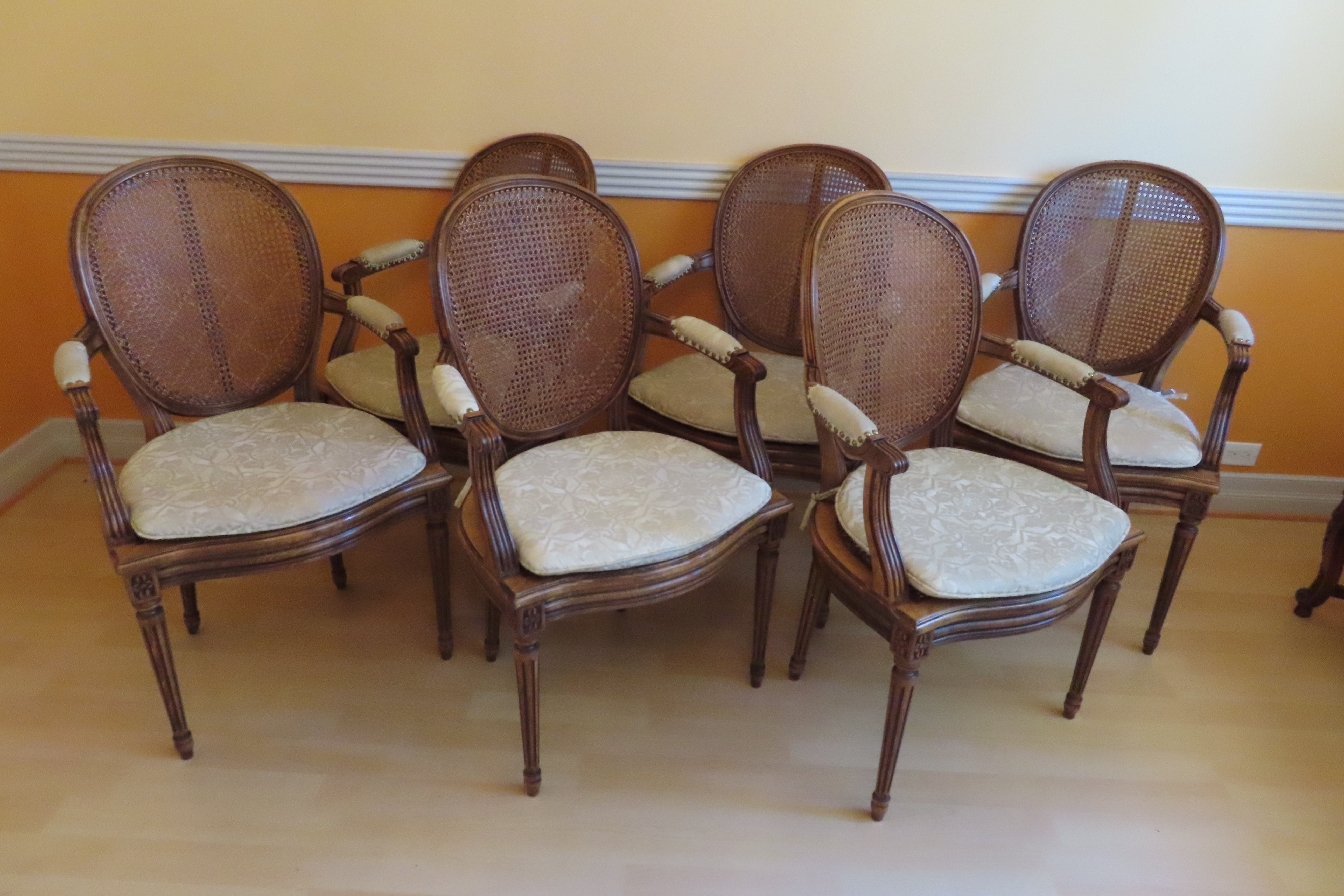 6 French Louis XVI Dining Room Arm Chairs With Medallion Backs & Matching Custom Upholstery