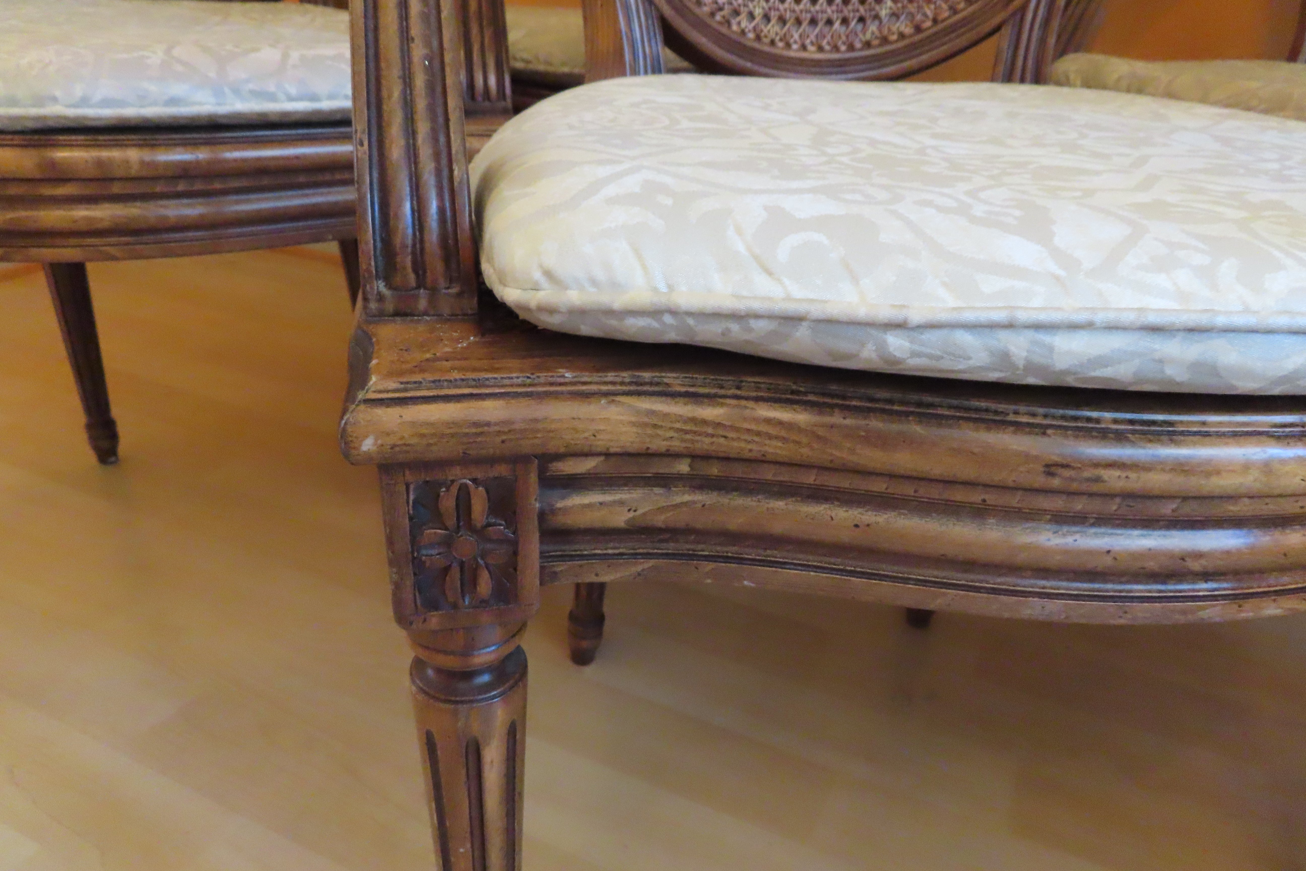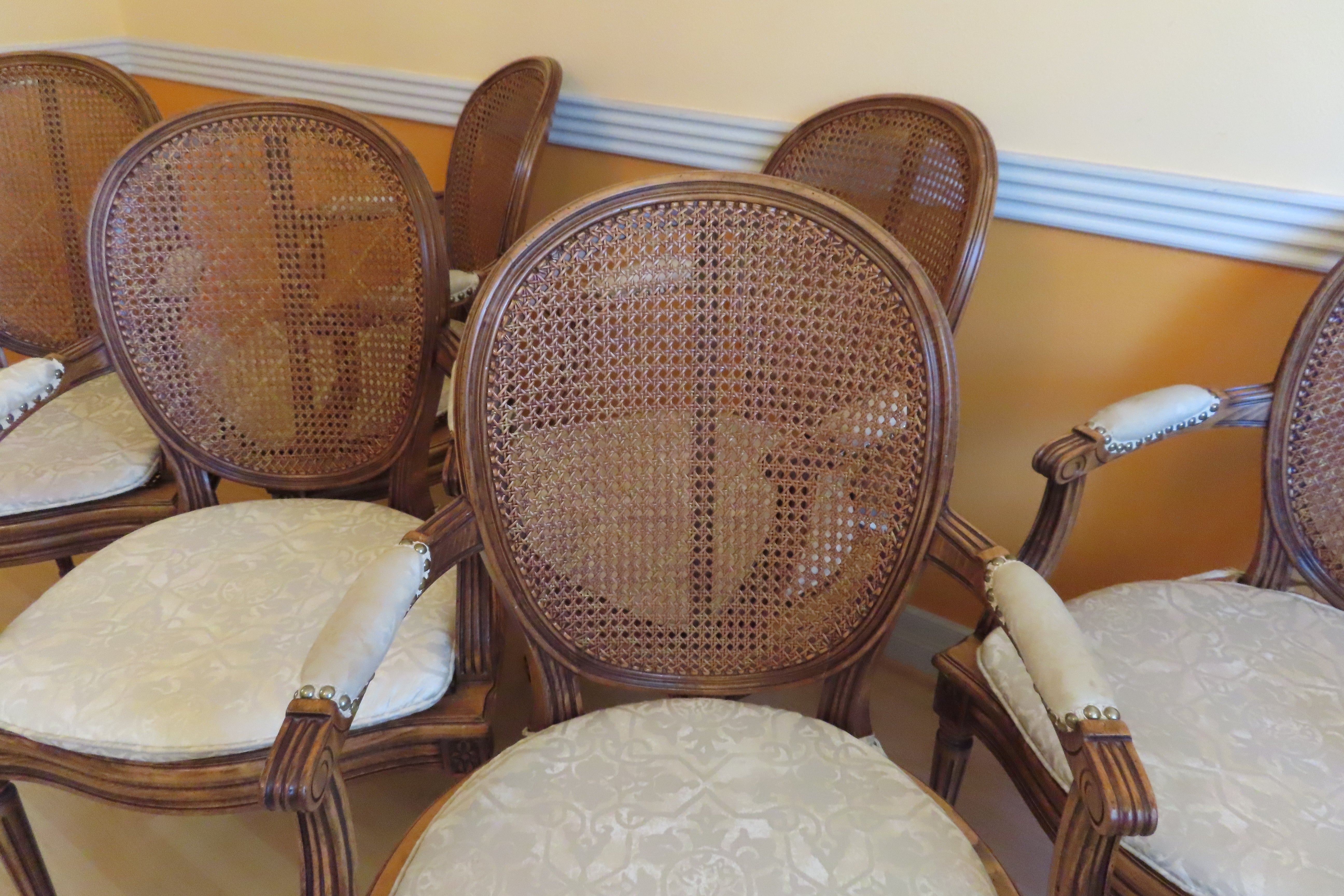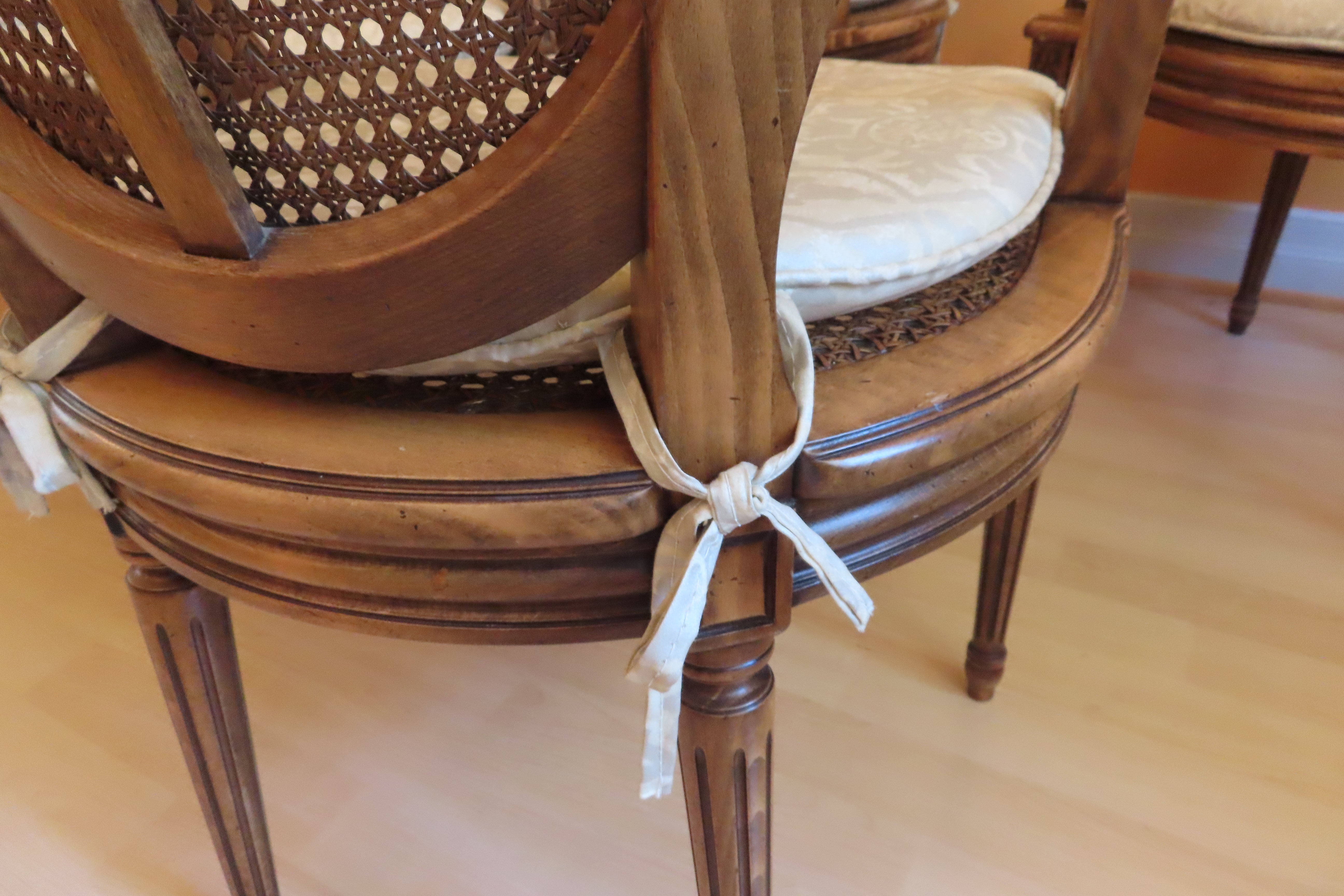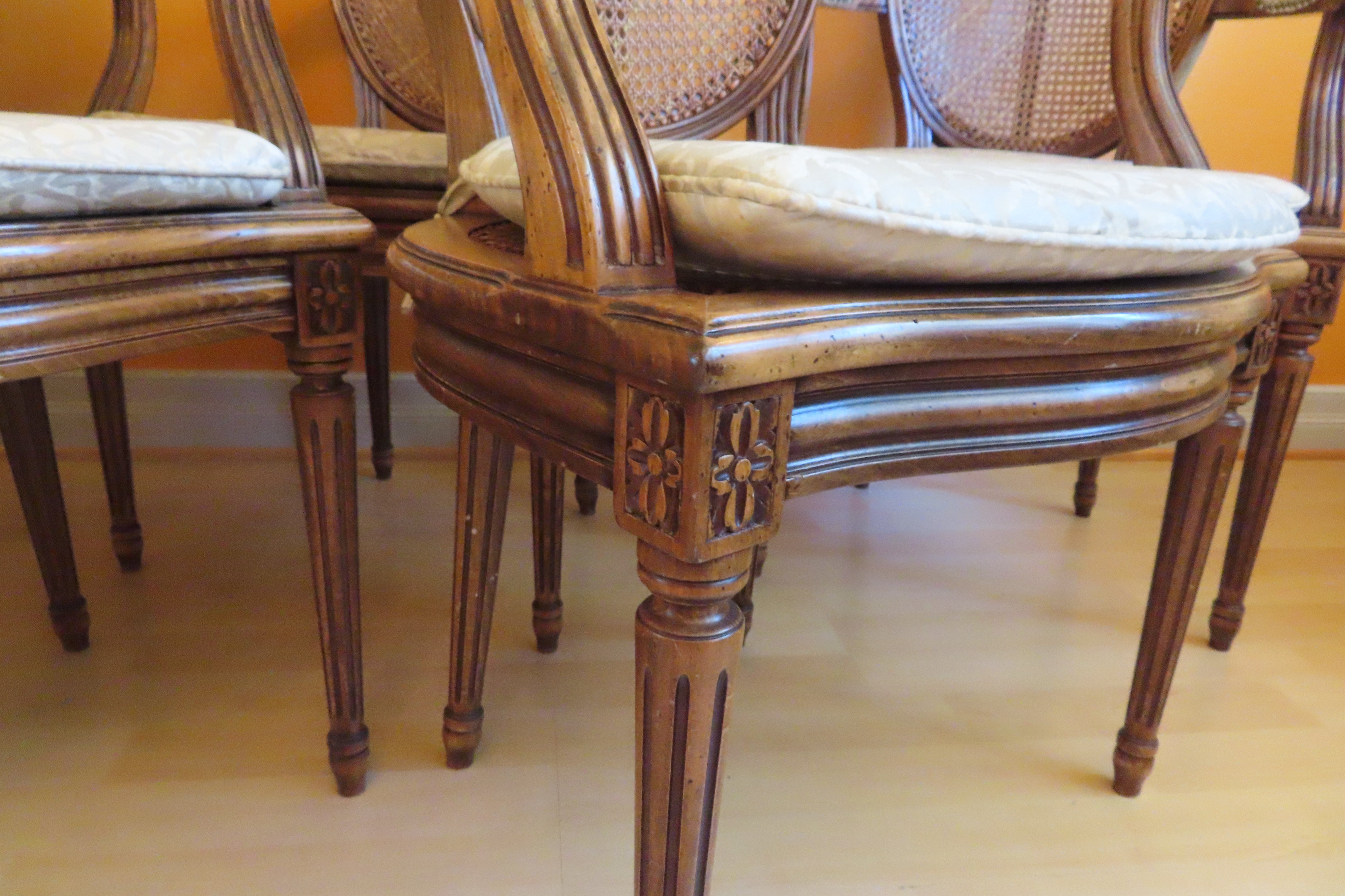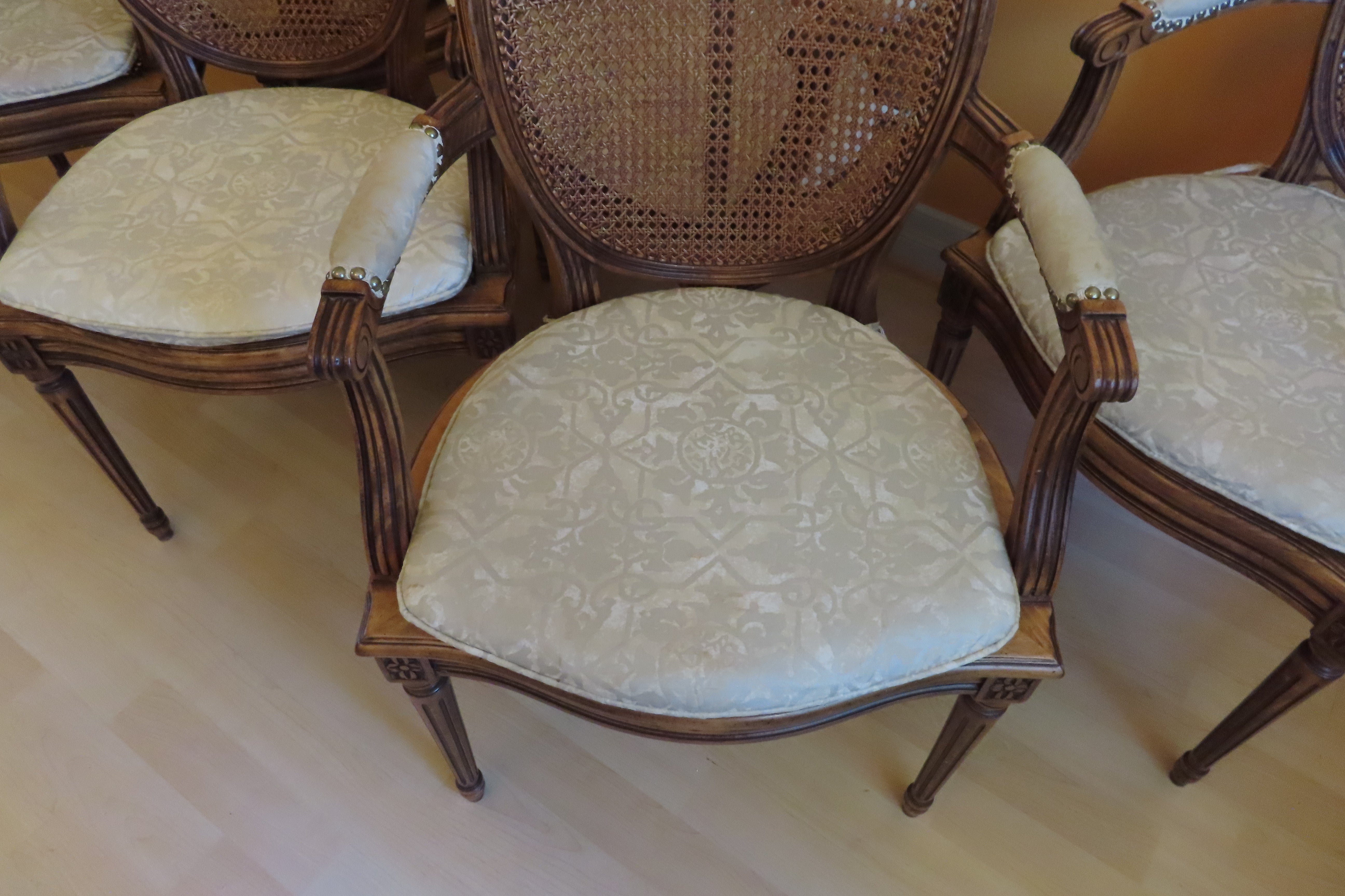 Beautiful set of 6 French dining arm chairs. Carved out of walnut, with medallion backs and caning. The arms have little elbow cushions that match the upholstery fabric for the seat cushions. Extra fabric is included with the chairs. Cushions are tied on the back, easily removed. Carved out of walnut wood in the style of Louis XVI.