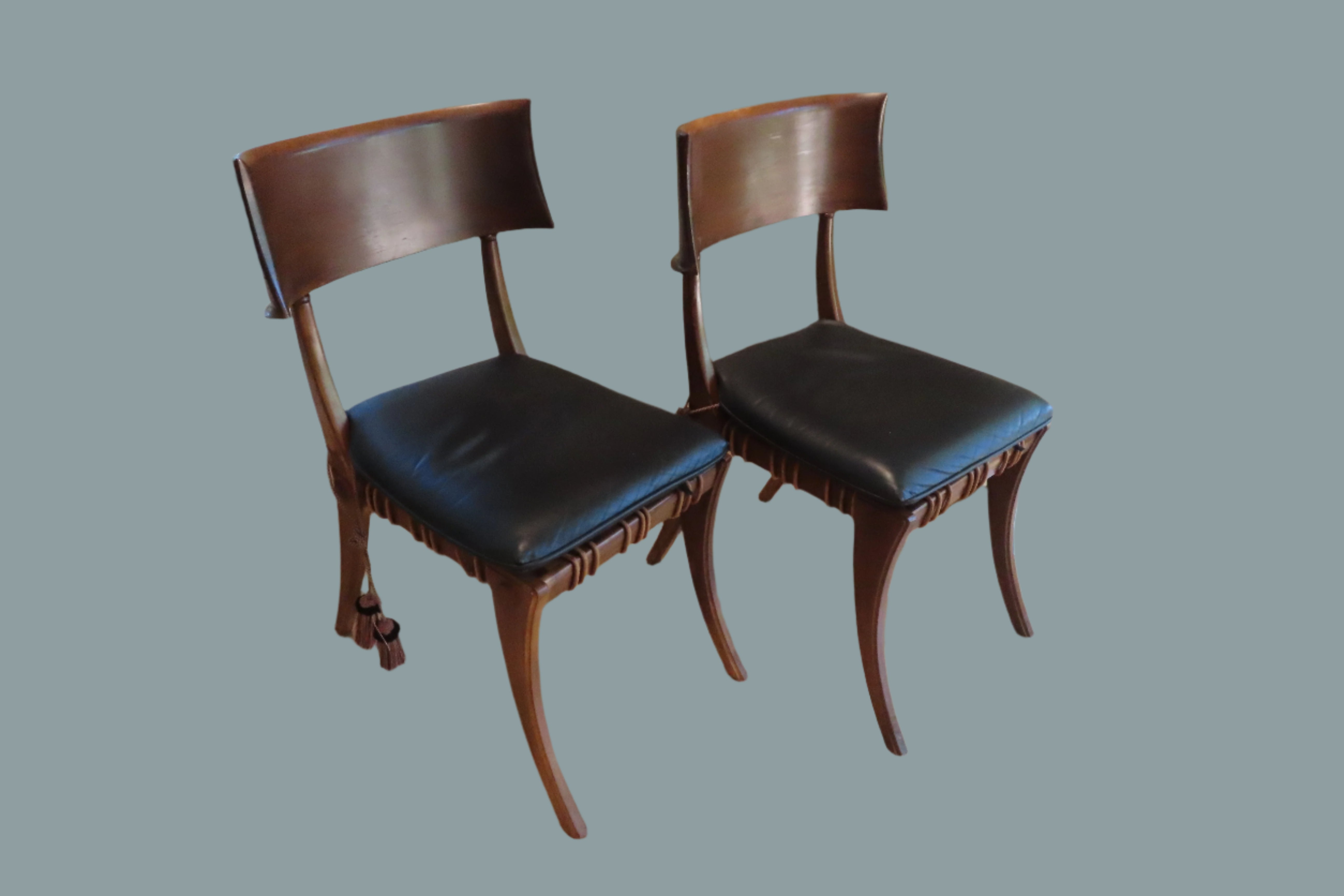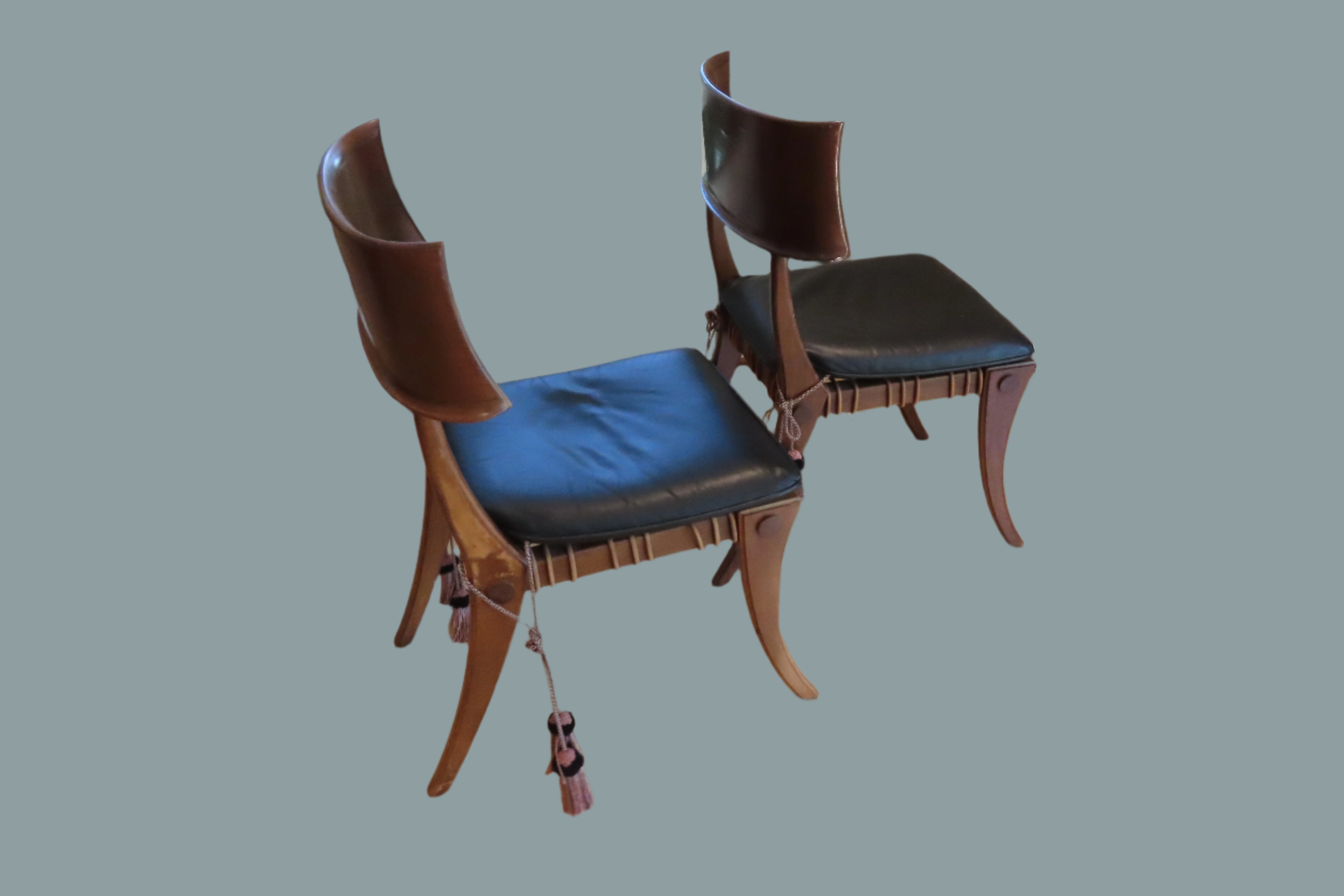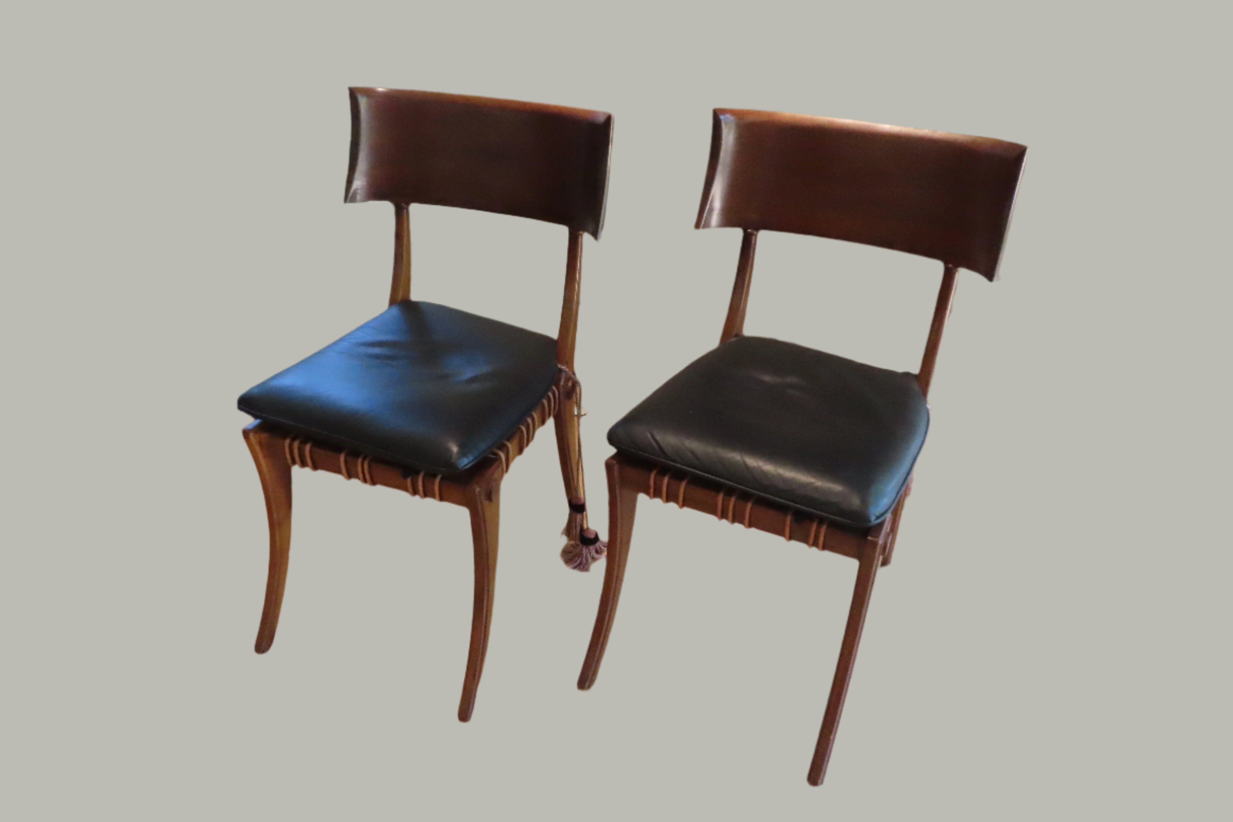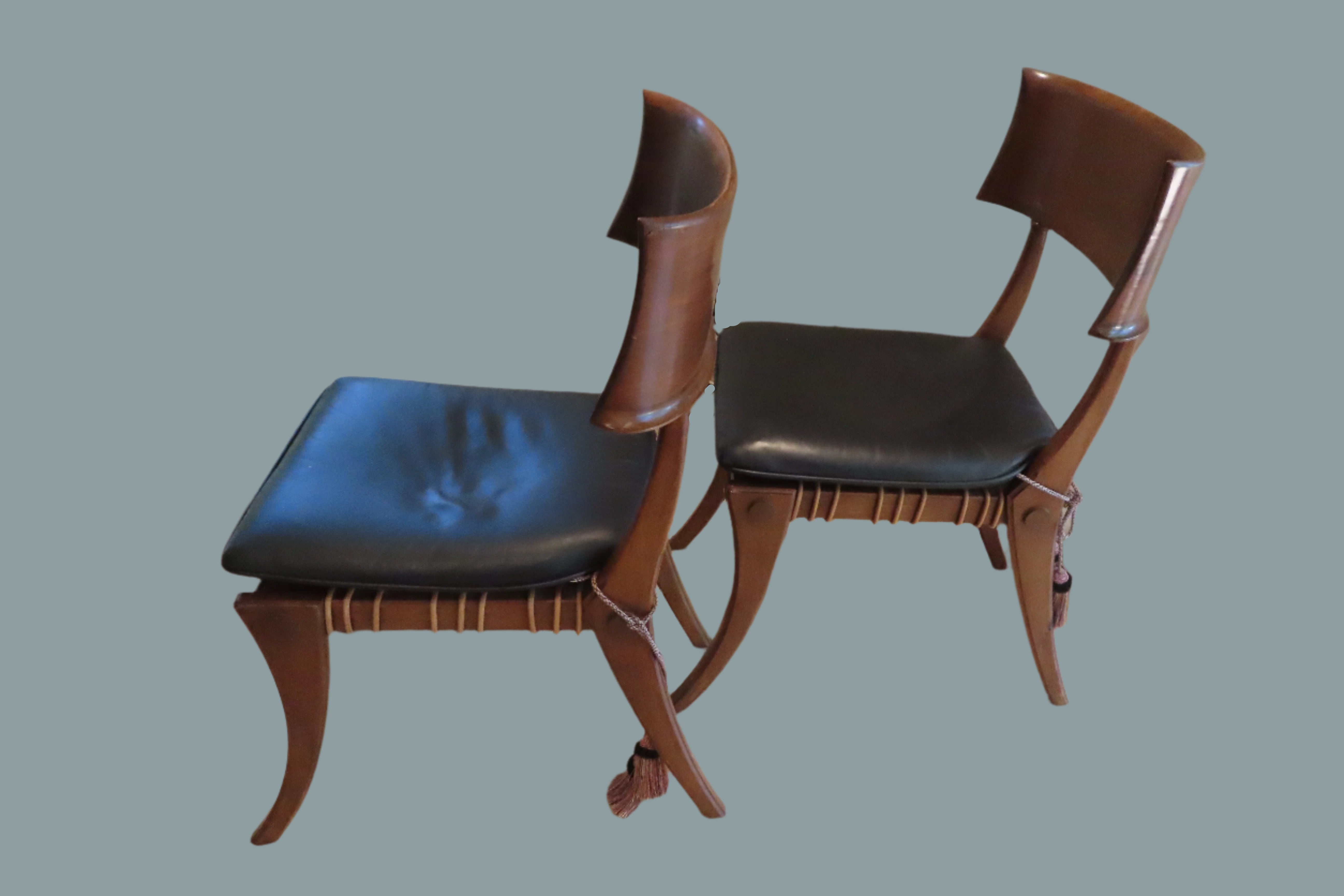 Pair of amazing custom made klismos style dining chair, meaning 'rest' in Greek. These gorgeous chairs are made from solid walnut, with the seat fashioned from bands of raw hide leather woven together with black leather cushions on top. The leather cushions are secured to the chair with long regal tassels tied around the back. These elegant chairs were custom made to fit the home of a wealthy philanthropists relative in the Pacific North West.