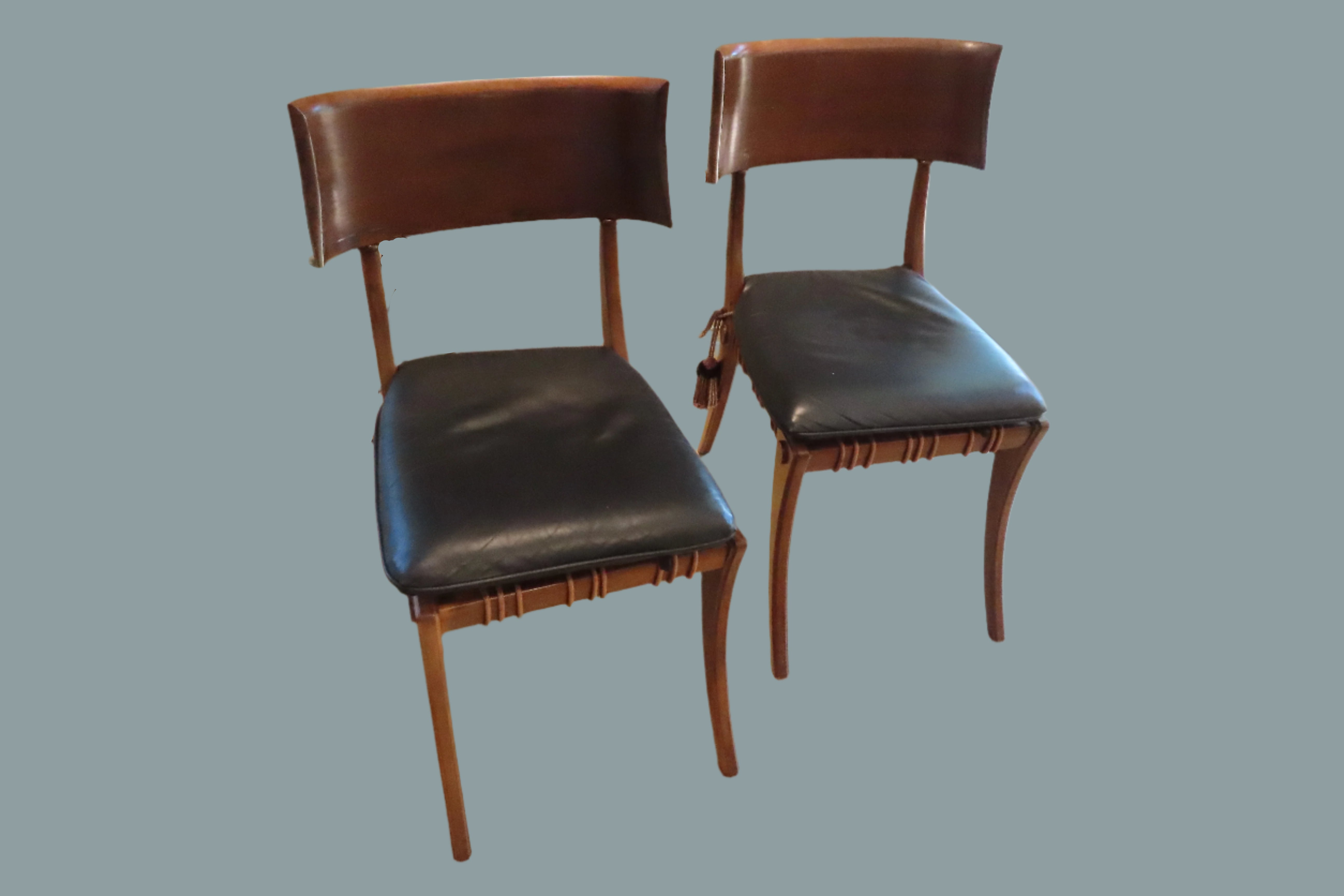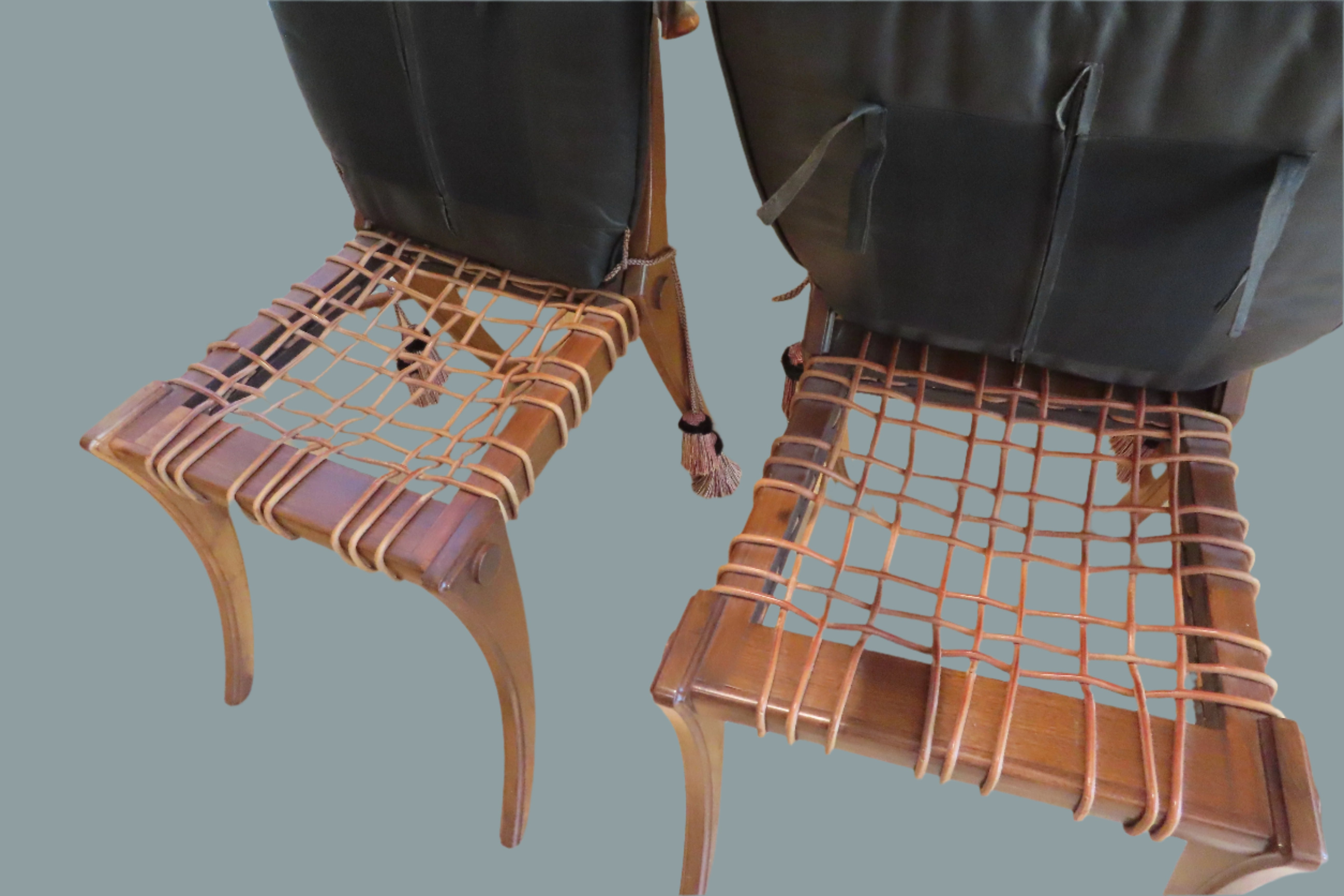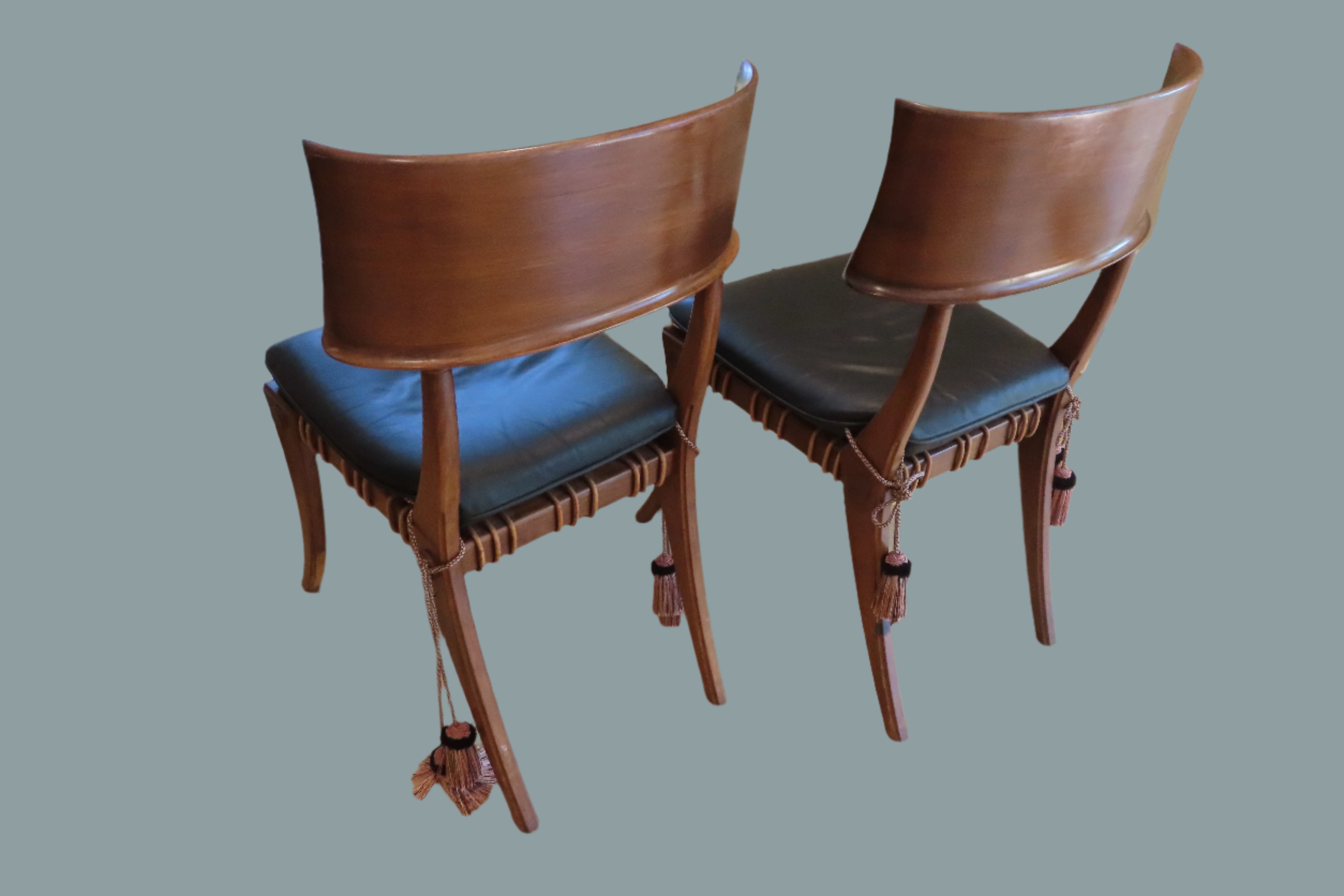Pair of amazing custom made klismos style dining chair, meaning 'rest' in Greek. These gorgeous chairs are made from solid walnut, with the seat fashioned from bands of raw hide leather woven together with black leather cushions on top. The leather cushions are secured to the chair with long regal tassels tied around the back. These elegant chairs were custom made to fit the home of a wealthy philanthropists relative in the Pacific North West.