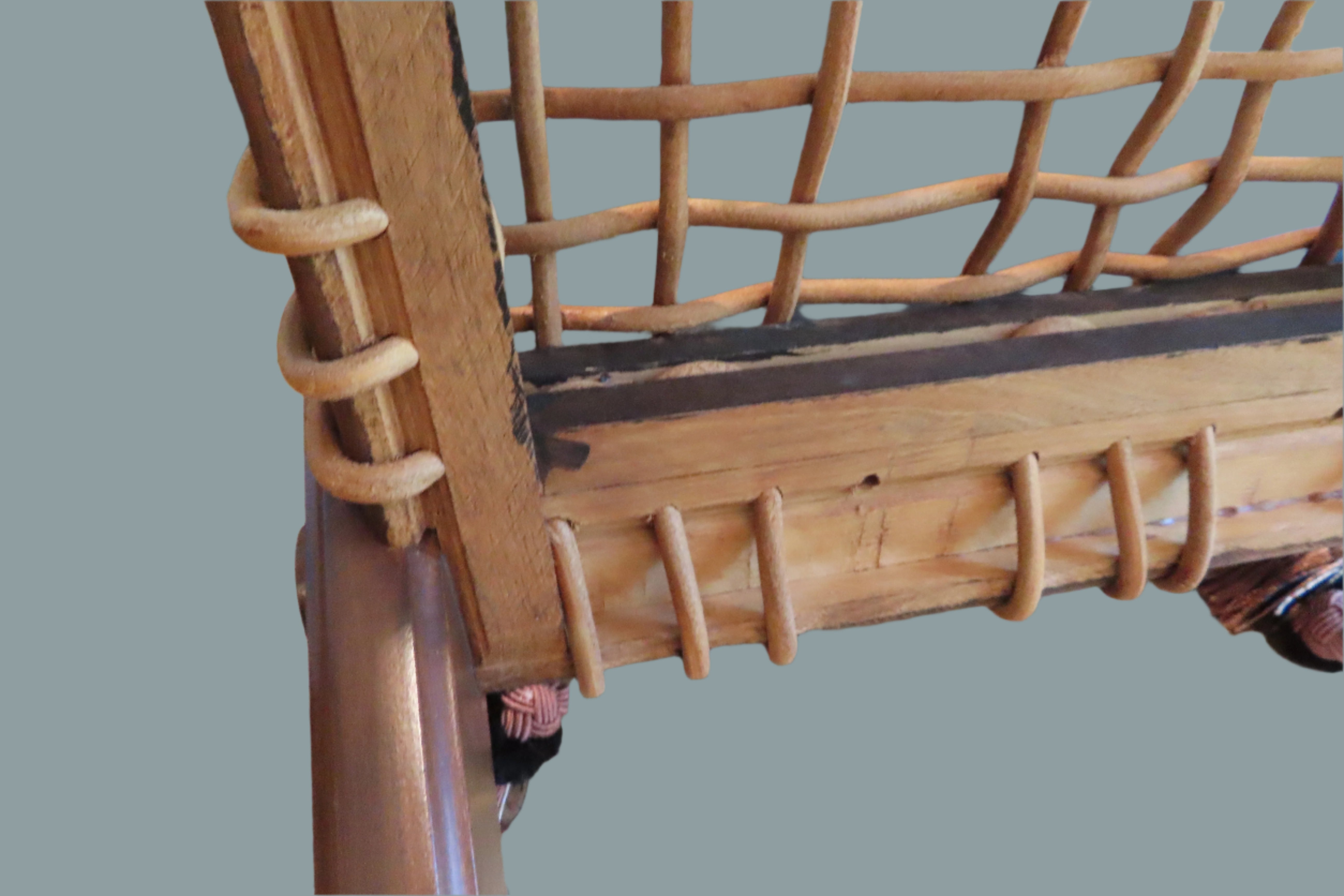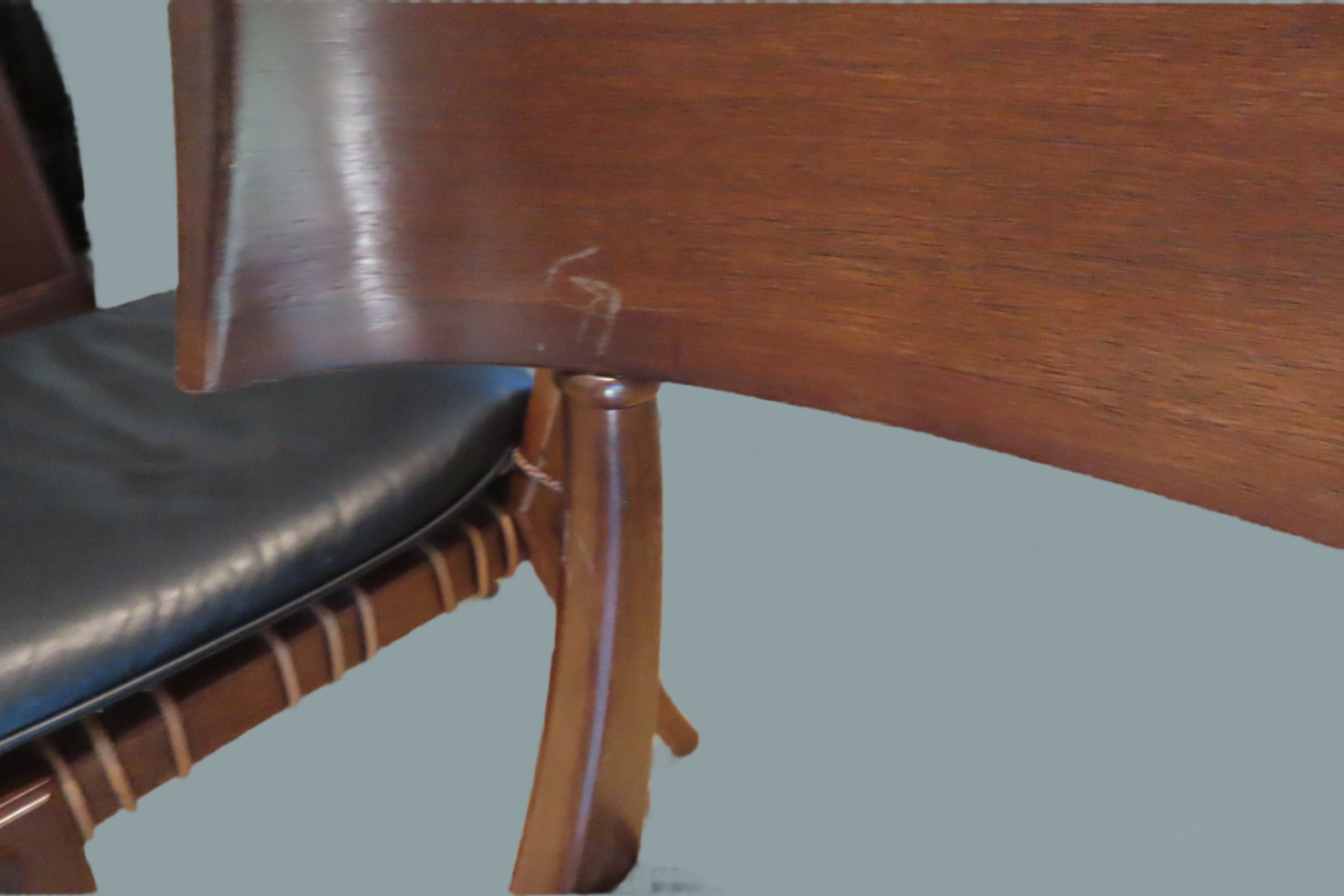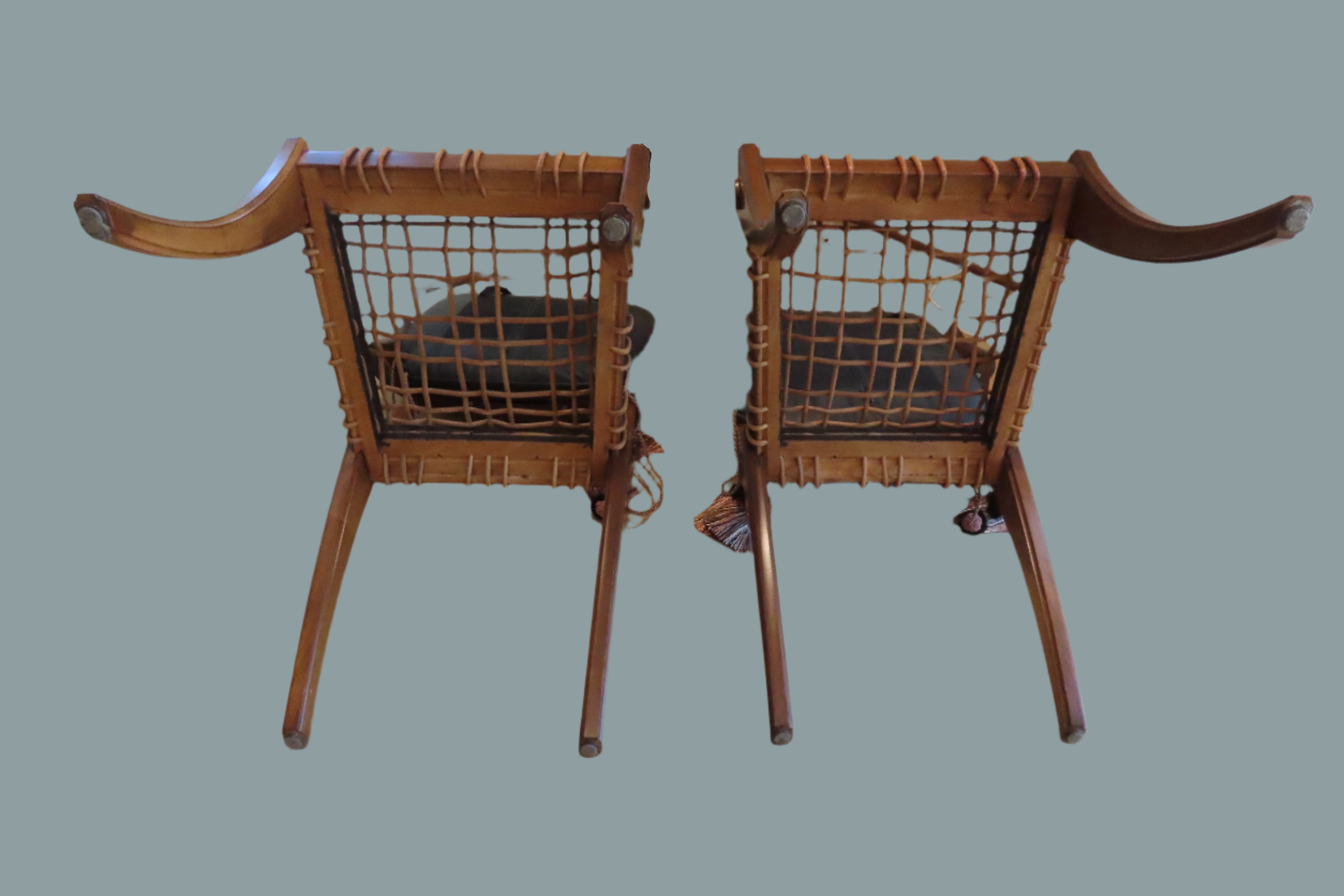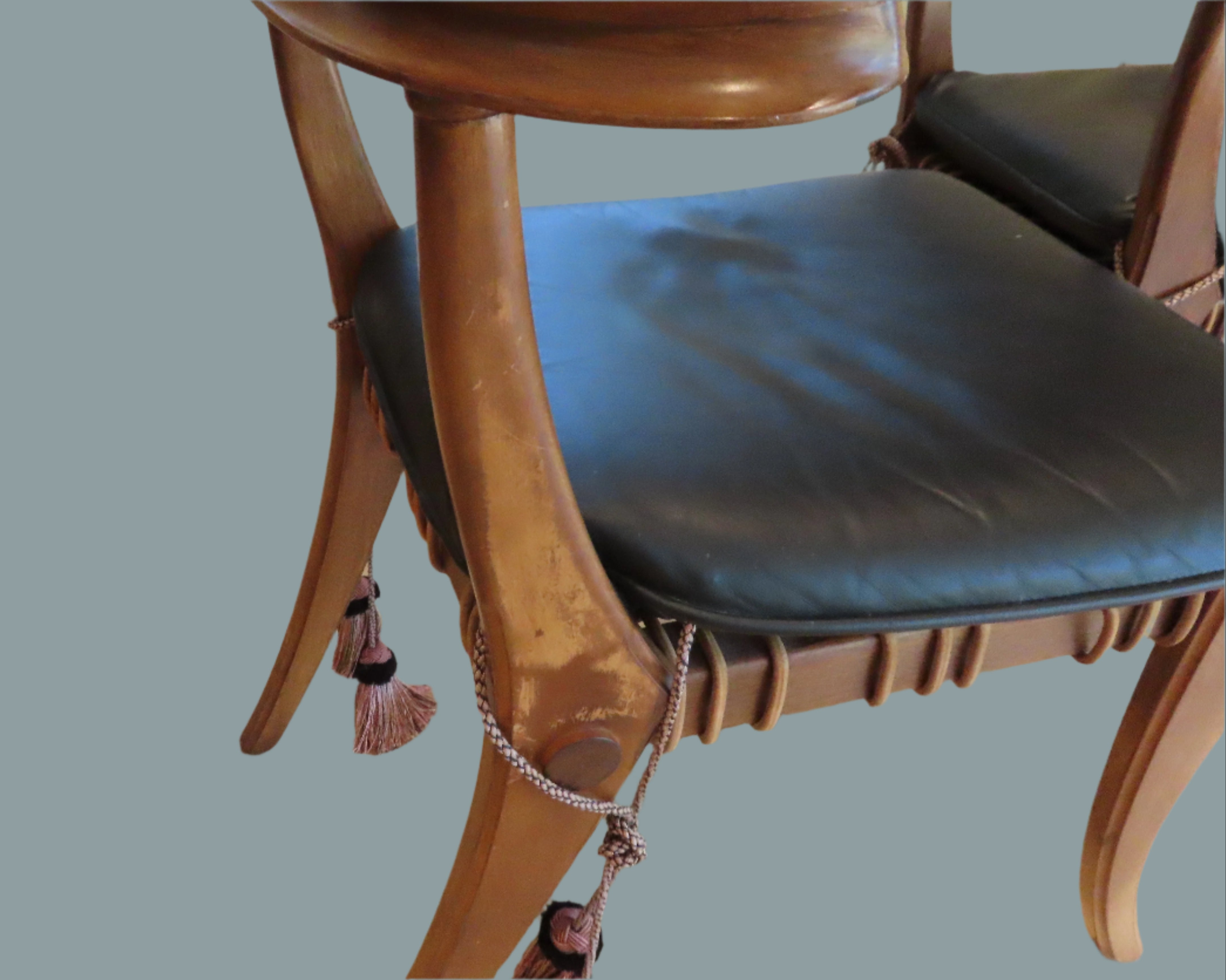 Pair of amazing custom made klismos style dining chair, meaning 'rest' in Greek. These gorgeous chairs are made from solid walnut, with the seat fashioned from bands of raw hide leather woven together with black leather cushions on top. The leather cushions are secured to the chair with long regal tassels tied around the back. These elegant chairs were custom made to fit the home of a wealthy philanthropists relative in the Pacific North West.