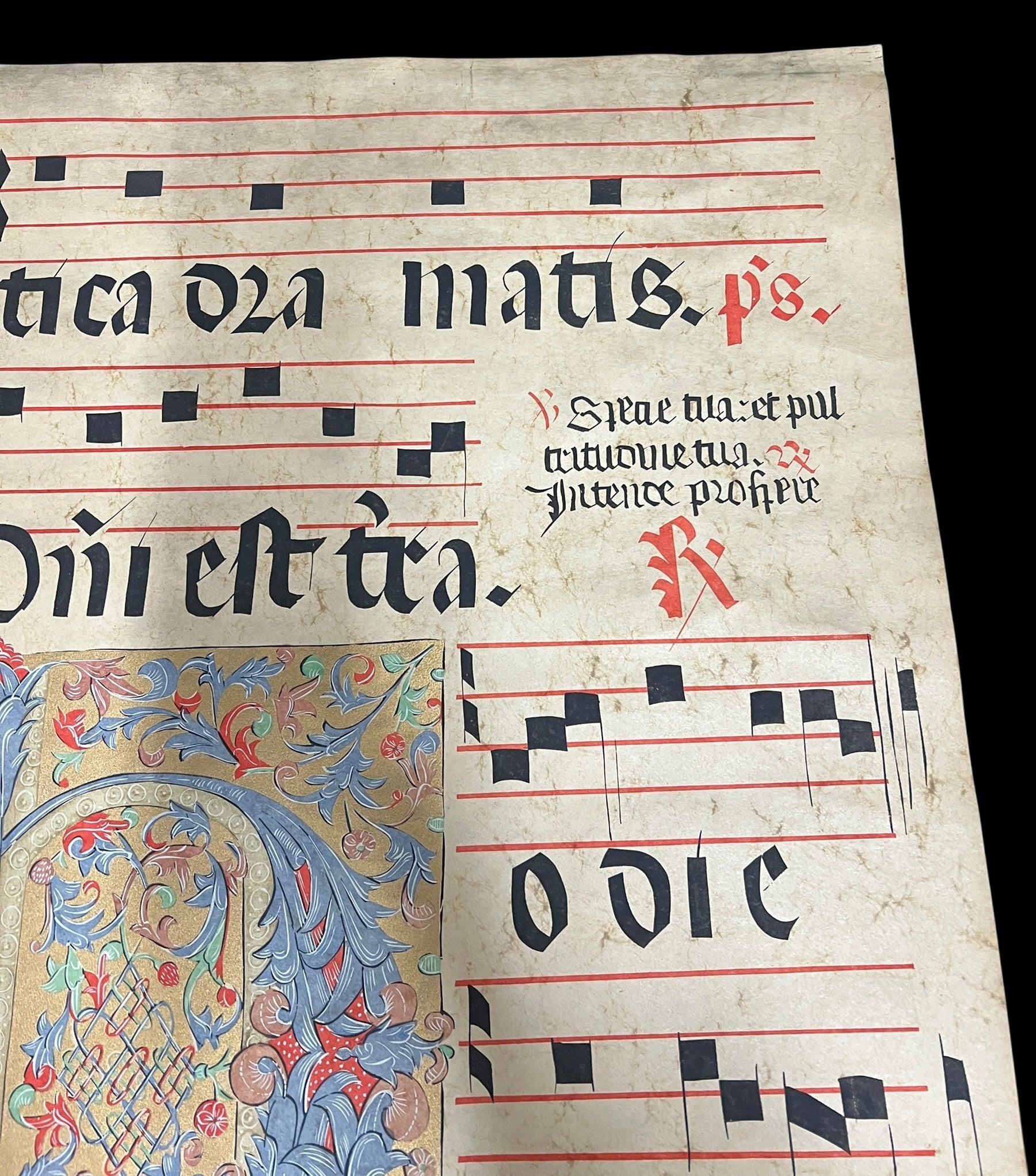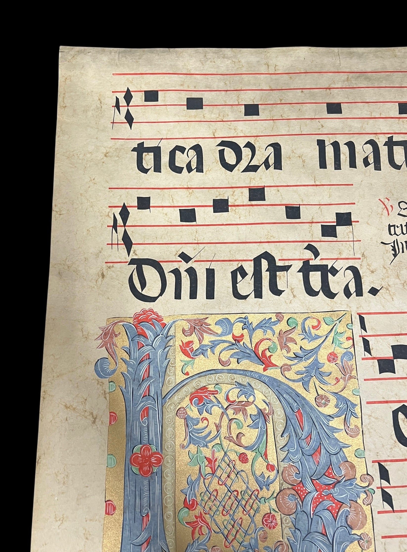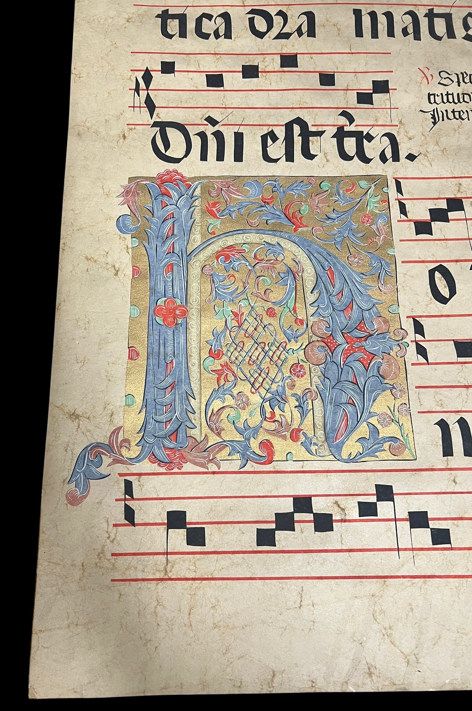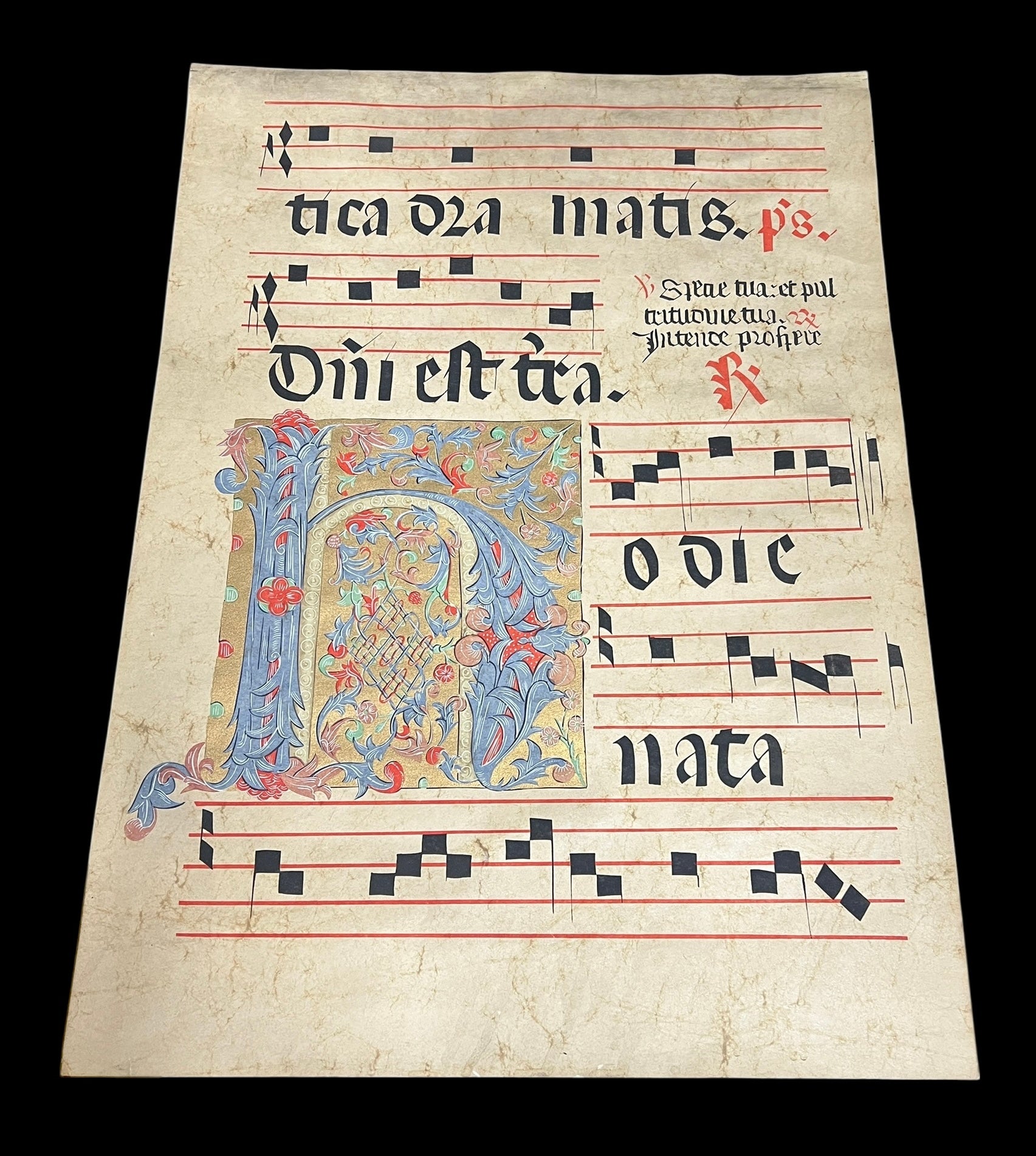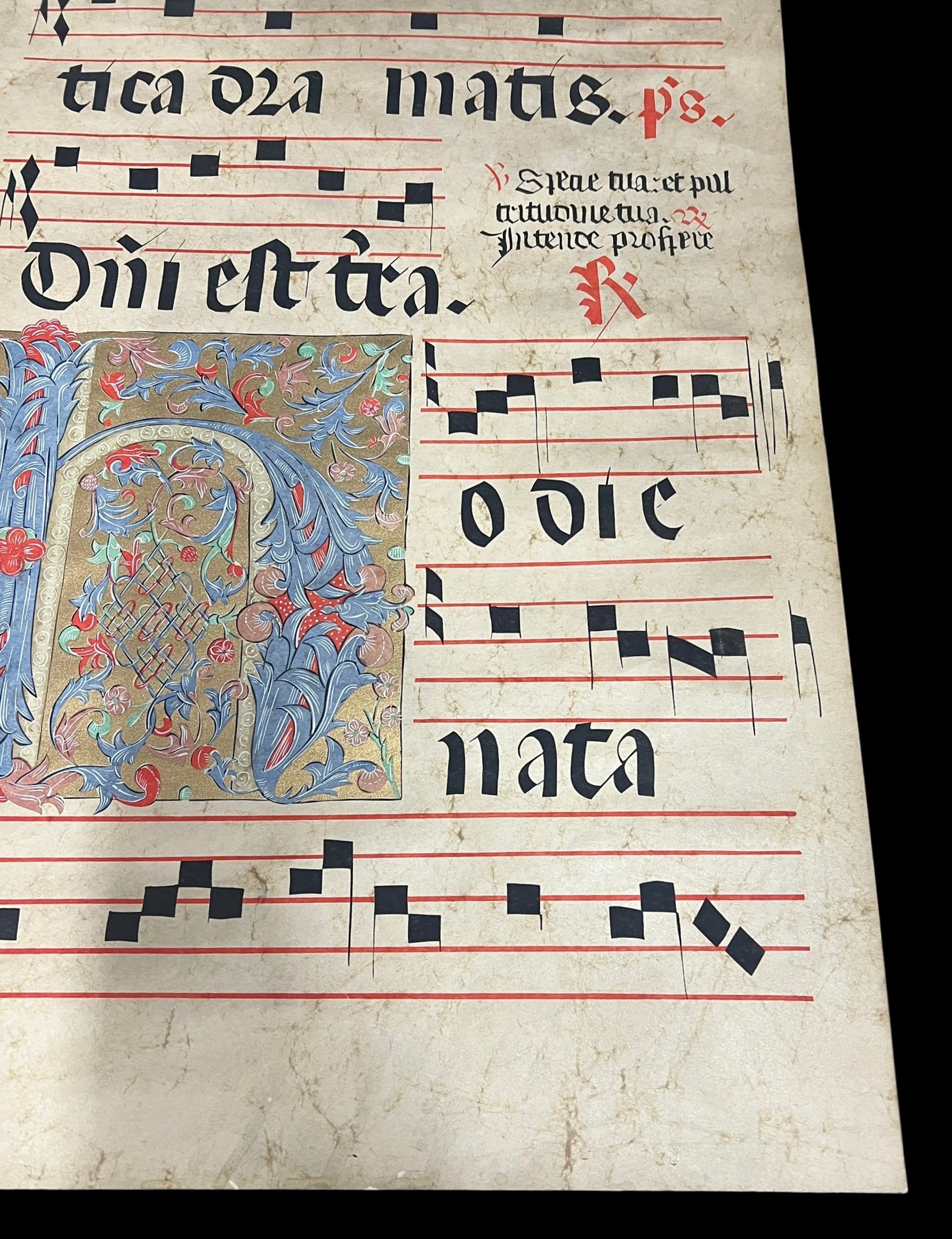 A piece of illuminated Gregorian sheet music with heavily decorated letter.