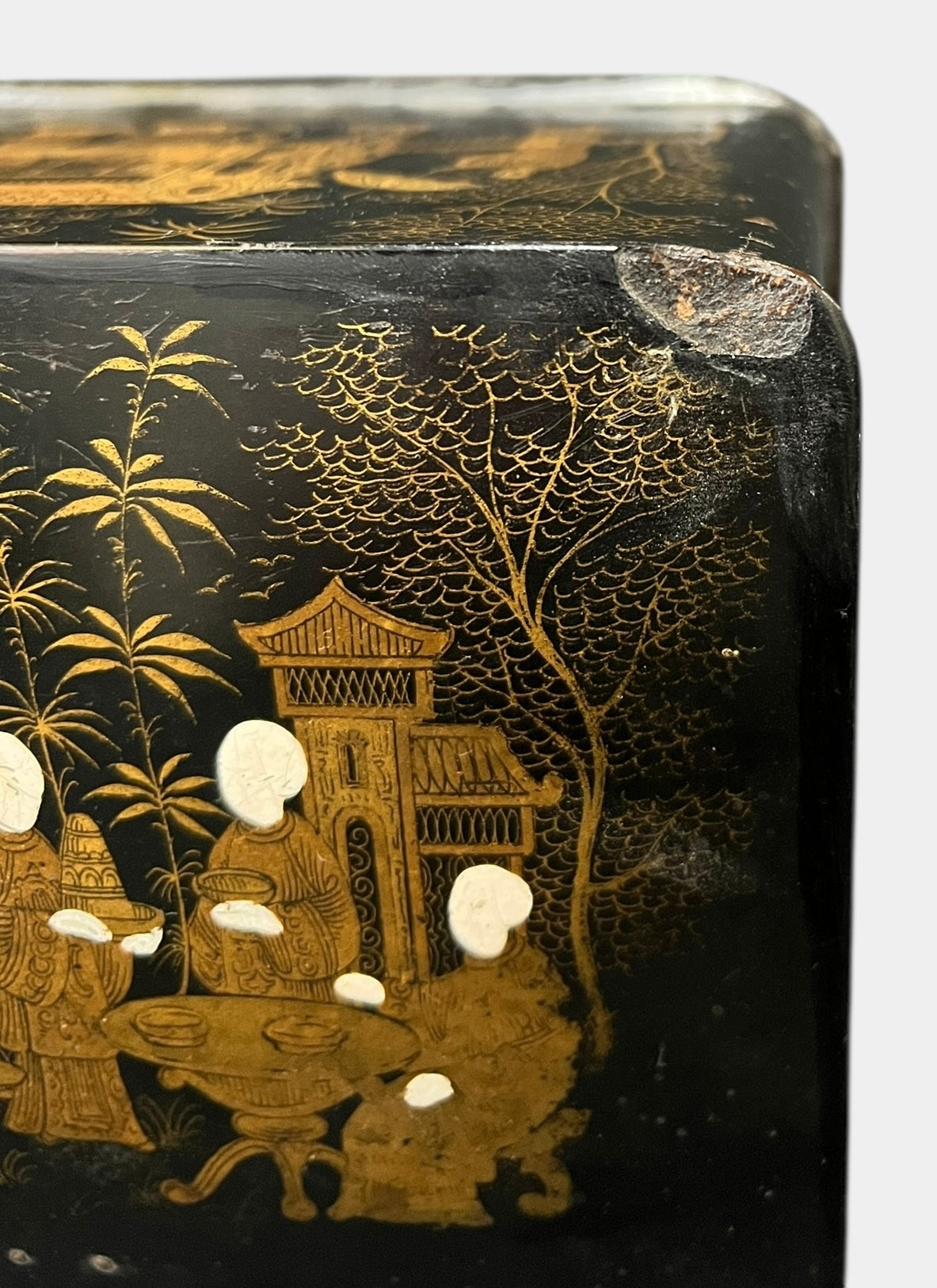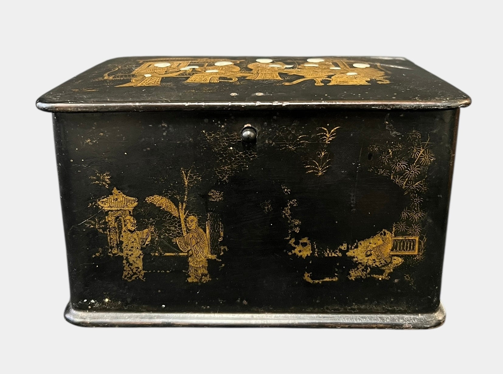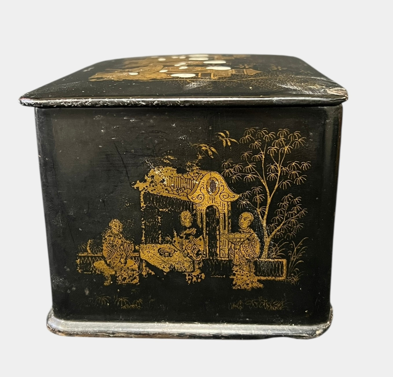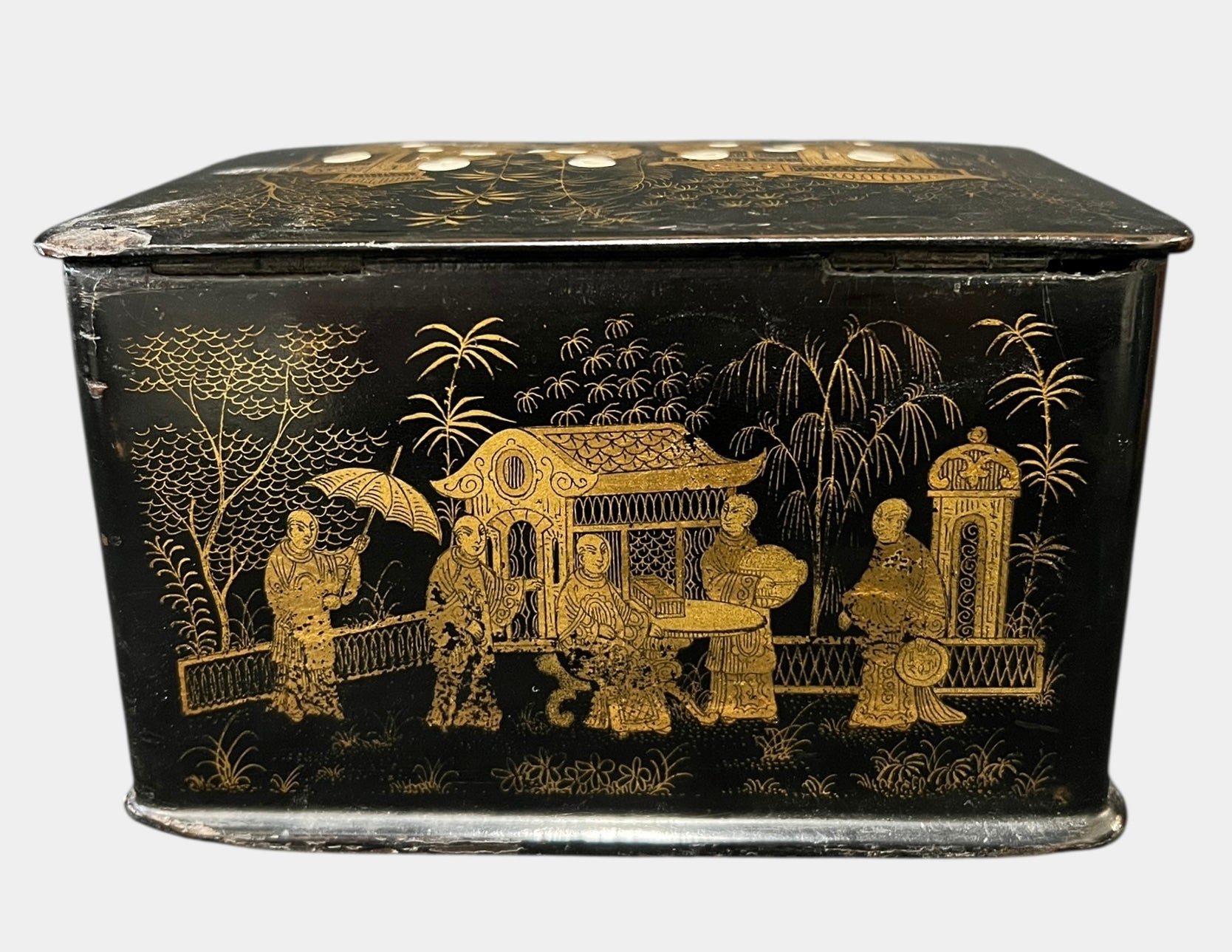 Antique 19th C Chinese Export Gilt Lacquer Black and Gold Tea Caddy Box
