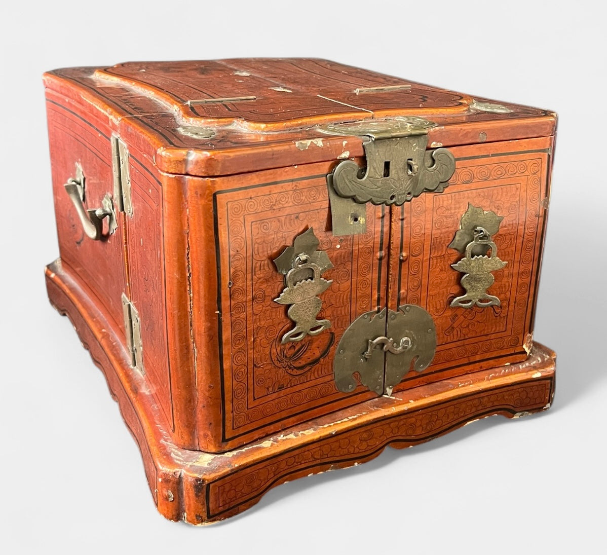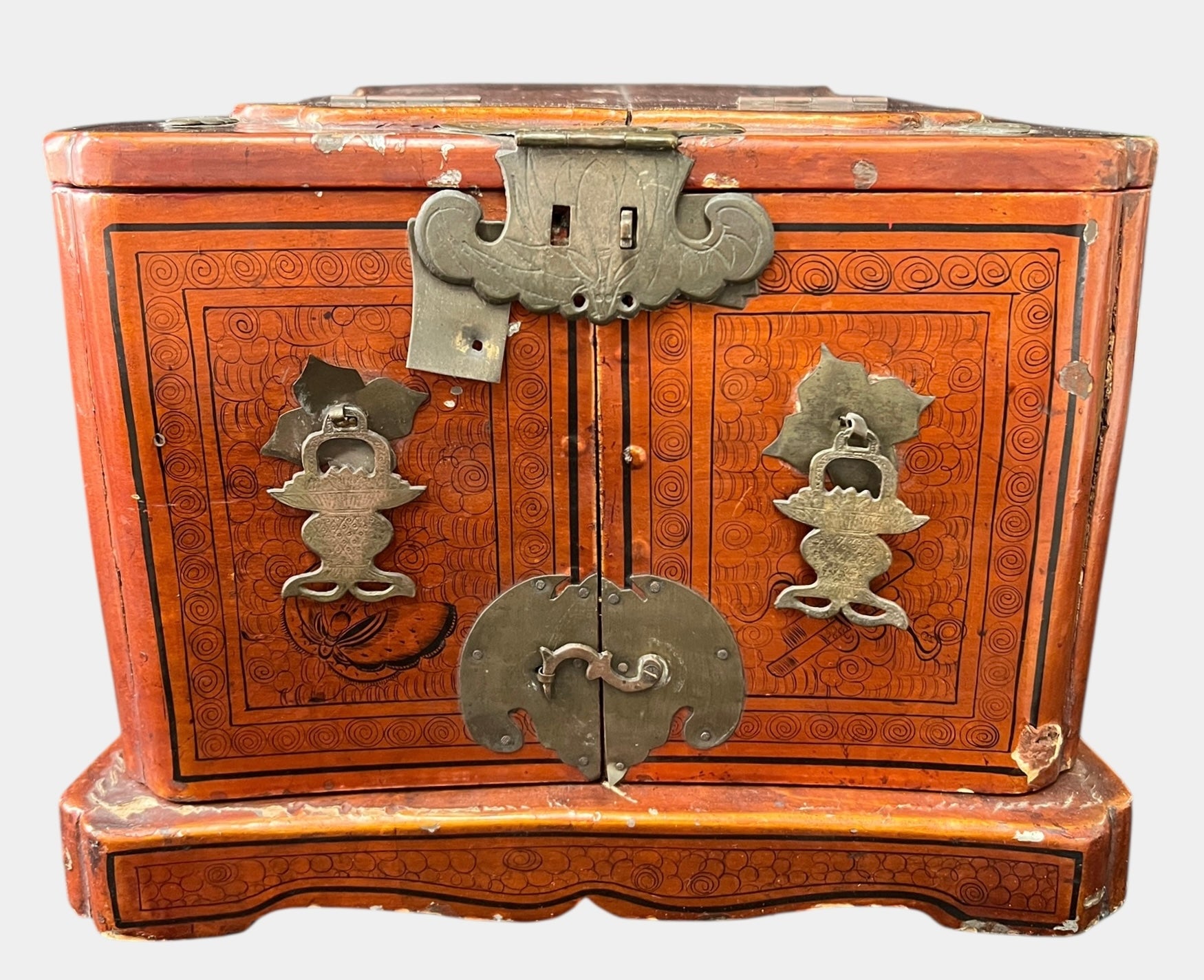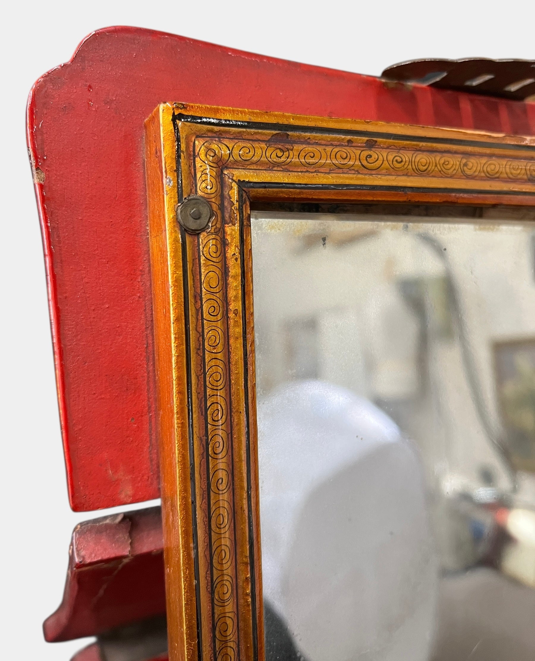 In decent condition. Some chipped finish, the mirror needs to be re-glued, and has some missing screws from the metal on the front of the box. Otherwise, nice. Please view and zoom in on each photo taken.