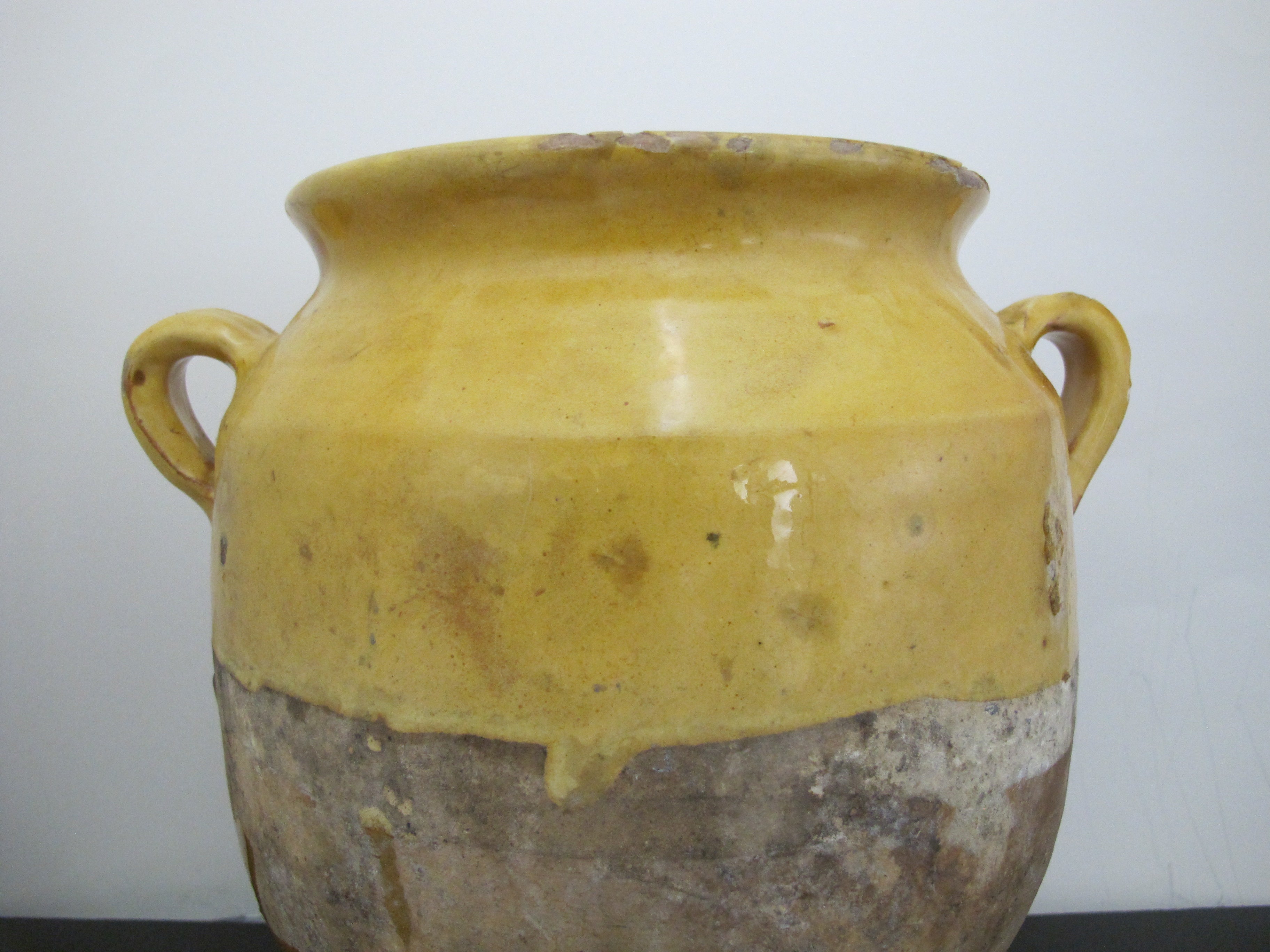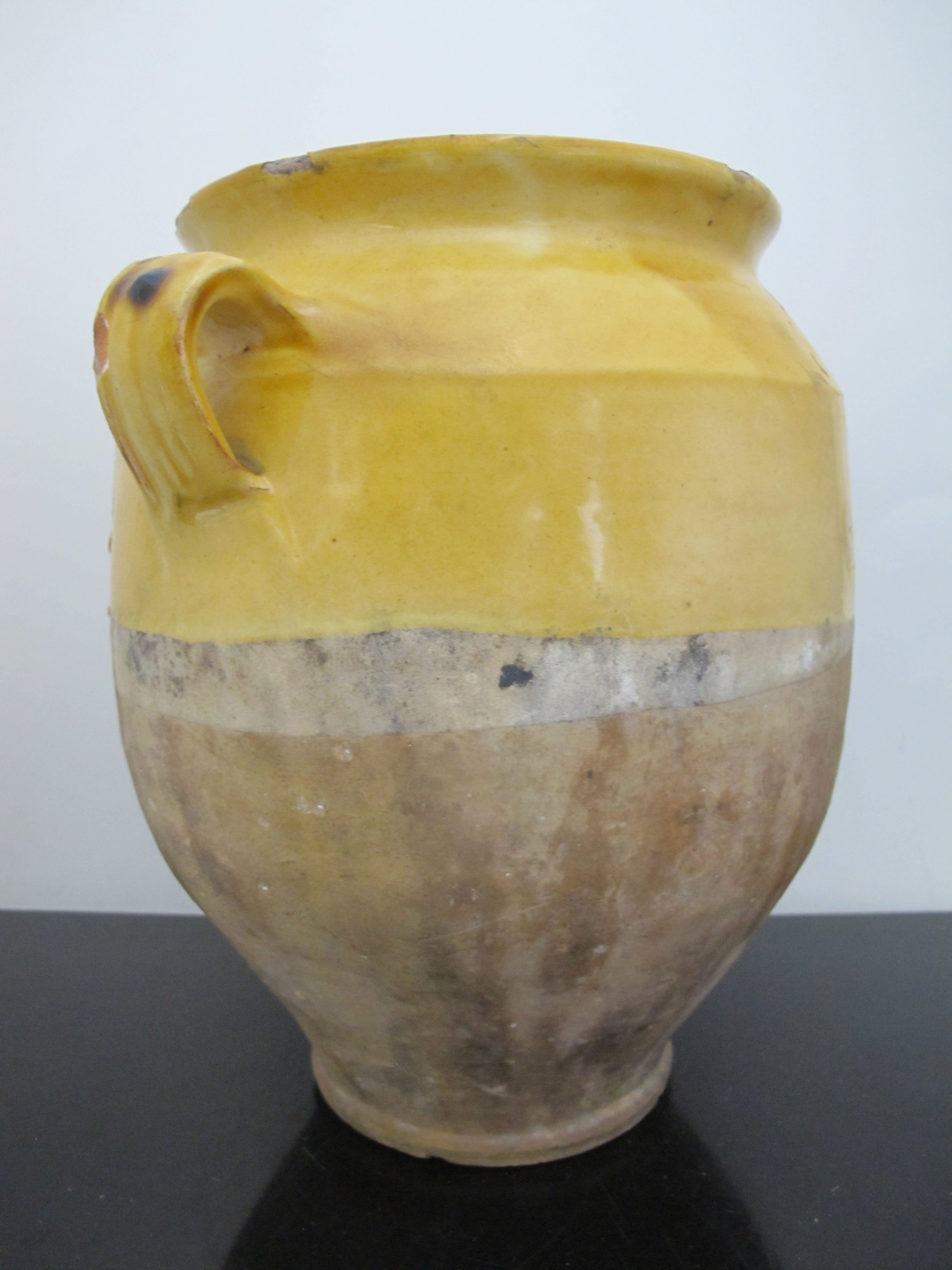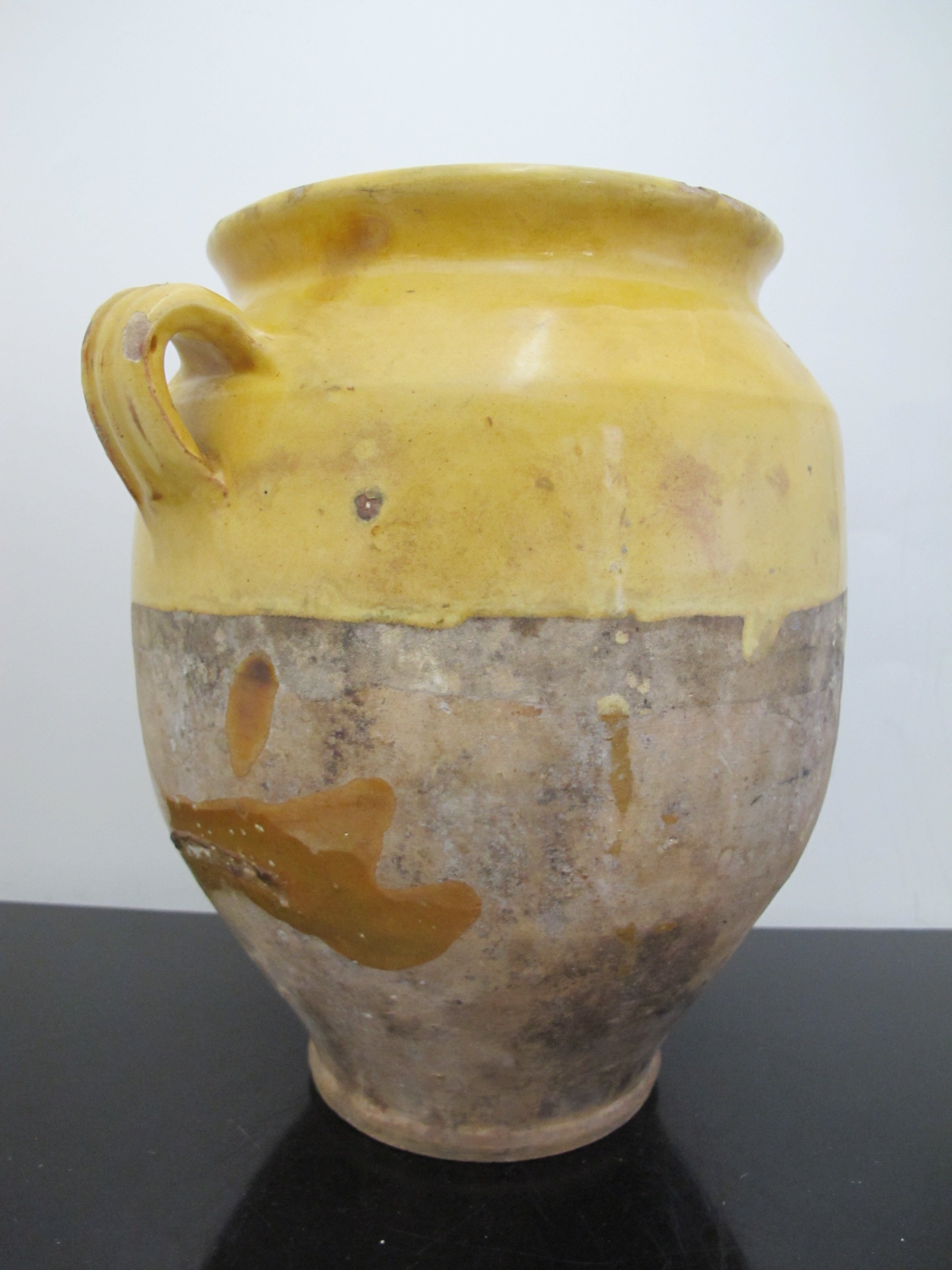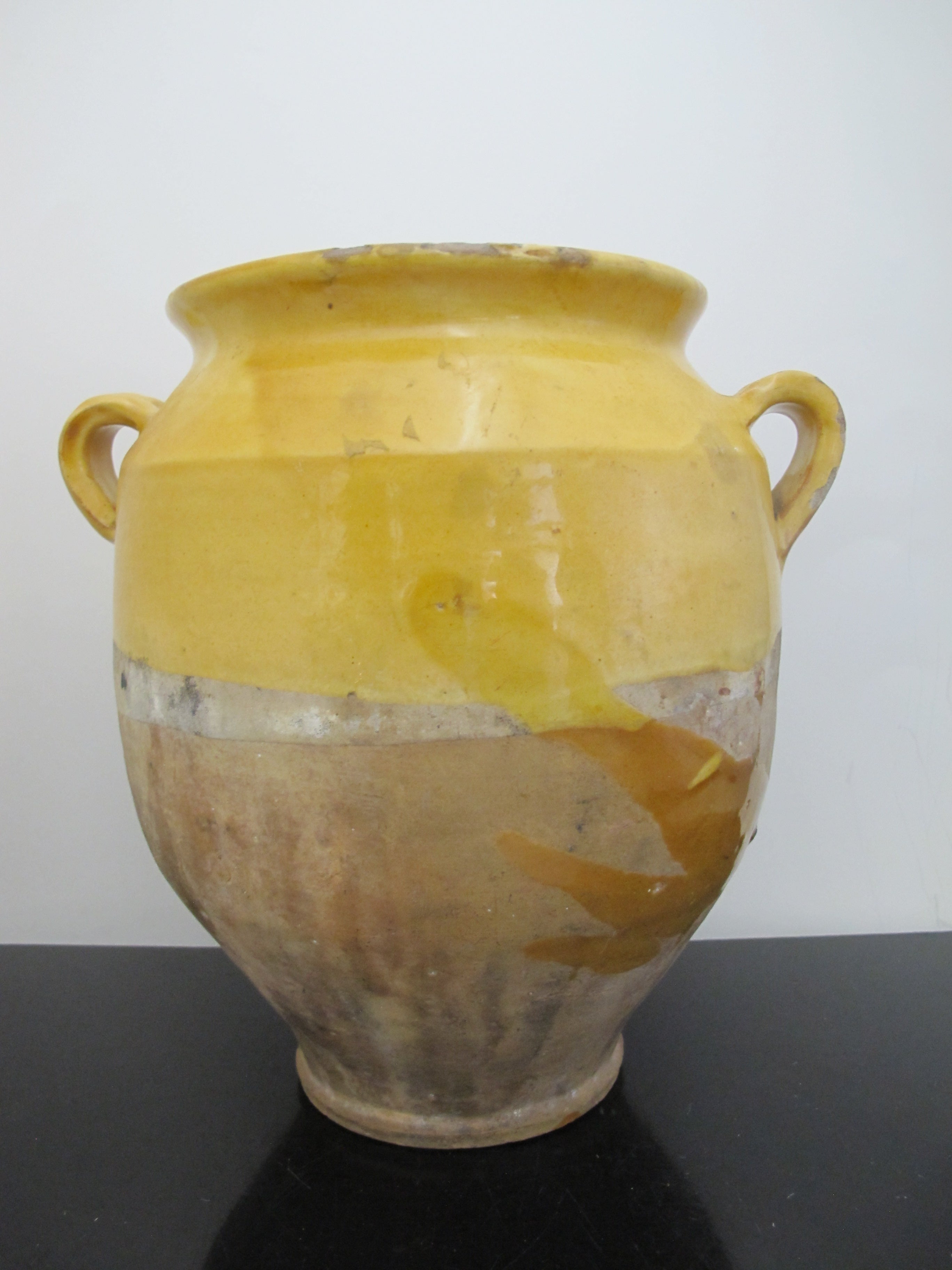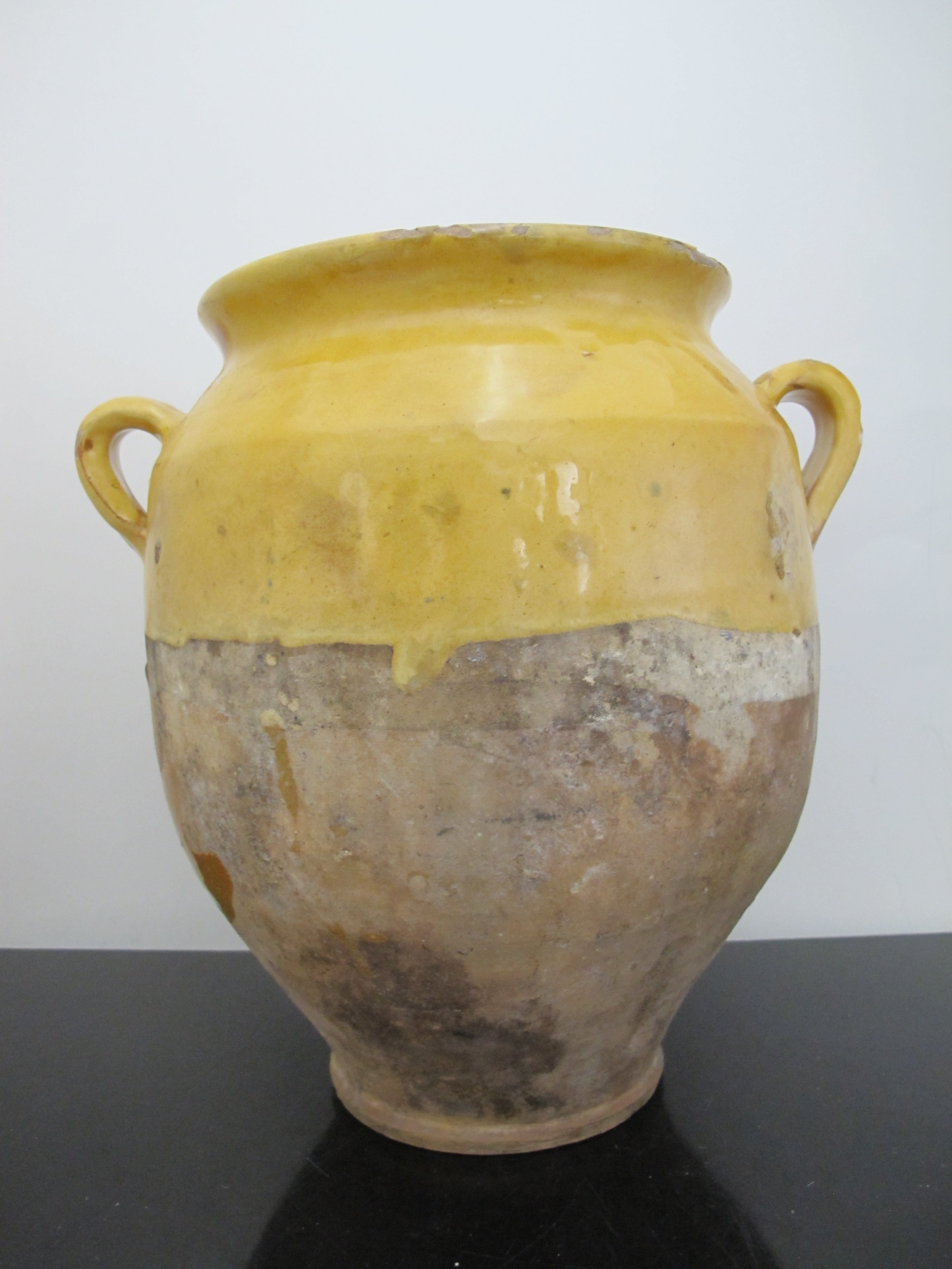 Wonderful antique French Confit pot. Large jug with handle at each side, measures 10 1/2" x 10" x 8". Classic yellow colored pottery and glaze, dating from early to mid to late 1800's. Historically they would have been used to store Confit Du Canard and may have had a lid. Would make a lovely colorful vase or planter for a rustic home vibe. Overall, excellent condition with some wear to glaze, but nothing major, considering it's old age. No major chips, cracks, or repairs found.