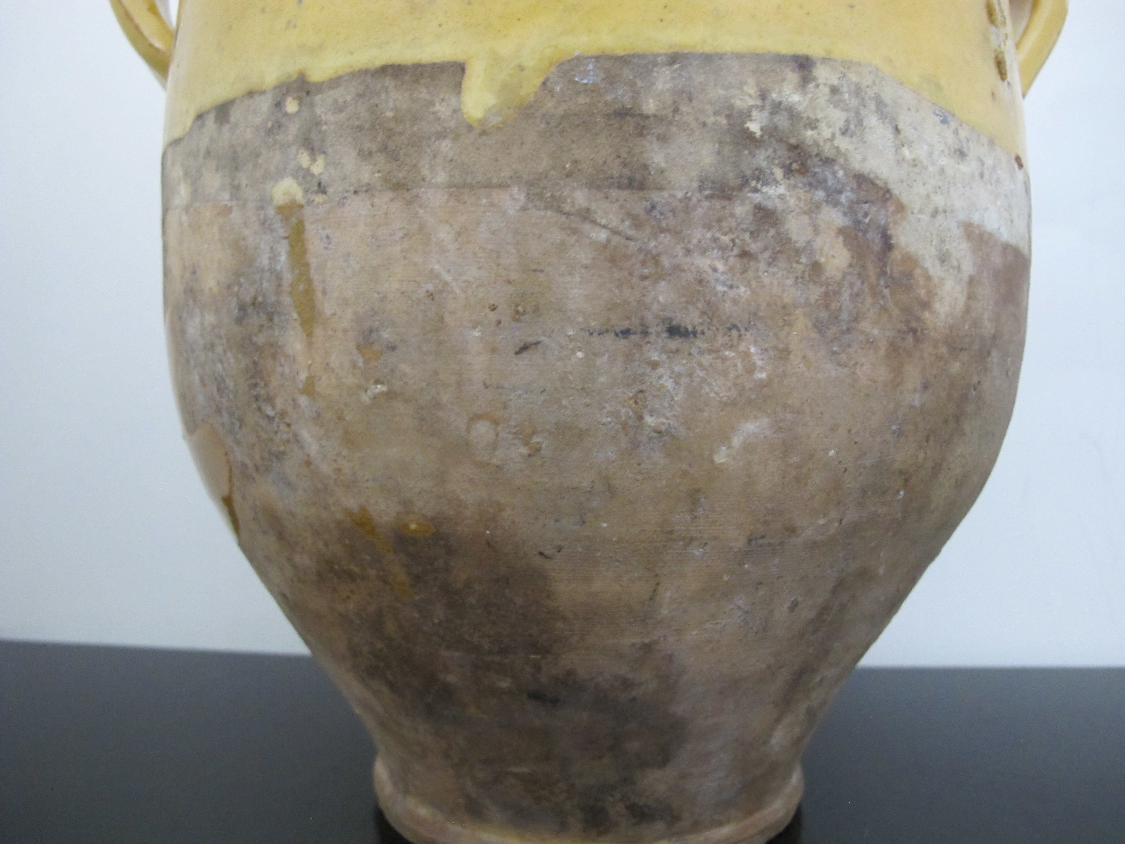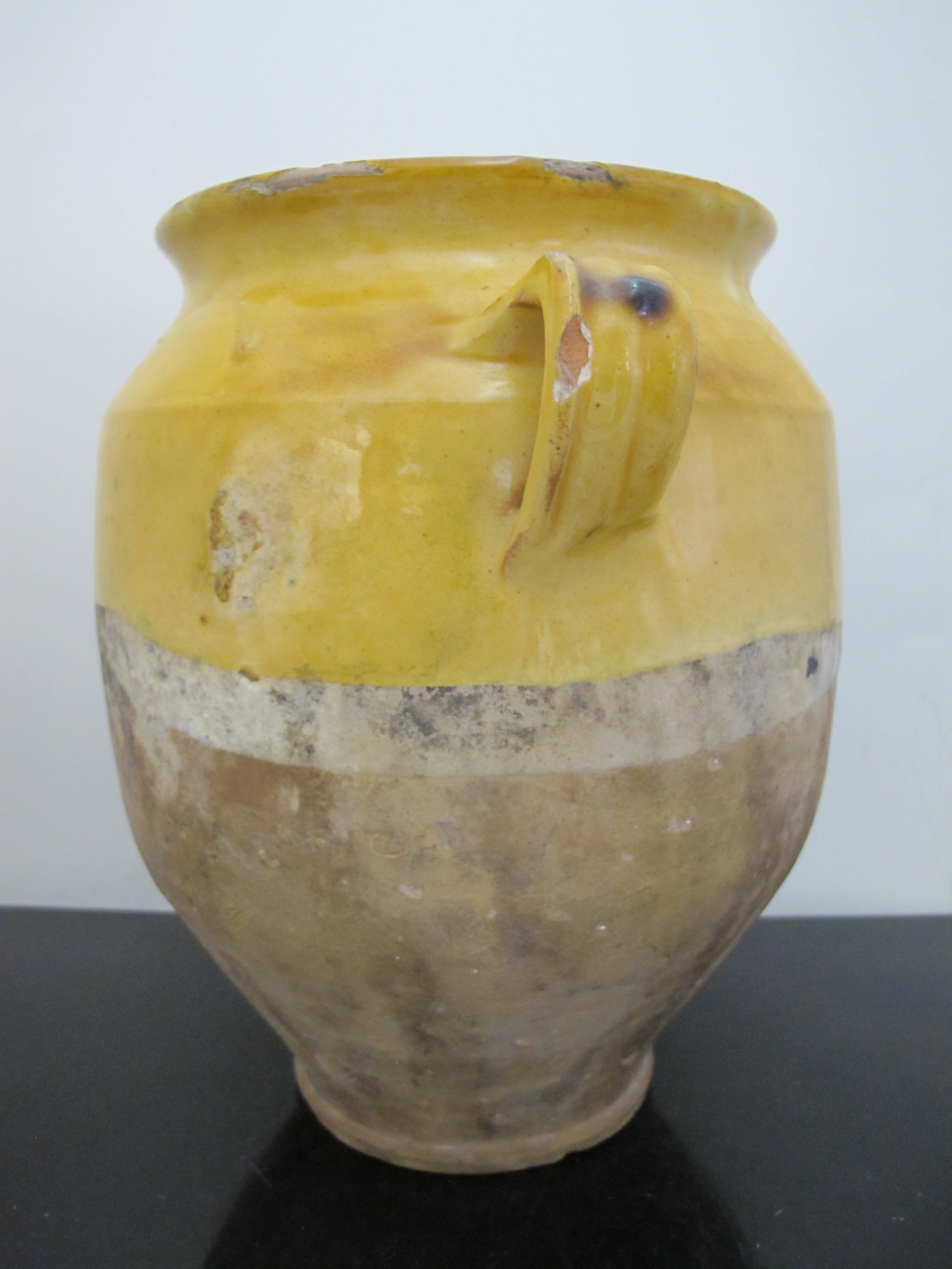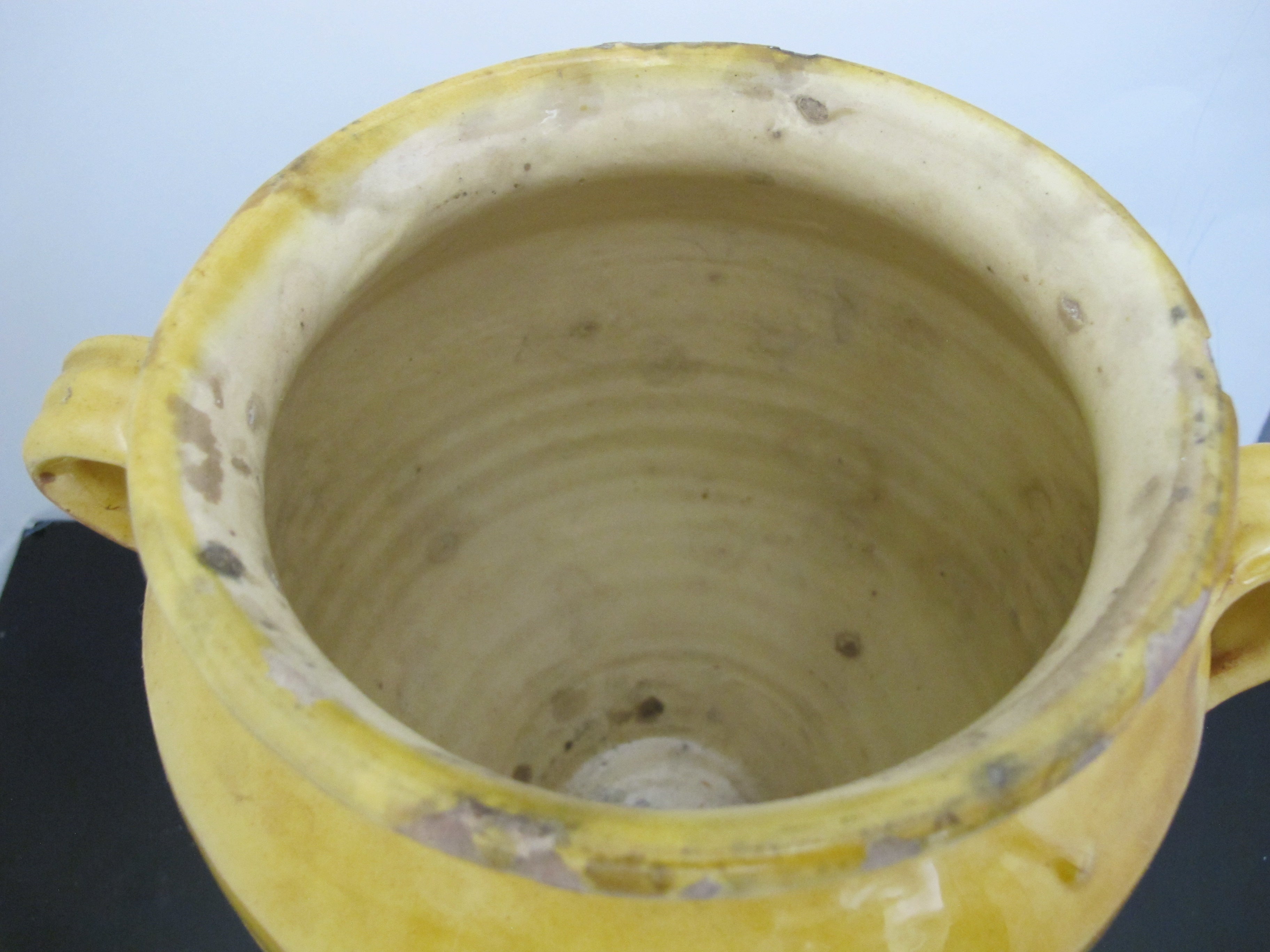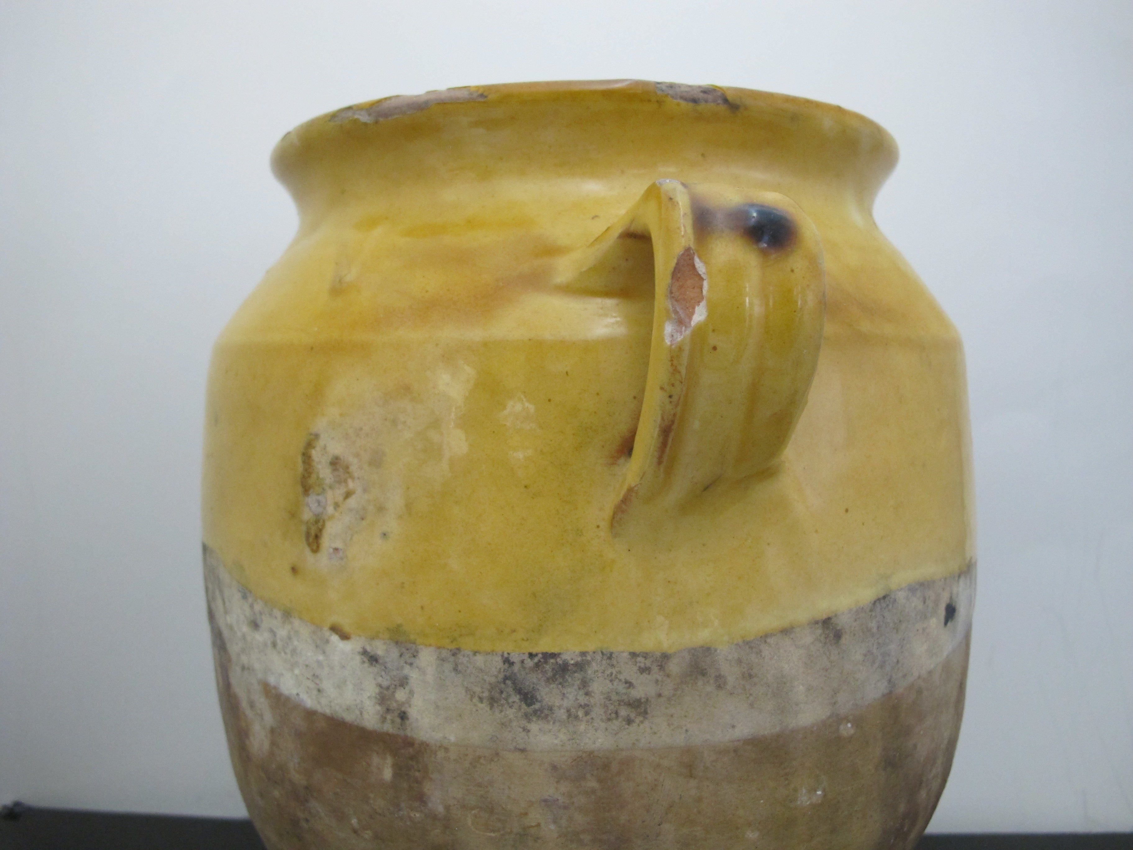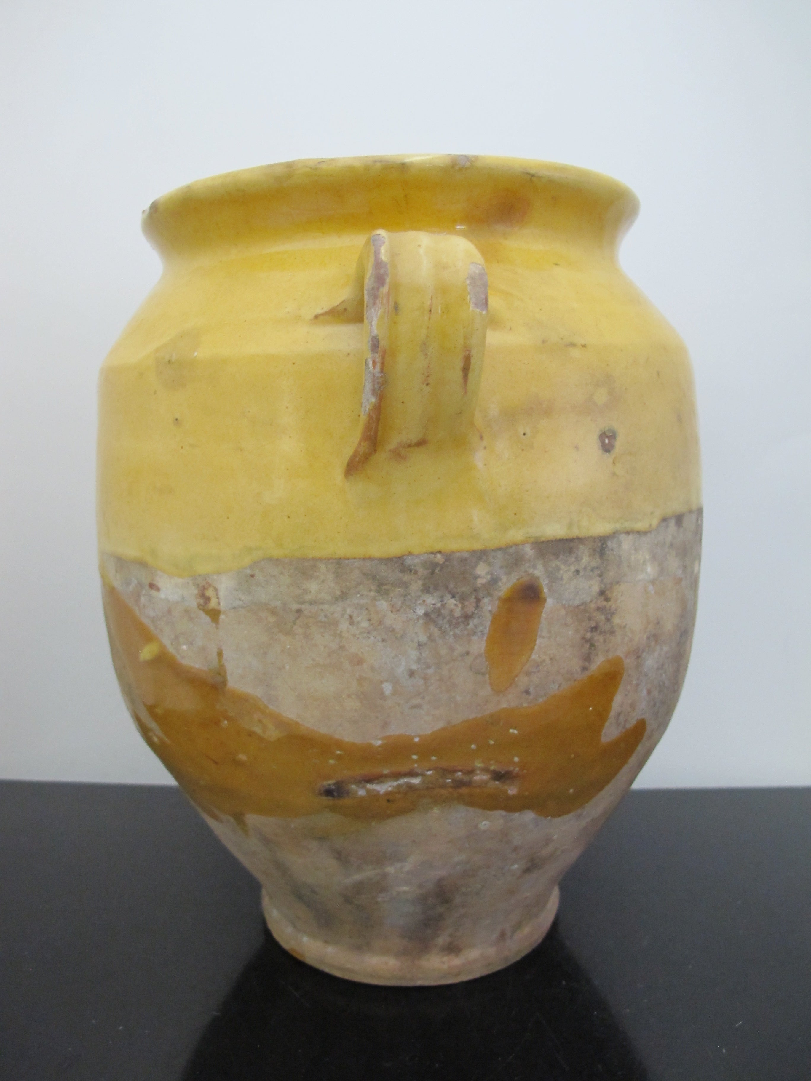 Wonderful antique French Confit pot. Large jug with handle at each side, measures 10 1/2" x 10" x 8". Classic yellow colored pottery and glaze, dating from early to mid to late 1800's. Historically they would have been used to store Confit Du Canard and may have had a lid. Would make a lovely colorful vase or planter for a rustic home vibe. Overall, excellent condition with some wear to glaze, but nothing major, considering it's old age. No major chips, cracks, or repairs found.