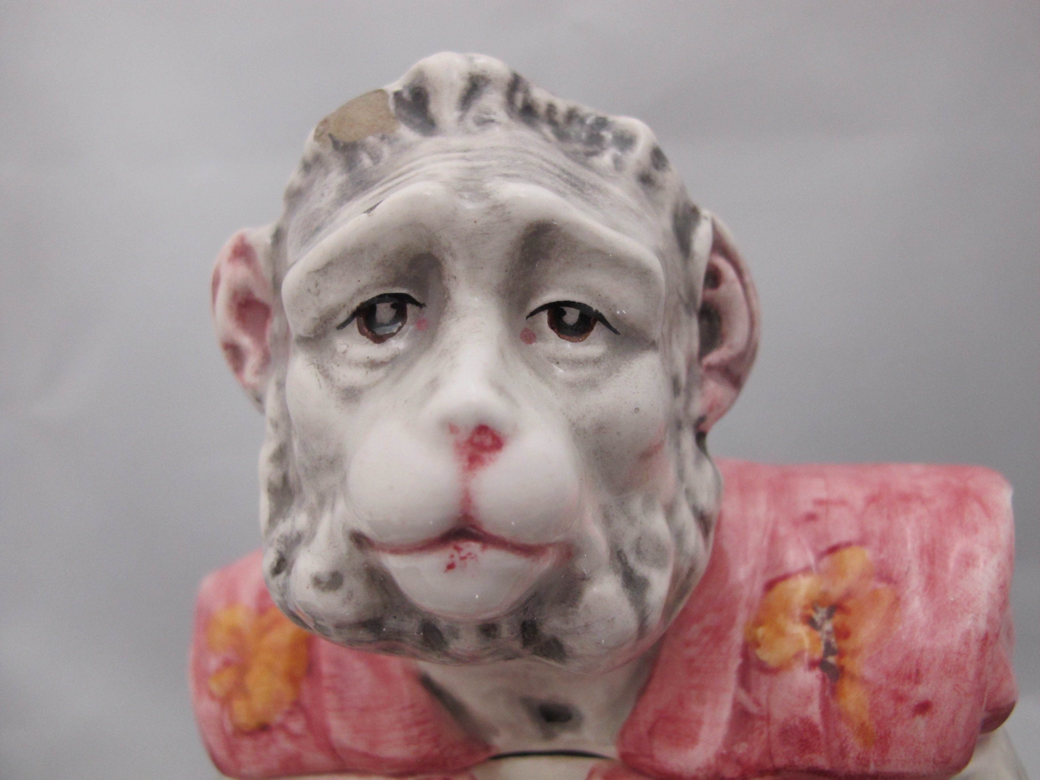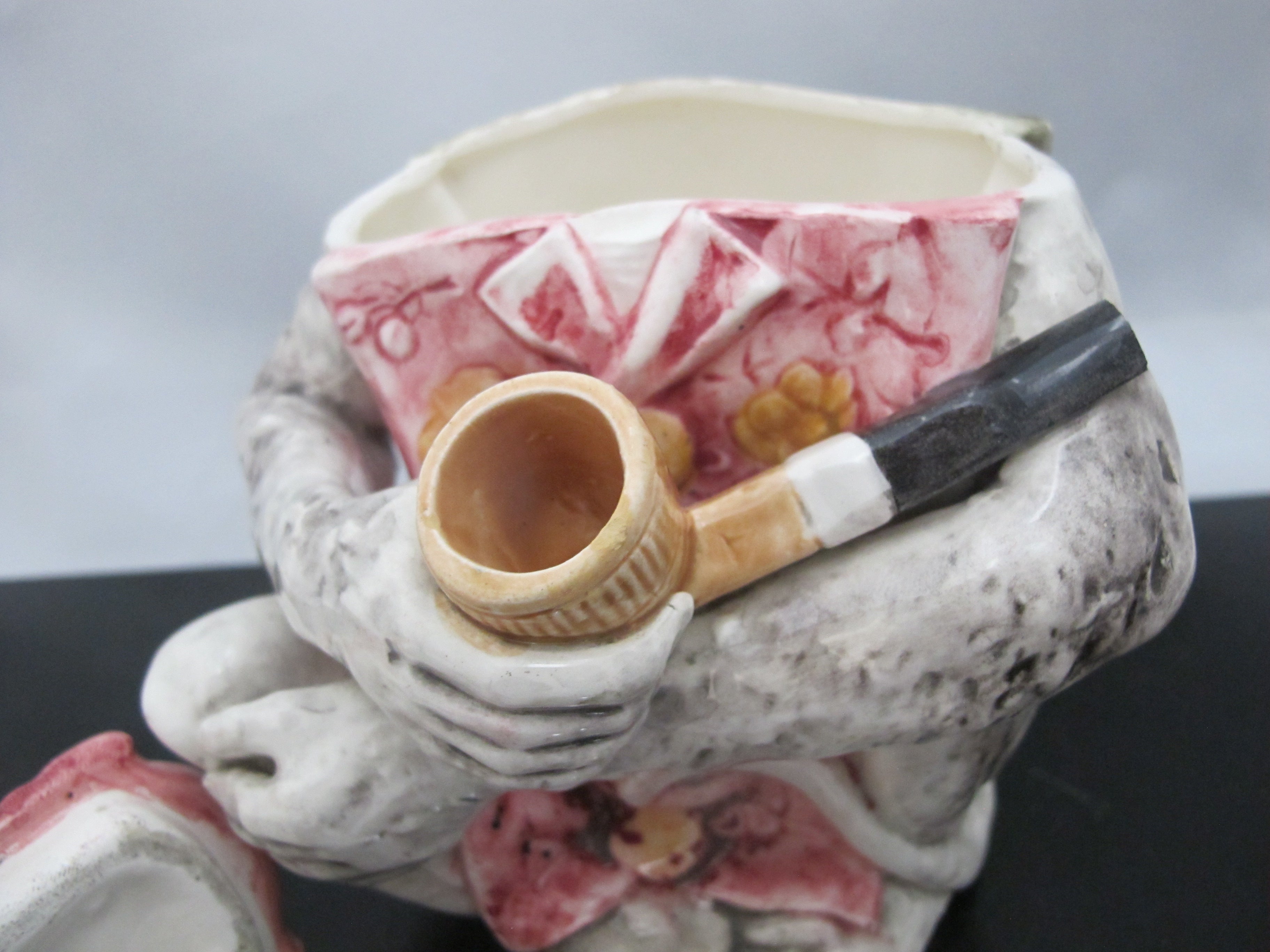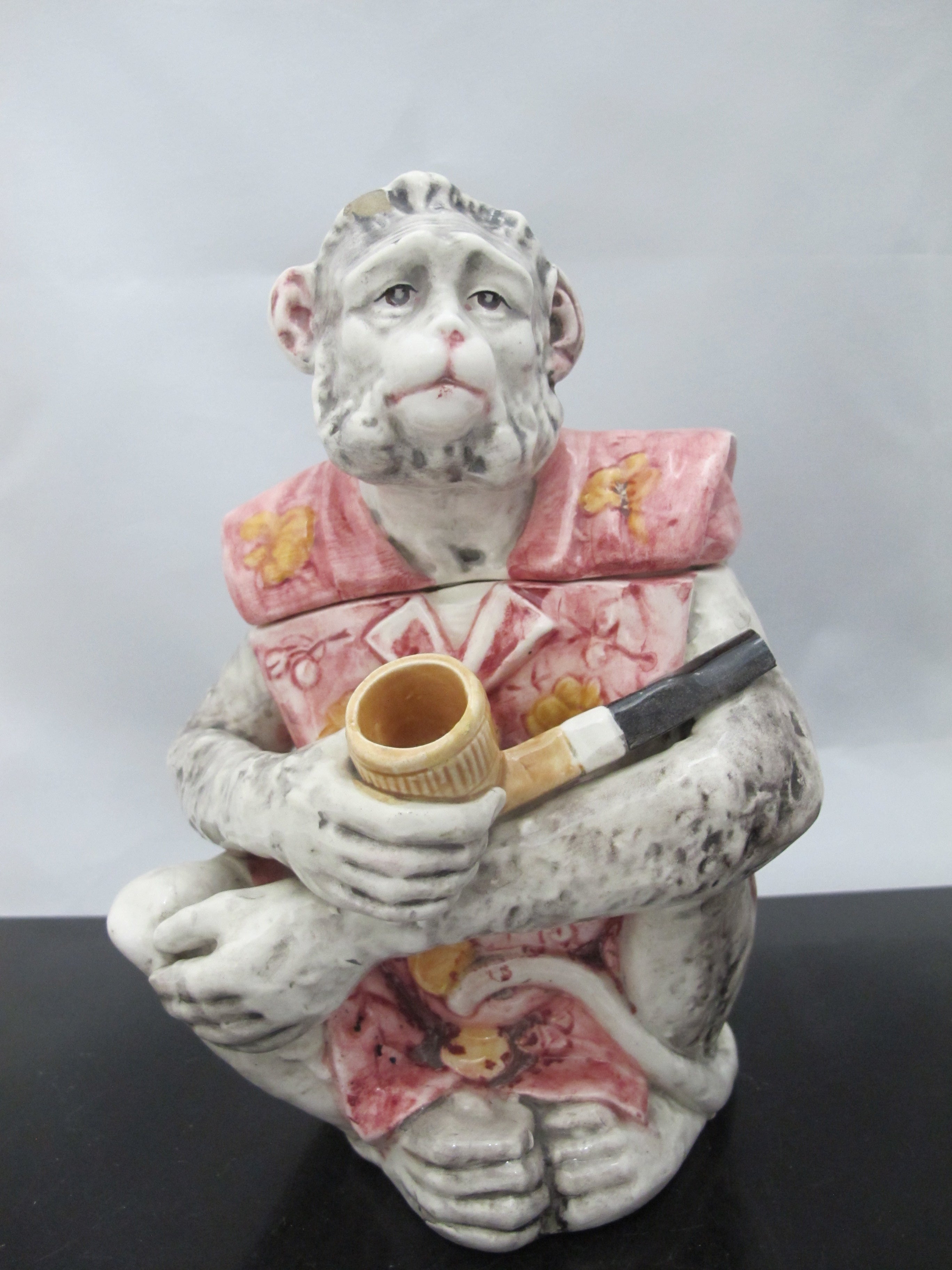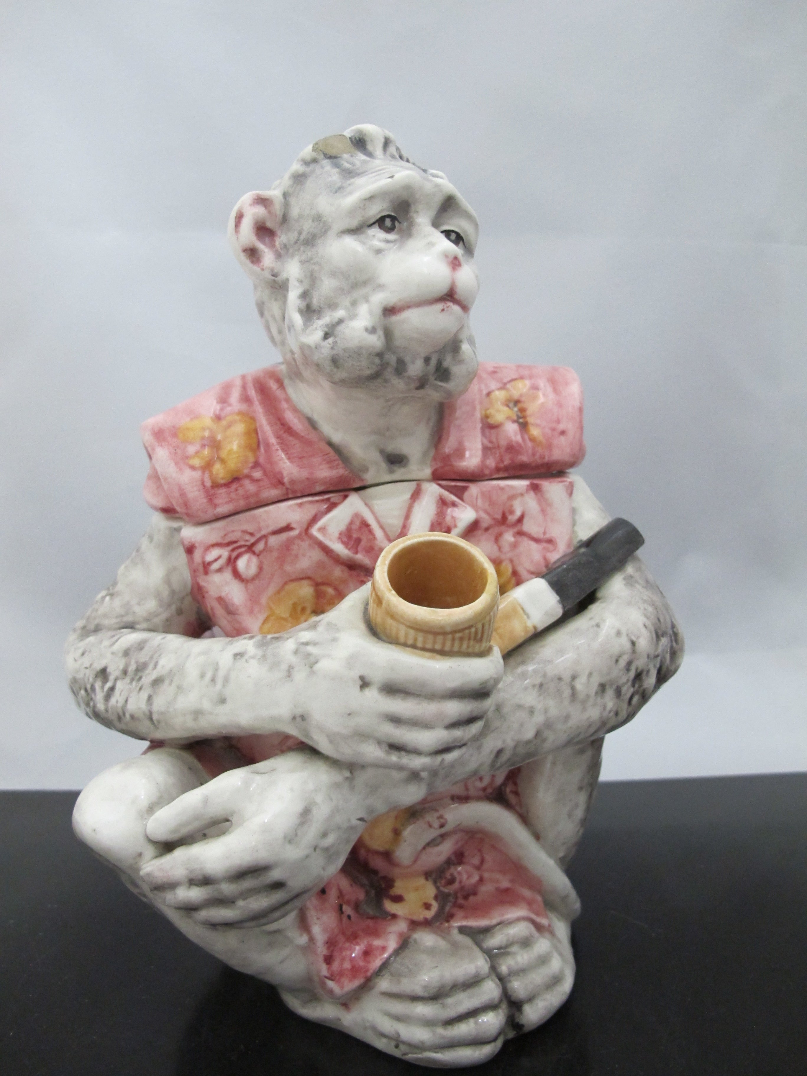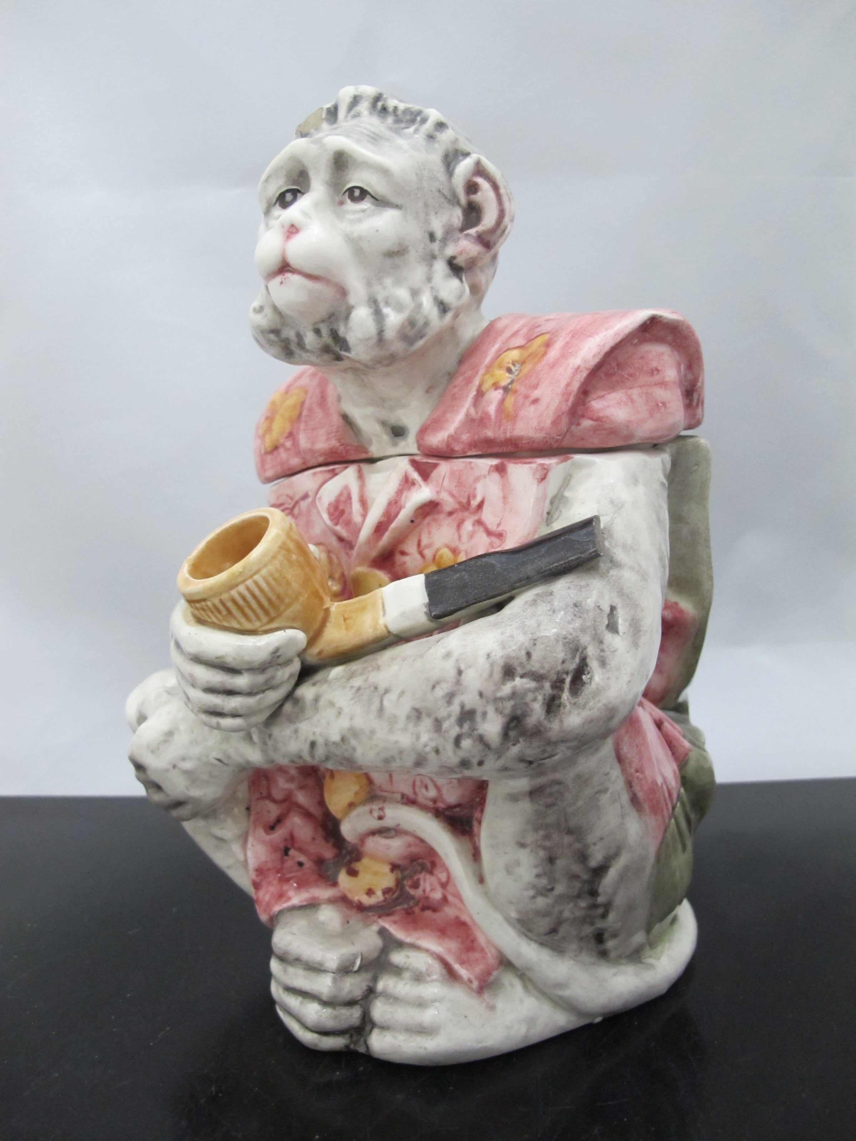 Antique Majolica pottery tobacco humidor. A pensive monkey sits while smoking a pipe.