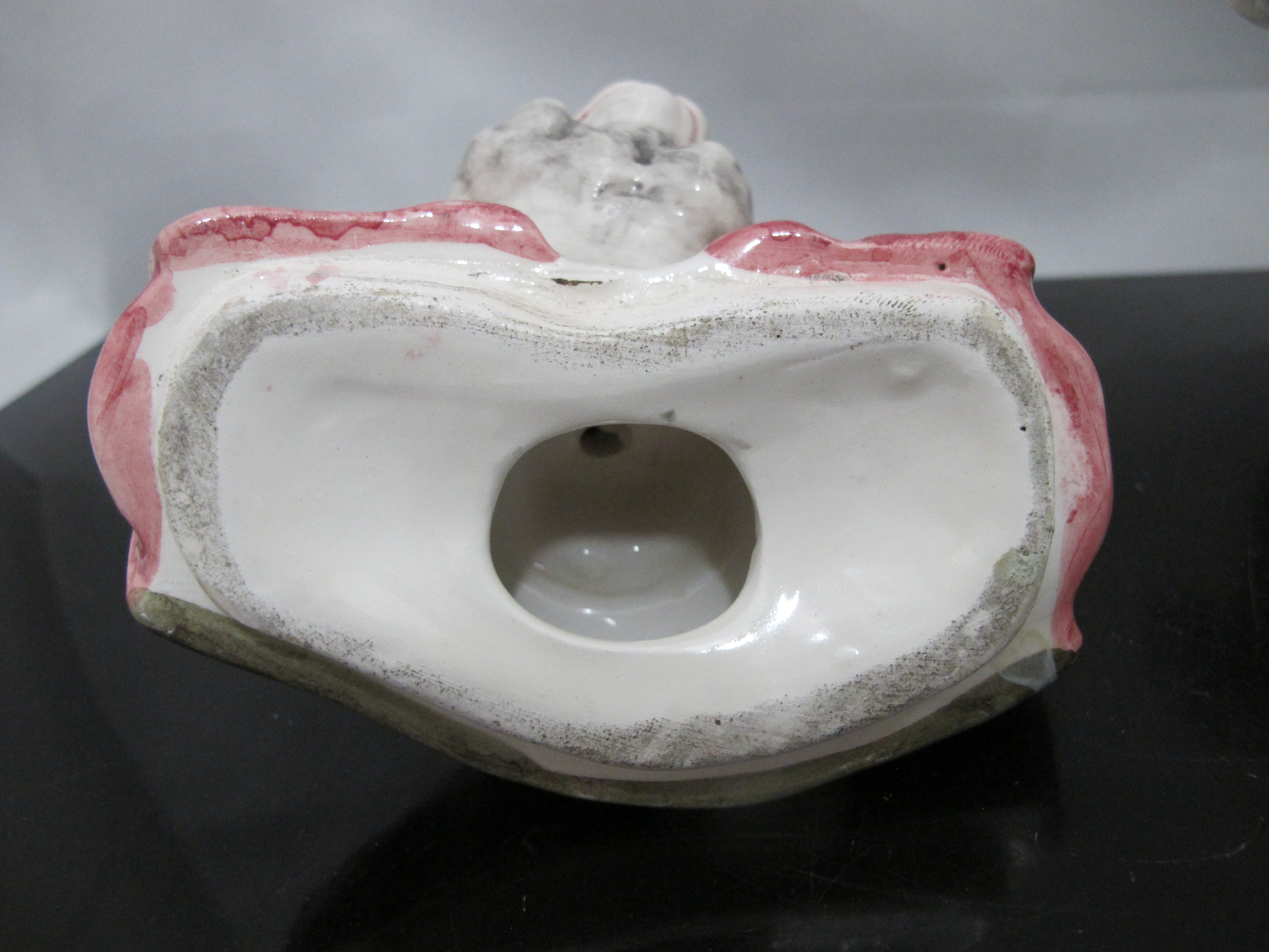 Glazed tones of pink, gray, and yellow. Measures 8 1/2" tall x 6" x 5".