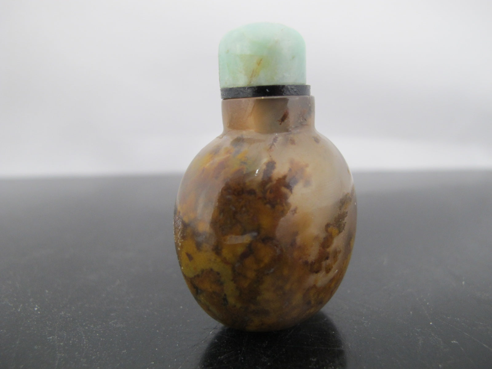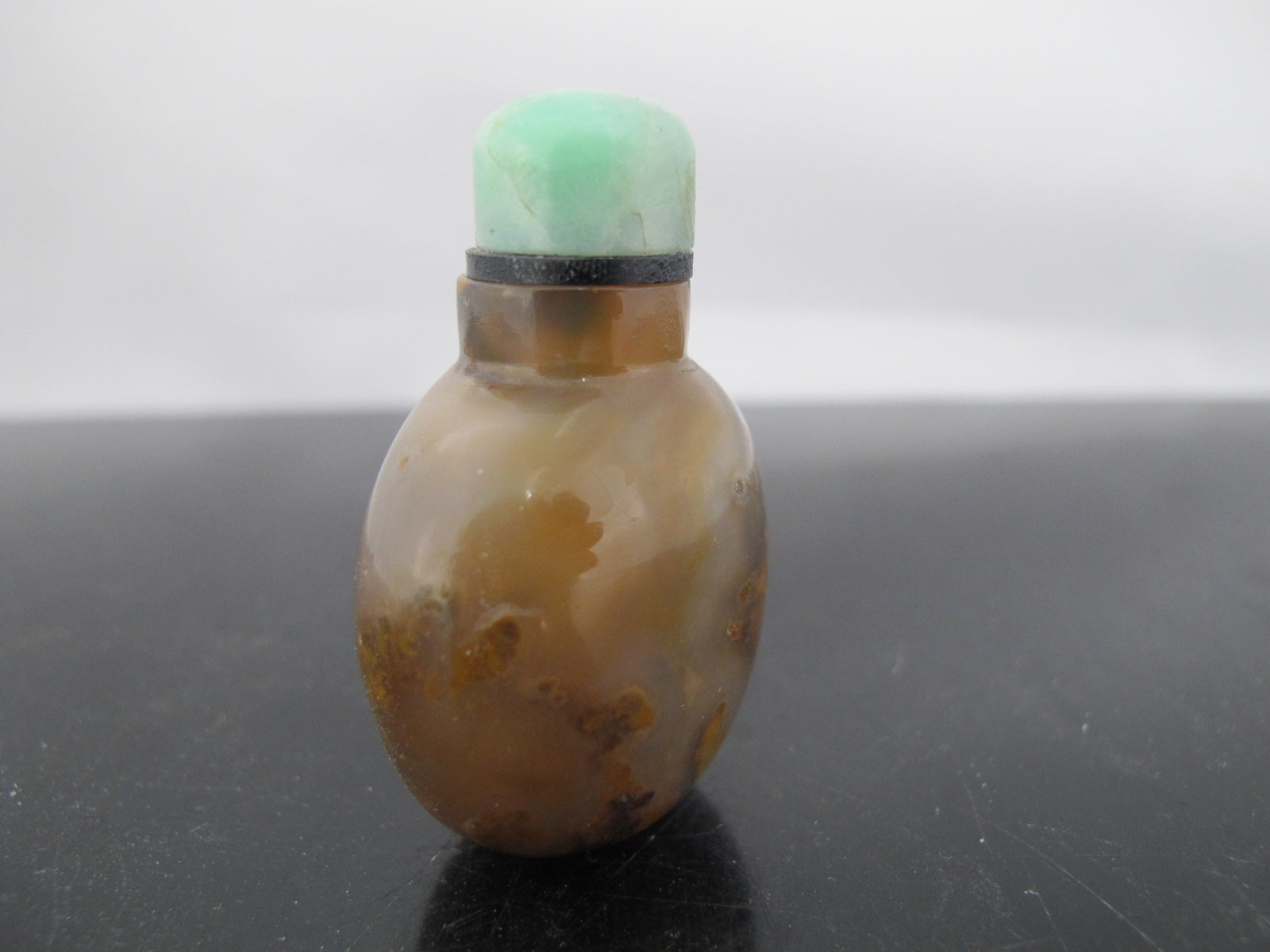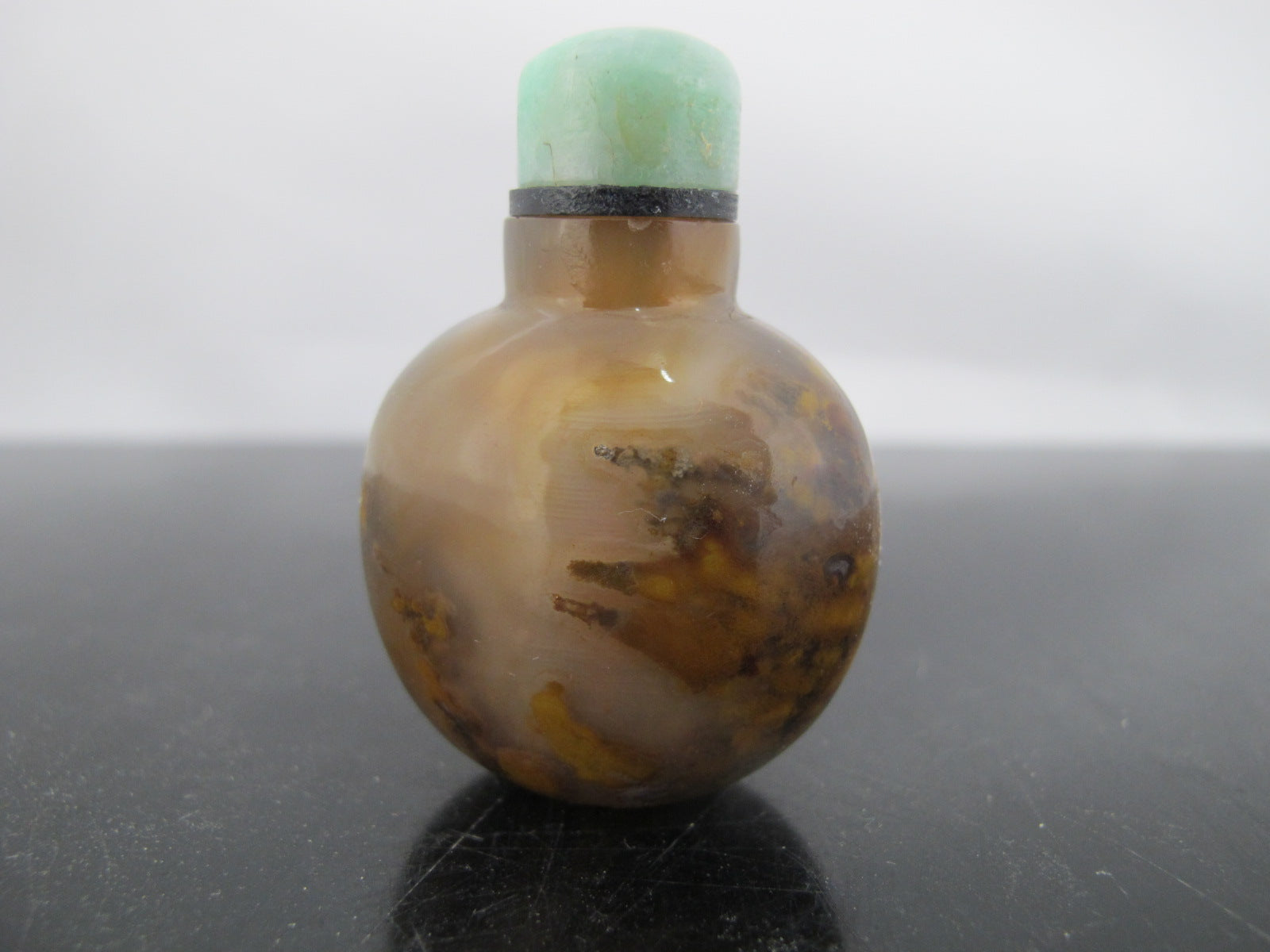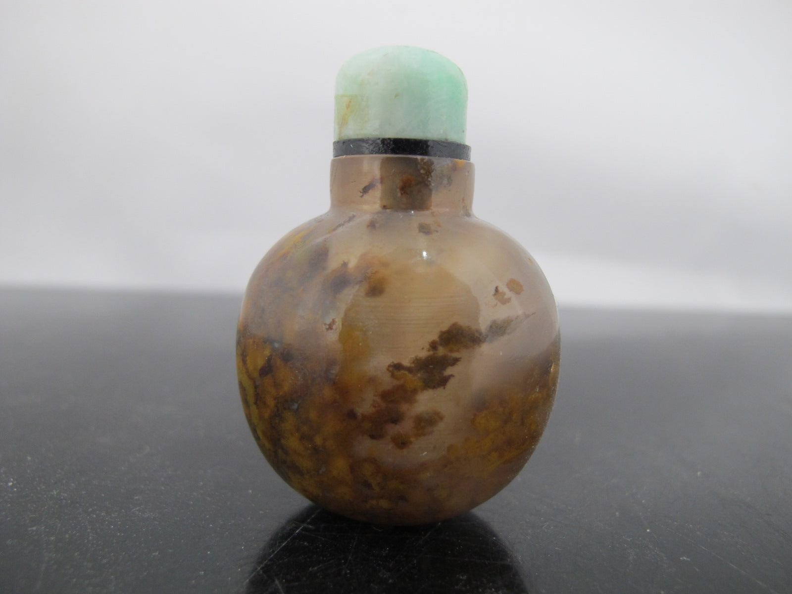 Small antique, most likely Qing dynasty era, Chinese snuff bottle. Small round bottle in translucent 'Shadow" agate showing natural, dark inclusions that create a "shadow" or "moss" effect. Green jade stopper with coral tone spoon intact.
