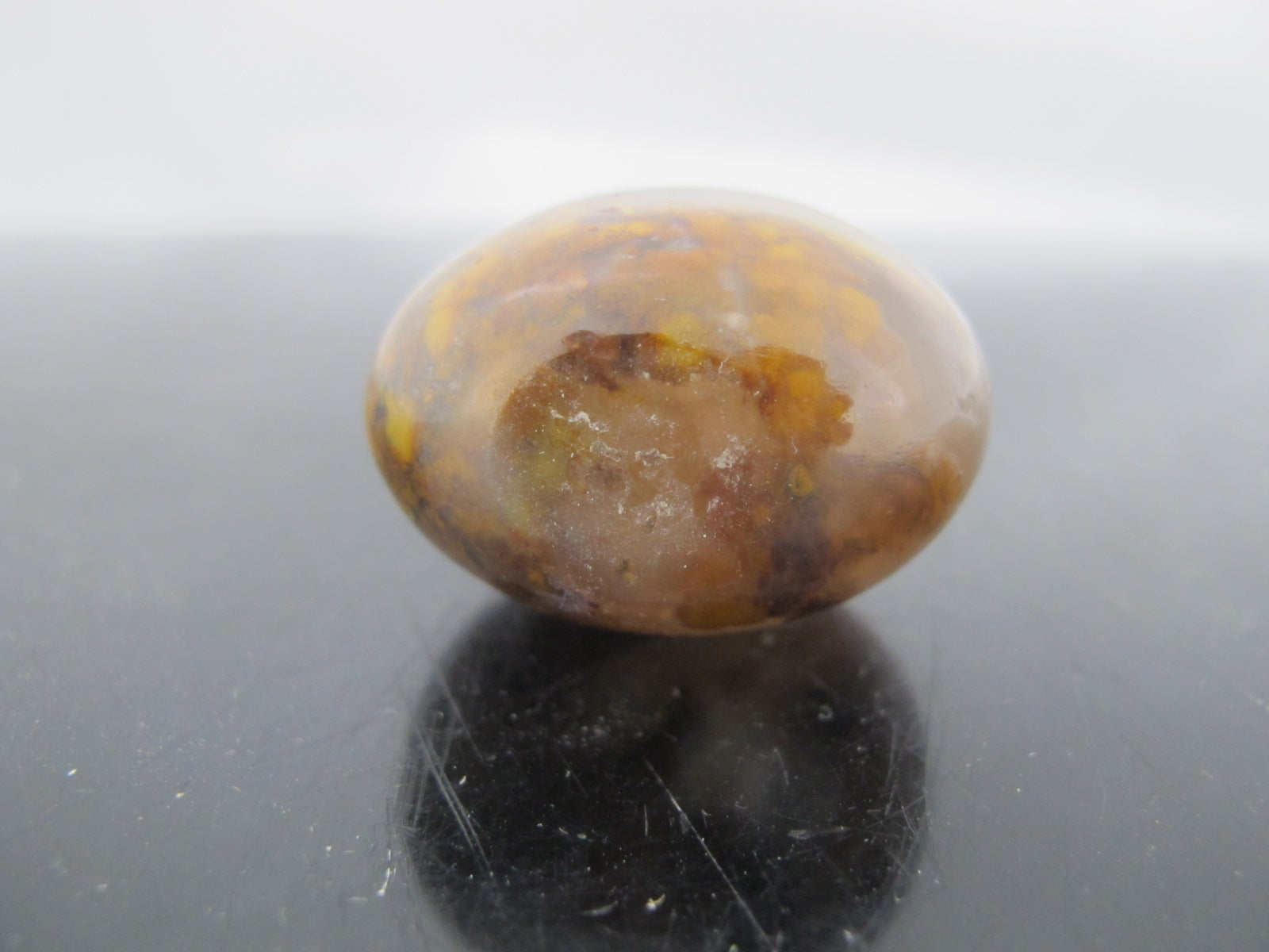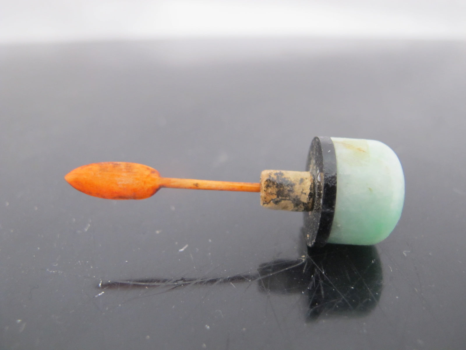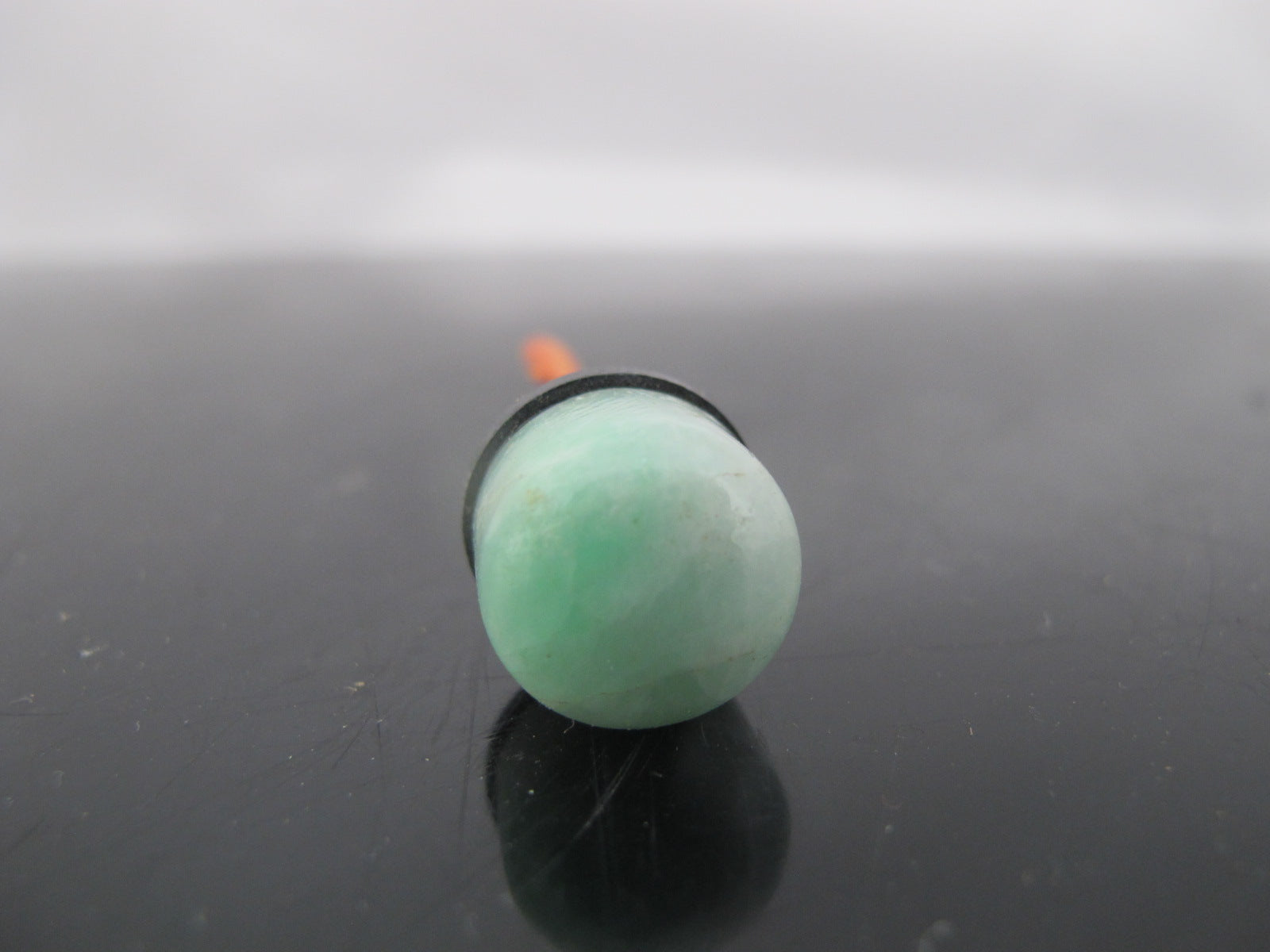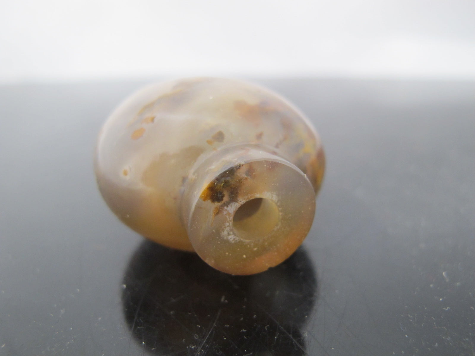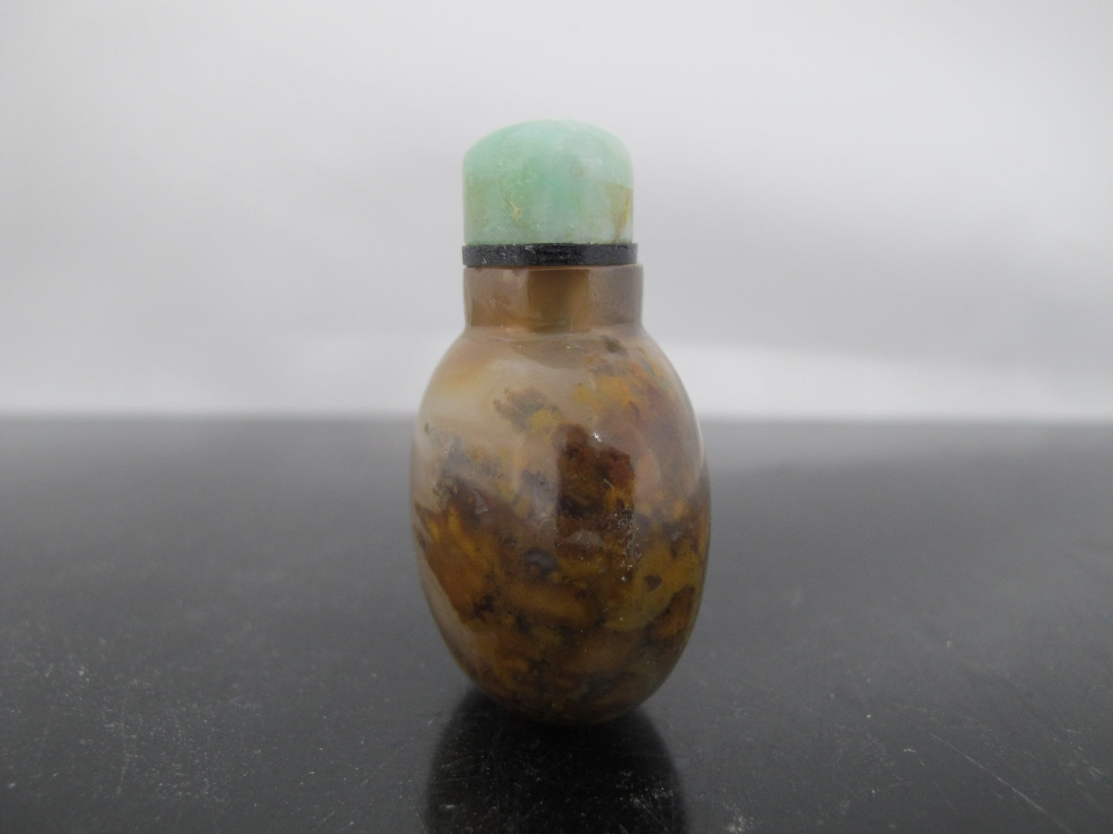 Small antique, most likely Qing dynasty era, Chinese snuff bottle. Small round bottle in translucent 'Shadow" agate showing natural, dark inclusions that create a "shadow" or "moss" effect. Green jade stopper with coral tone spoon intact.