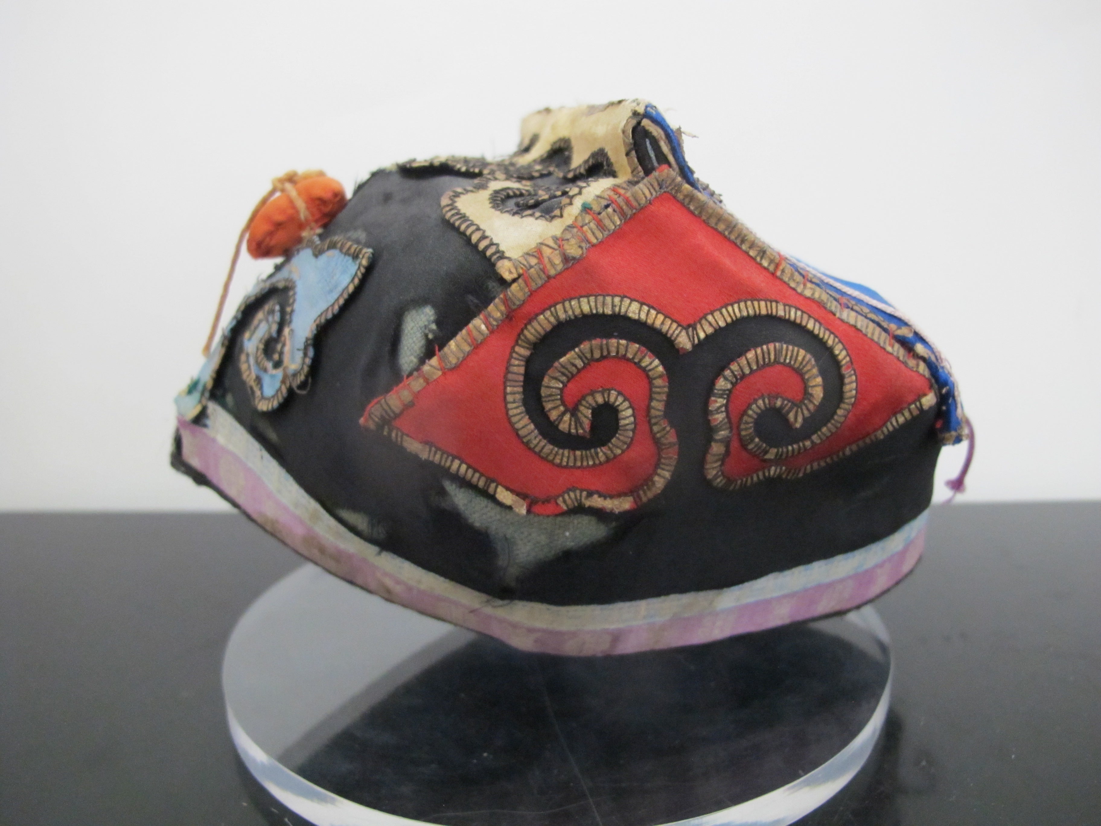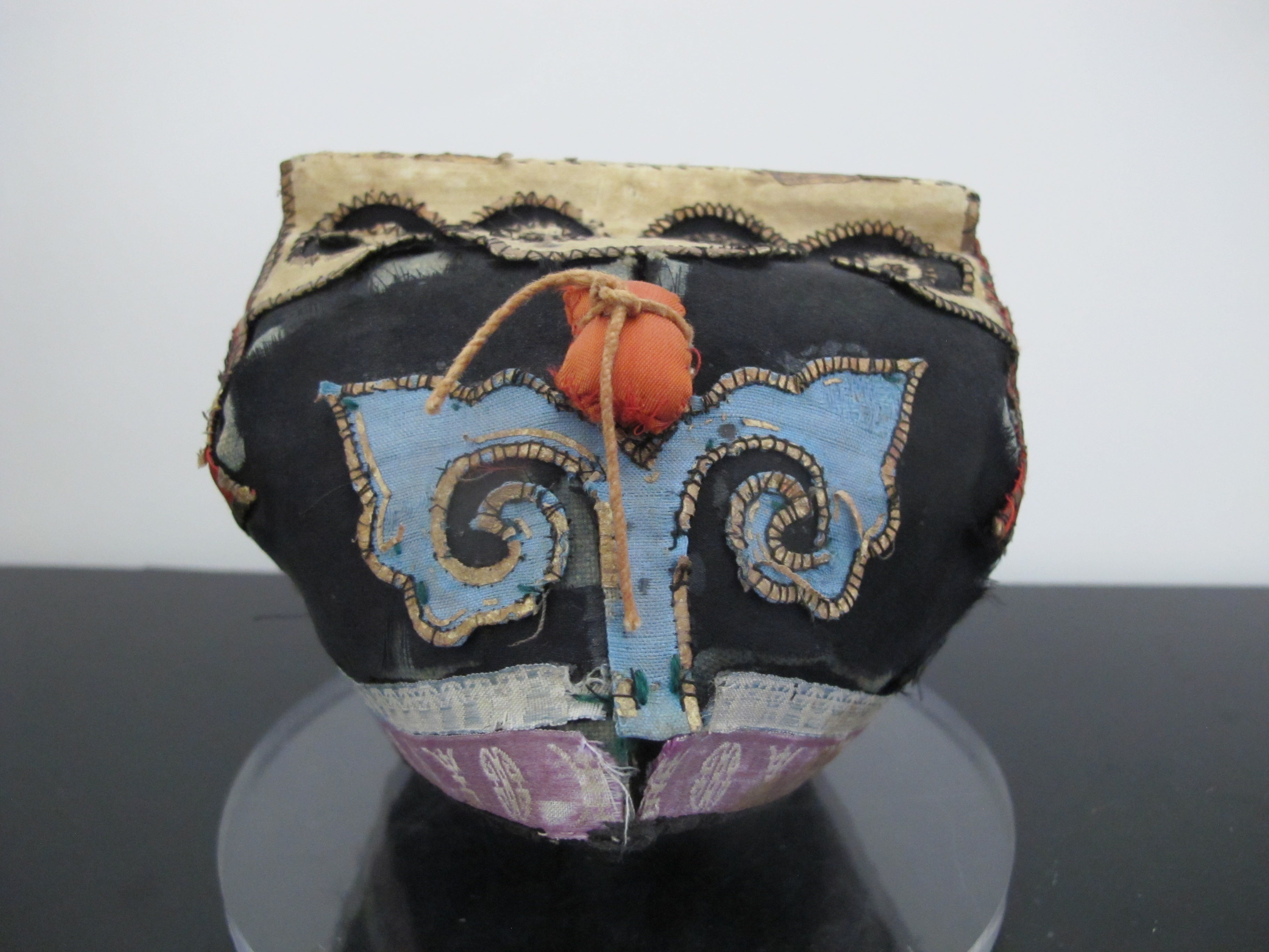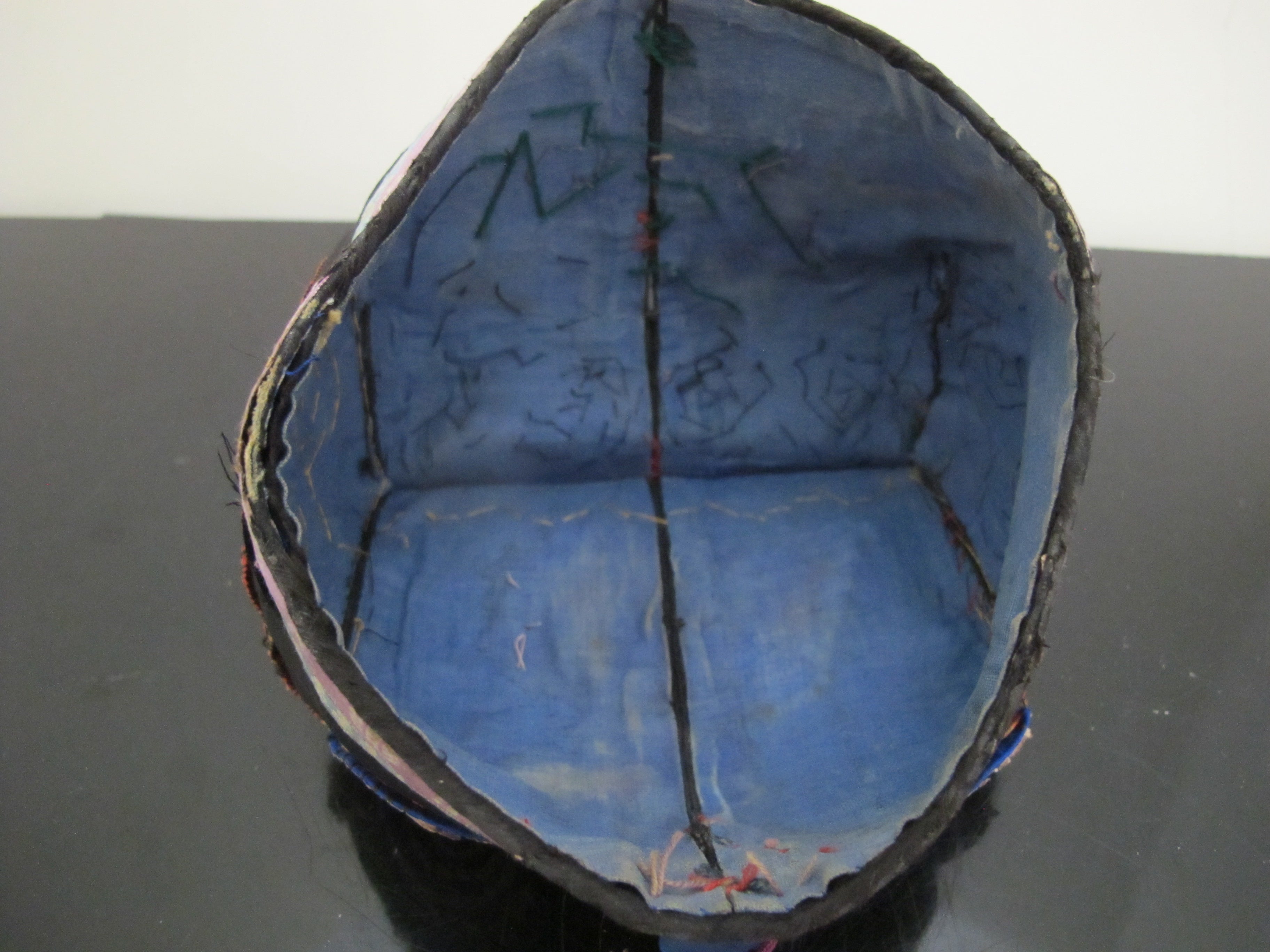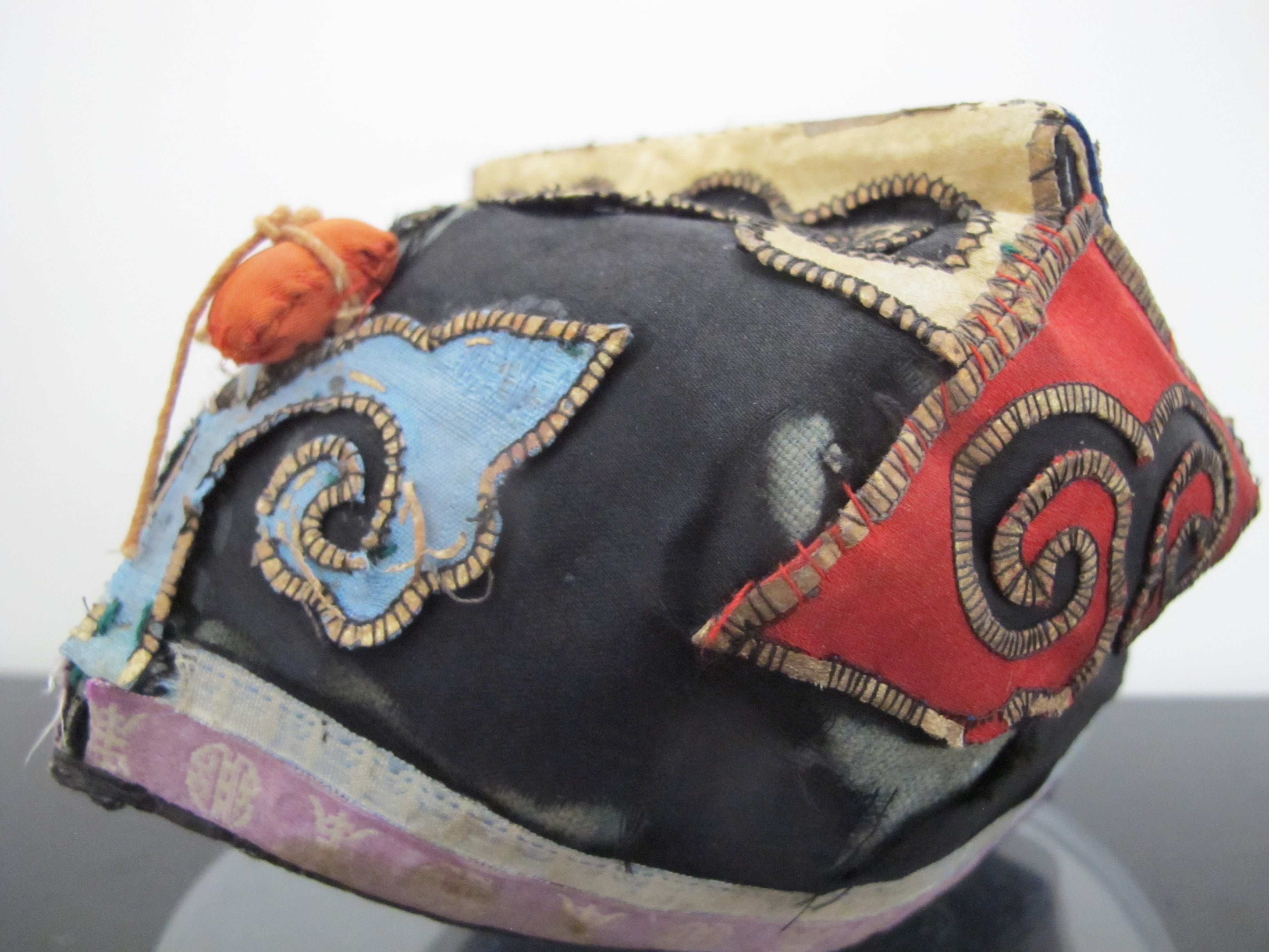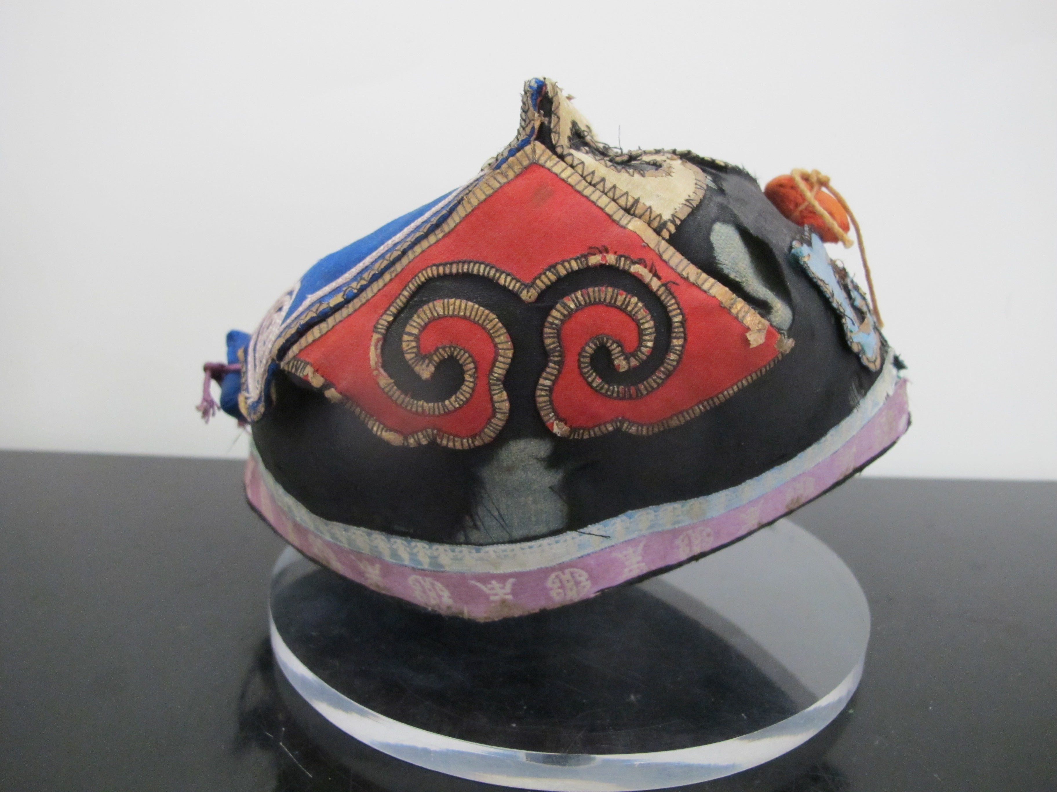 Darling antique Chinese children's hat with colorful silk embroidery and appliques. Good condition for old age, but shows some tears in fabric, all as photographed. Will include stand for display. Measures approximately 6 1/2" x 5" x 4".