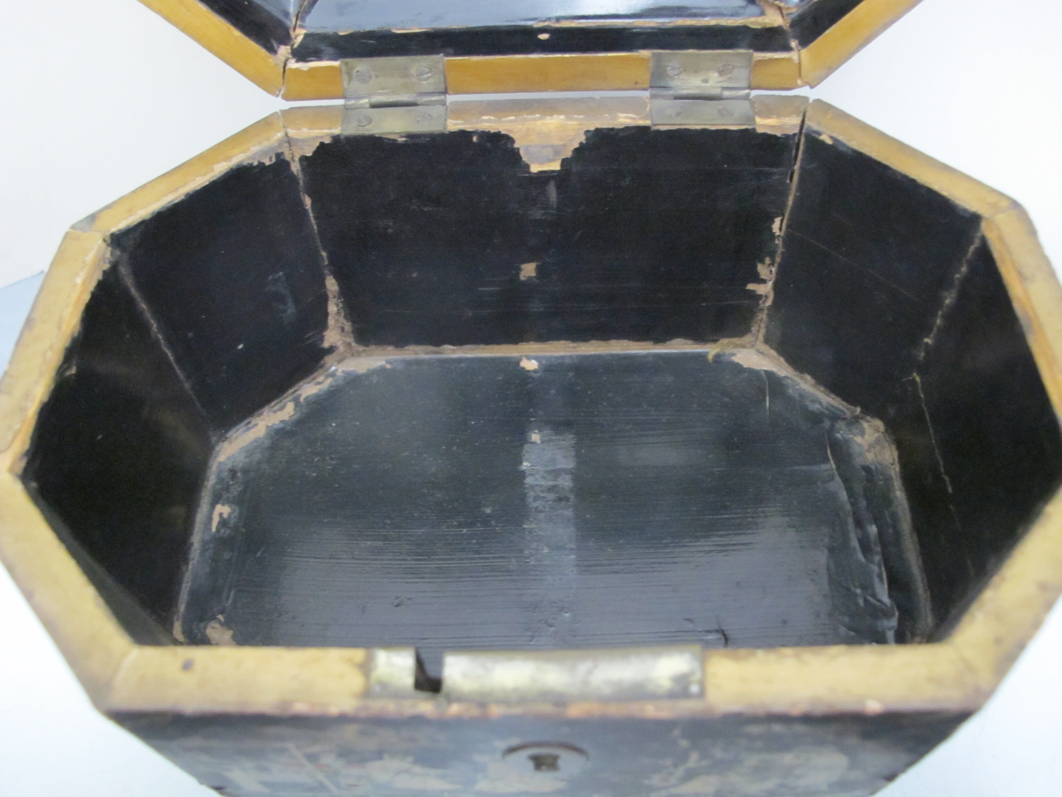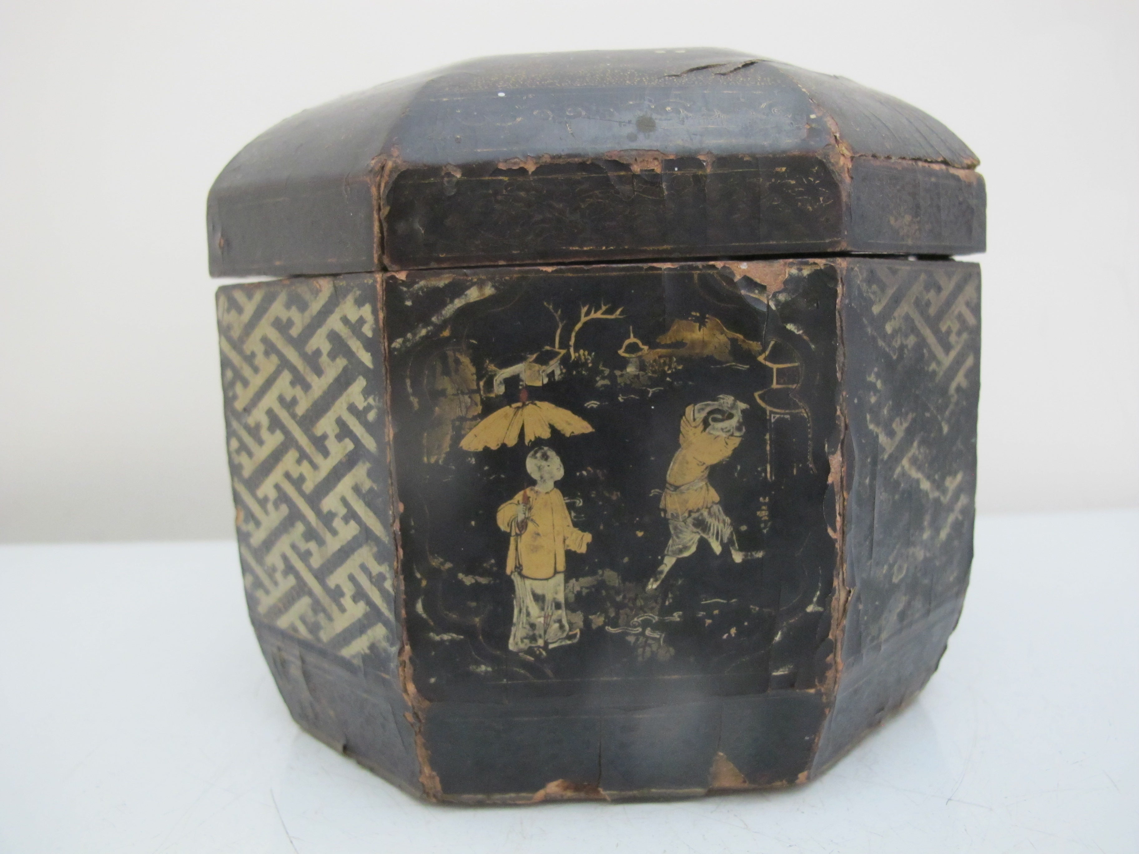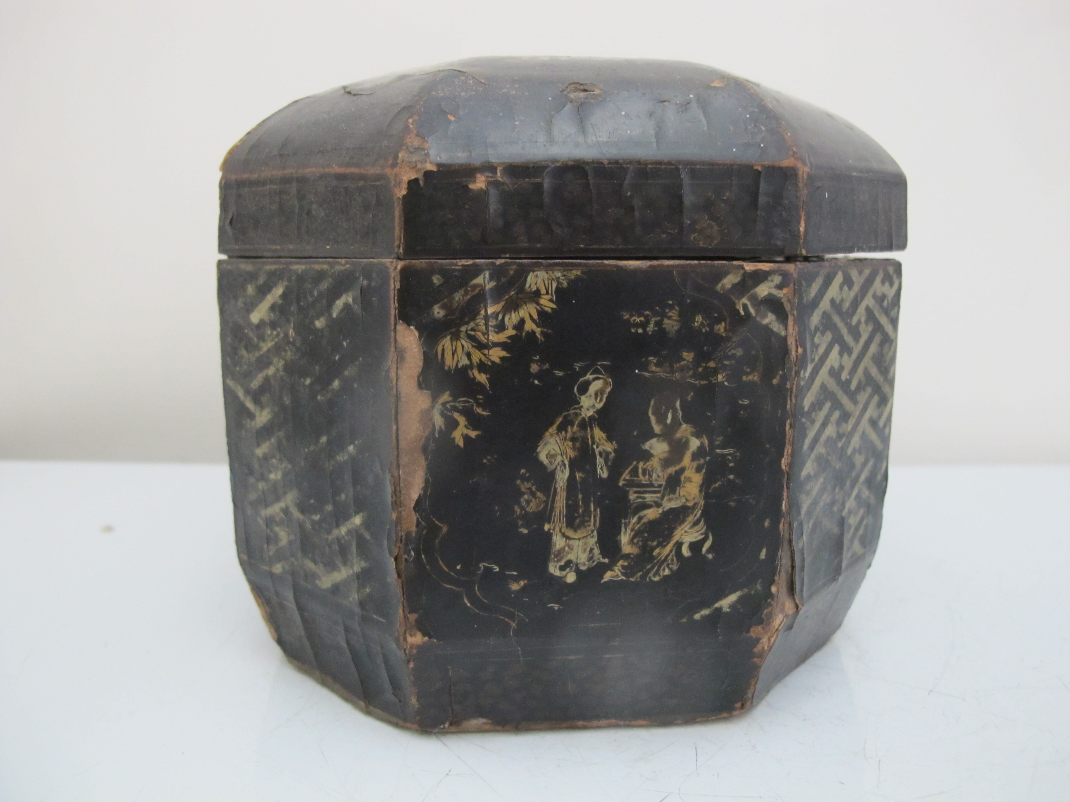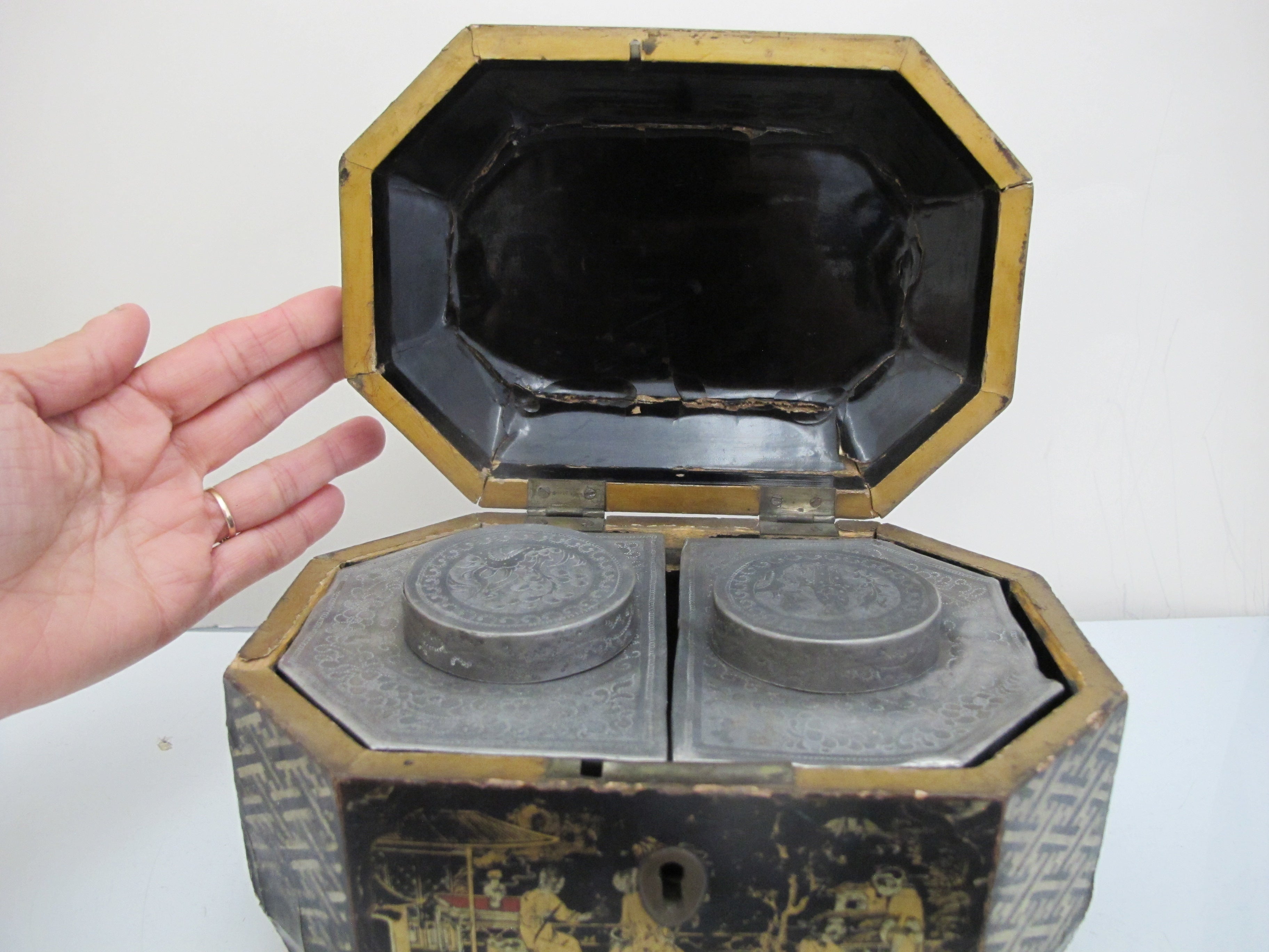 Antique CHINOISERIE Gilt Lacquer Figural Octagonal Wood Pewter TEA CADDY Box