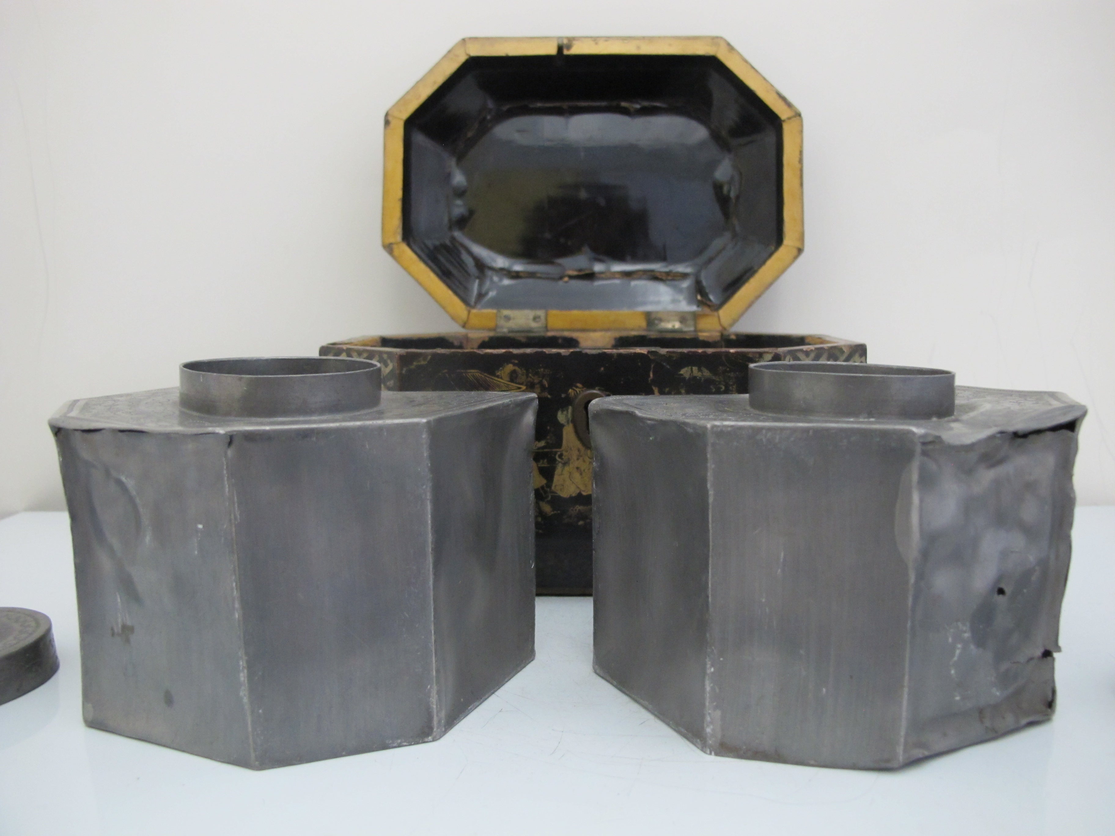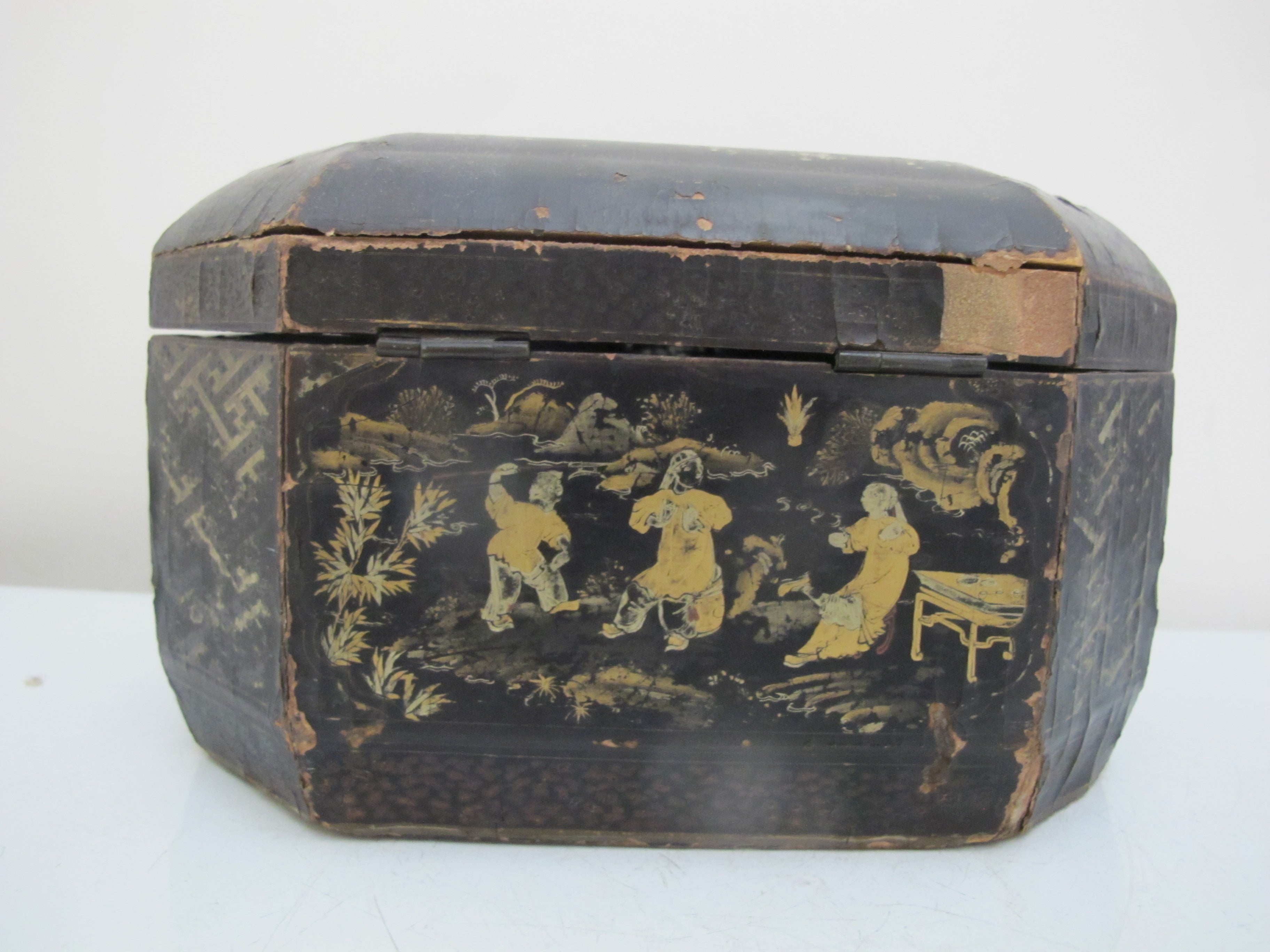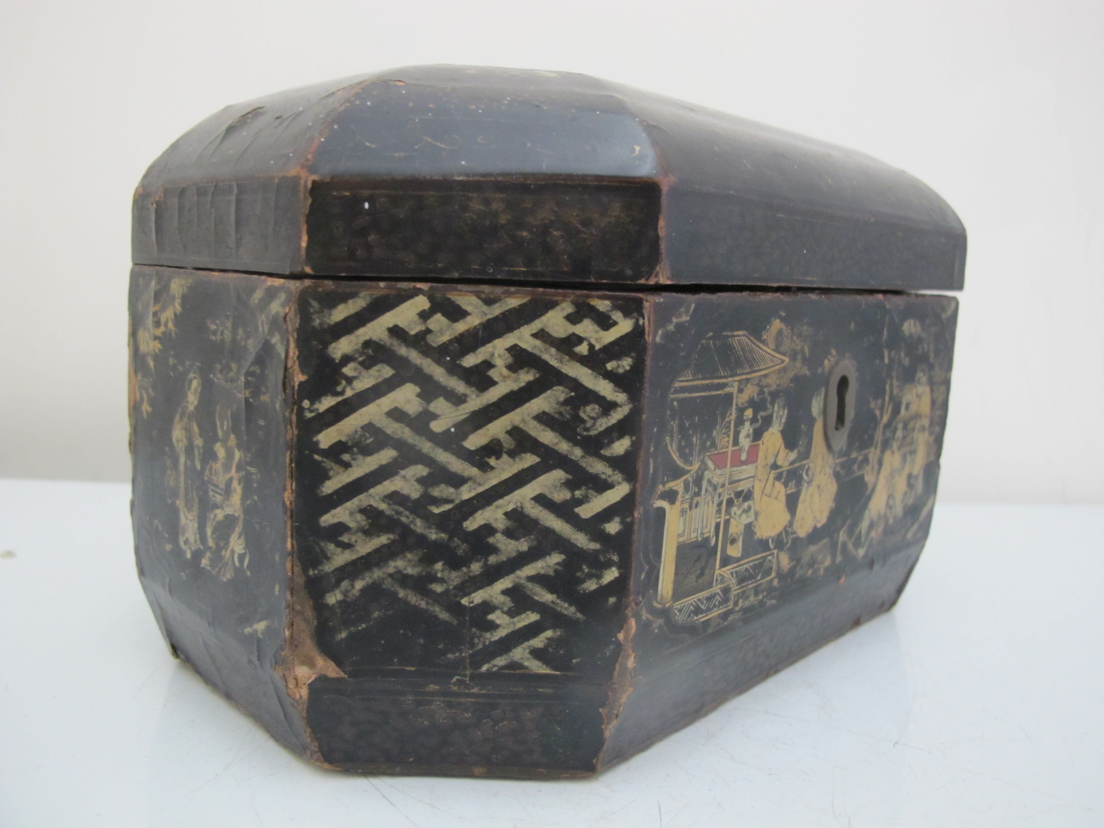 Antique CHINOISERIE Gilt Lacquer Figural Octagonal Wood Pewter TEA CADDY Box
