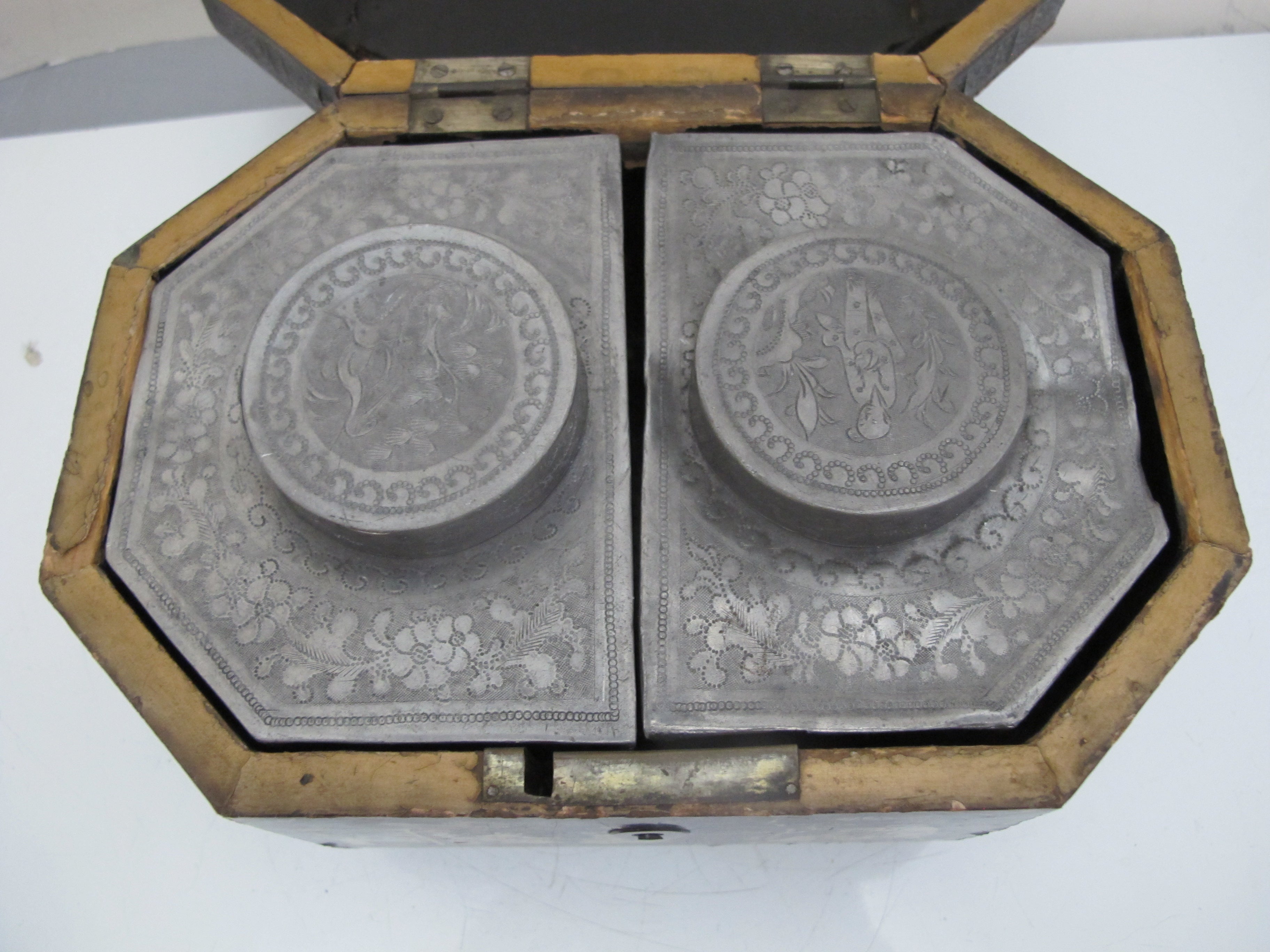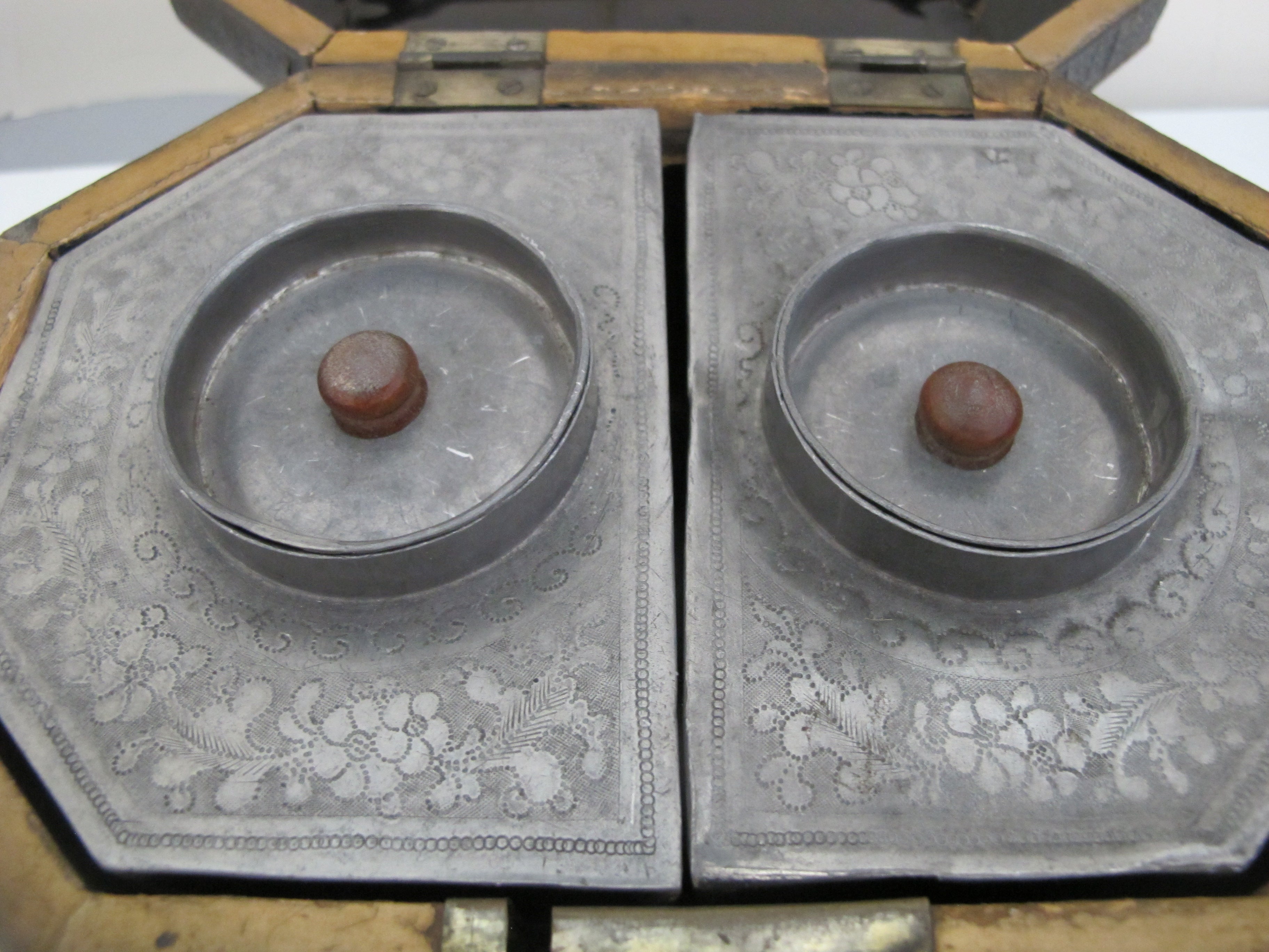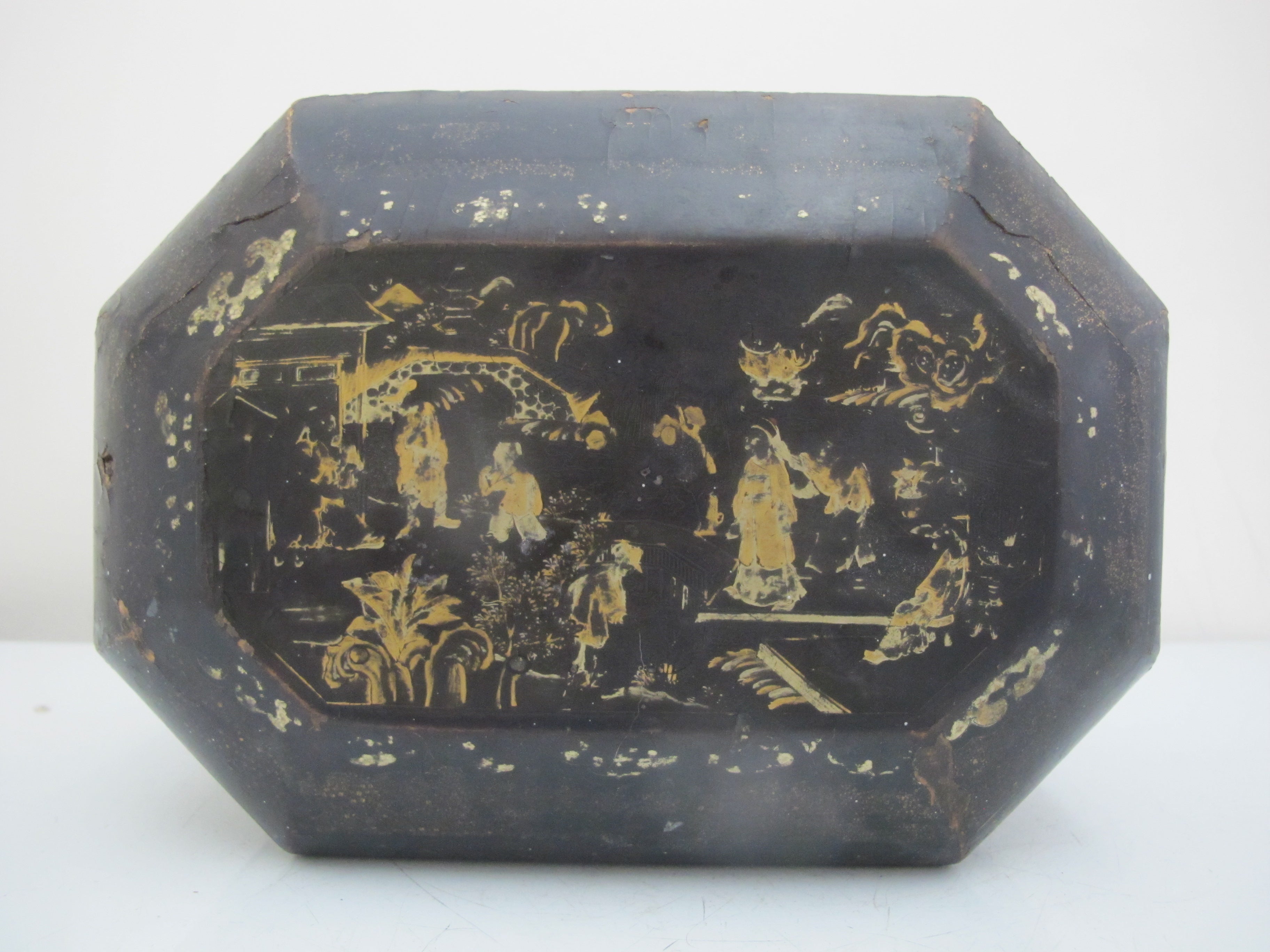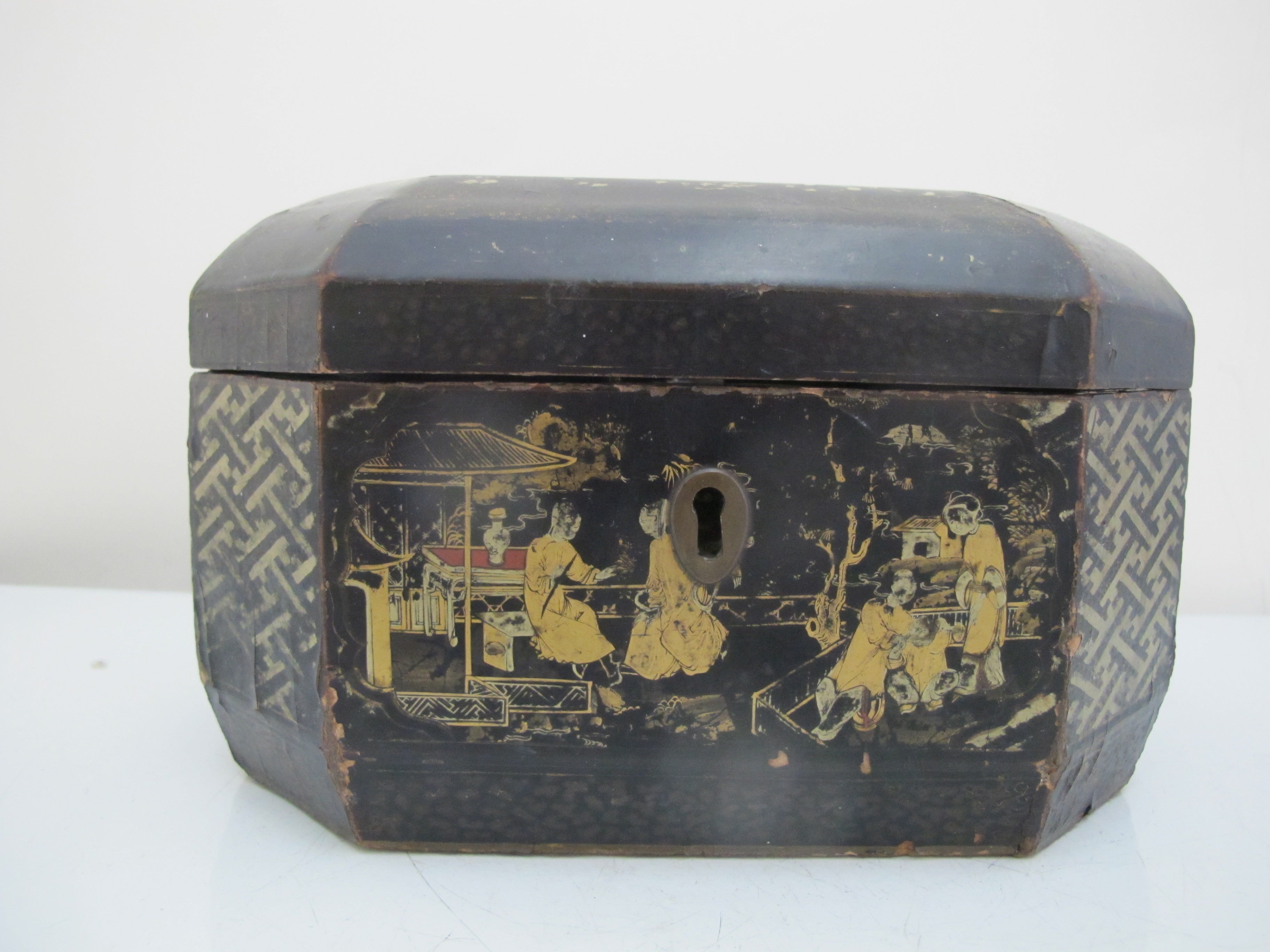 Antique CHINOISERIE Gilt Lacquer Figural Octagonal Wood Pewter TEA CADDY Box
