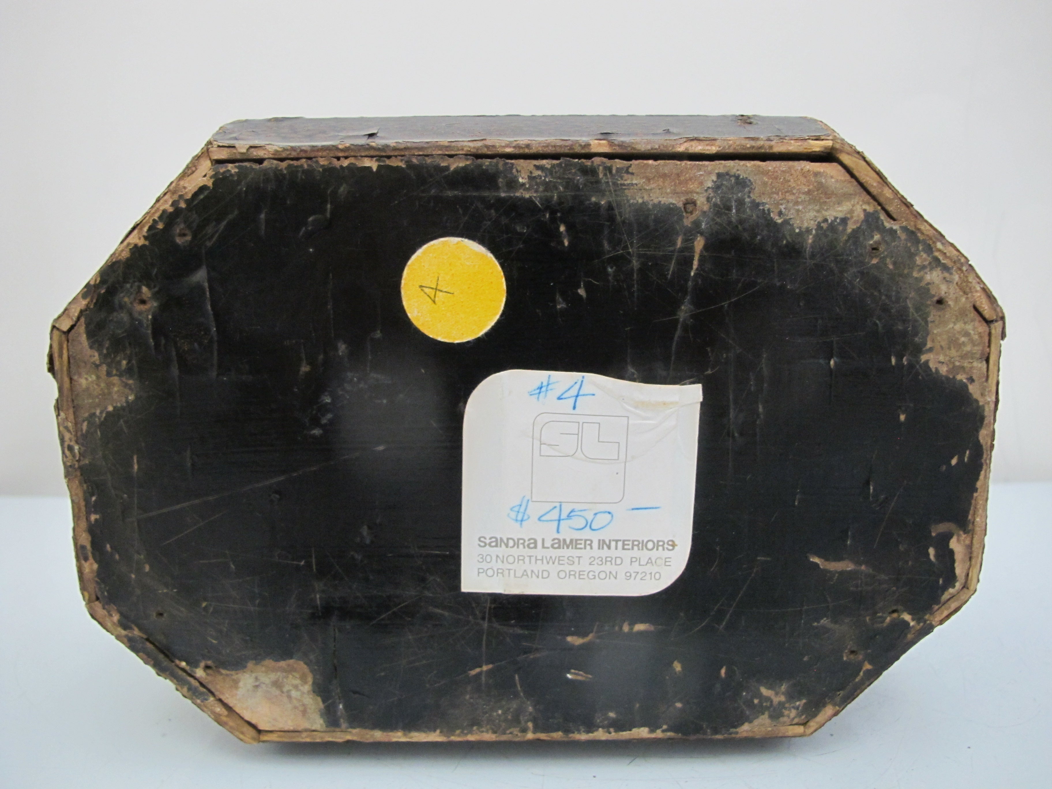 The design is obviously quite worn, but still apparent showing a figural and geometric design. Hinged lid opens to a a large compartment holding 2 pewter boxes with ornate figural and botanical engravings. Key is missing and paint is flaking or worn. Please ignore the circular spots you might see from sun reflections. Overall good condition for age, but showing obvious wear, mostly on the exterior.