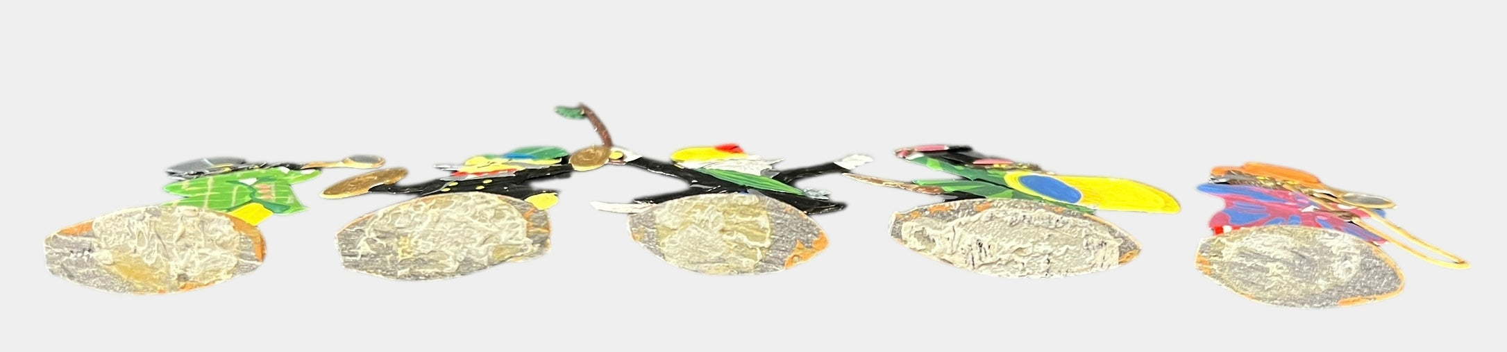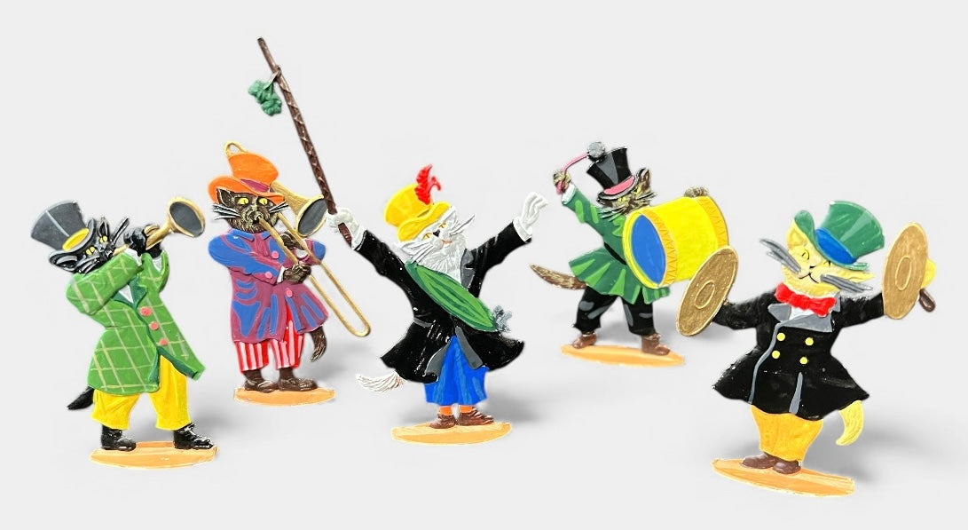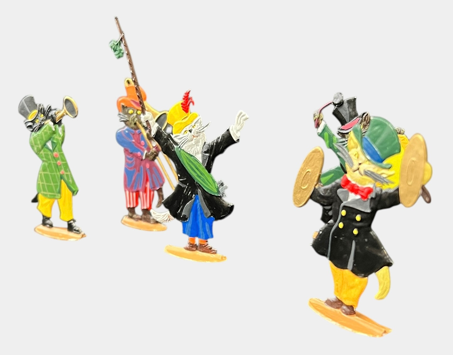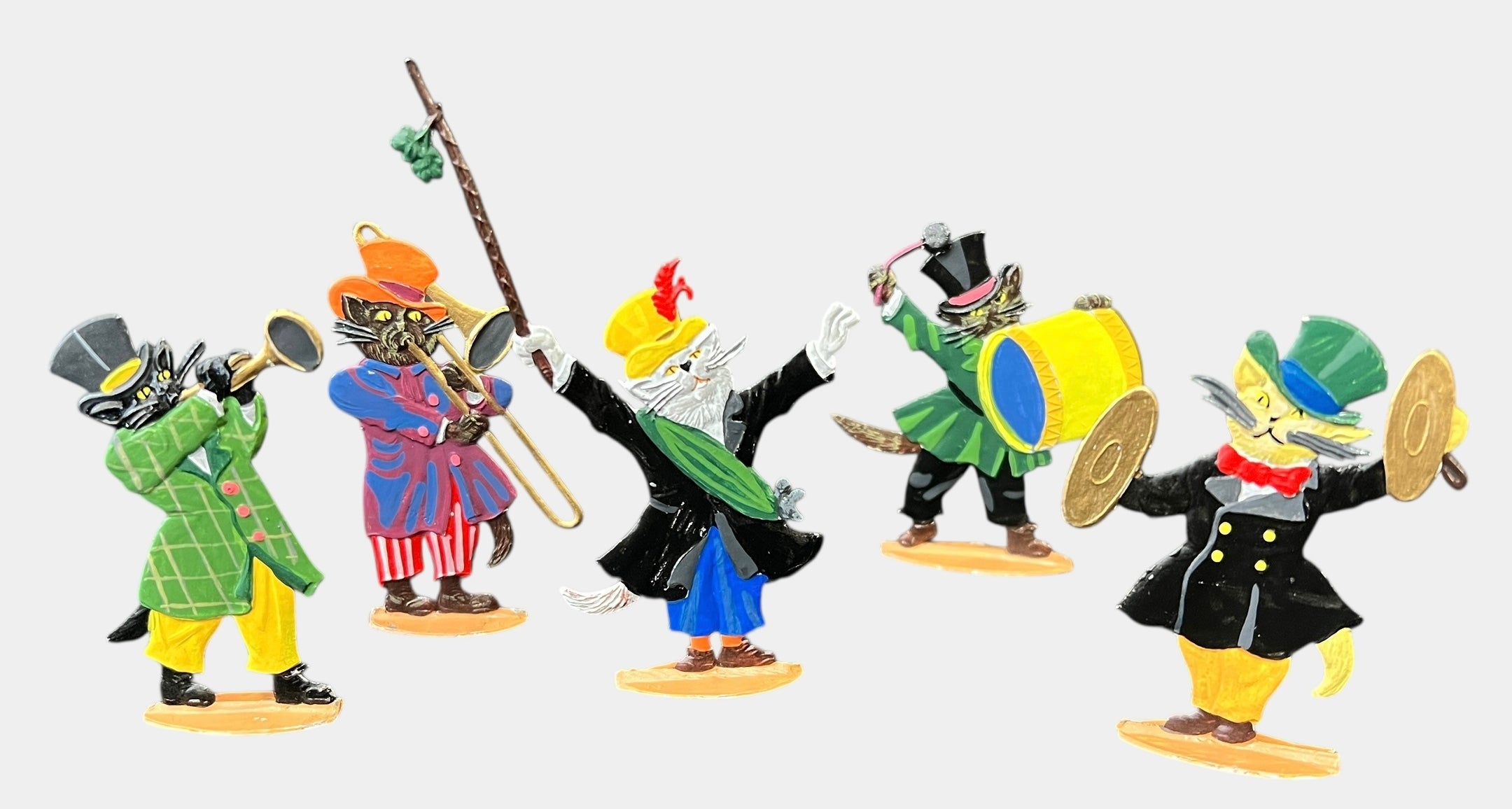 Five Small Antique Spelter or Lead Ca. 1950 German Hand Painted Band Cat Figures