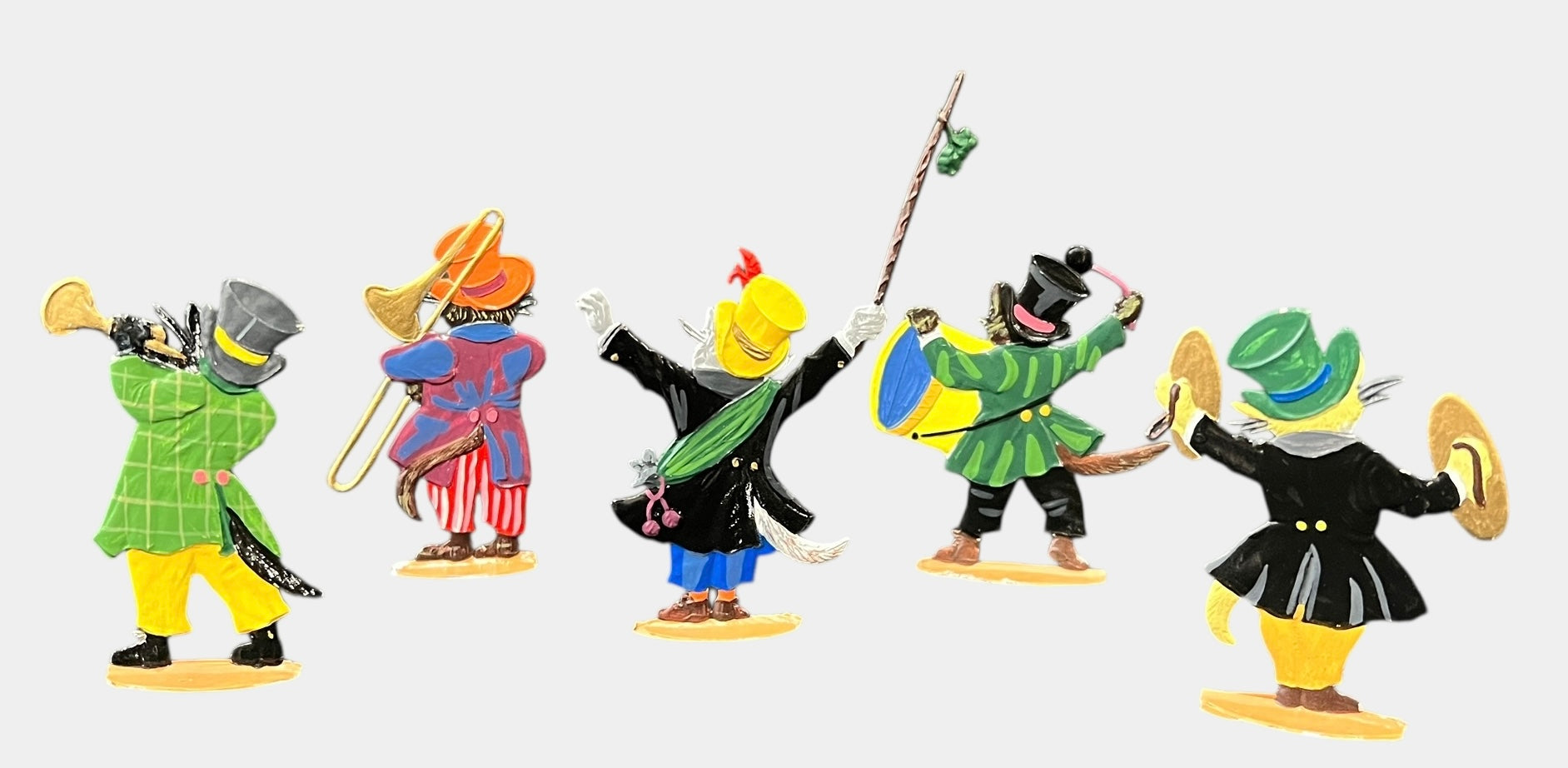 Five small hand painted spelter or lead cat figures in loud costumes and playing different instruments. The are unmarked but bought in Germany in the 1950's. 3" tall, charming and in excellent condition.
