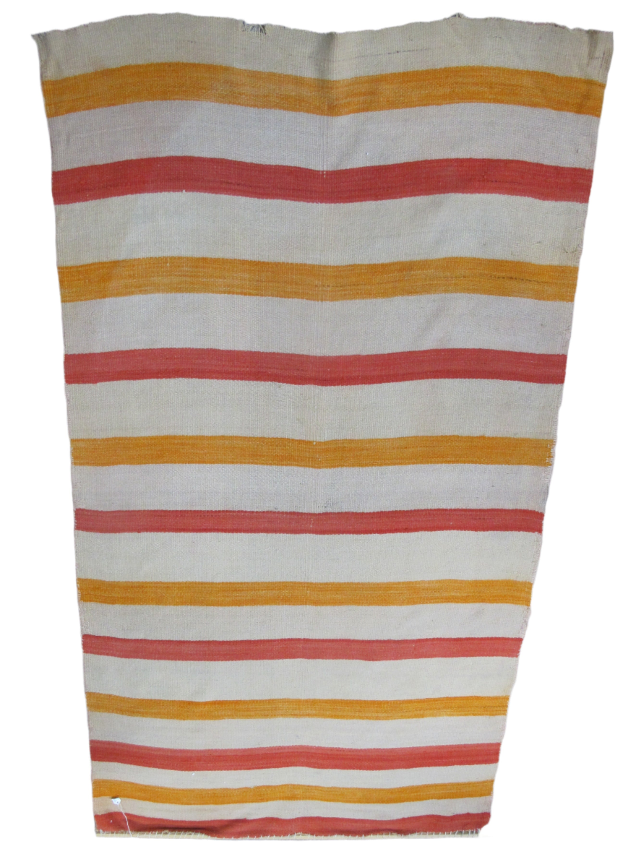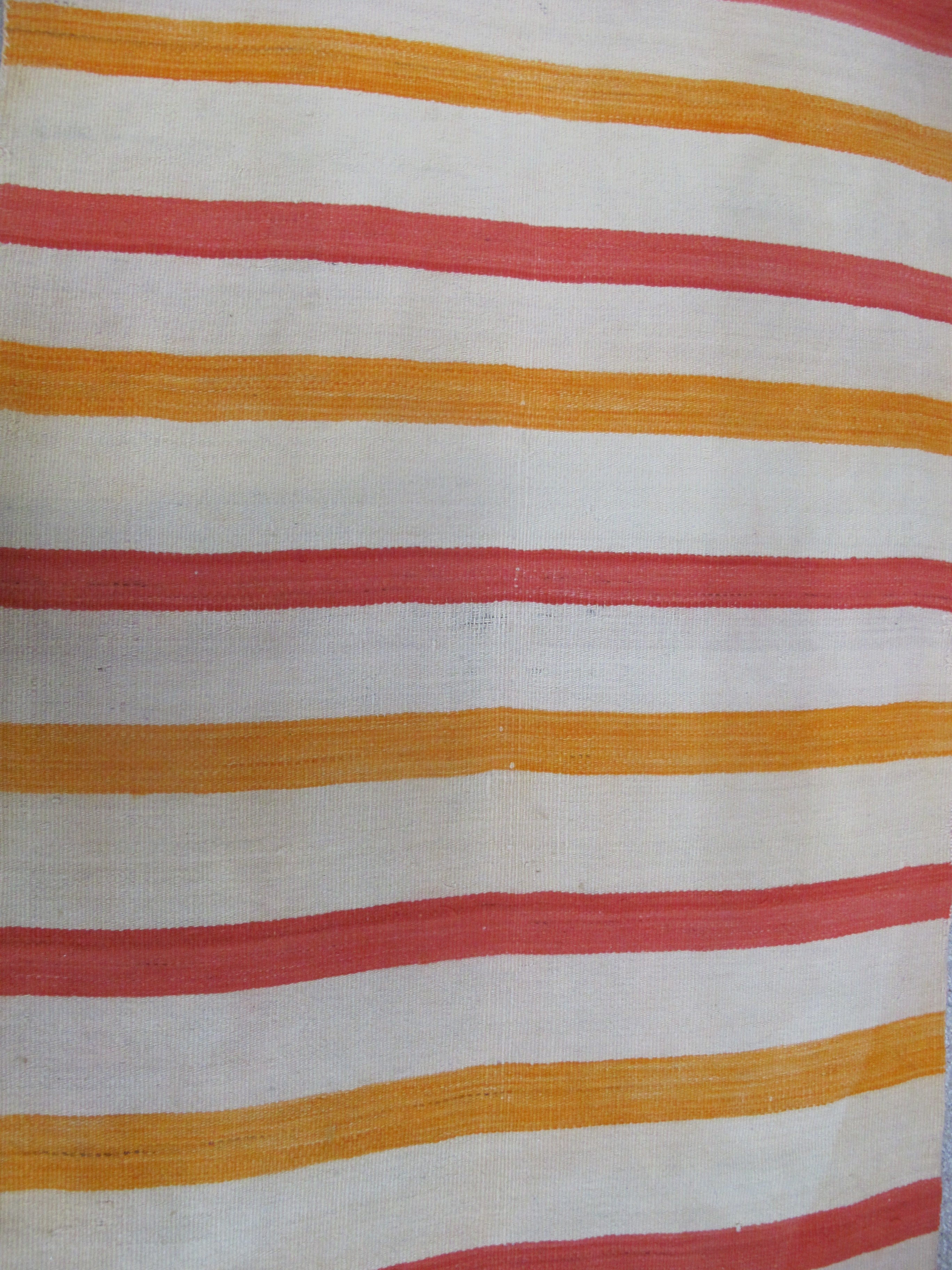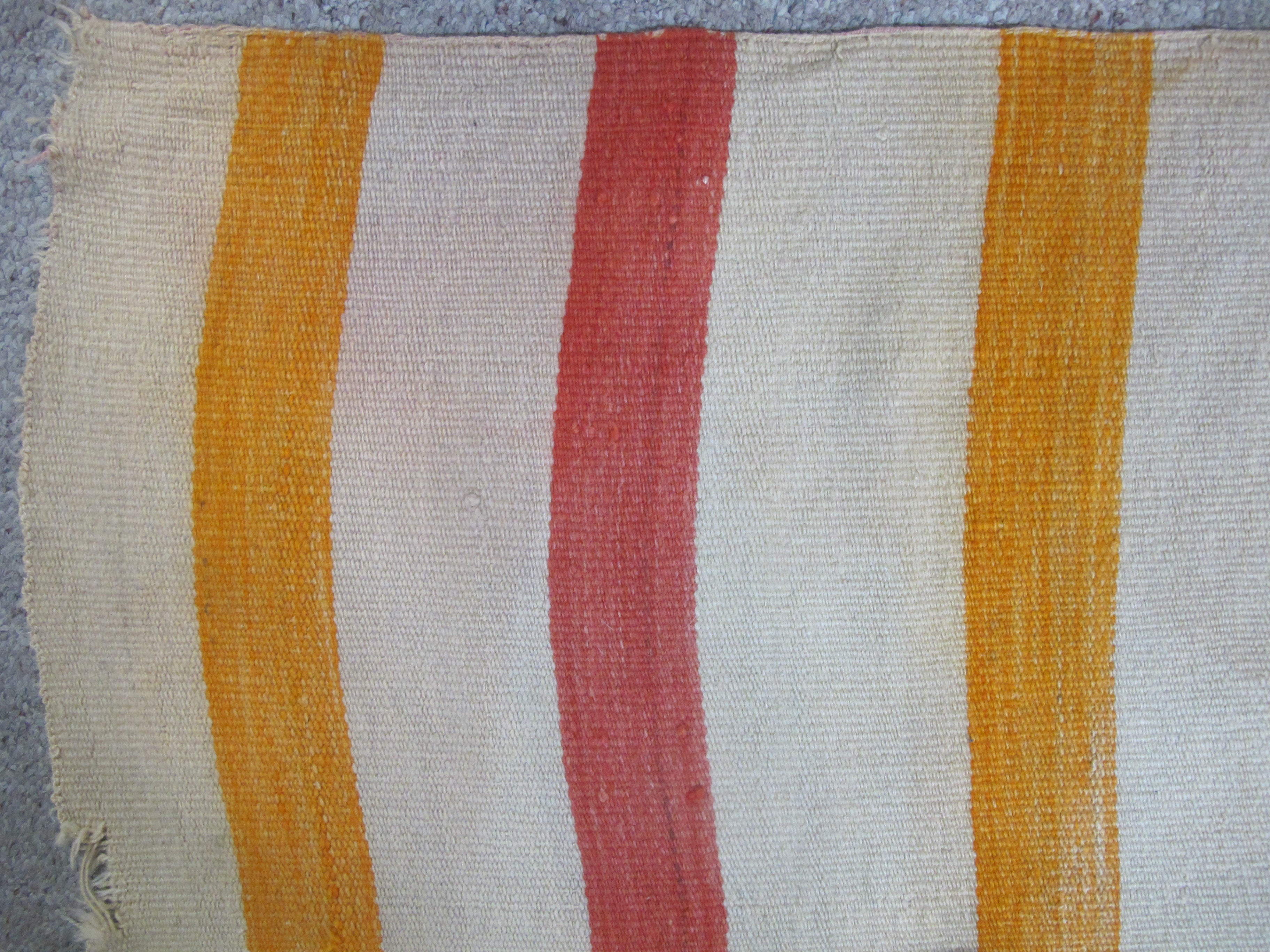 Wonderful antique Navajo Native child's blanket. Soft woven wool with colorful stripes in orange, yellow, and cream. Good condition for old age. Fraying slightly at base. Discoloration or light fading slightly obvious in elongated creases, all as photographed. Has a pole insert at top that could easily be removed. Measures 79" x 43"