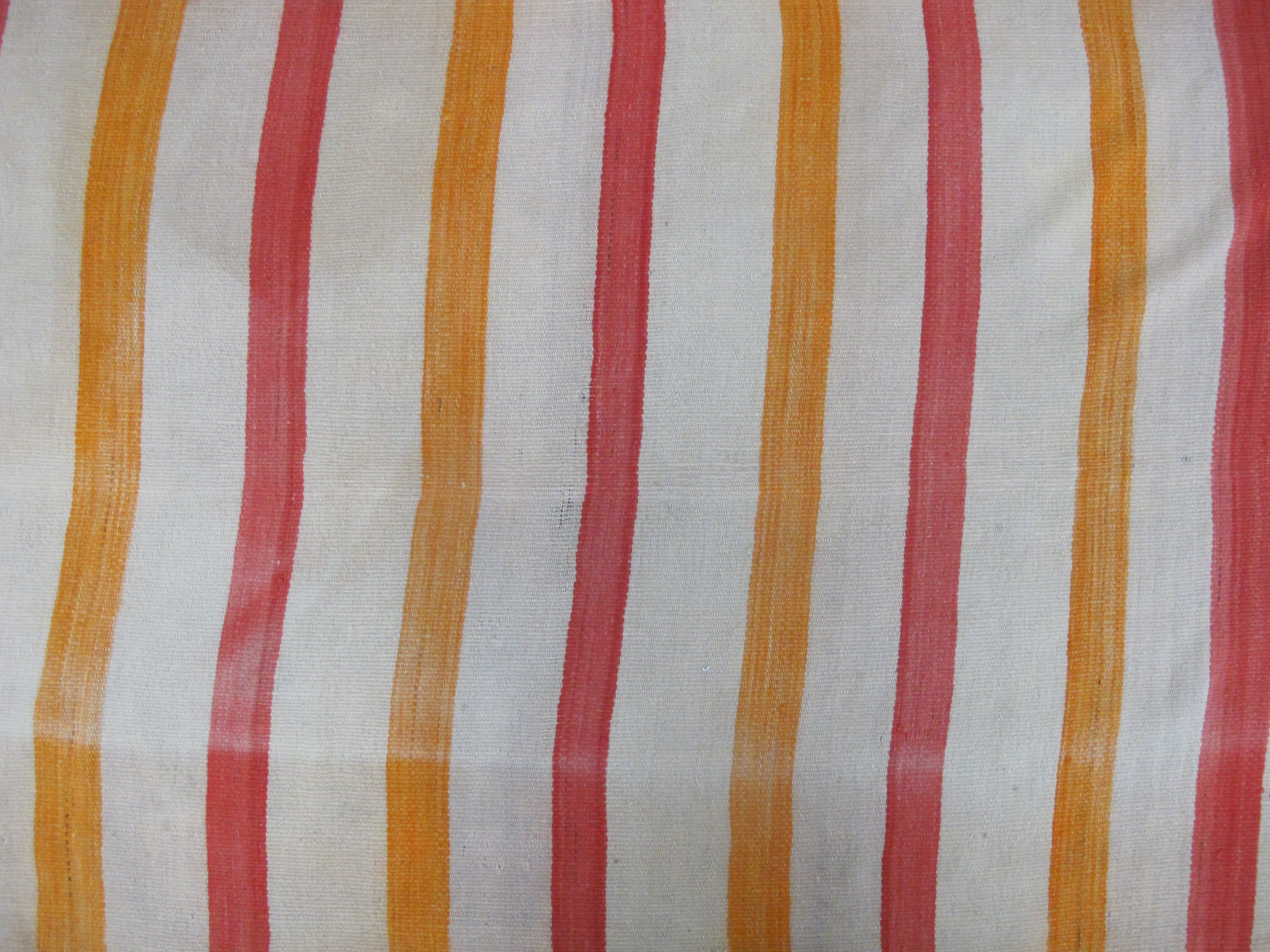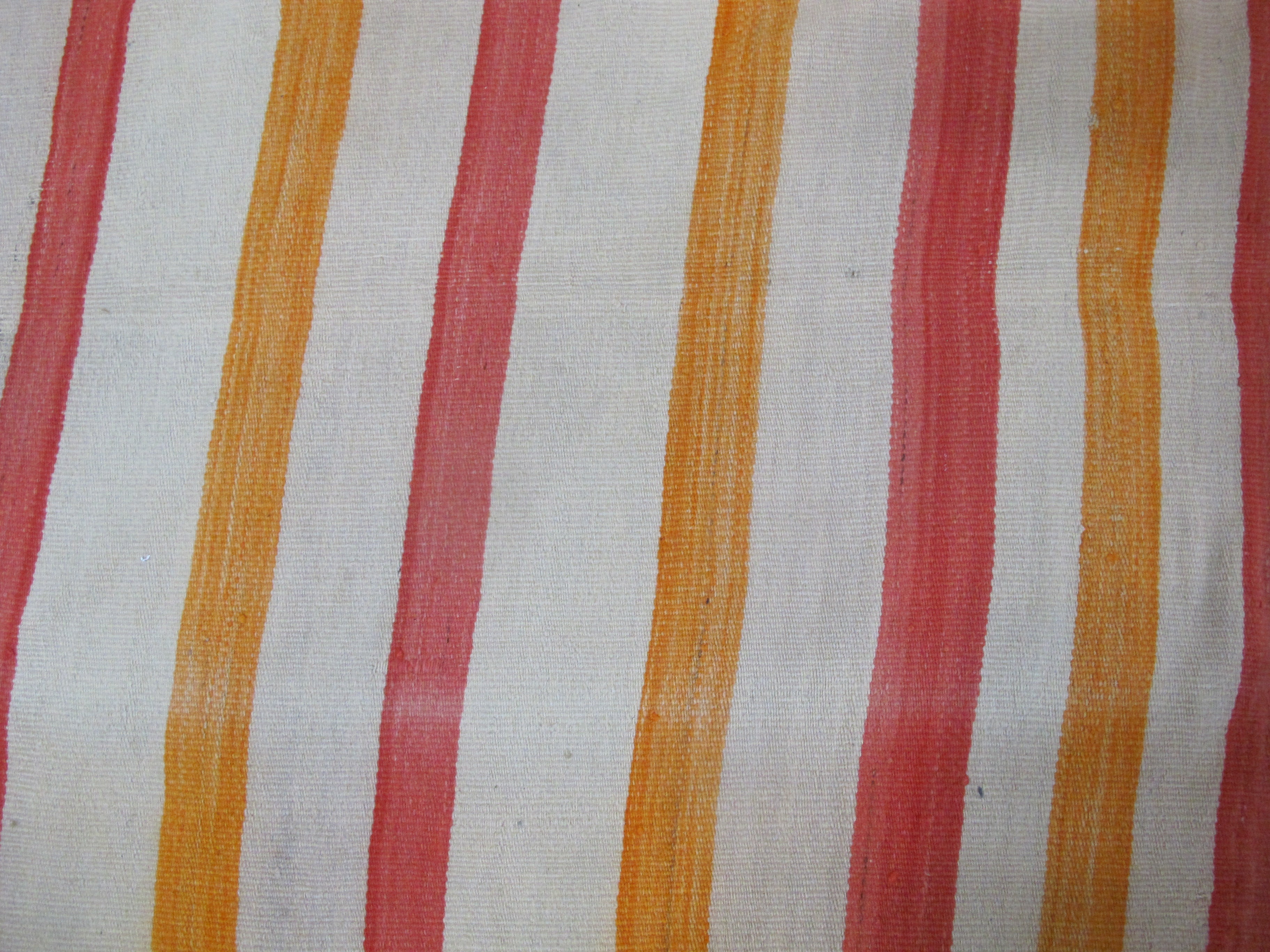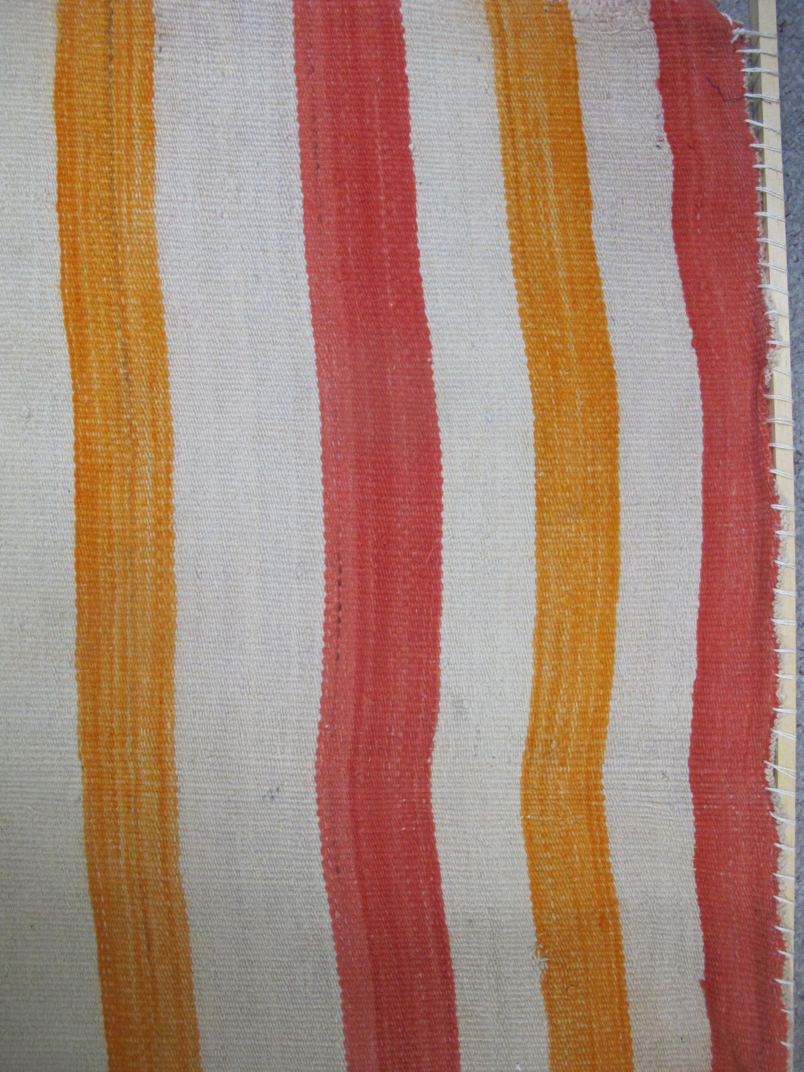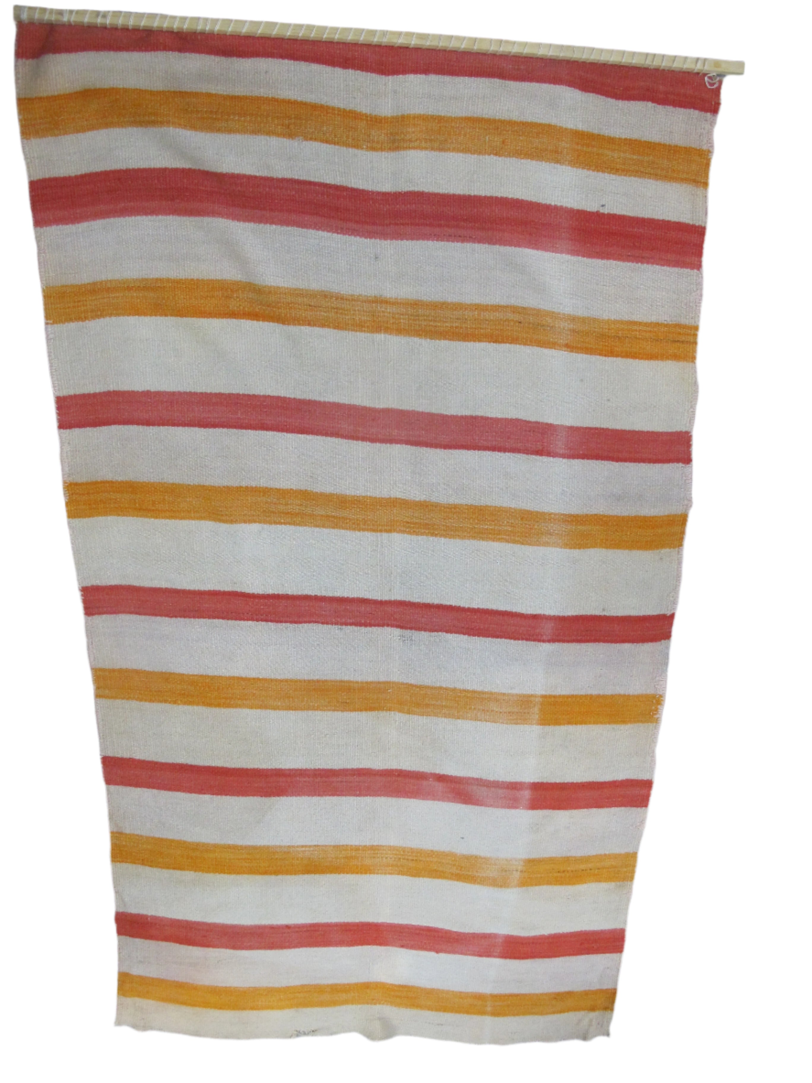 Wonderful antique Navajo Native child's blanket. Soft woven wool with colorful stripes in orange, yellow, and cream. Good condition for old age. Fraying slightly at base. Discoloration or light fading slightly obvious in elongated creases, all as photographed. Has a pole insert at top that could easily be removed. Measures 79" x 43"