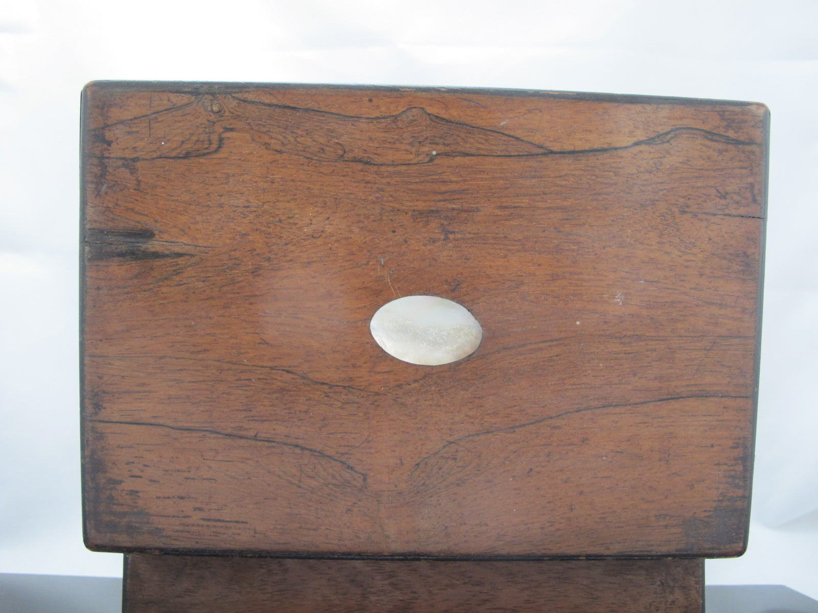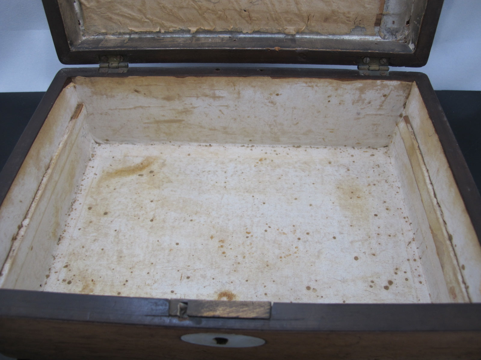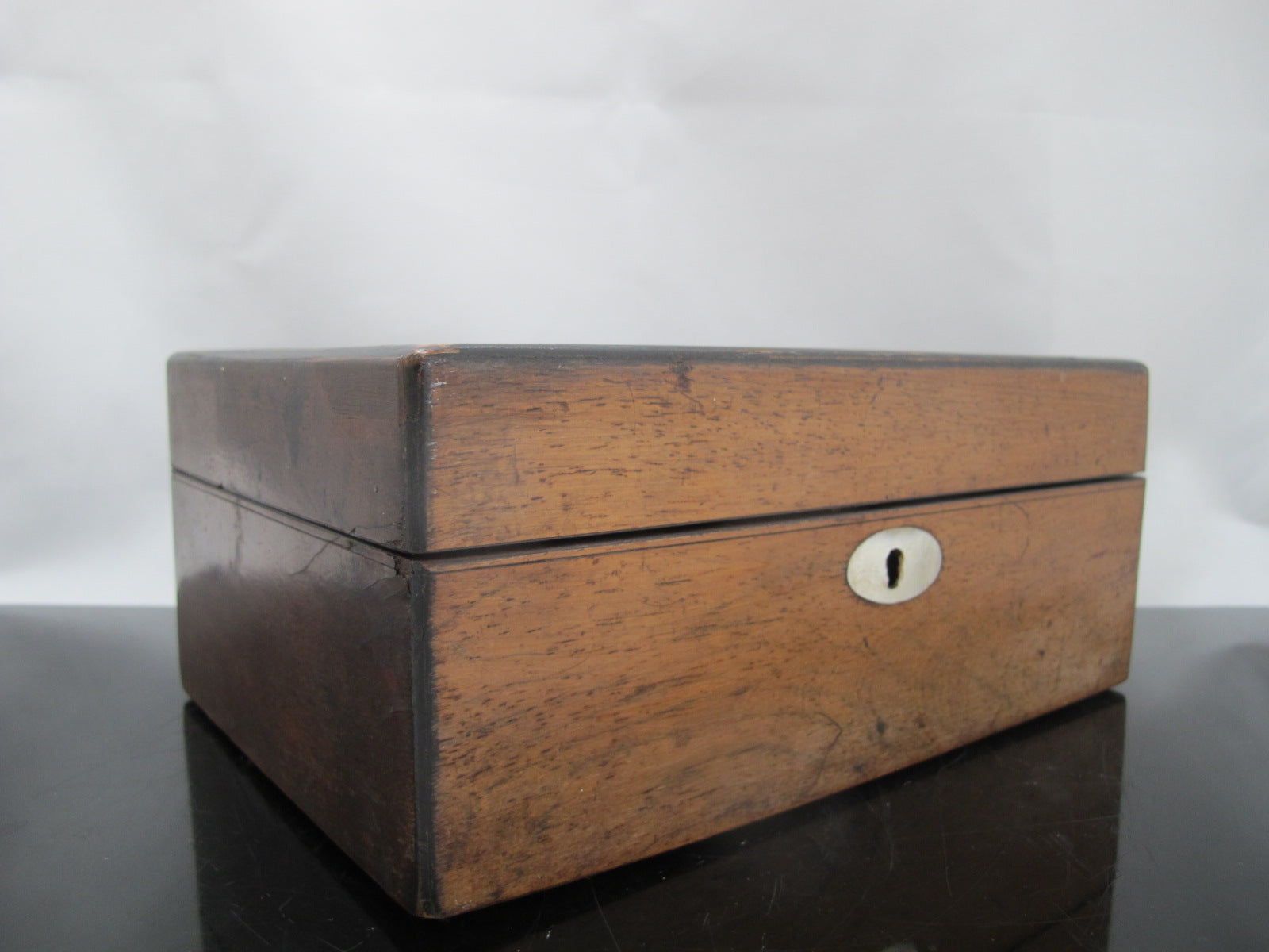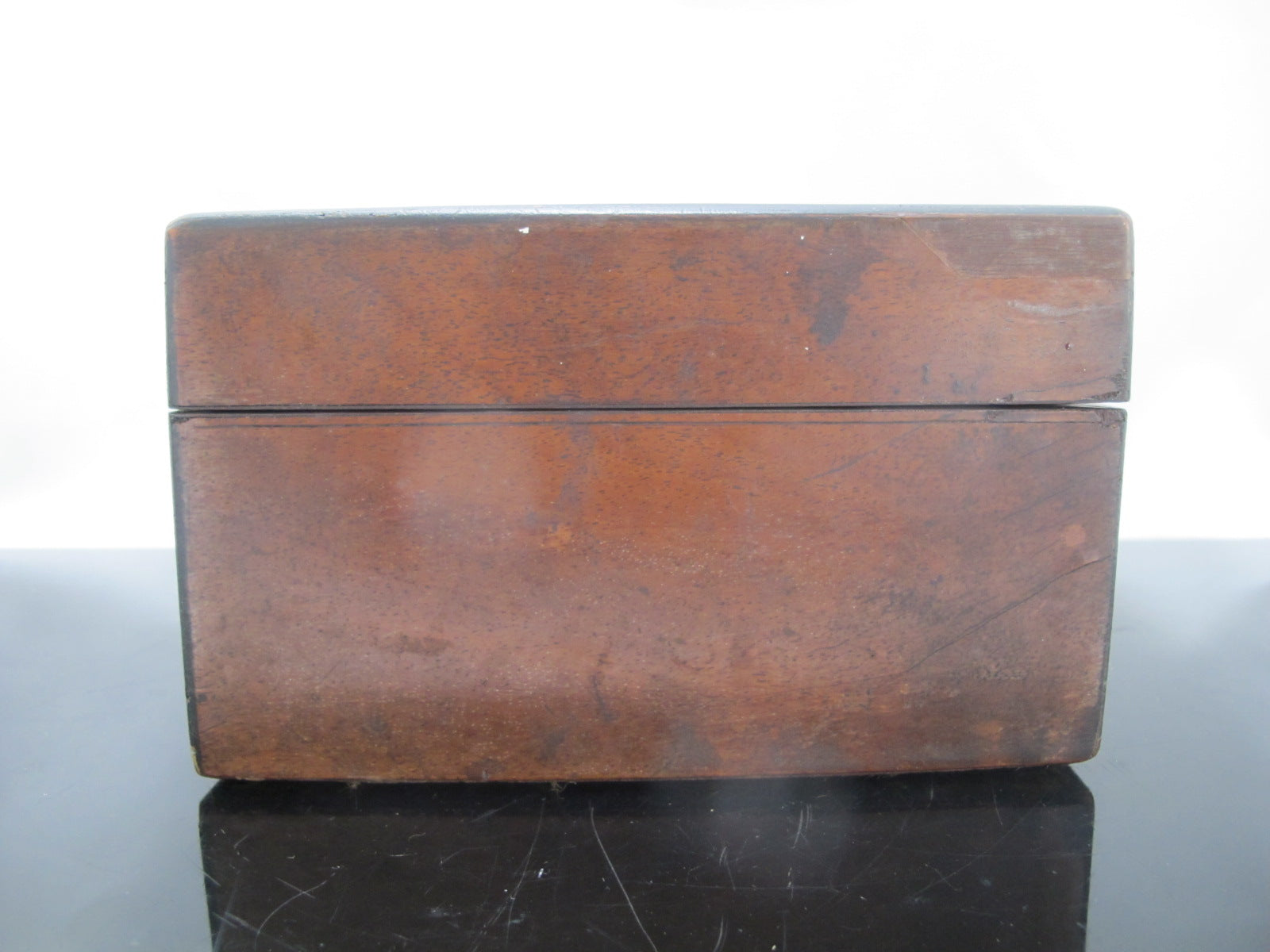 Antique, Victorian era, wood tea caddy or trinket box. Rectangular box with inlaid mother of pearl at top of lid and at key hole. Hinged lid opens to spacious unlined compartment. Excellent condition for old age, shows some obvious wear, as shown, but no major cracks or damage. There is a keyhole, but no key. Please note the spots you may see in photos are reflections from the strangely sunny day we are having in Portland, Oregon.