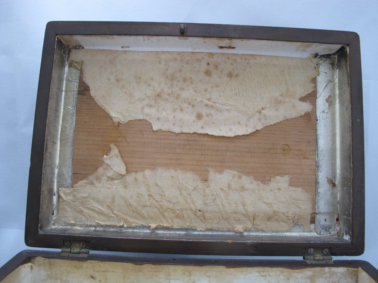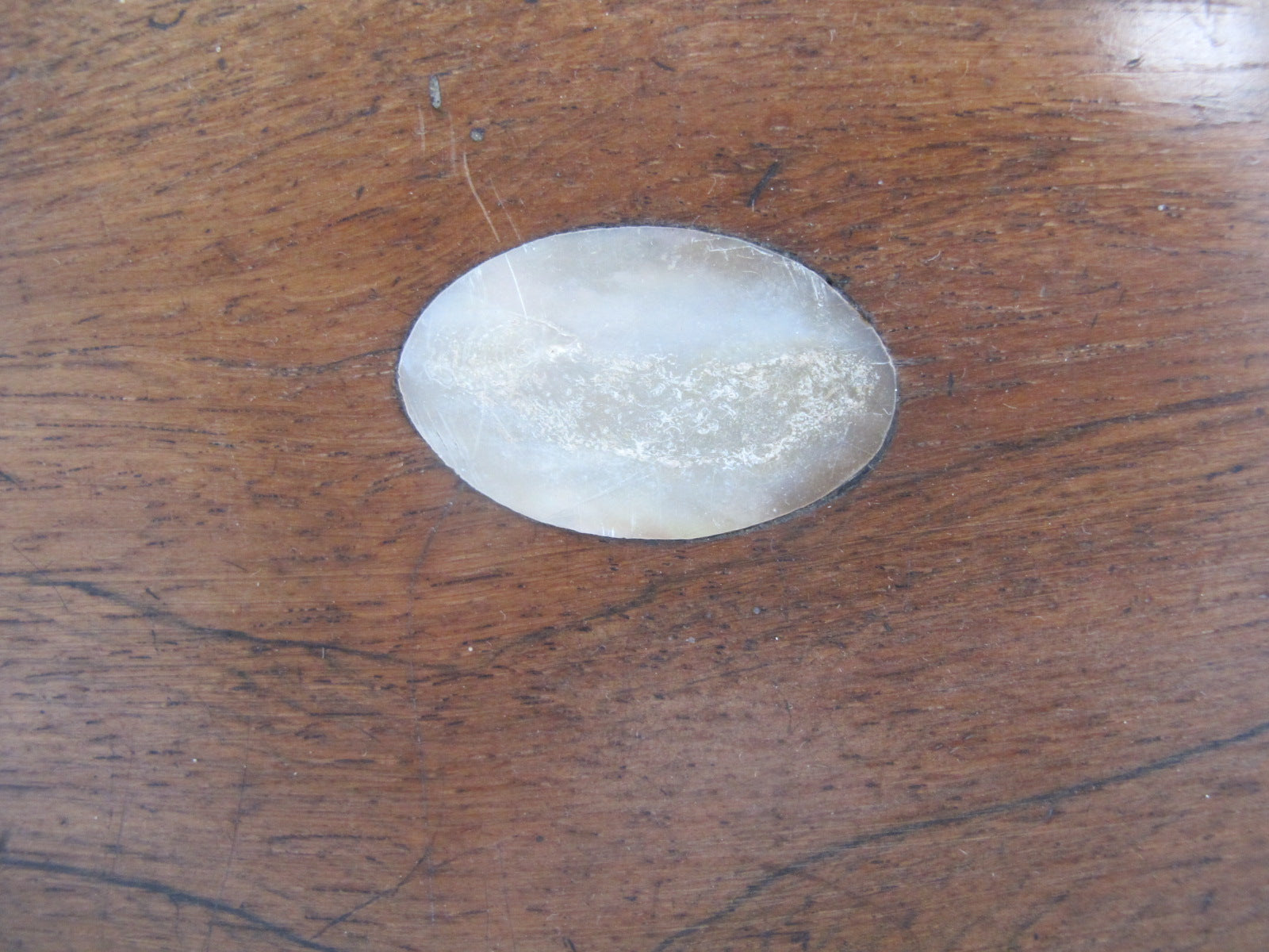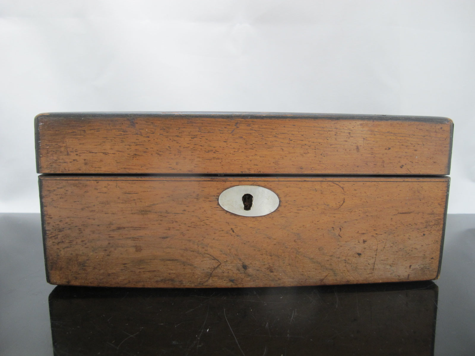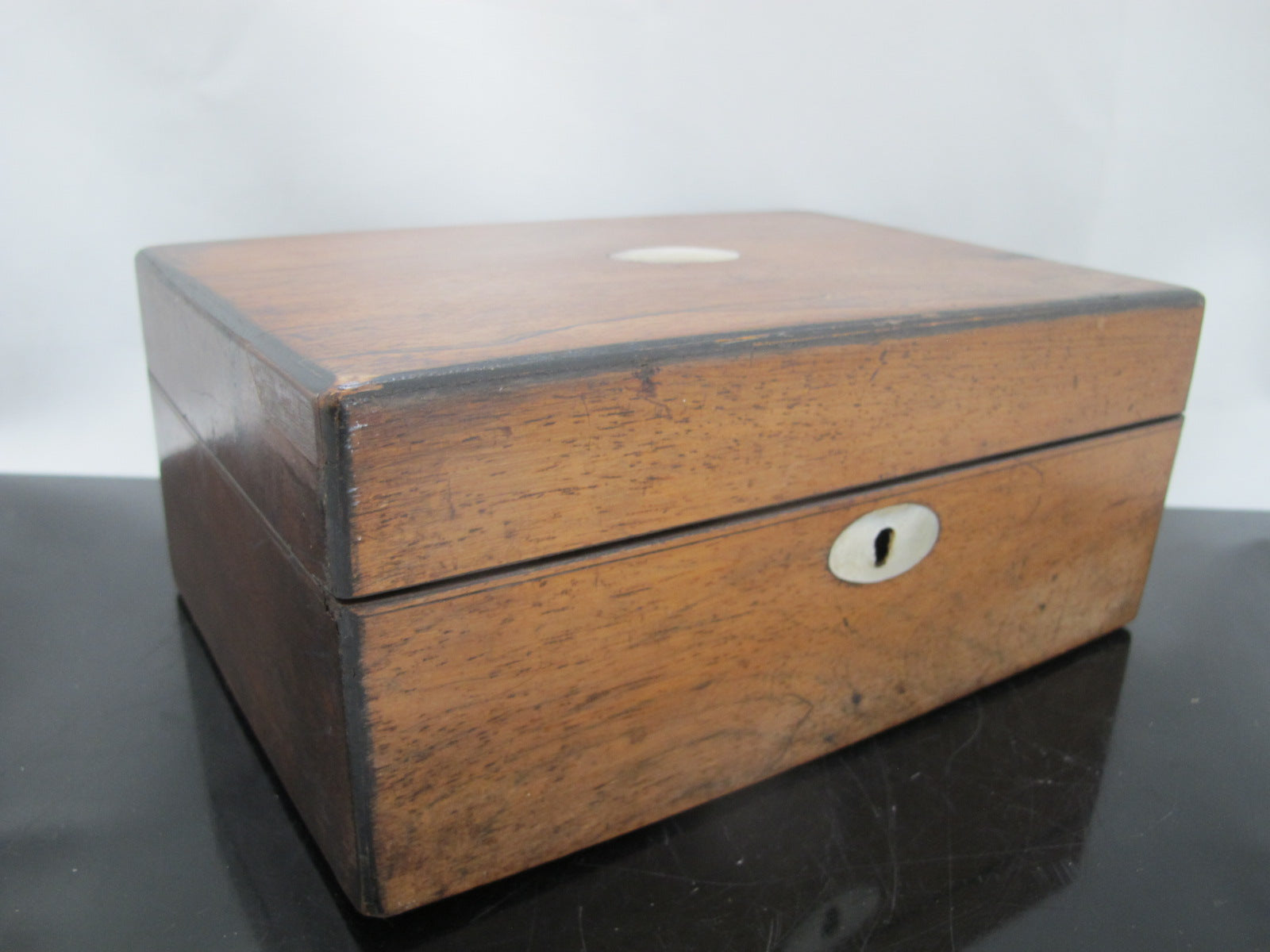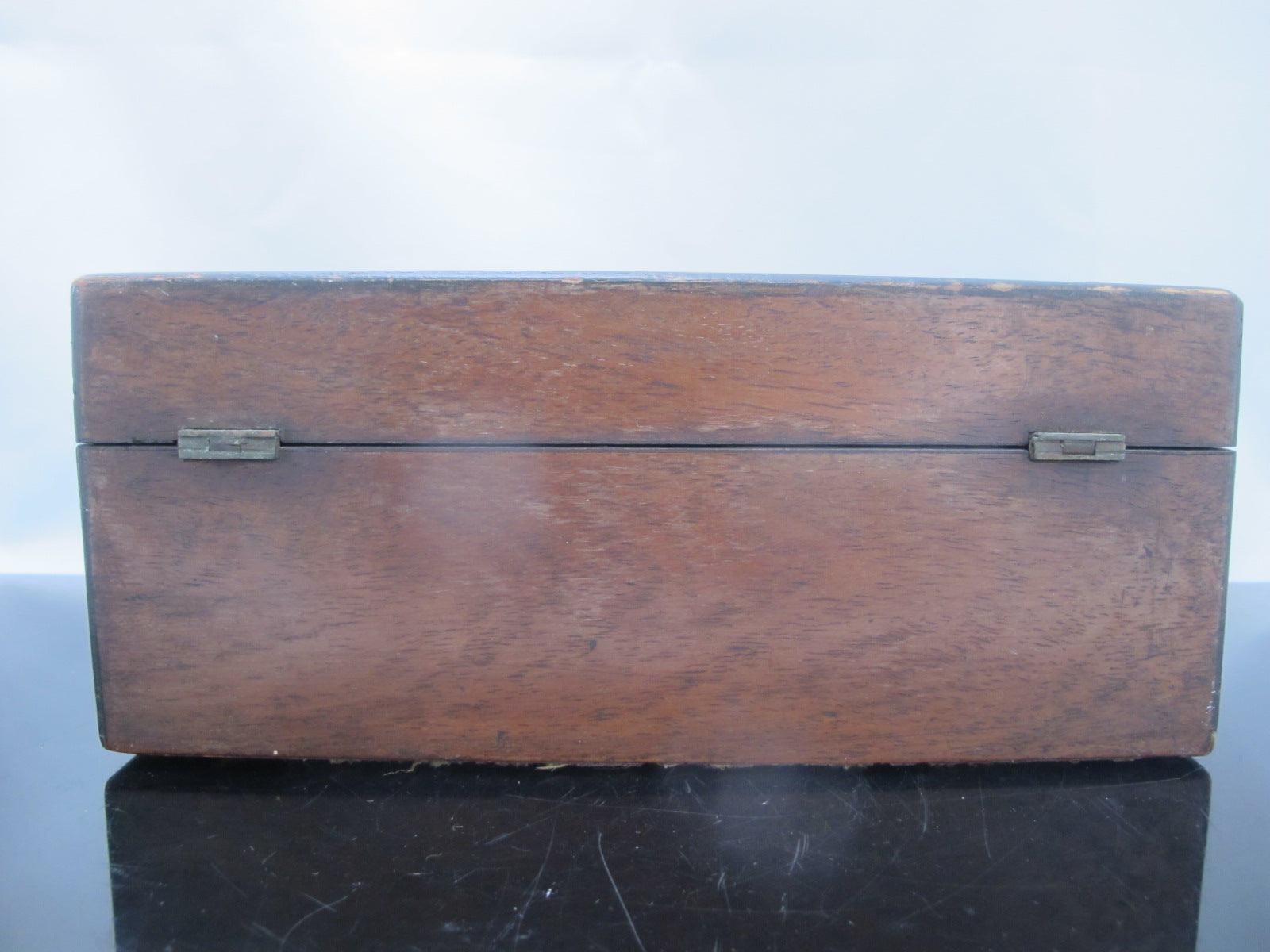 Antique, Victorian era, wood tea caddy or trinket box. Rectangular box with inlaid mother of pearl at top of lid and at key hole. Hinged lid opens to spacious unlined compartment. Excellent condition for old age, shows some obvious wear, as shown, but no major cracks or damage. There is a keyhole, but no key. Please note the spots you may see in photos are reflections from the strangely sunny day we are having in Portland, Oregon.