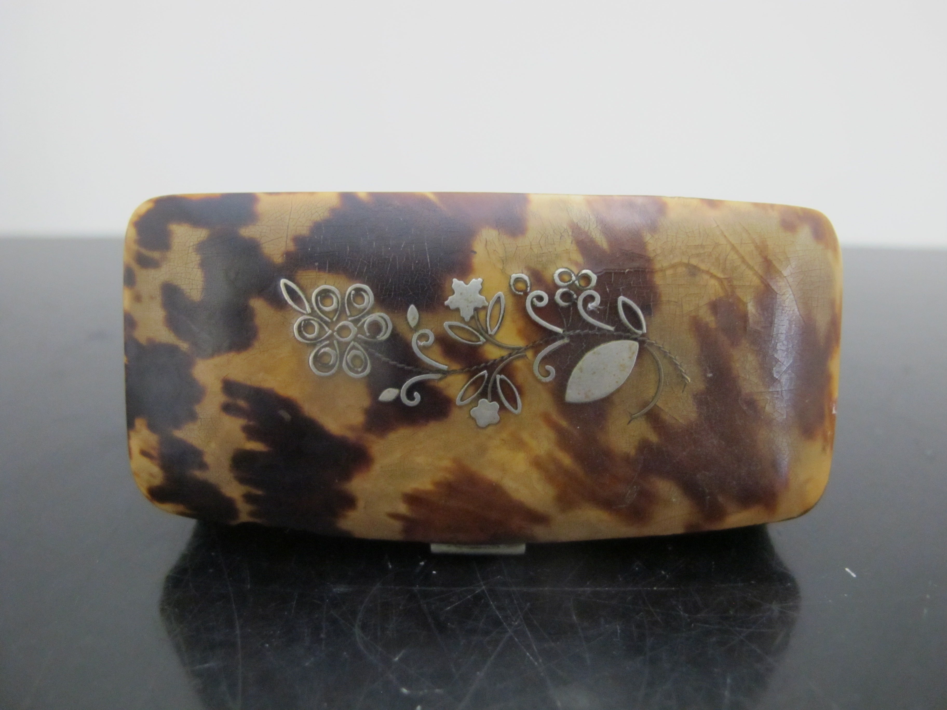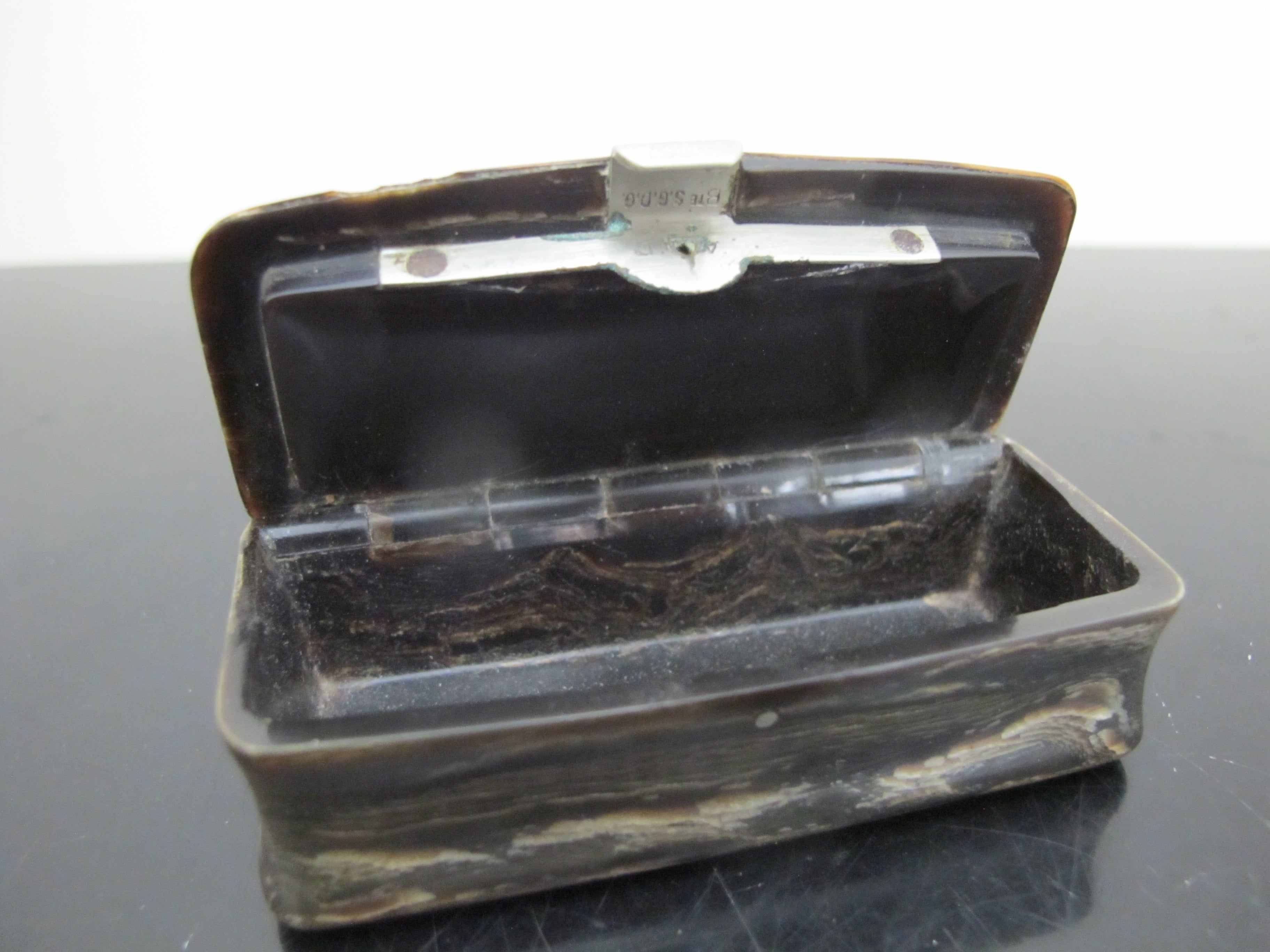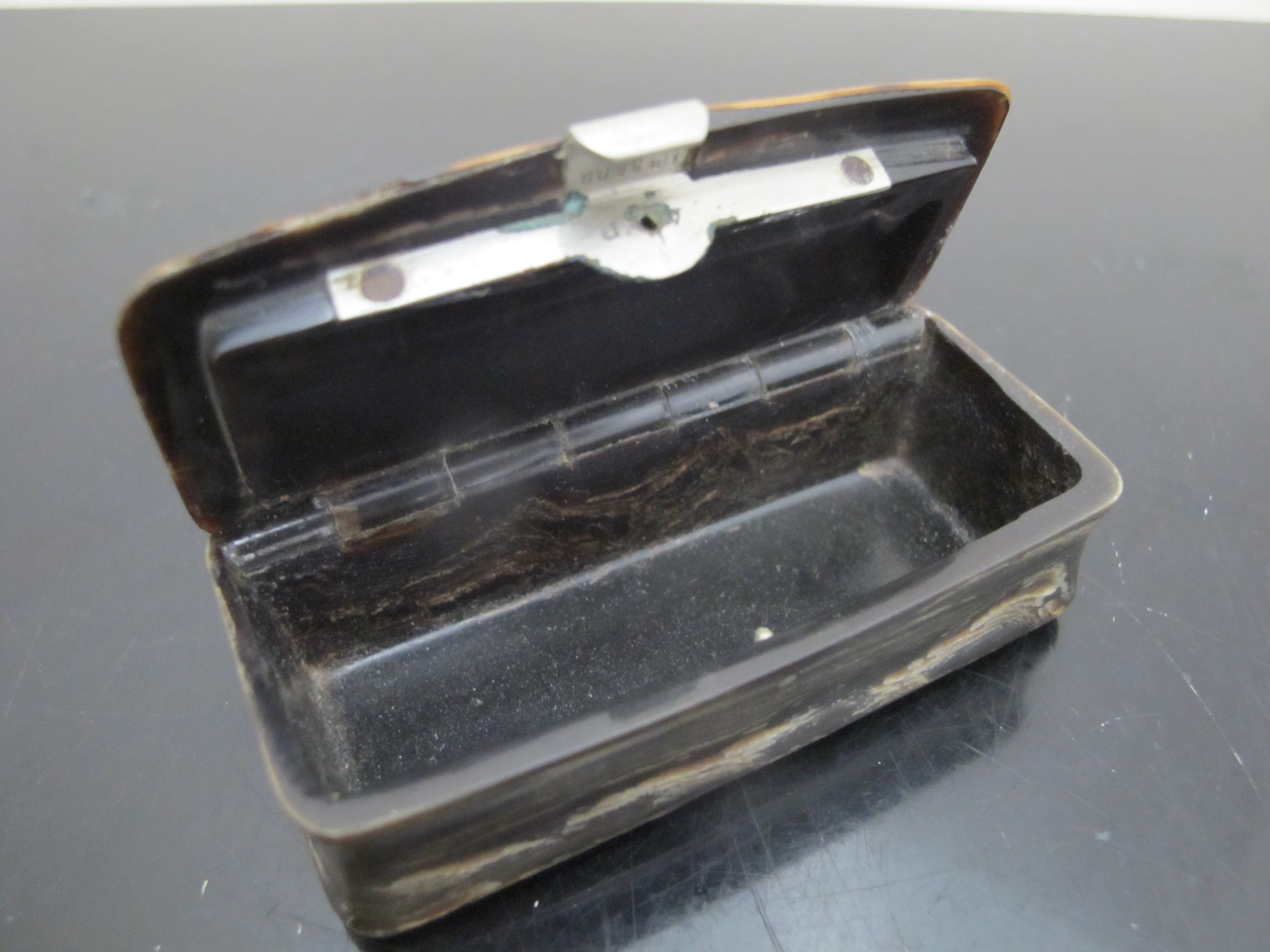 Very sweet and lovely little 19th century pressed horn snuff box with Tortoiseshell and scrolling floral silver inlay. Hinged lid opens to one compartment. These boxes were often used for storing small items such as jewelry or snuff. Fill it with your own tiny valuables. Measures 2 7/8" x 1 1/4" x 1" tall. Excellent condition, light wear, scuffing. No major cracks. Please note, any spots round spots you might see are just reflections.