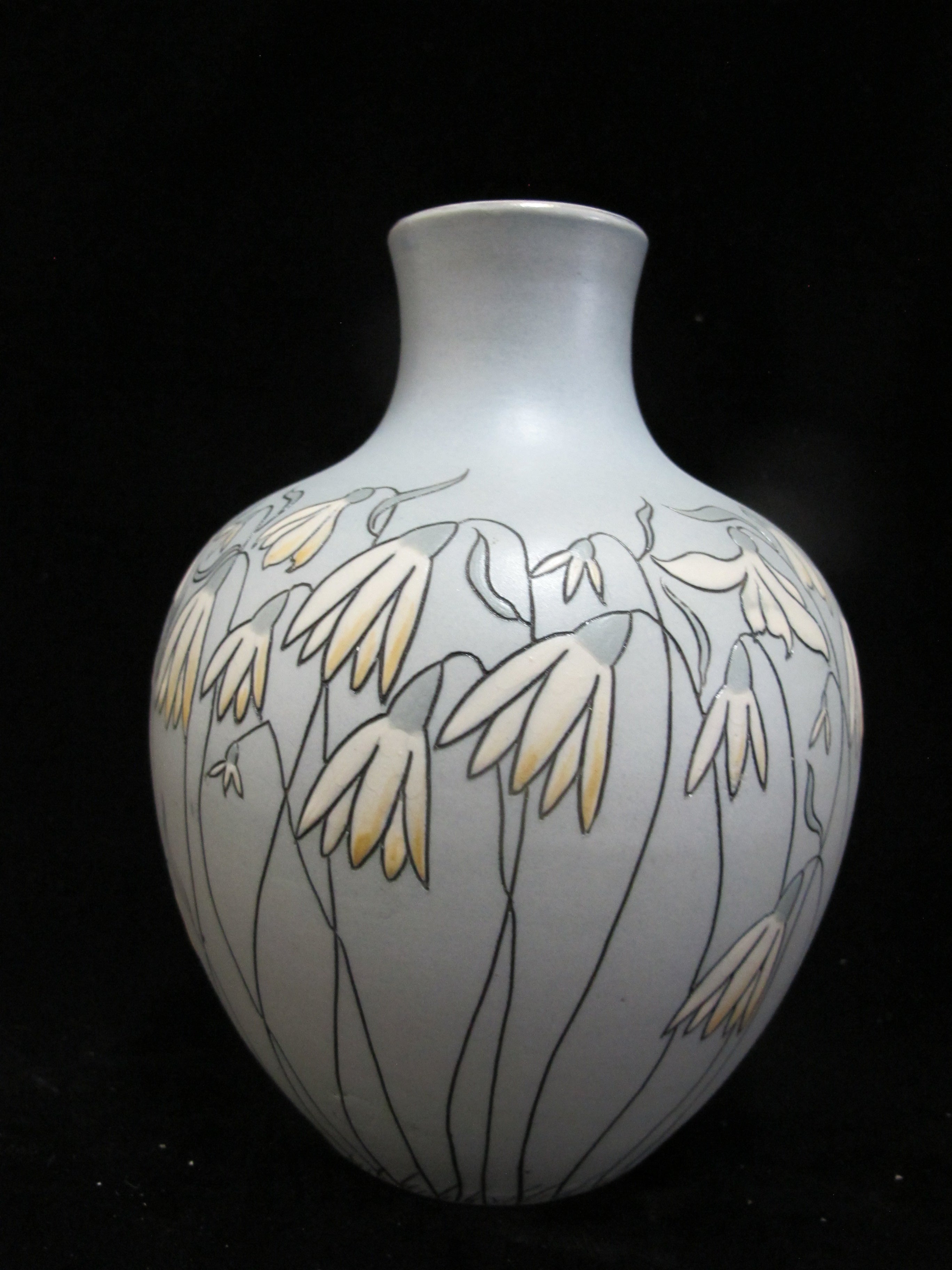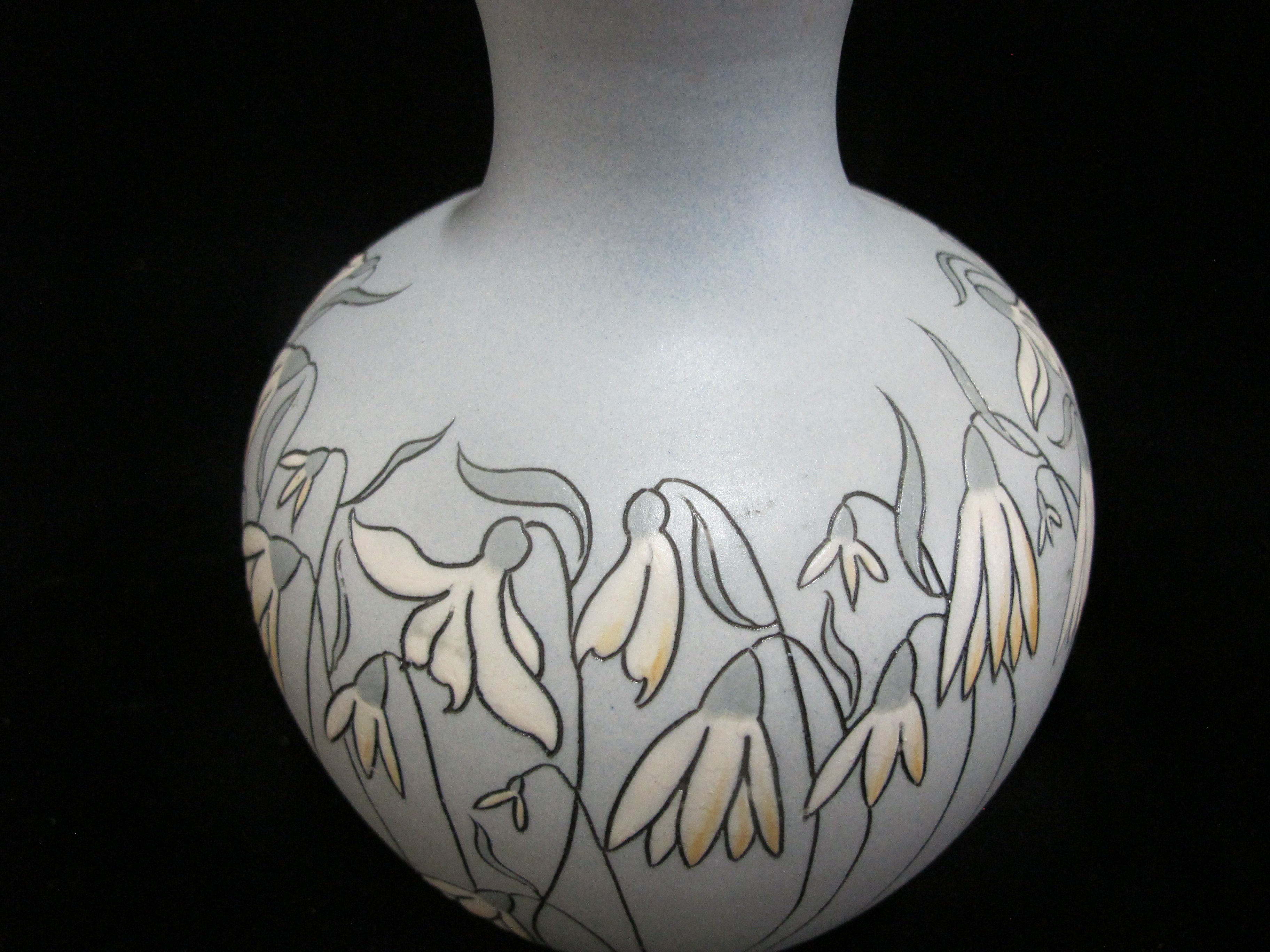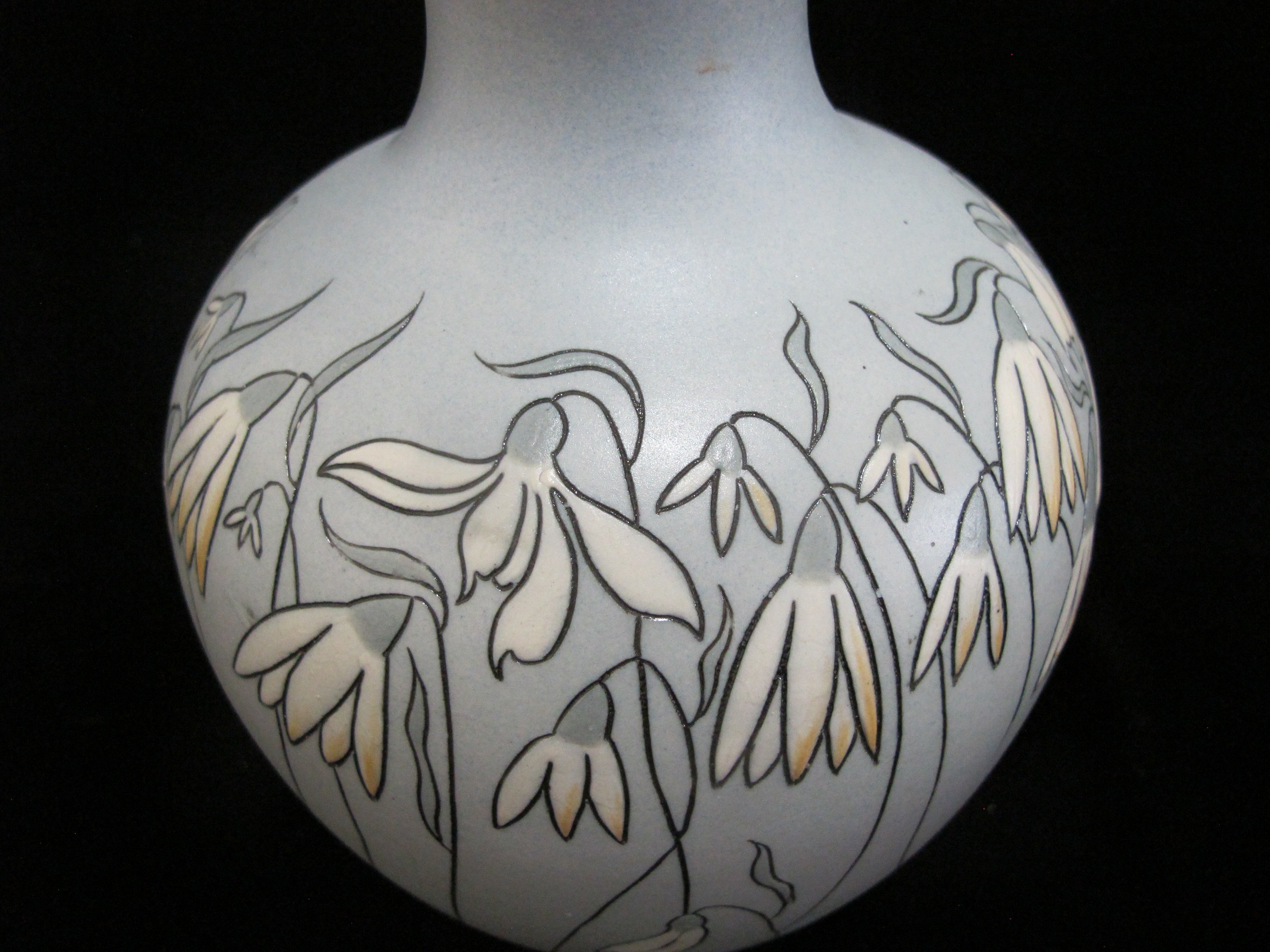 Art Nouveau Mettlach, Villeroy & Boch stoneware vase. Shape no. 2477 ovoid shape in delicate pale blue with incised continuous cyclamen flowers. Measures 7 3/4" tall x 5 1/2".