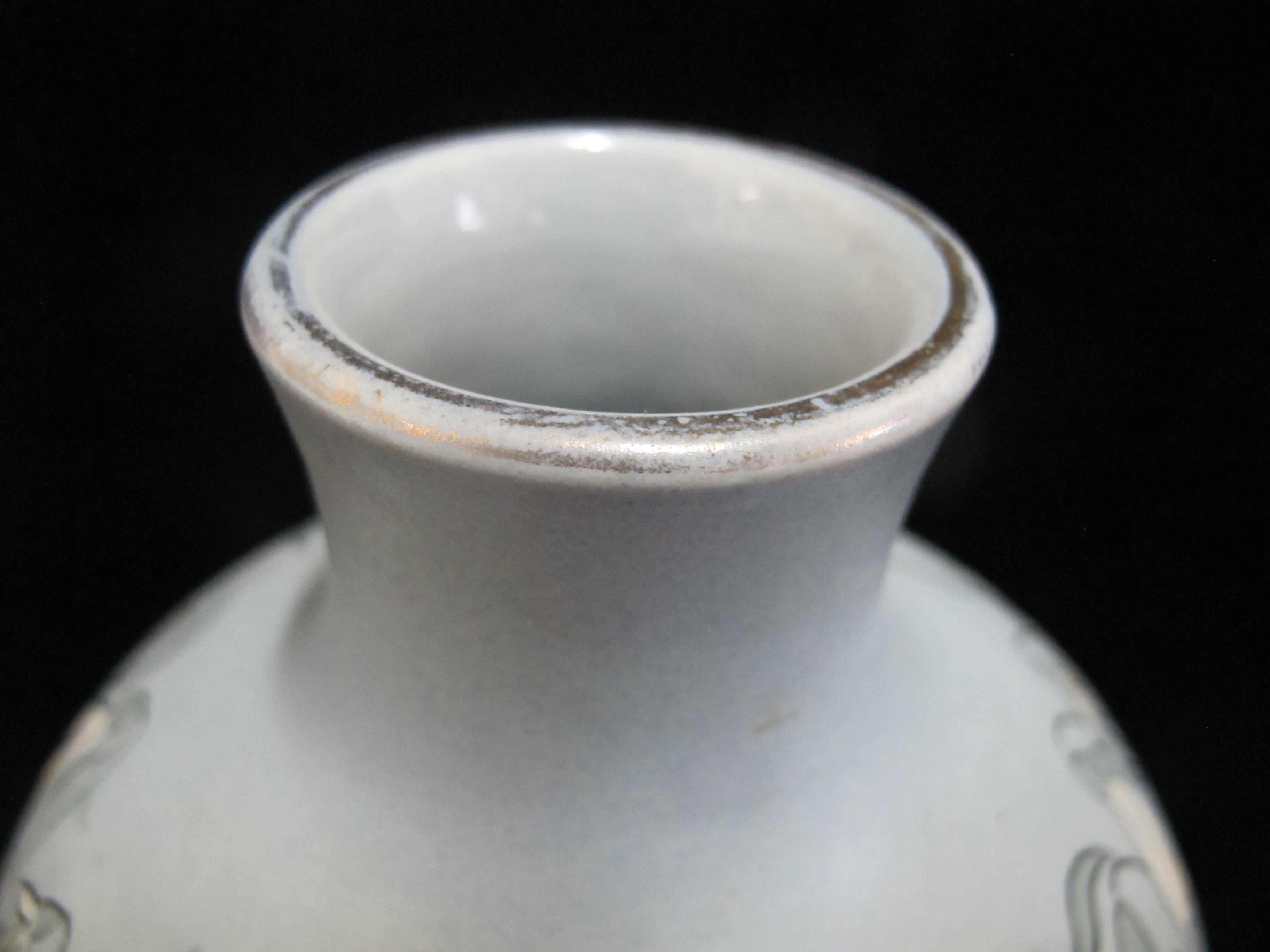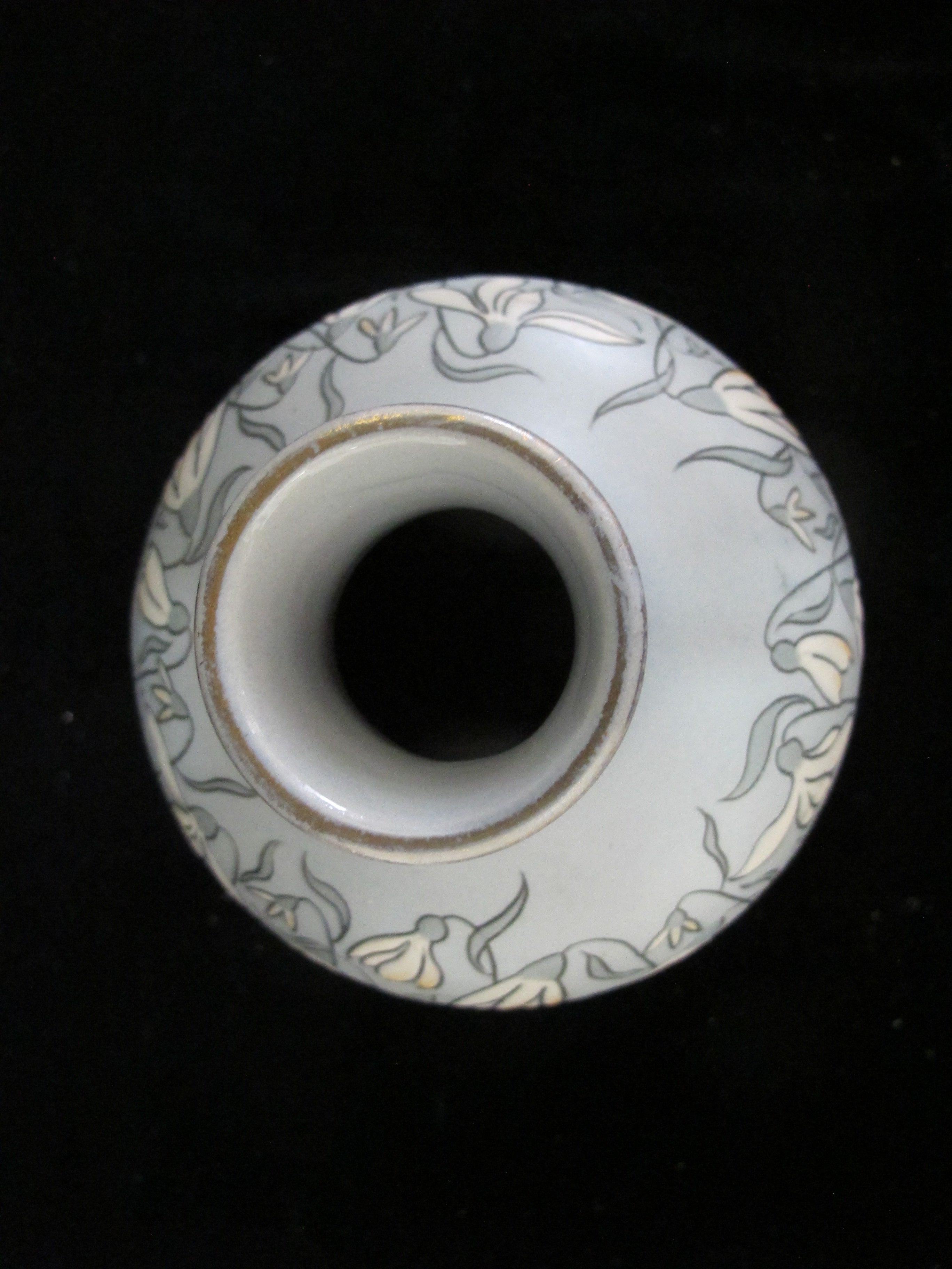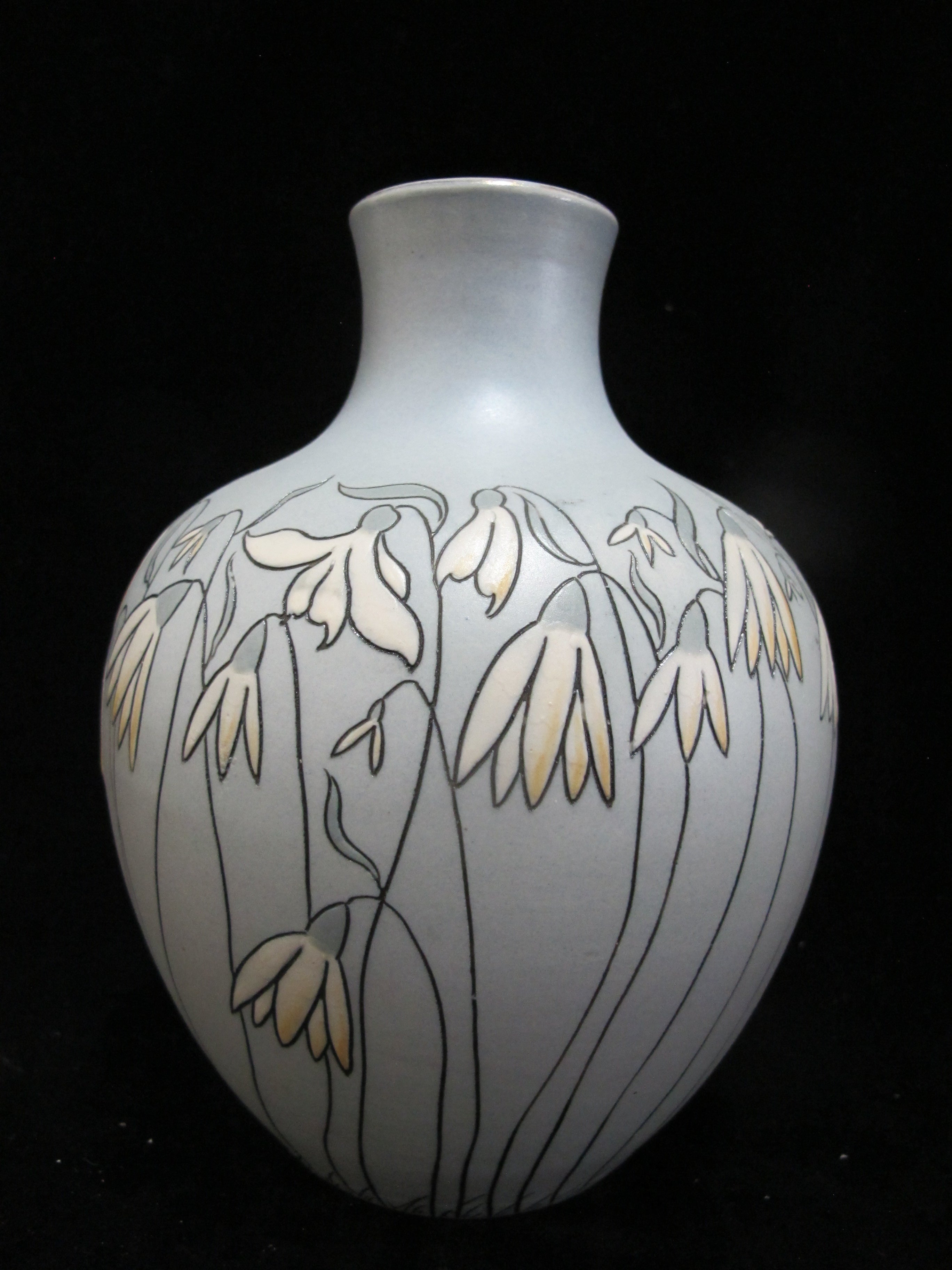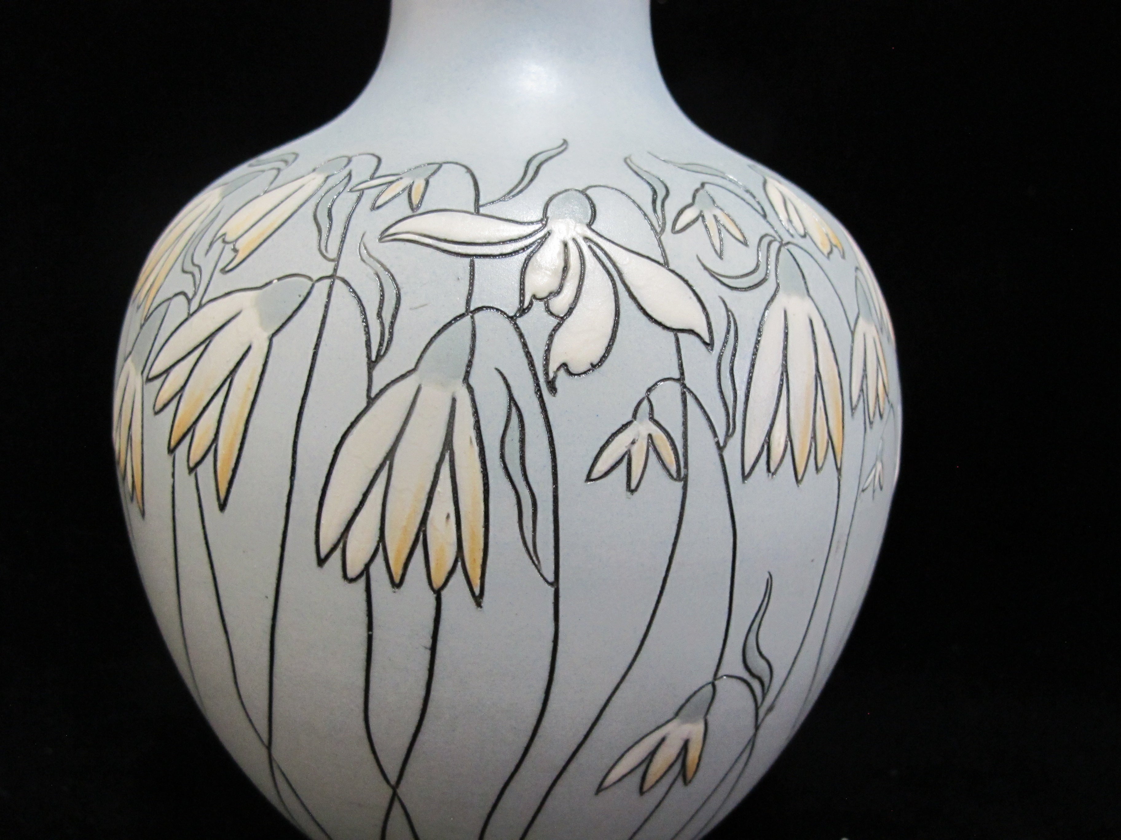 Art Nouveau Mettlach, Villeroy & Boch stoneware vase. Shape no. 2477 ovoid shape in delicate pale blue with incised continuous cyclamen flowers. Measures 7 3/4" tall x 5 1/2".