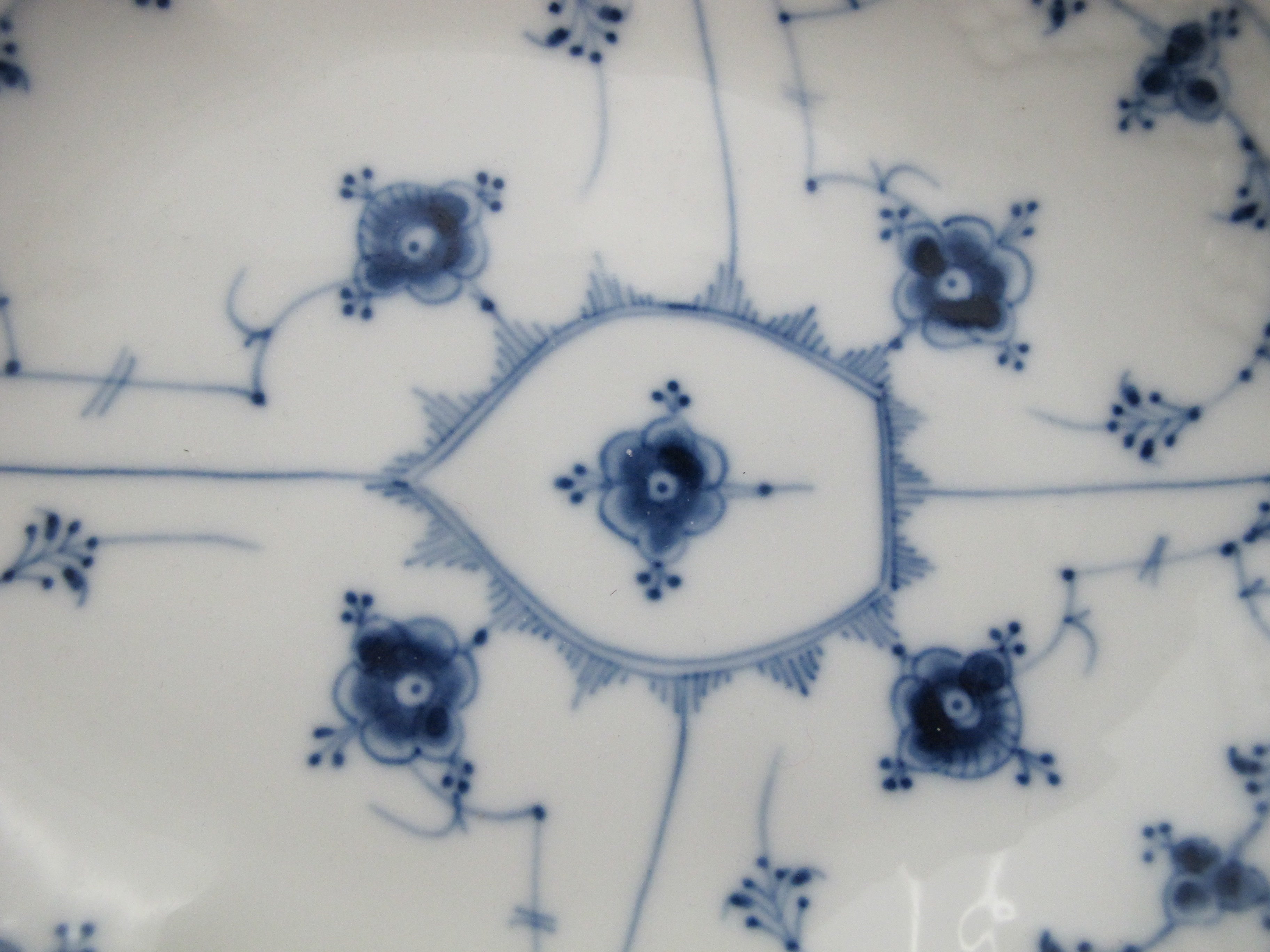 Vintage B&G (Bing & Grondahl/Royal Copenhagen) Denmark plain blue, leaf shaped pastry serving dish with basket weave texture. I have also seen this listed as a cake and pickle server. Would make a great serving dish for Hor d'oeuvres. Measures 9 3/4" x 7" x 1 1/2" tall. In excellent condition, no chips, cracks, or repairs. Hallmarks at base.