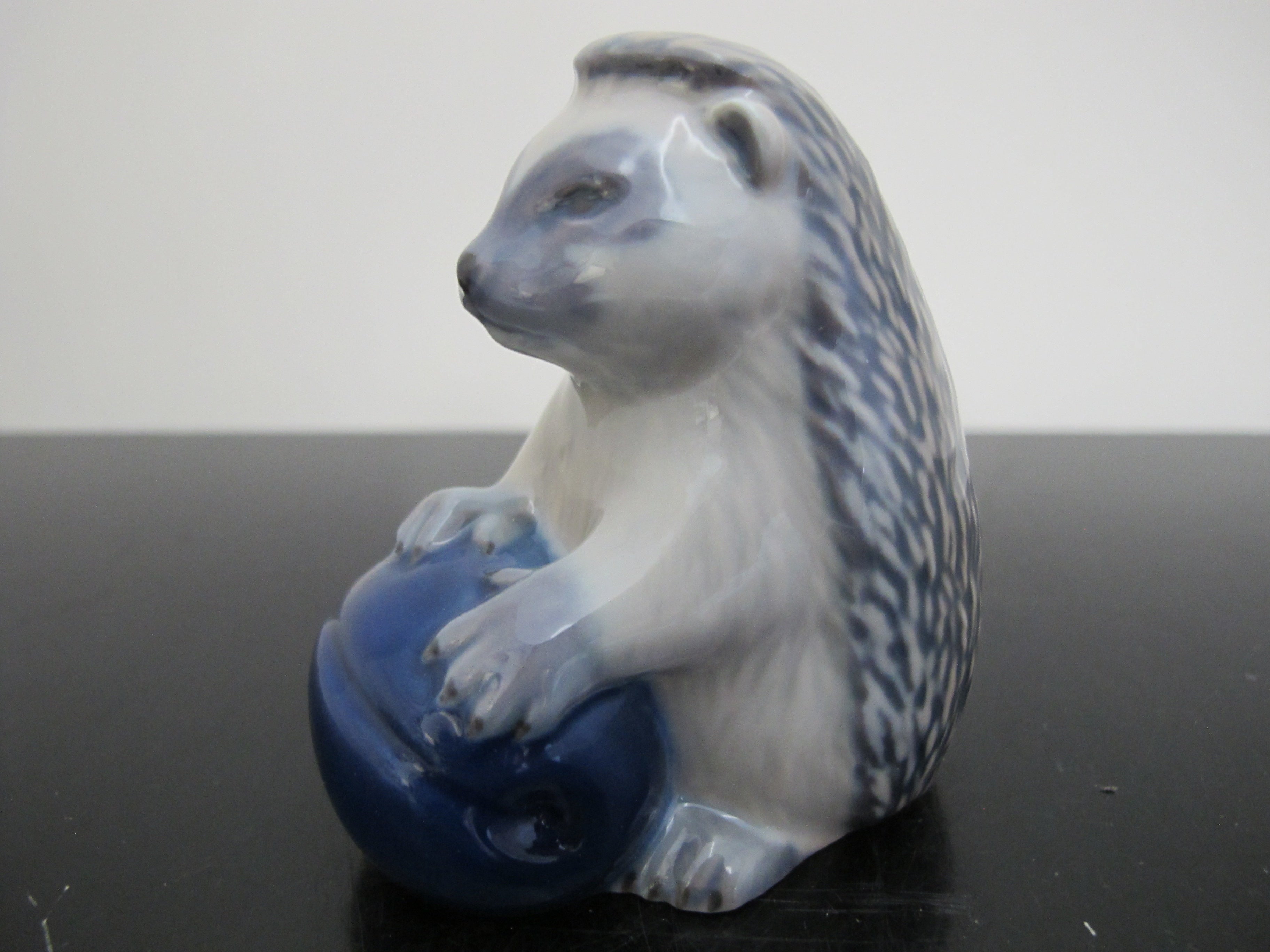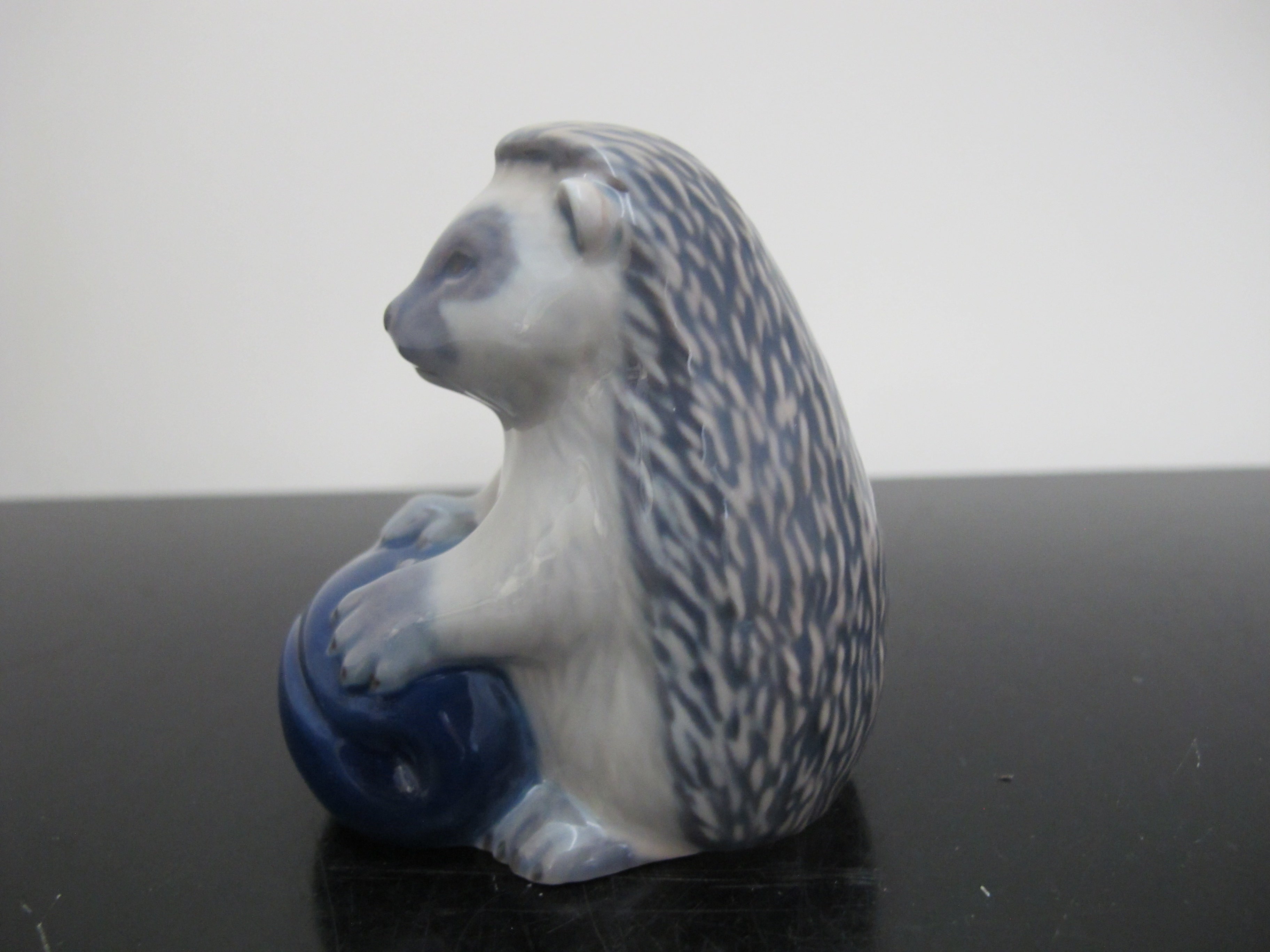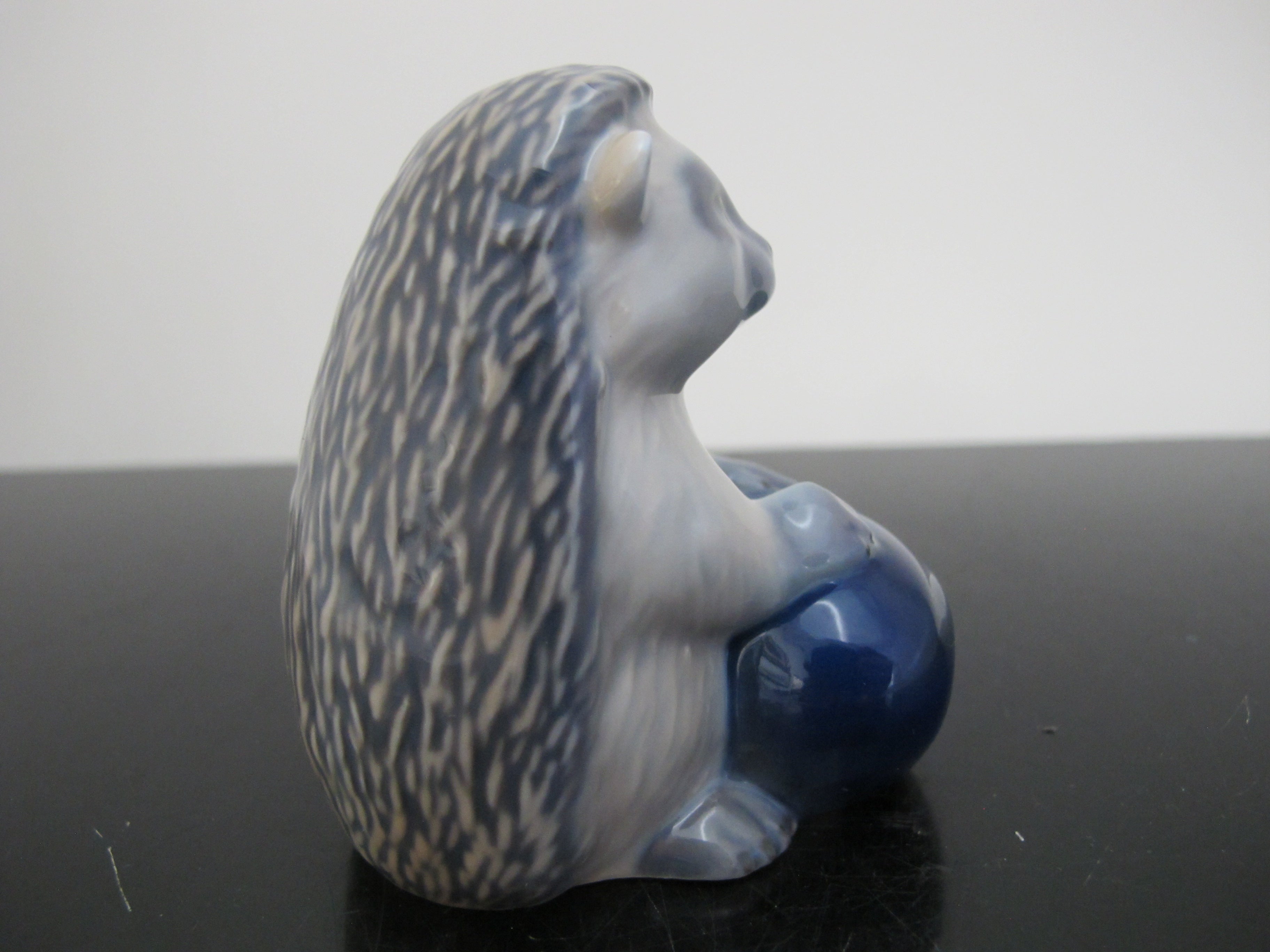 Sweet little Bing & Grondahl porcelain figurine or paperweight. Cute hedgehog with blue ball. Production limited to the year 1995. Measures 1 3/4" x 2 1/2" x 3" tall. Hallmarks at base. Excellent condition, no chips, cracks, or repairs.