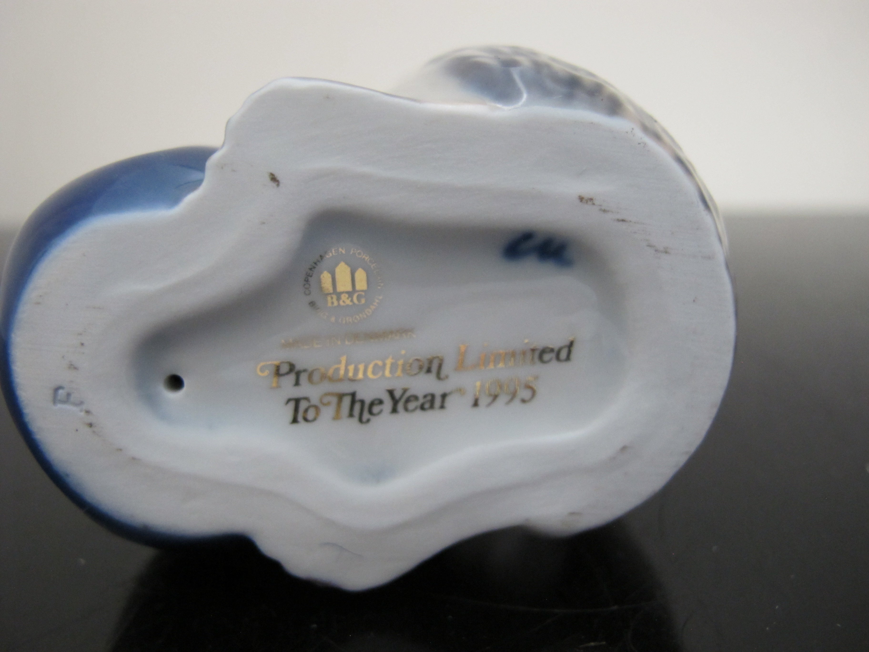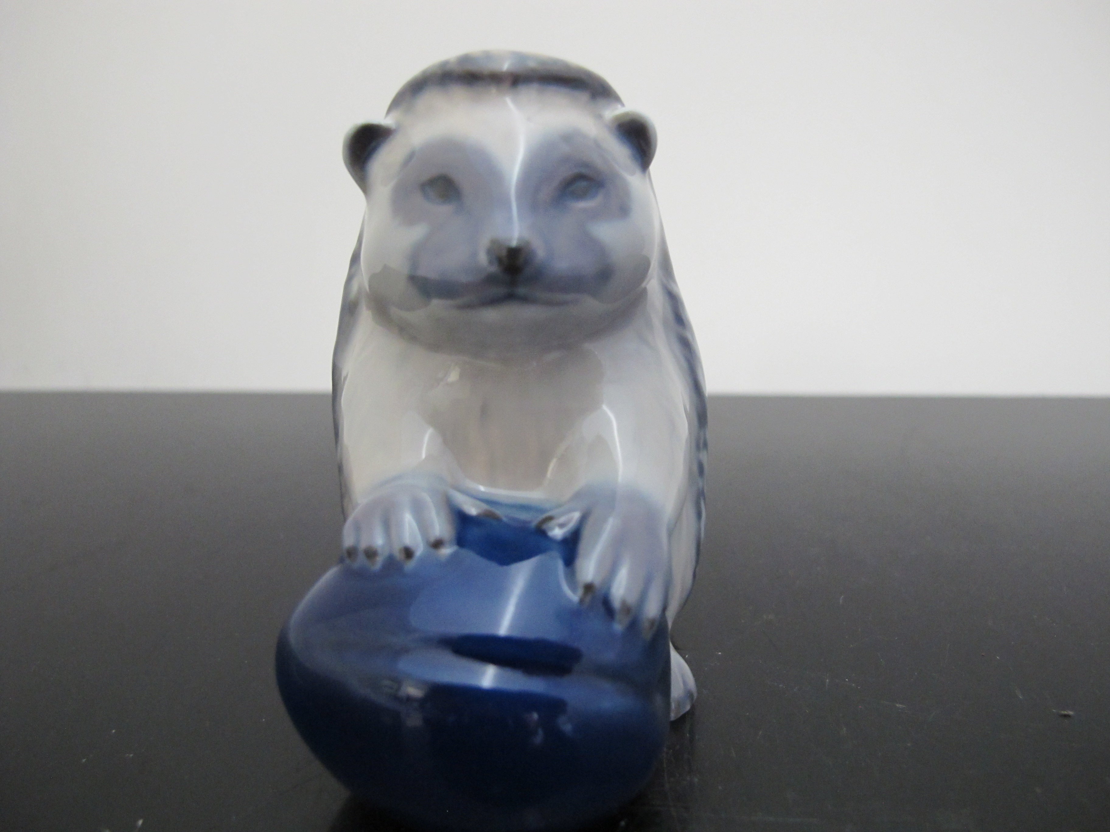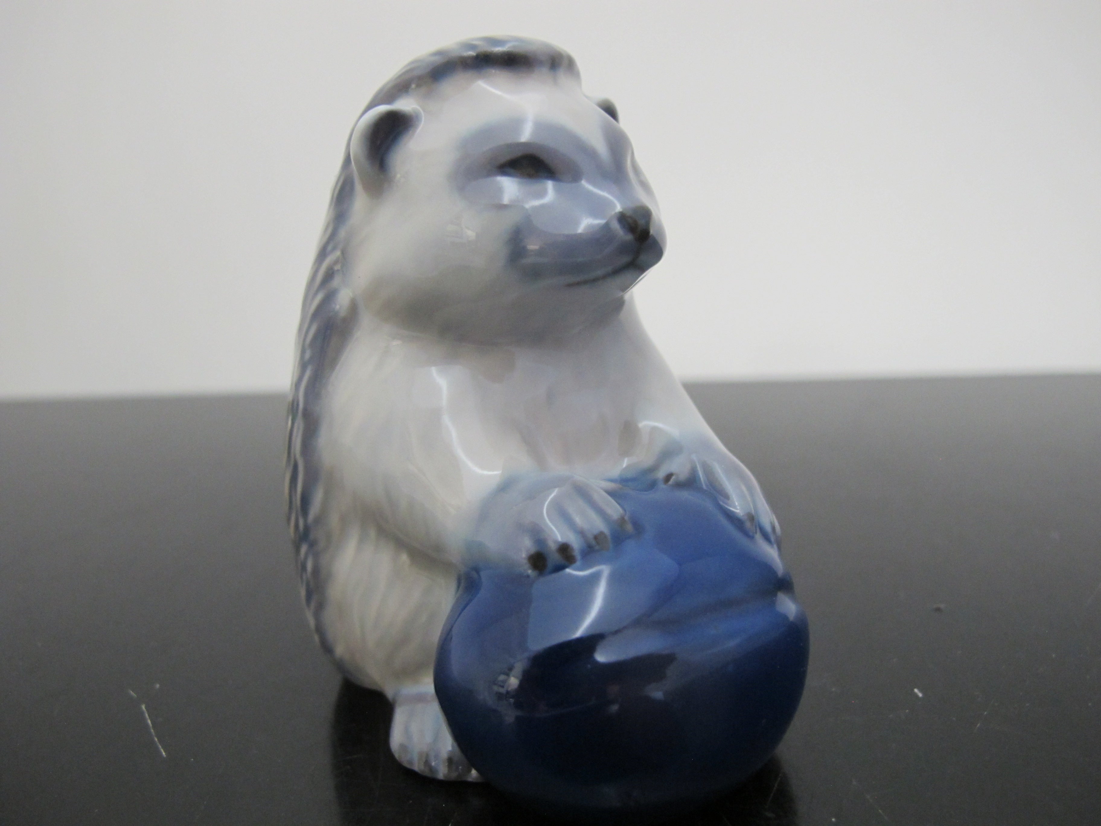 Sweet little Bing & Grondahl porcelain figurine or paperweight. Cute hedgehog with blue ball. Production limited to the year 1995. Measures 1 3/4" x 2 1/2" x 3" tall. Hallmarks at base. Excellent condition, no chips, cracks, or repairs.