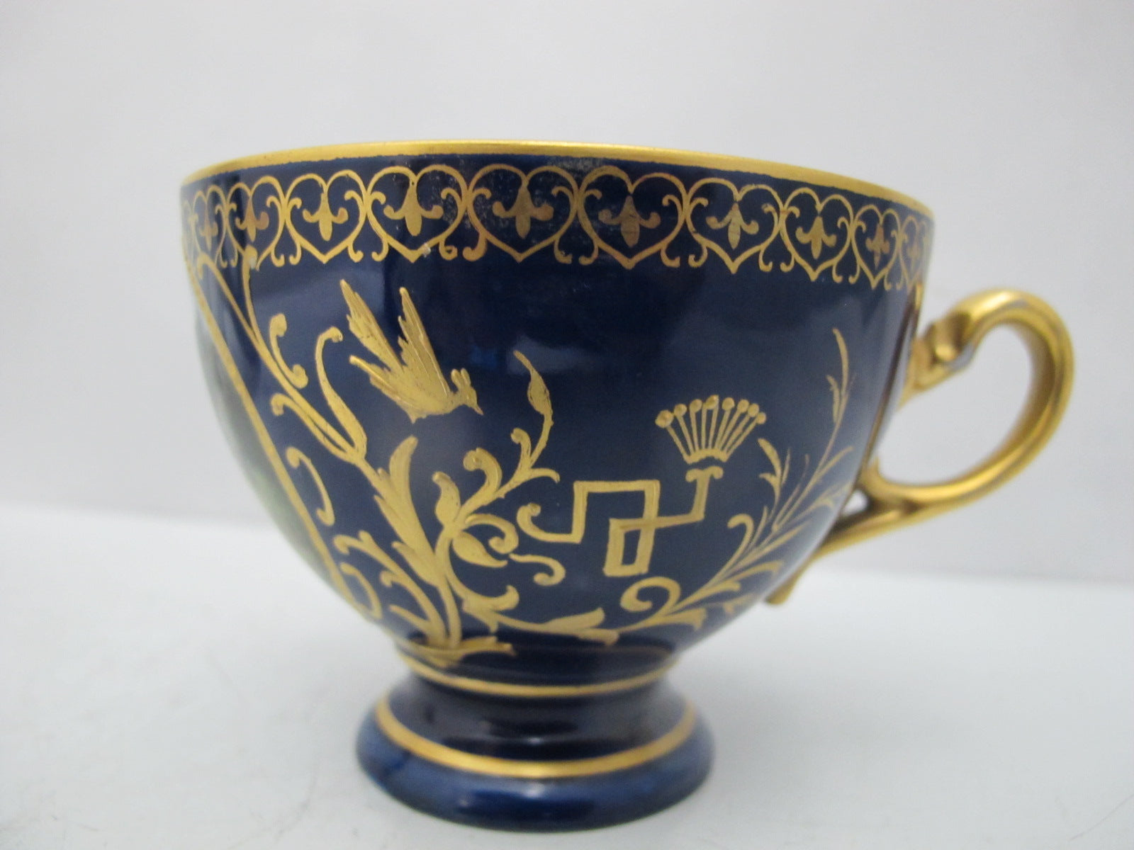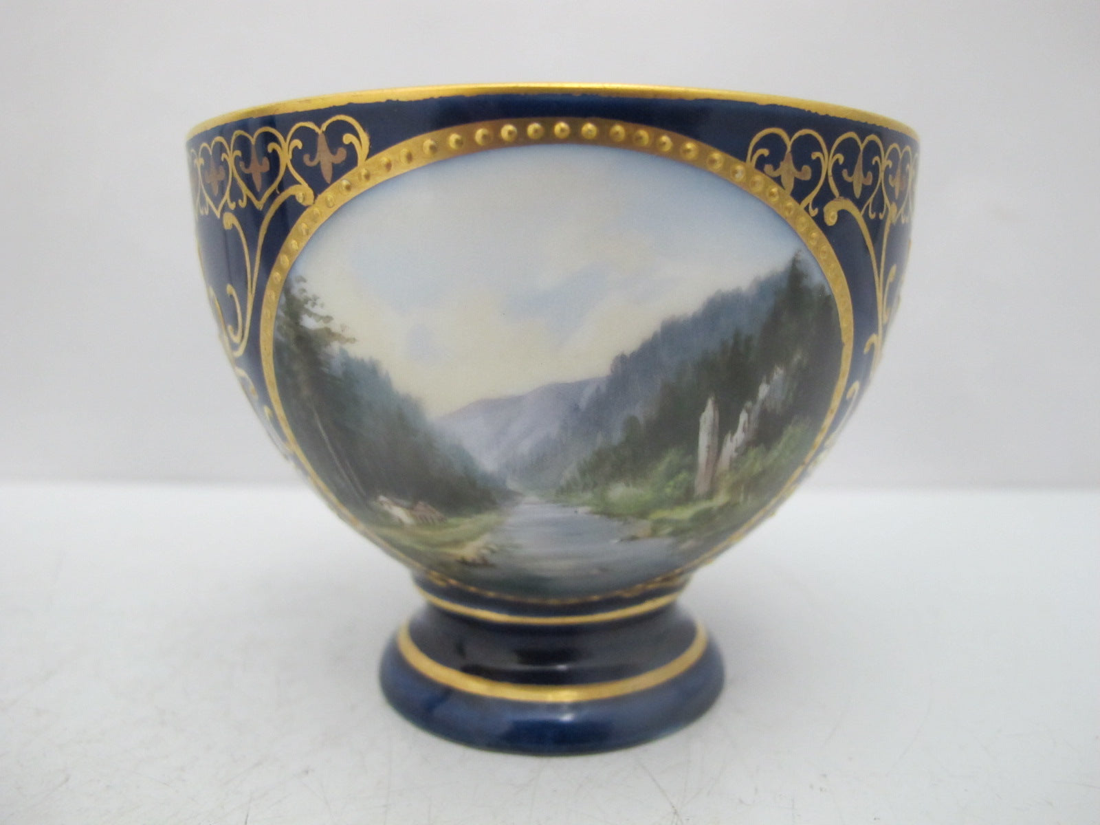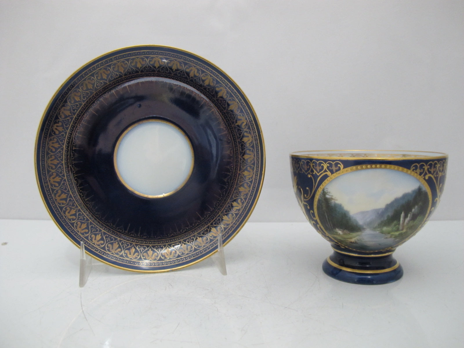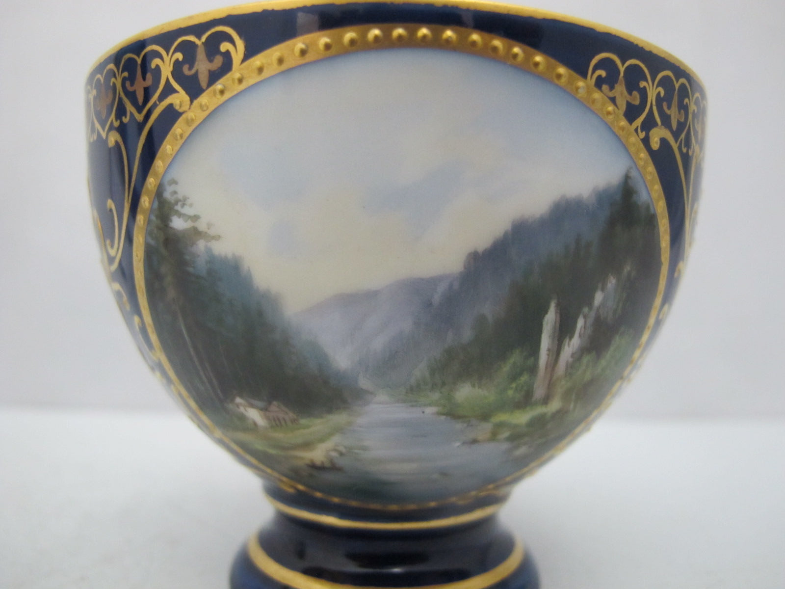 19th century, Karlsbad Hermann Voigt, Bohemia porcelain cup and saucer. Cobalt blue with ornate gilt accents and finely hand painted European countryside landscape and architecture. Absolutely stunning.
