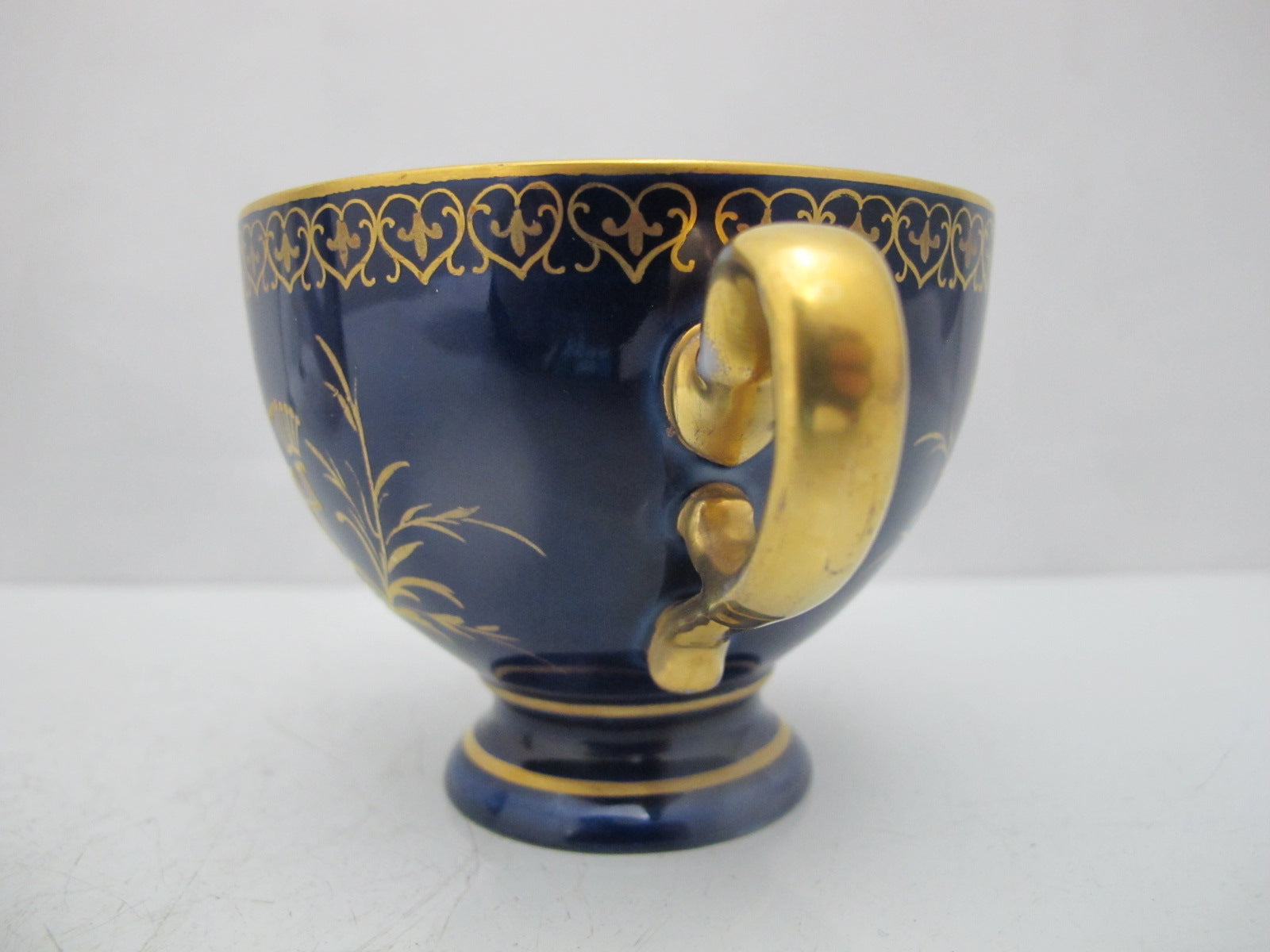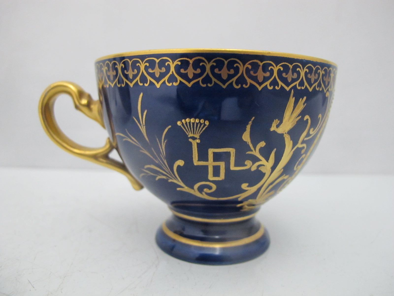 Cup measures 2 3/4" tall x 4 1/2" including handle x 3 1/2". Hermann Voigt Karlsbad mark at base.
