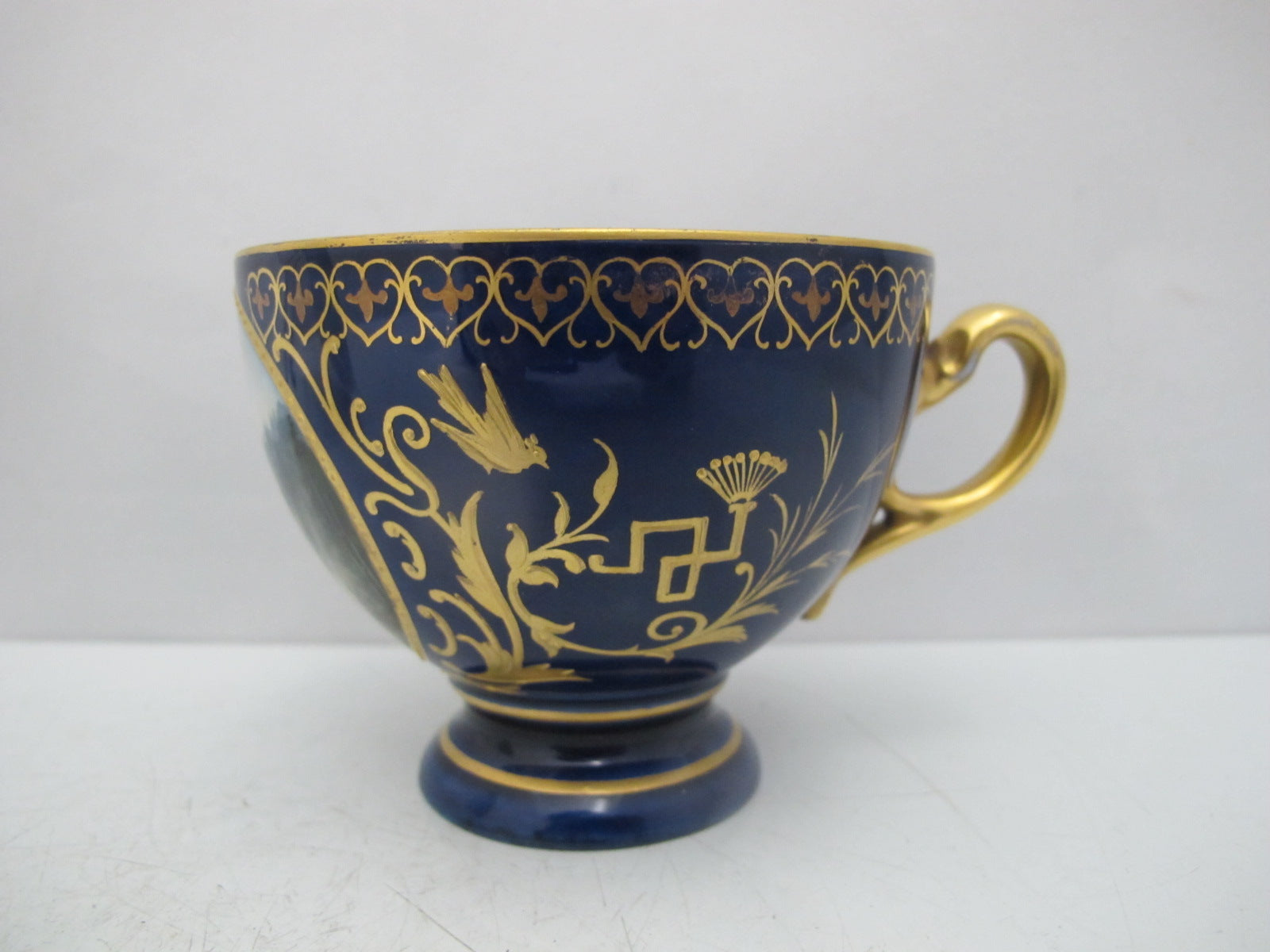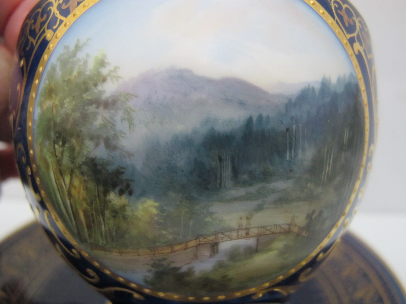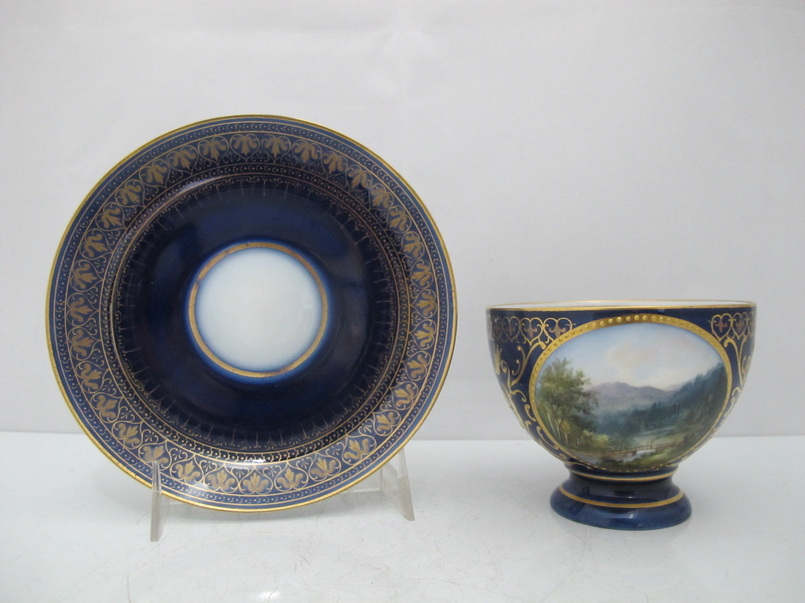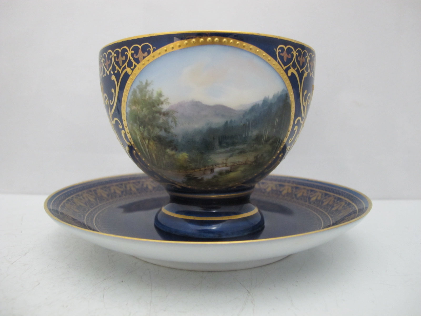 19th century, Karlsbad Hermann Voigt, Bohemia porcelain footed cup and saucer. Cobalt blue with ornate gilt accents and finely hand painted European landscape. Absolutely stunning.