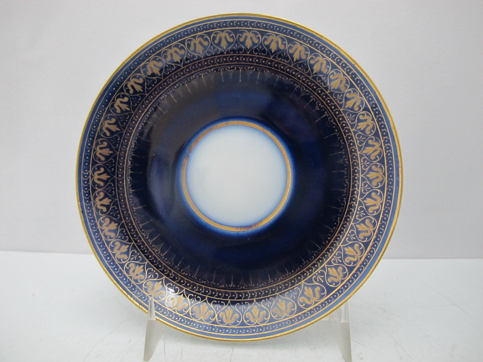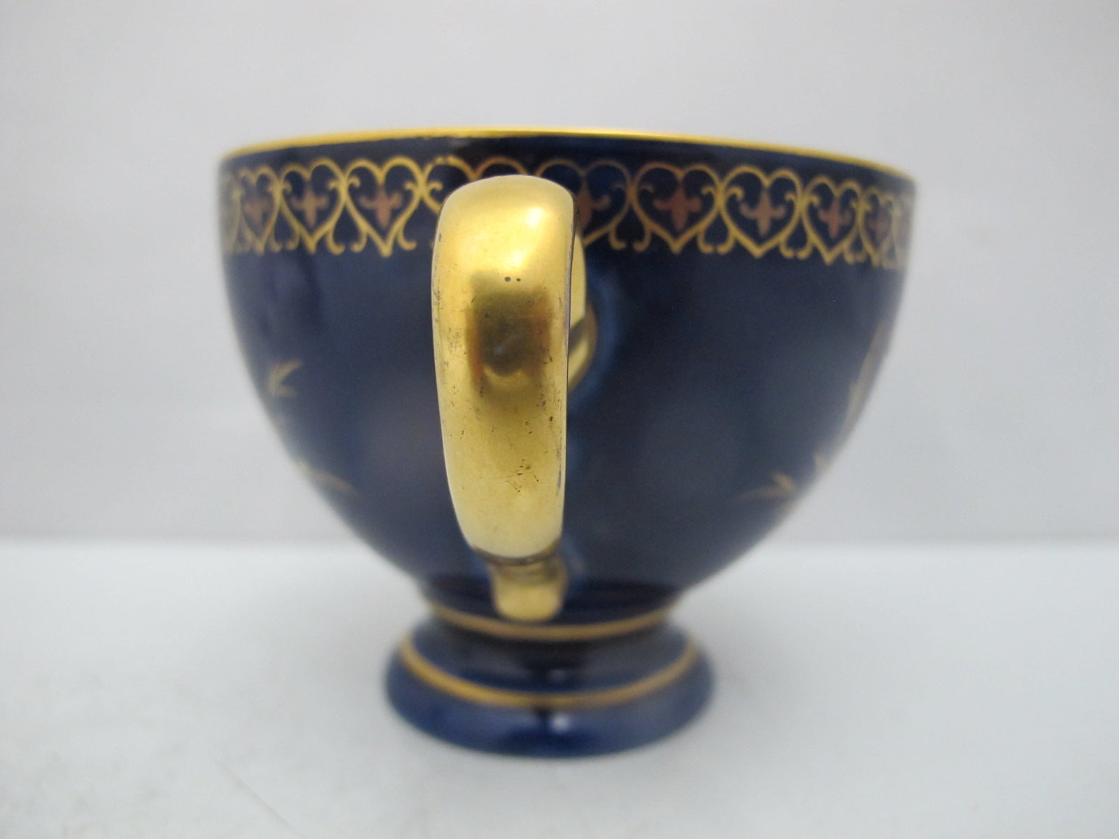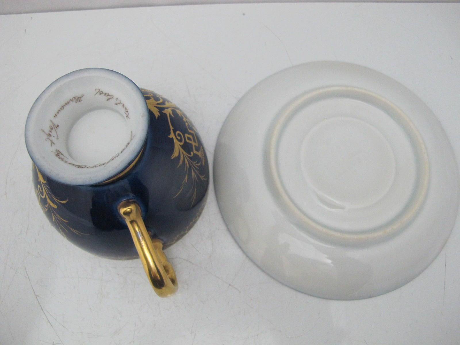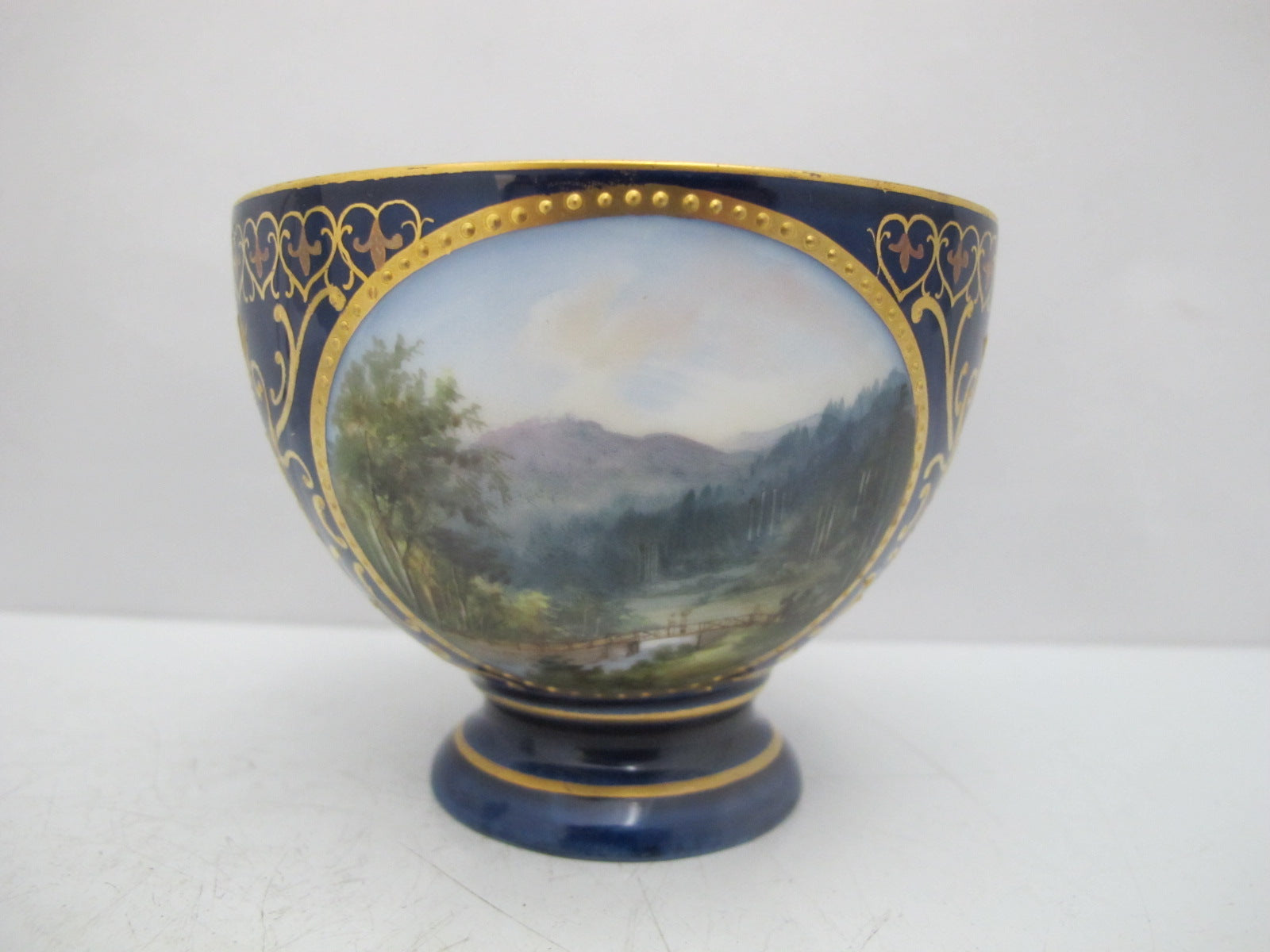 19th century, Karlsbad Hermann Voigt, Bohemia porcelain footed cup and saucer. Cobalt blue with ornate gilt accents and finely hand painted European landscape. Absolutely stunning.