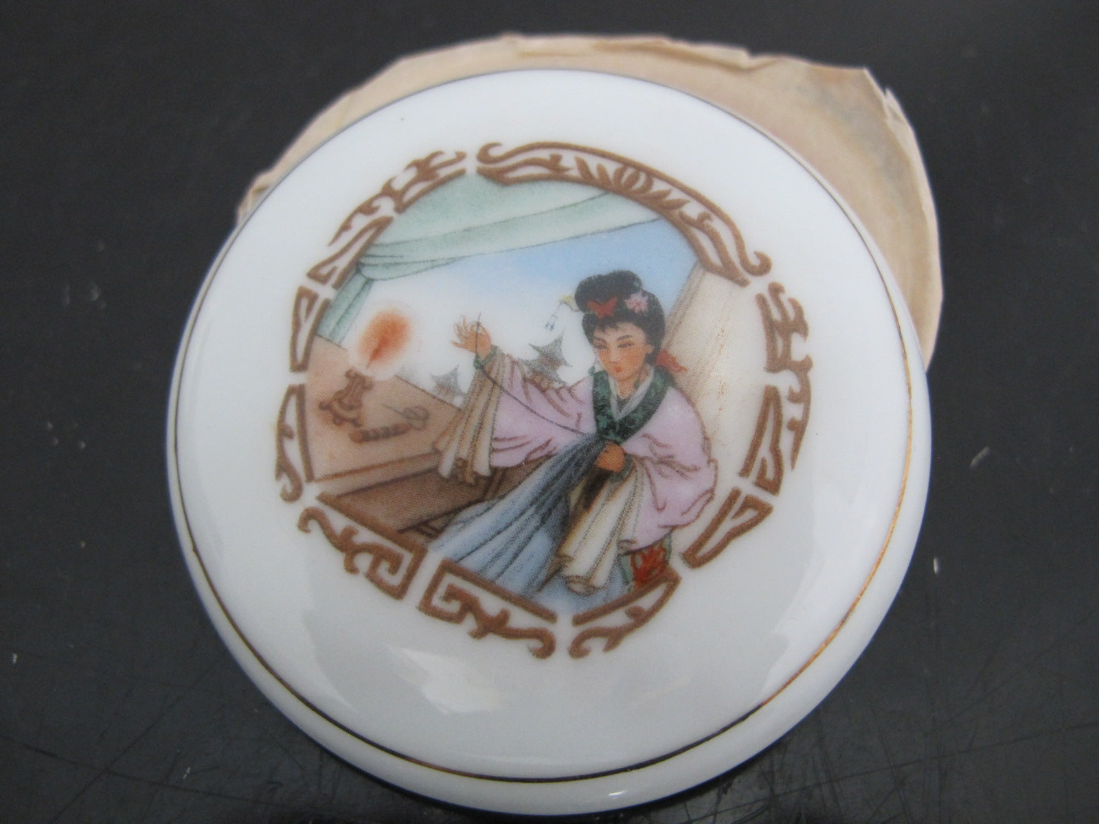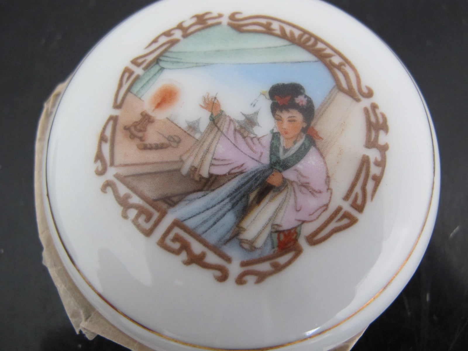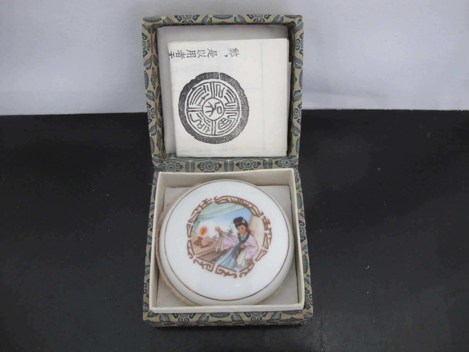 Vintage Chinese porcelain seal ink container or cinnabar ink pad. Showing design of woman sewing. Vintage, most likely 1970's. Unused, original packaging and instructions.