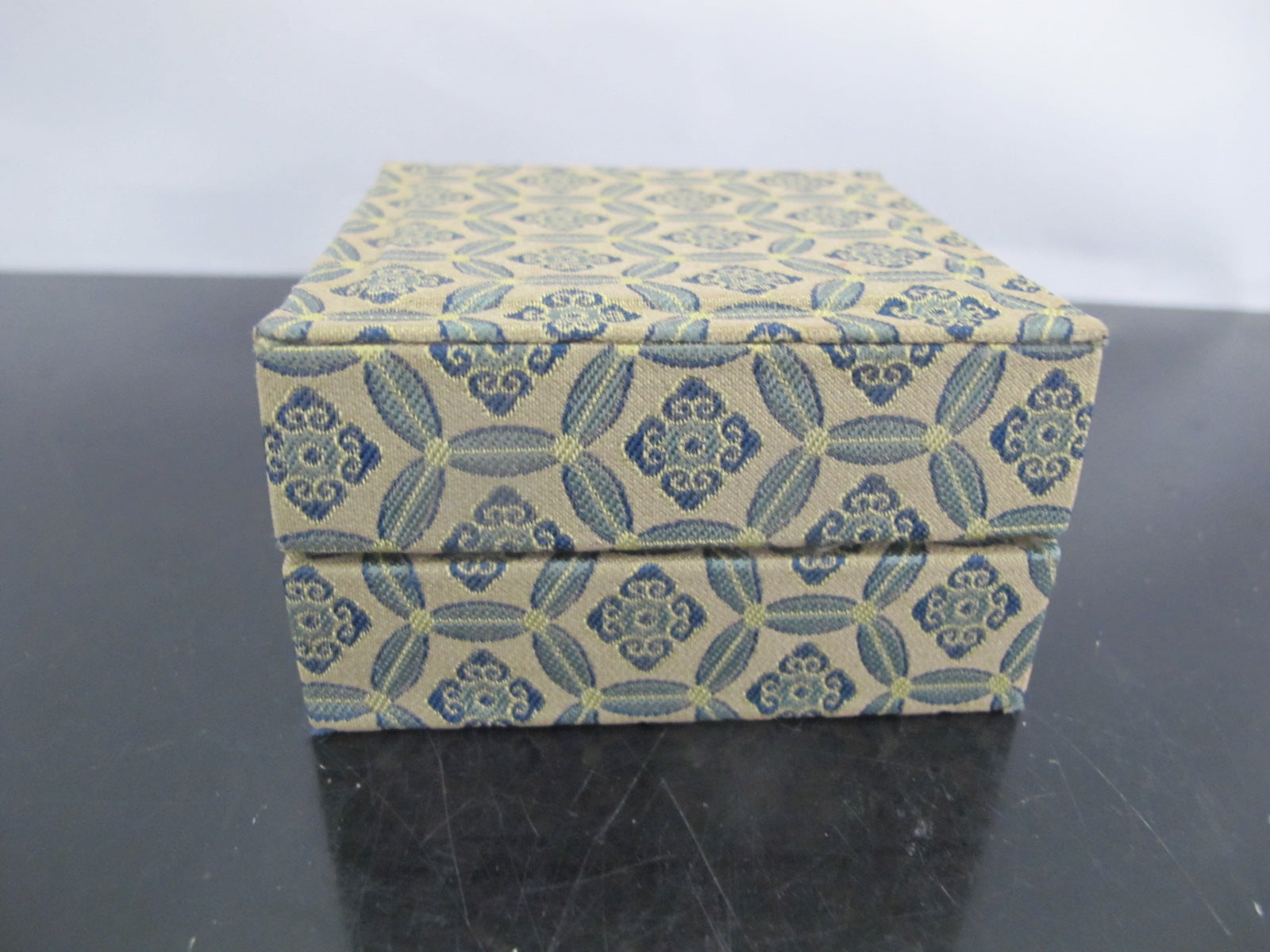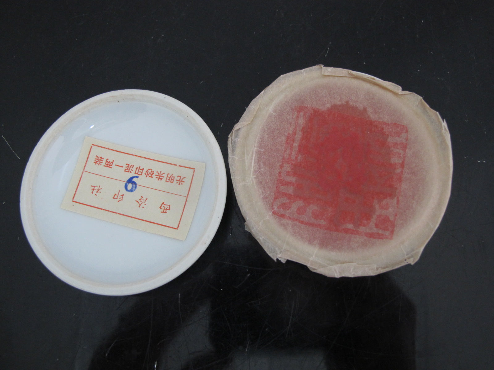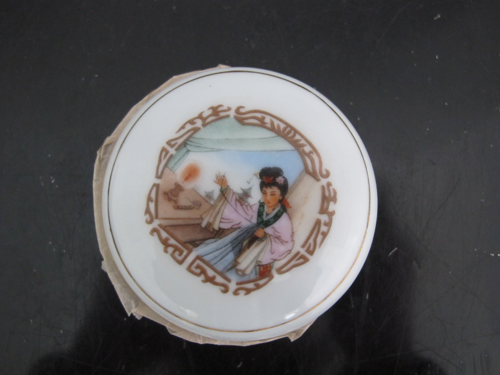 Vintage Chinese porcelain seal ink container or cinnabar ink pad. Showing design of woman sewing. Vintage, most likely 1970's. Unused, original packaging and instructions.