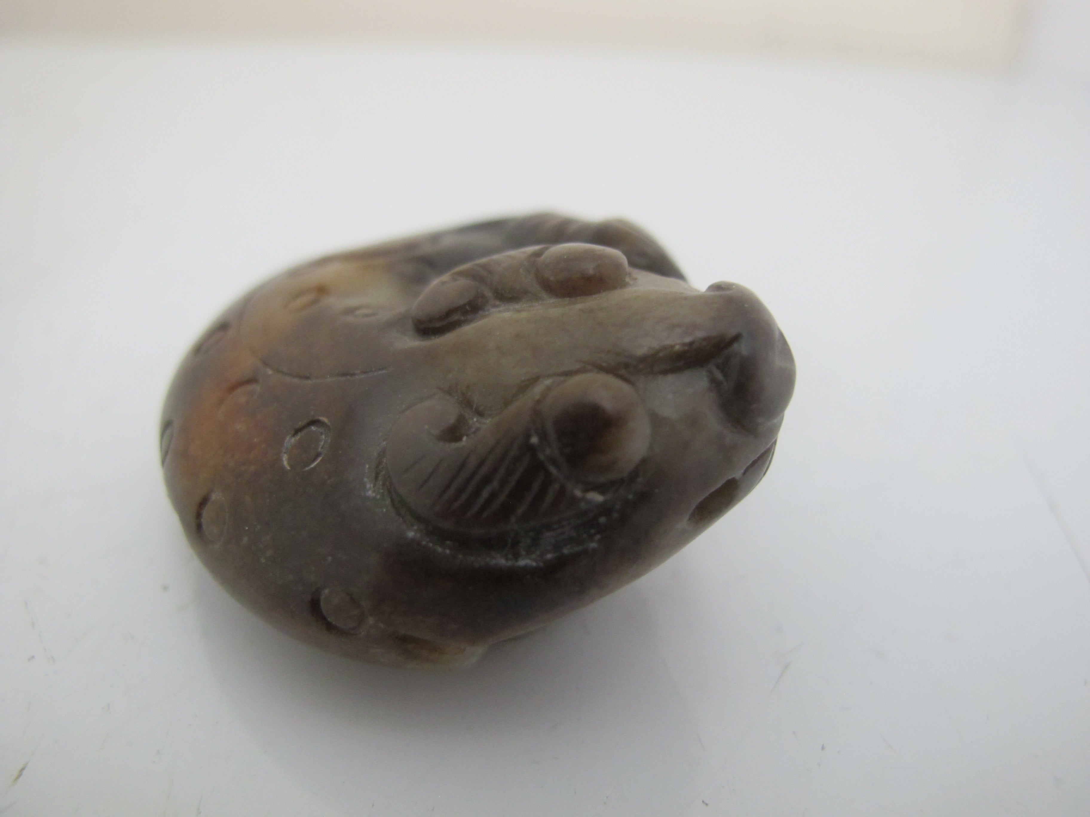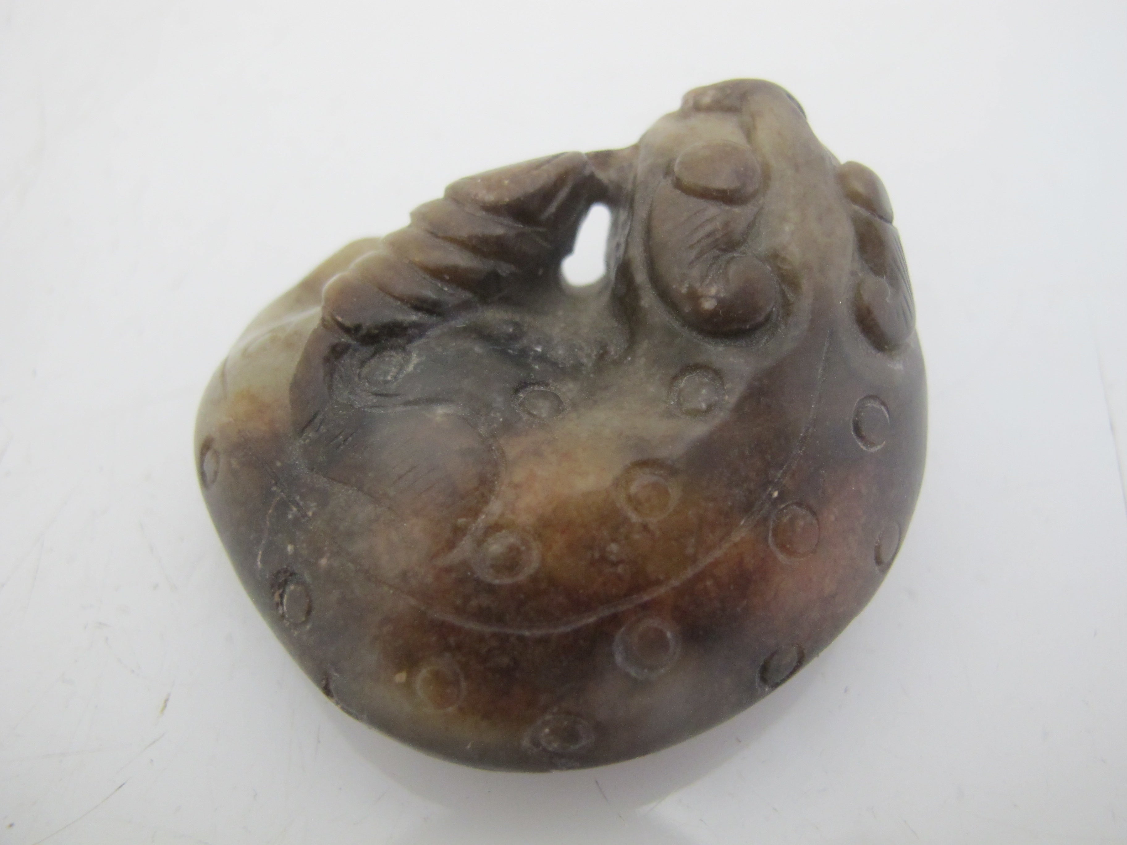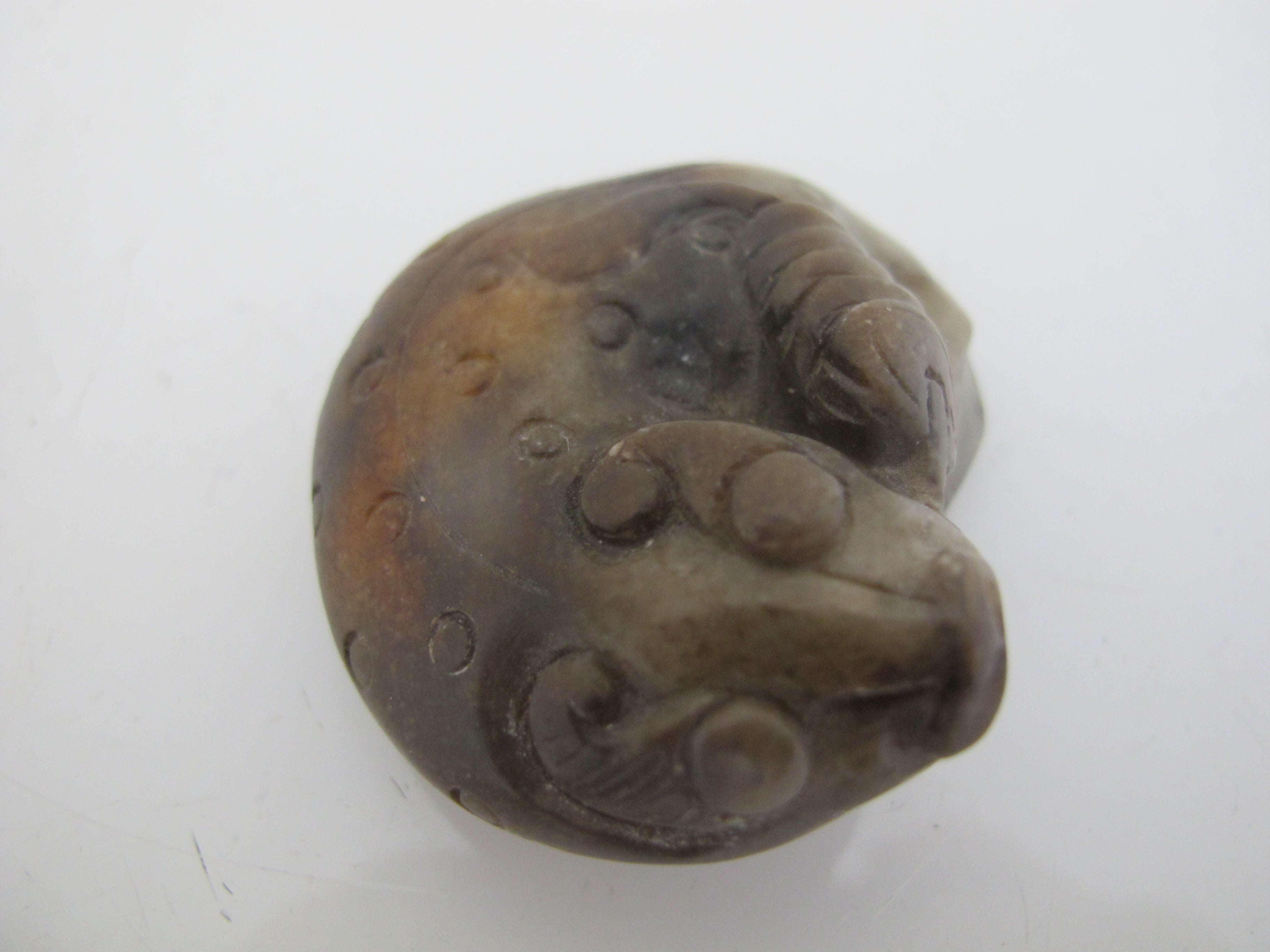 Small Chinese carved hardstone figurine or pendant. Curled up beast with tail and legs. Has small holes at each side of mouth so could be worn as pendant. Measures 2" x 2" x 3/4" tall. Excellent condition.