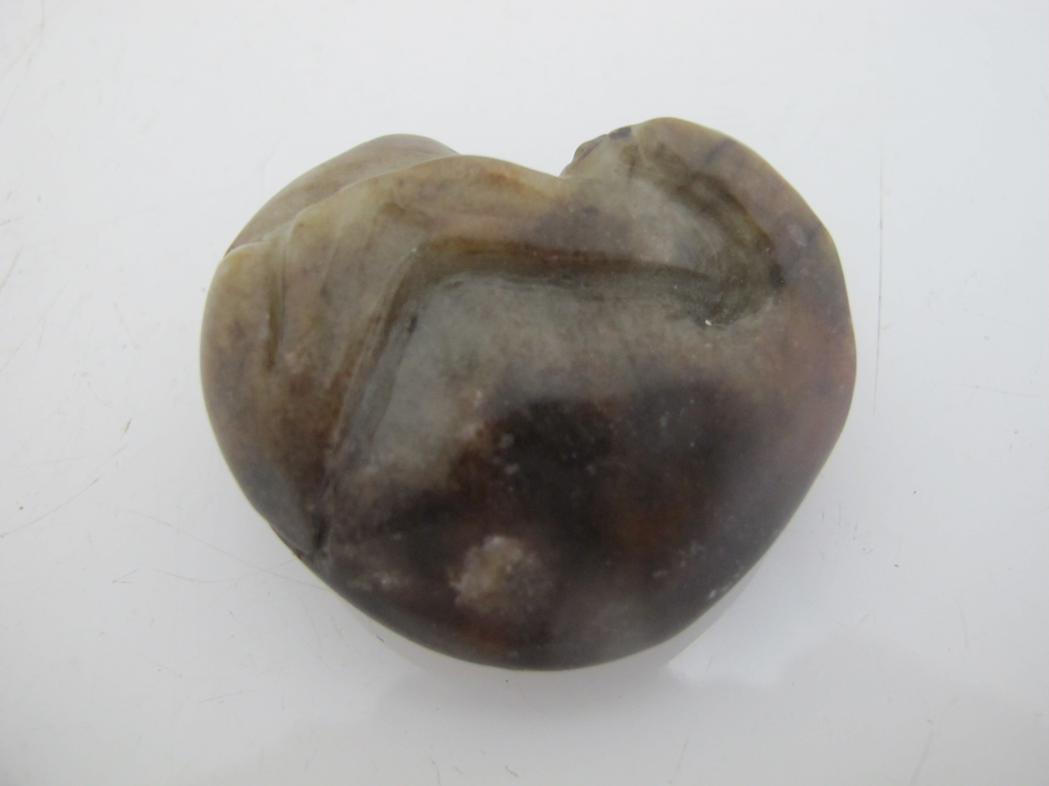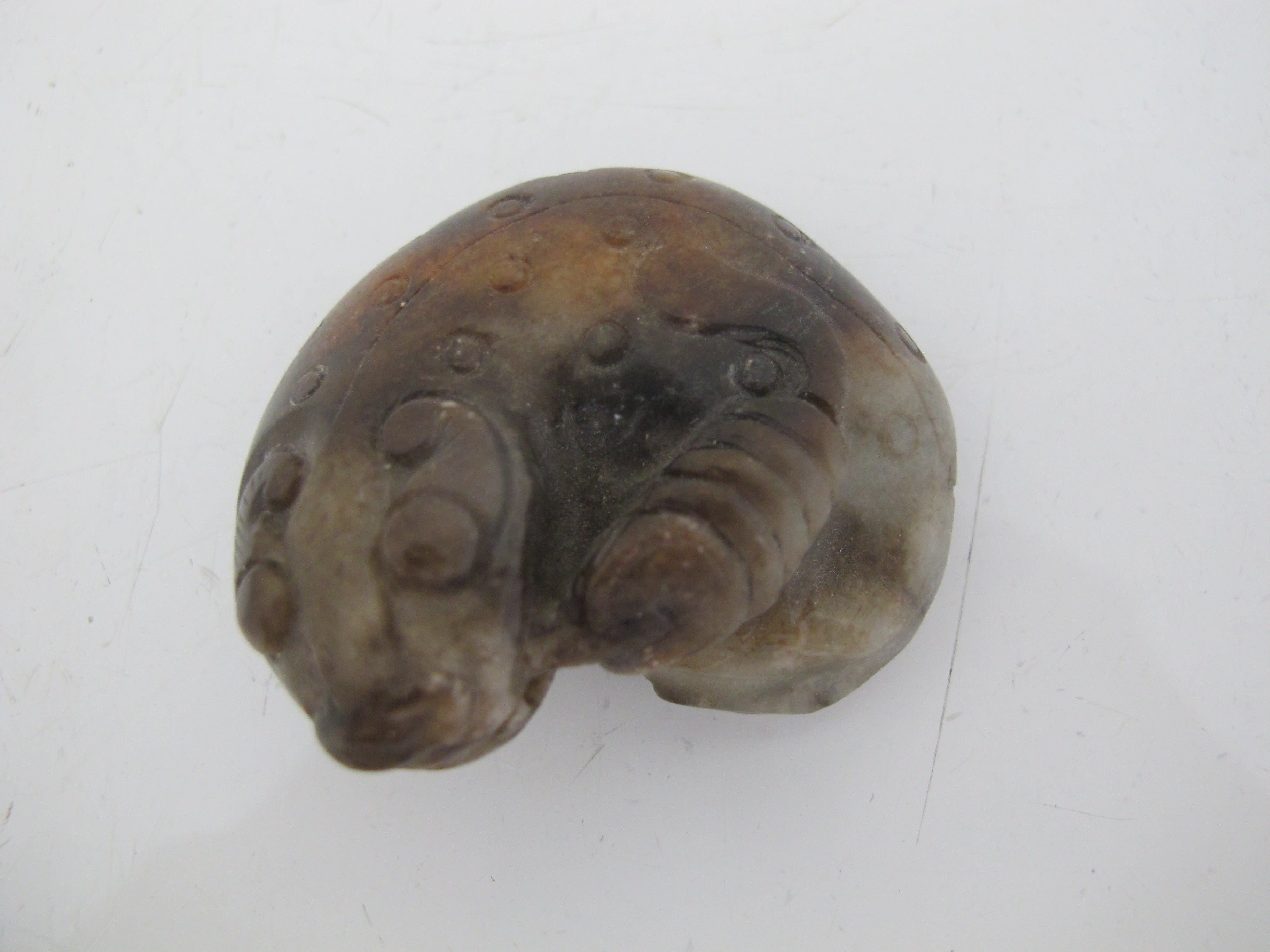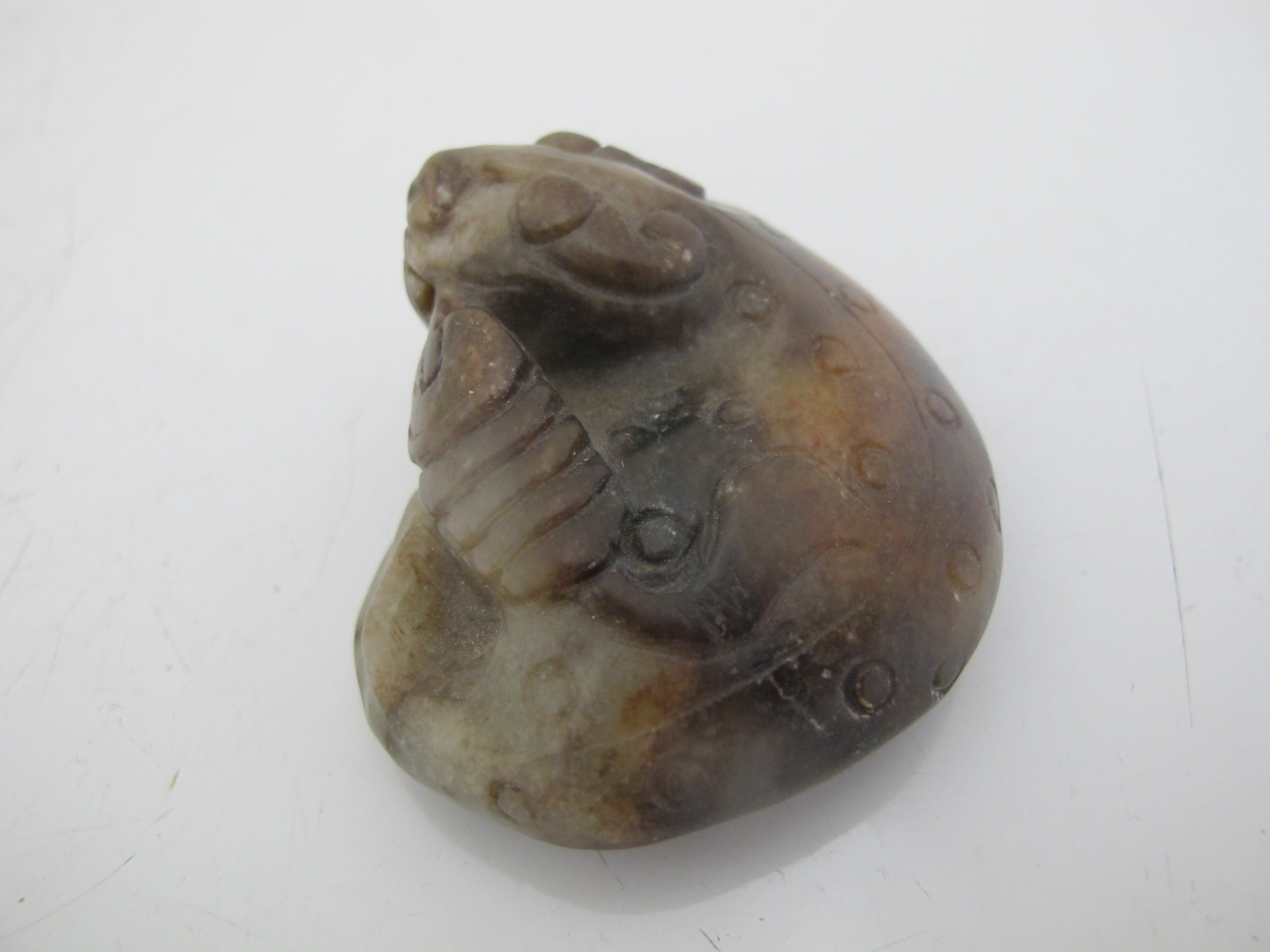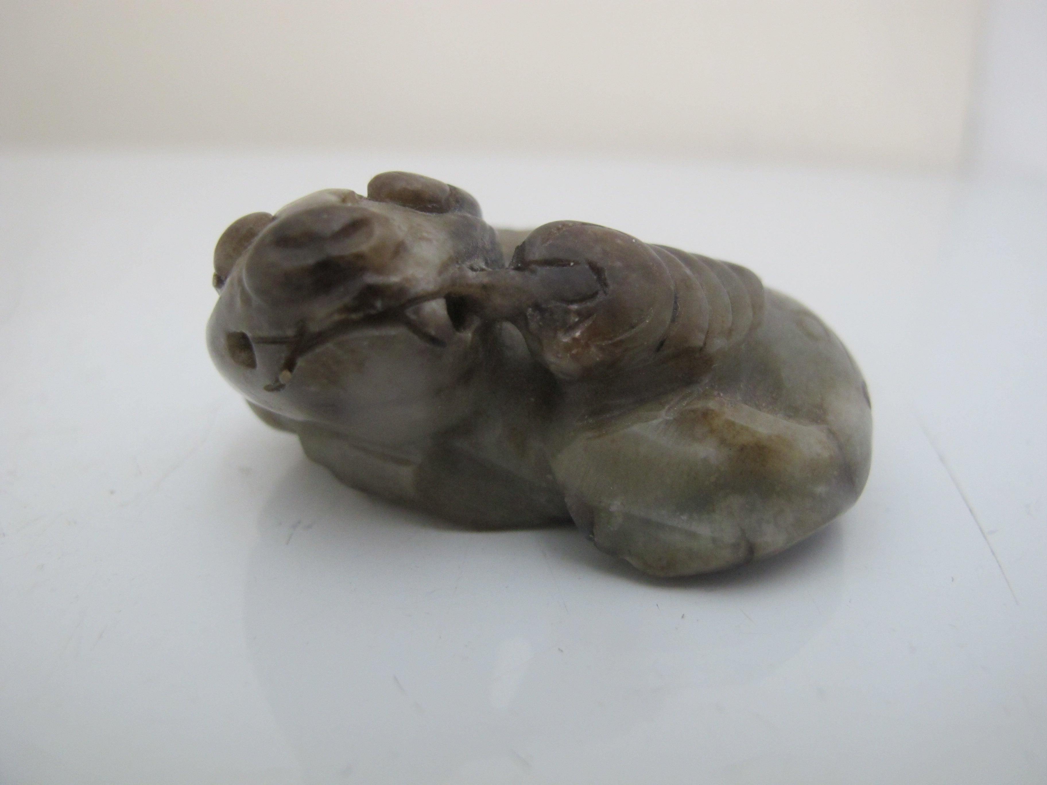 Small Chinese carved hardstone figurine or pendant. Curled up beast with tail and legs. Has small holes at each side of mouth so could be worn as pendant. Measures 2" x 2" x 3/4" tall. Excellent condition.