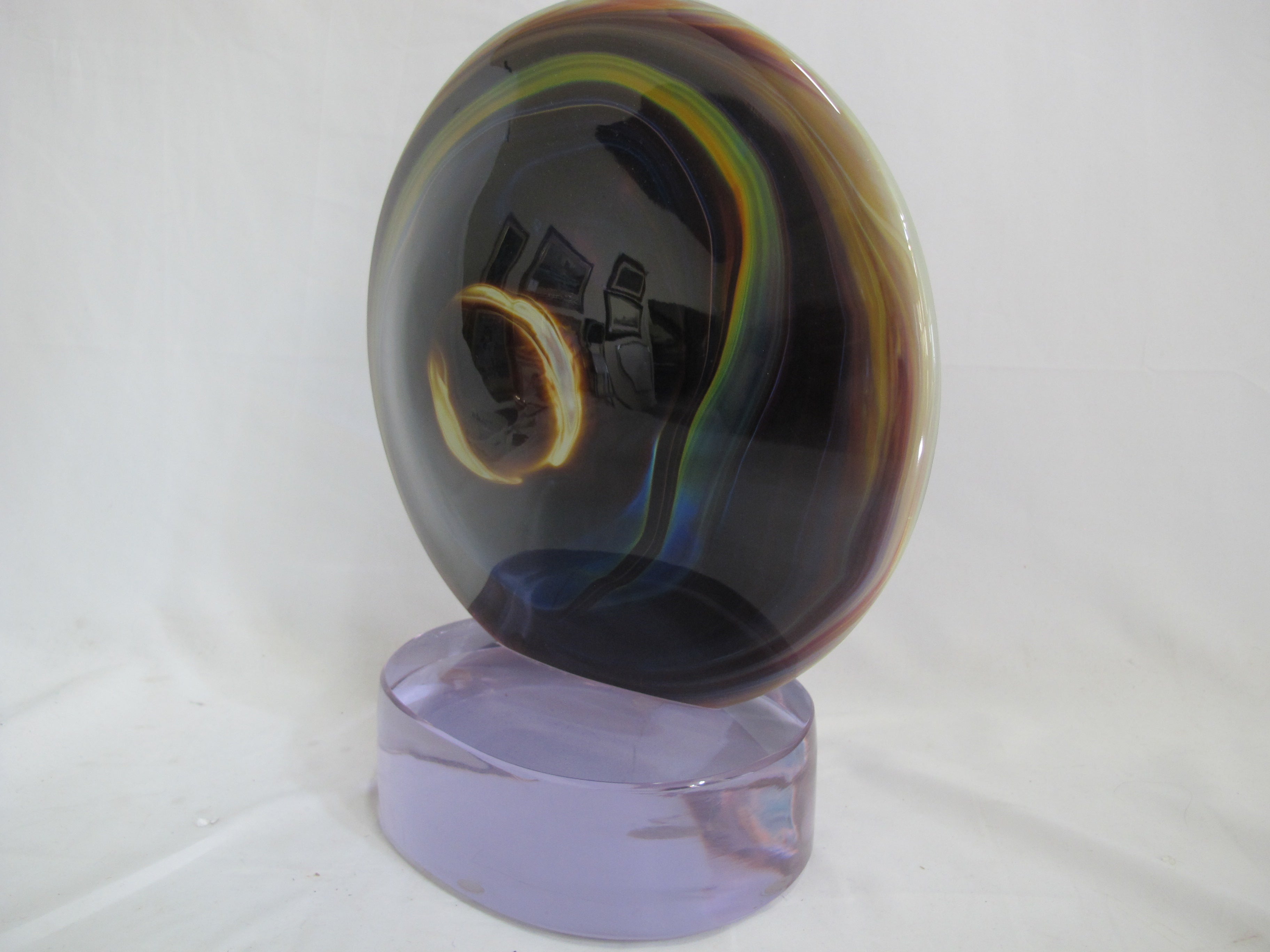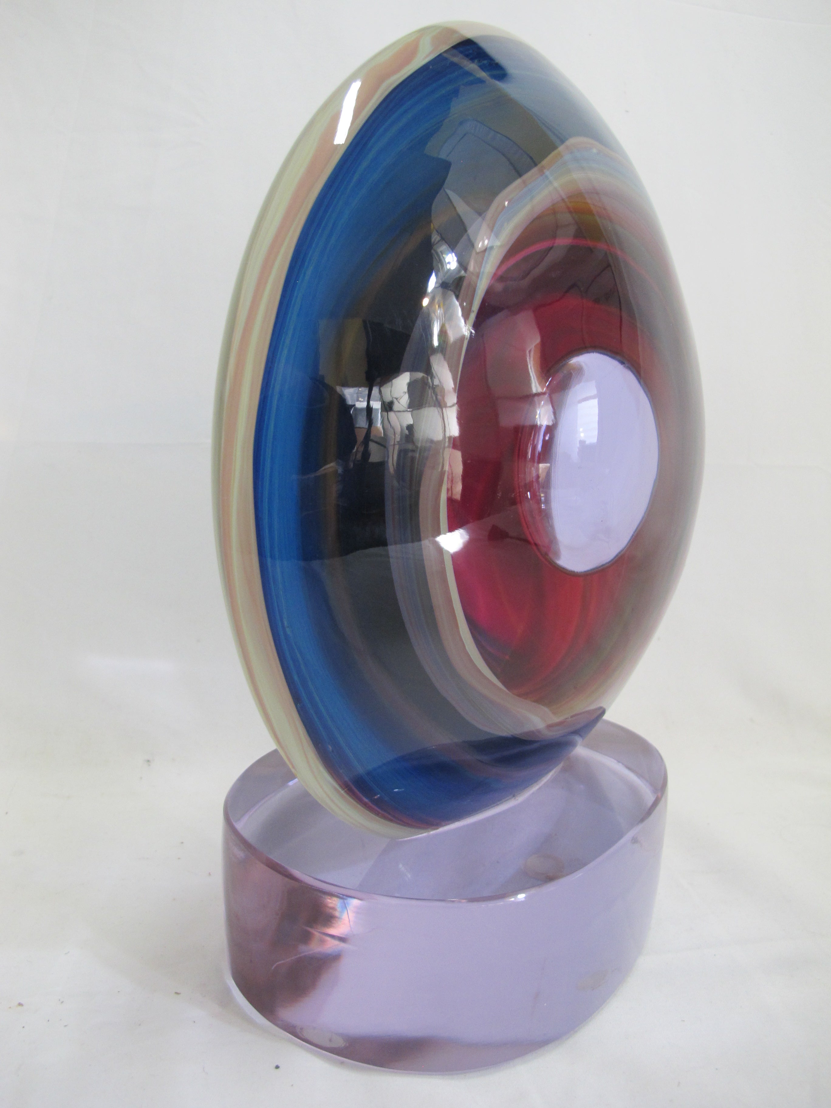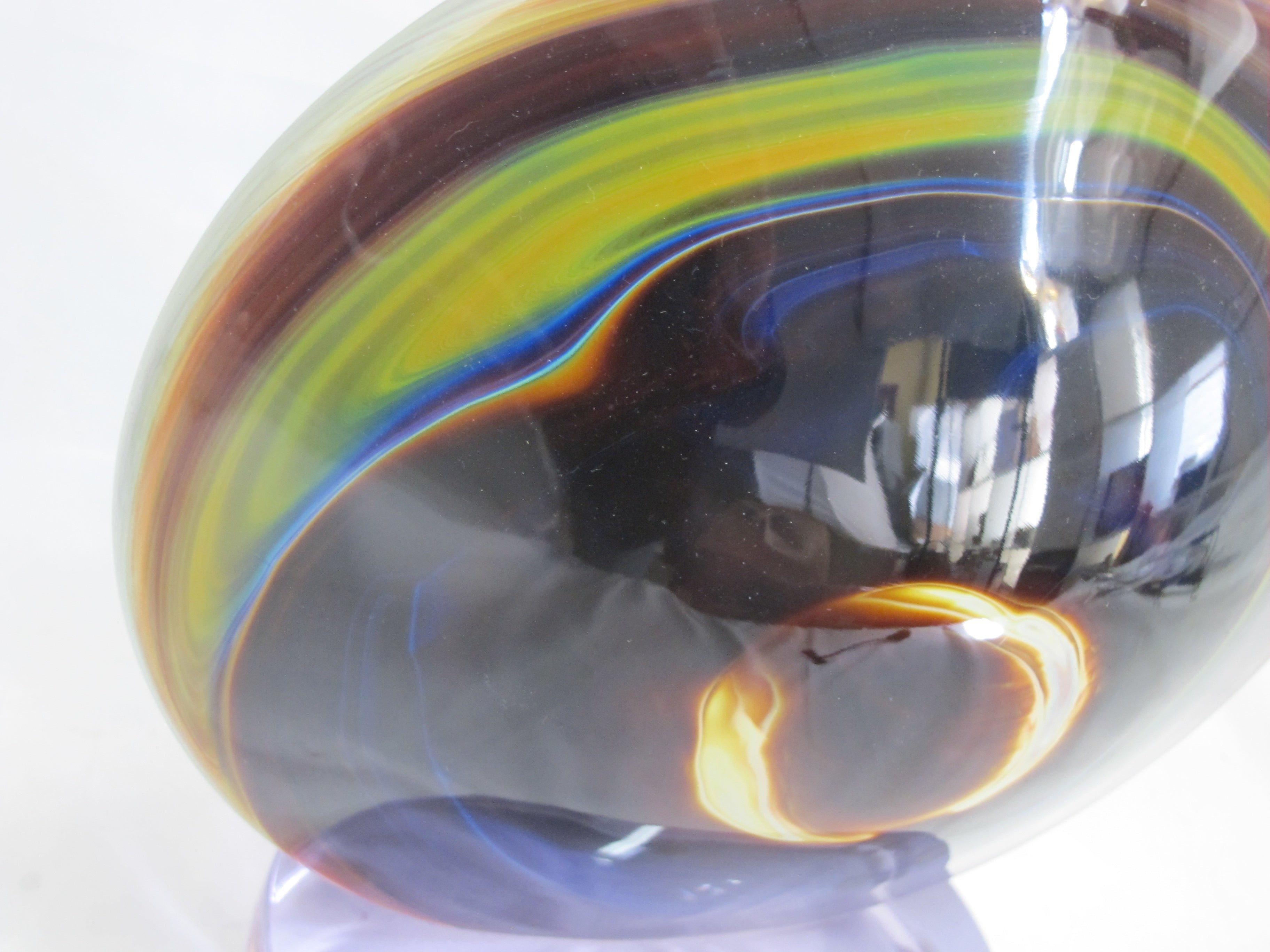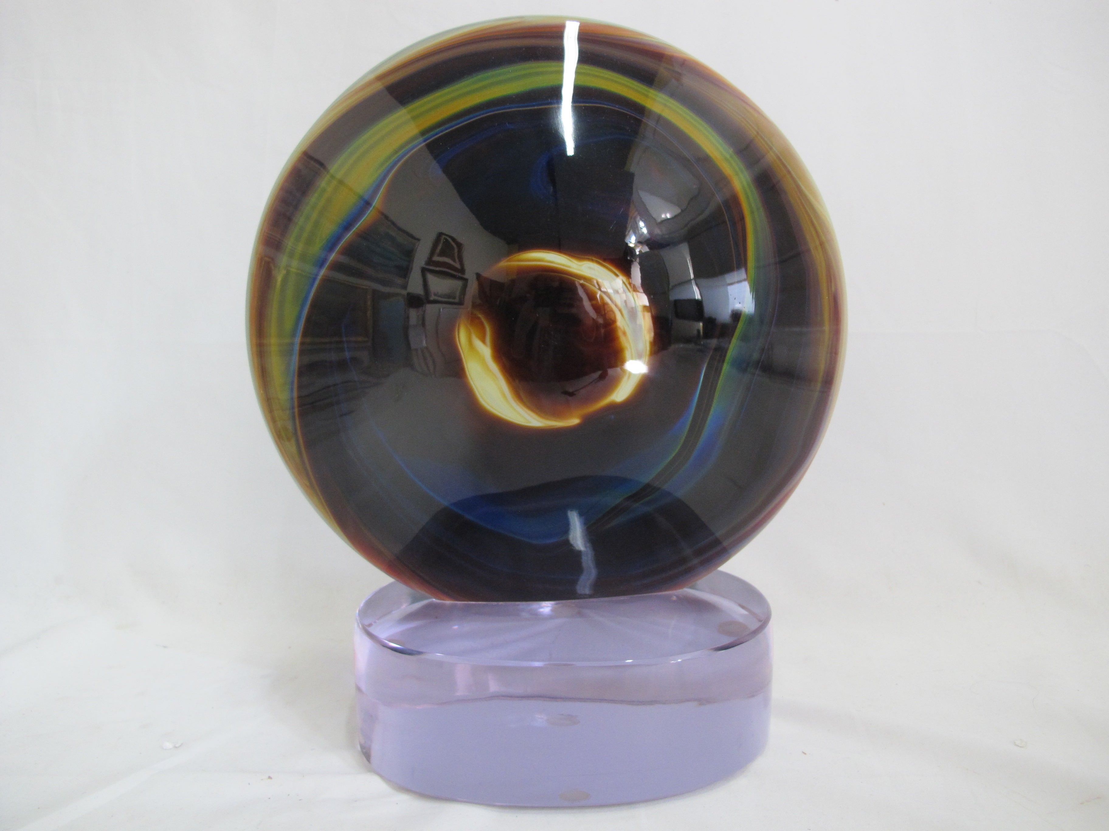Vibrant Hand-Blown Glass with spectacular color, intricate detail, and captivating creativity. The sculpture's colors move from cadmium yellow, to vivid and electrifying blues, to rich purples, a color combination that will certainly bring energy and light to any room. Within the outer glass orb shape, gorgeous veins of colorful molten glass flow throughout, that shows Rosin's true mastery of the Murano and Calcedonia mediums. The technique used to make this first class sculpture is incredibly difficult to perform and is executed precisely by very few artists.