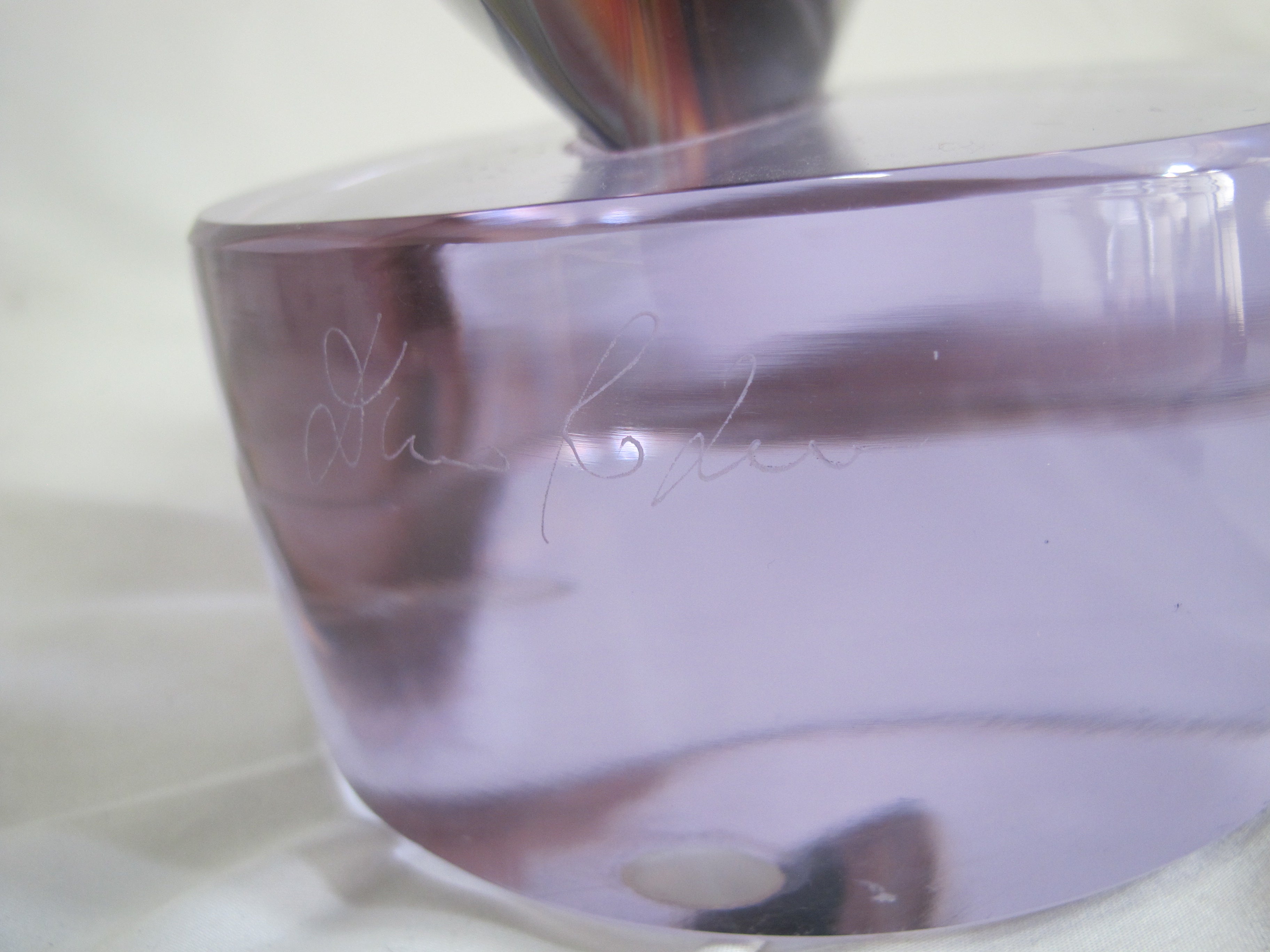 In 1988, Dino Rosin was invited to Pilchuck Glass School in the state of Washington to teach solid freehand glass sculpture with Loredano and the American glass artist, William Morris. Then in 1992, Loredano met an untimely death in a boating accident. Dino assumed the role of "maestro" and began single-handedly to produce his brother's old designs and ultimately his own., His skillful use of "calcedonia" glass is unique and makes his pieces recognizable and highly collectible.