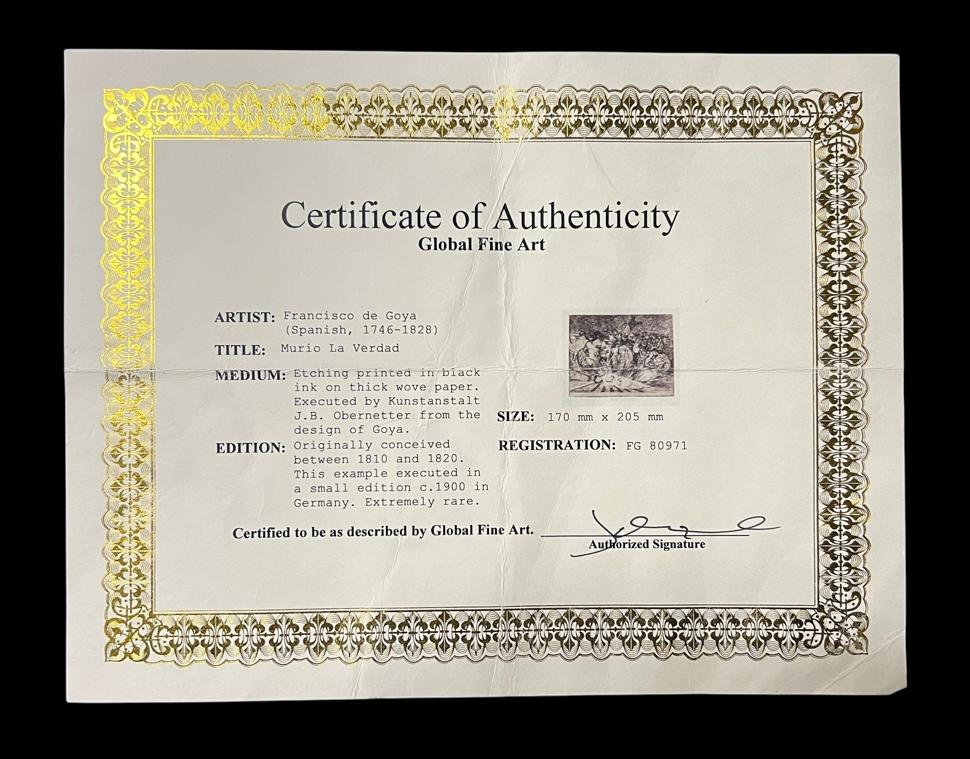 Francisco de Goya "Murio La Verdad" 1810s Etching w/ Certificate of Authenticity