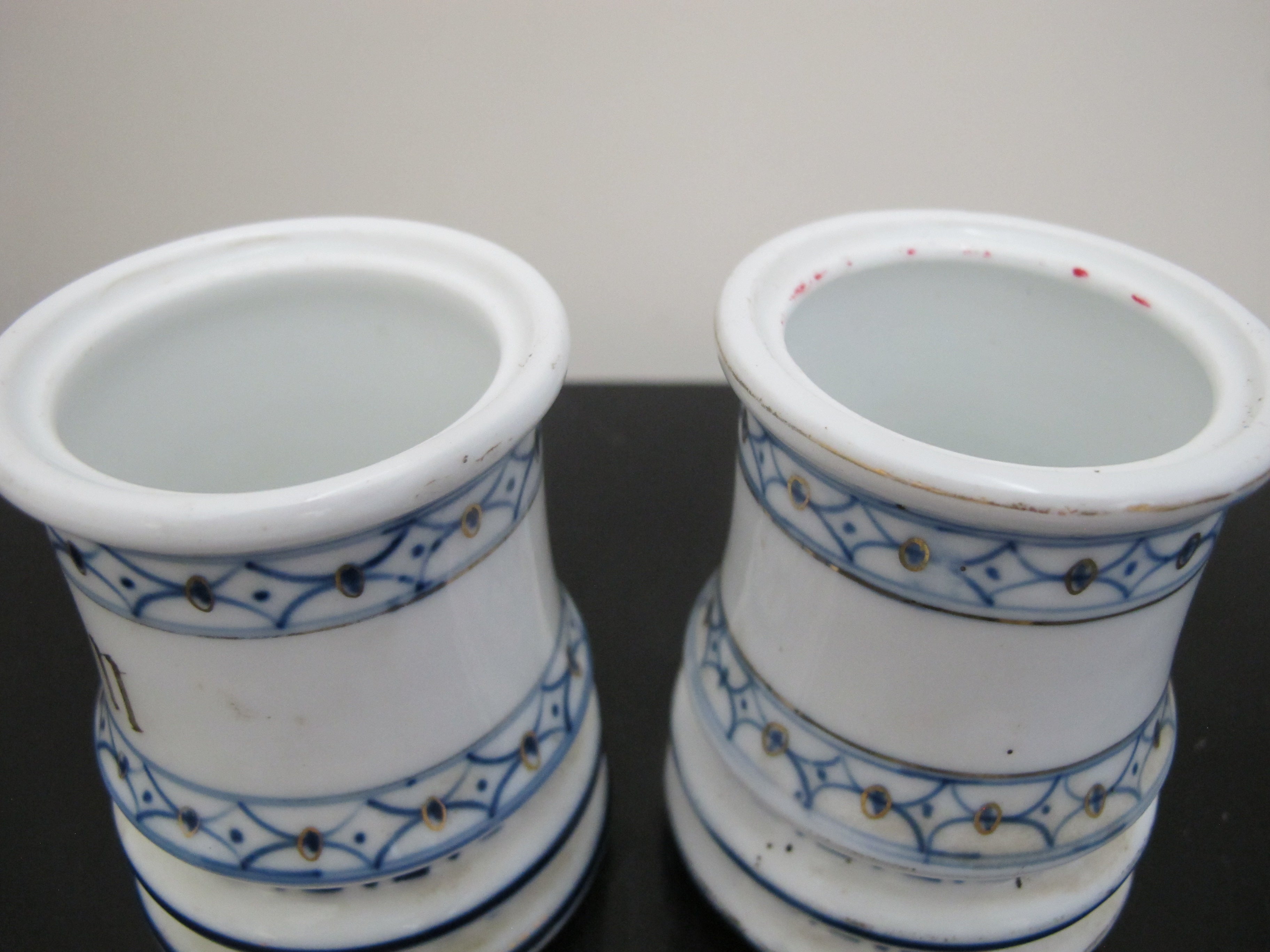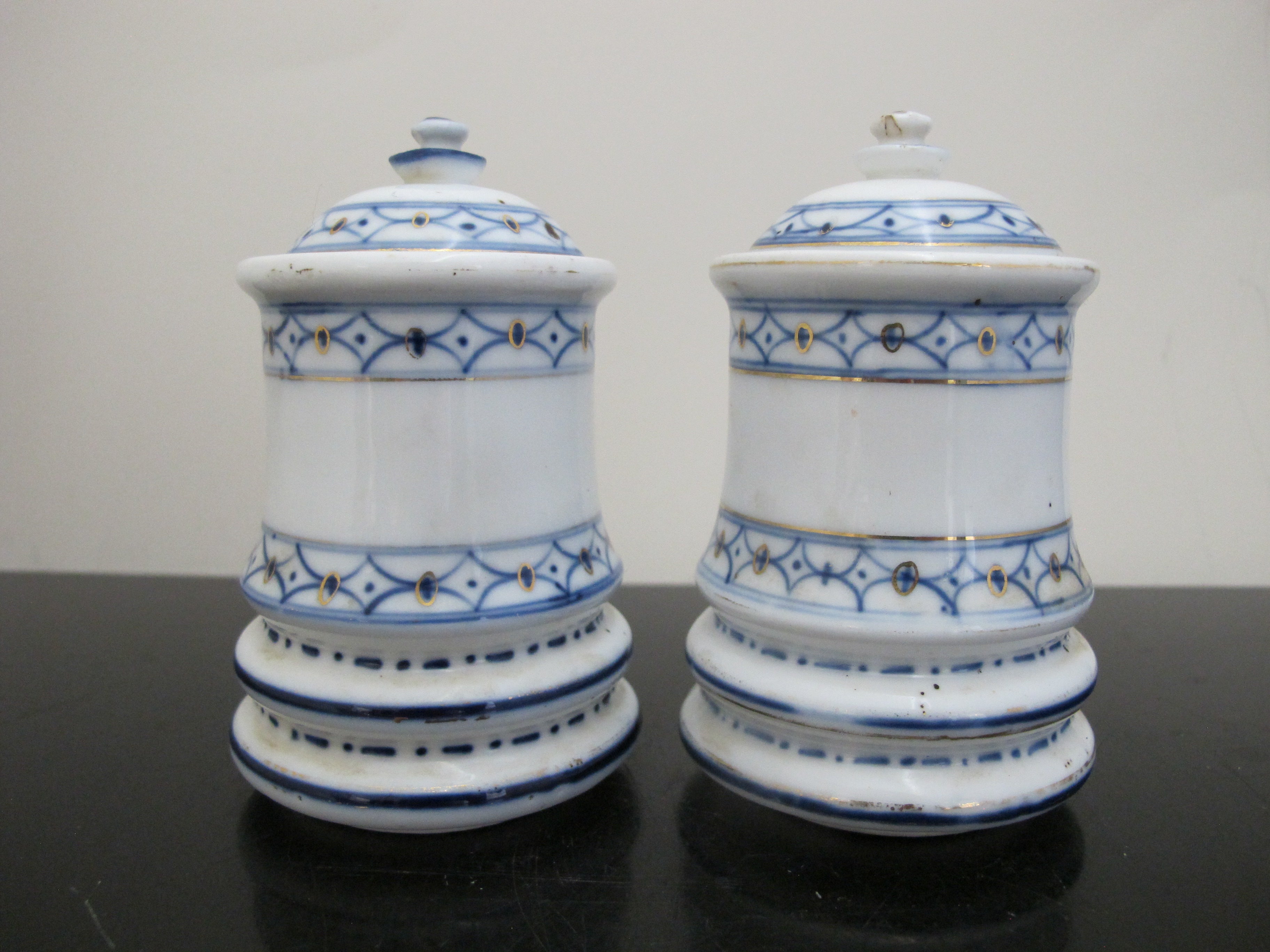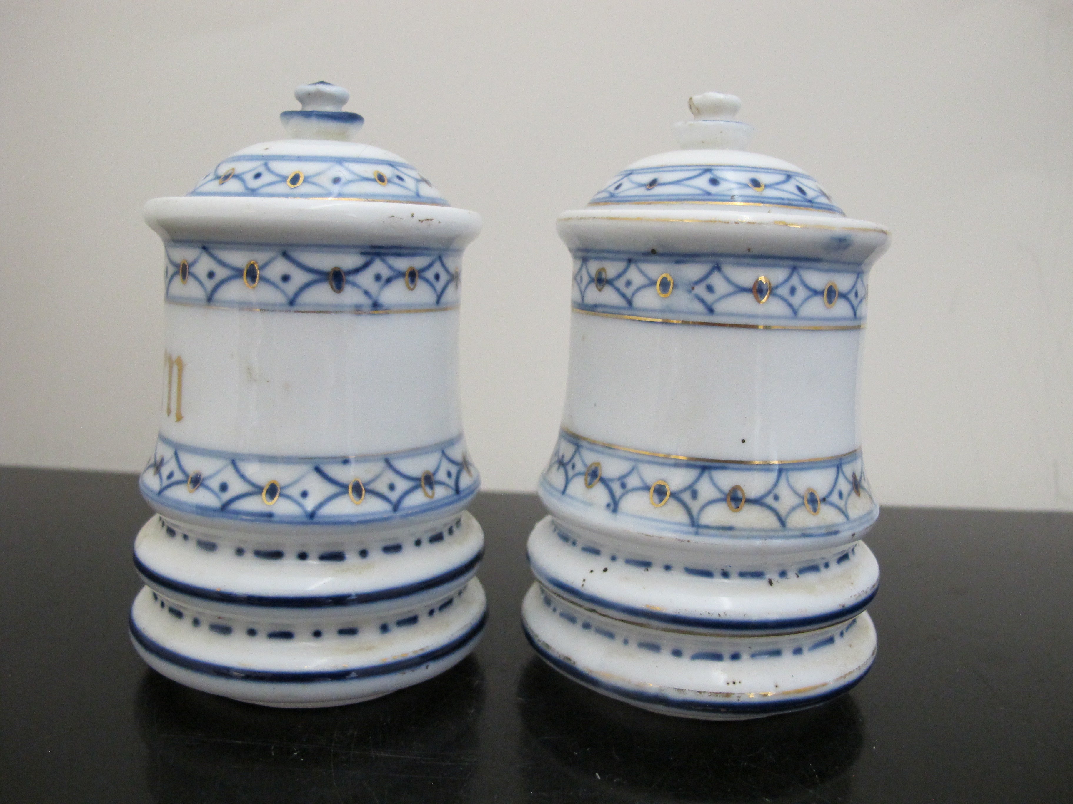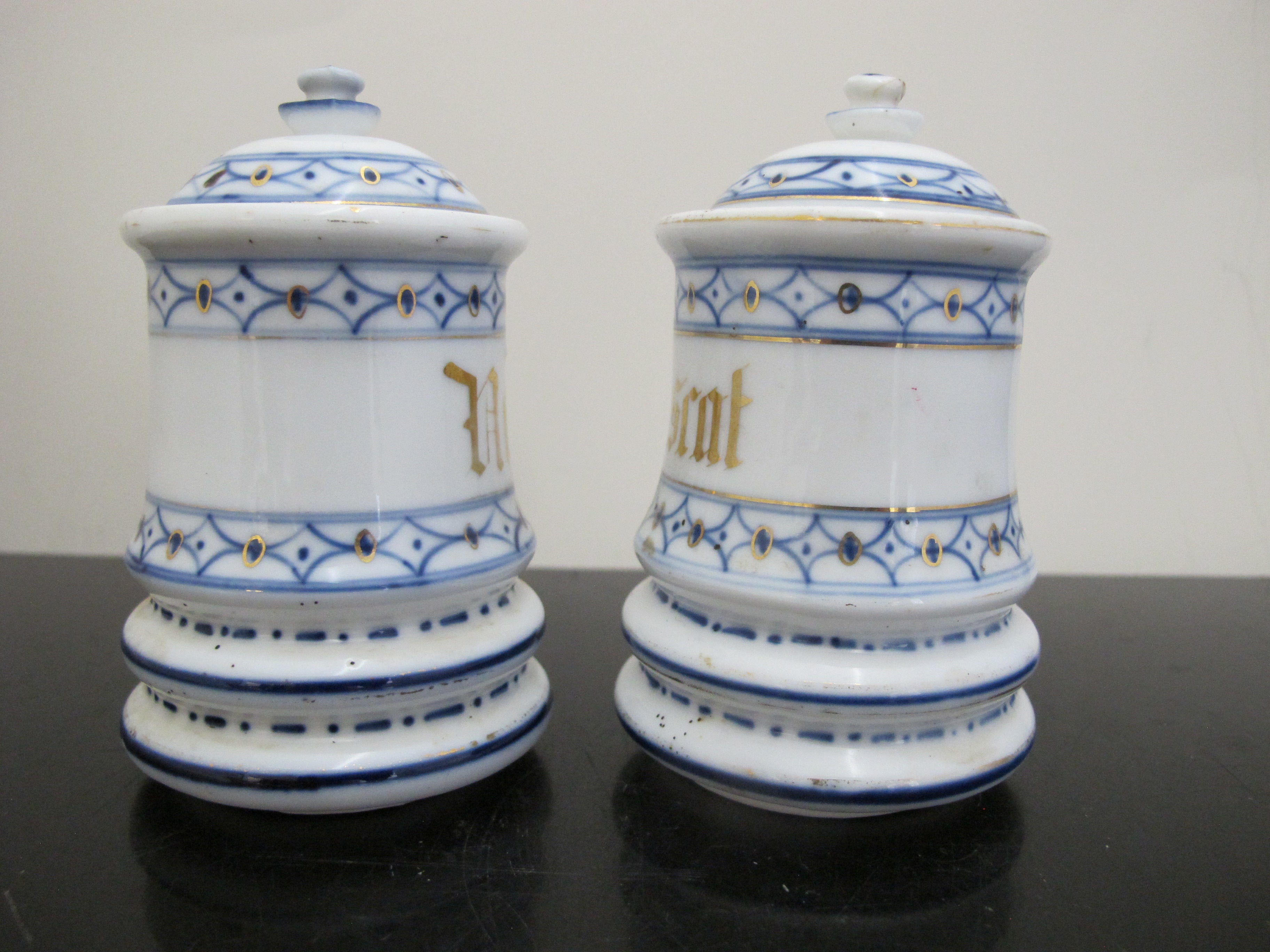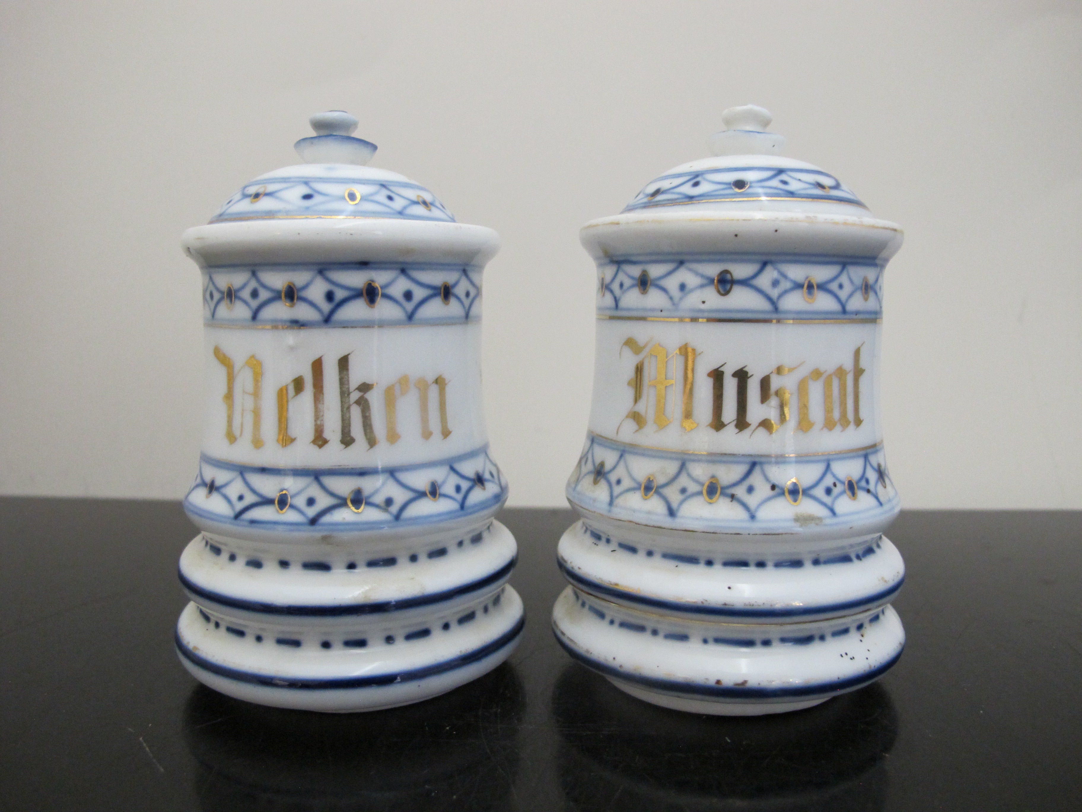Pair of German 19th century jars with lids. Each in white porcelain with blue and gilt design and gilt lettering at front. I believe Nelkin is cloves, but I am unsure of the other. Both are in excellent condition, no chips, cracks, or repairs. Minor loss of paint and light wear. Measure approximately 4 1/4" tall x 2 1/2".
