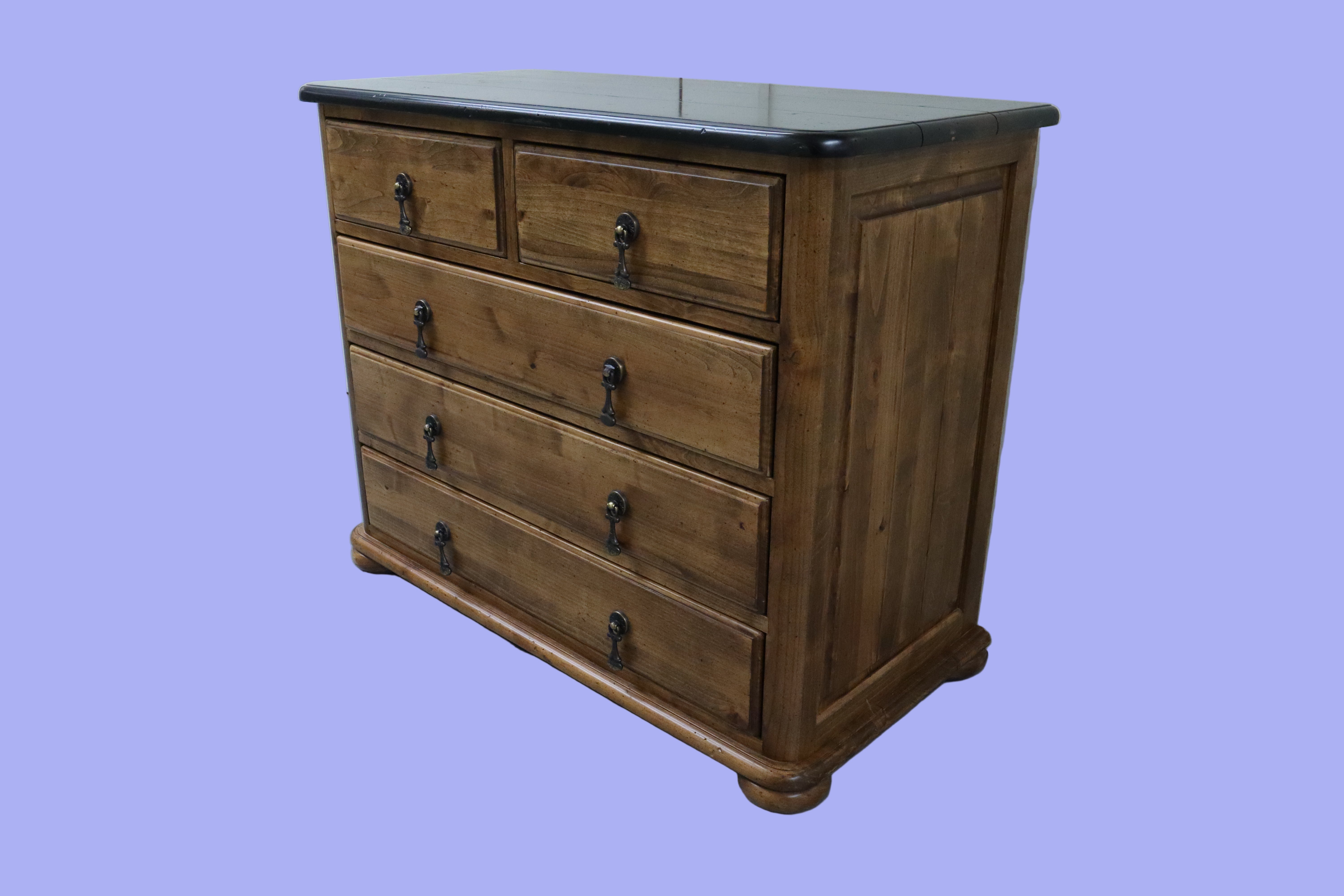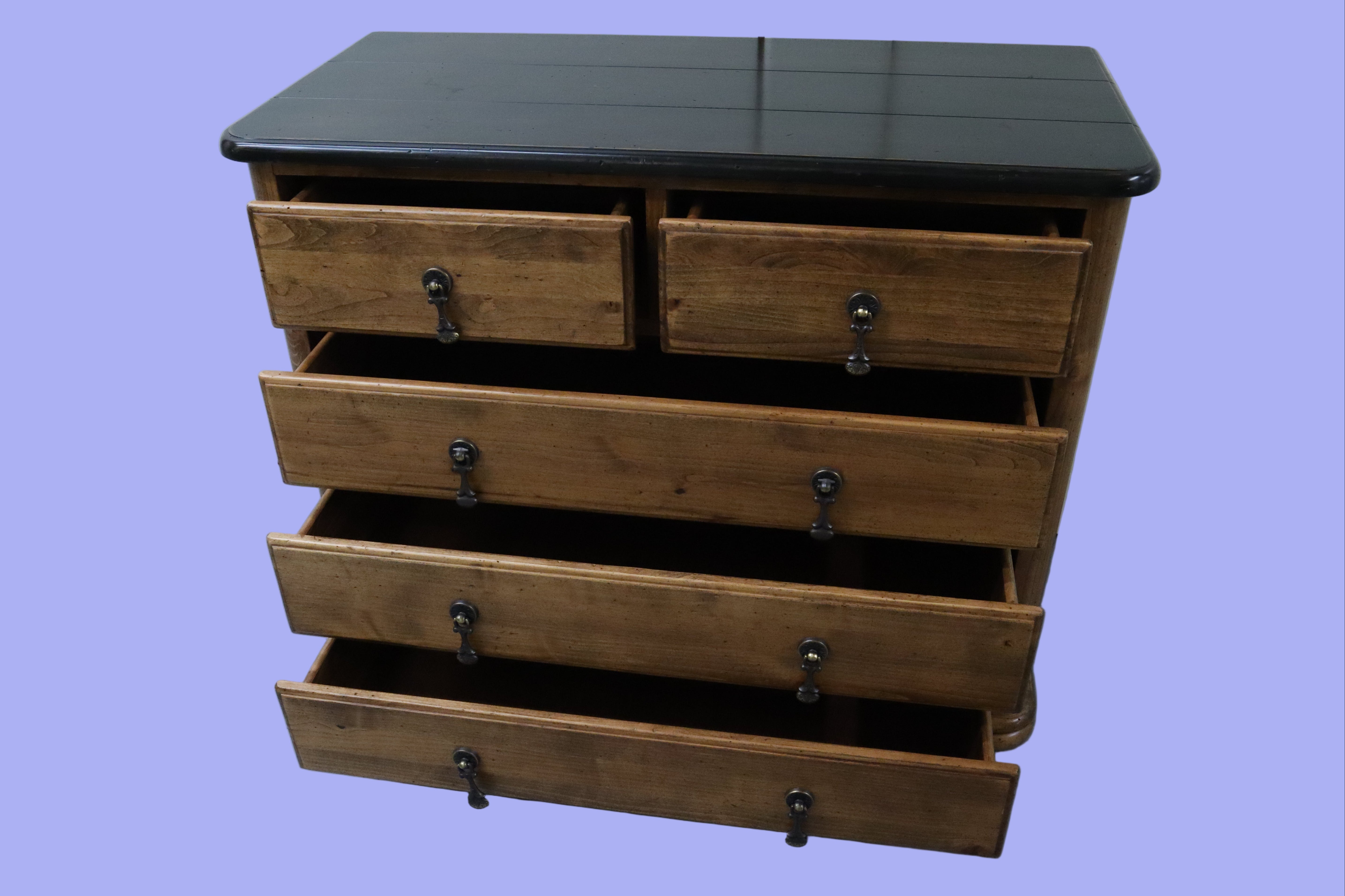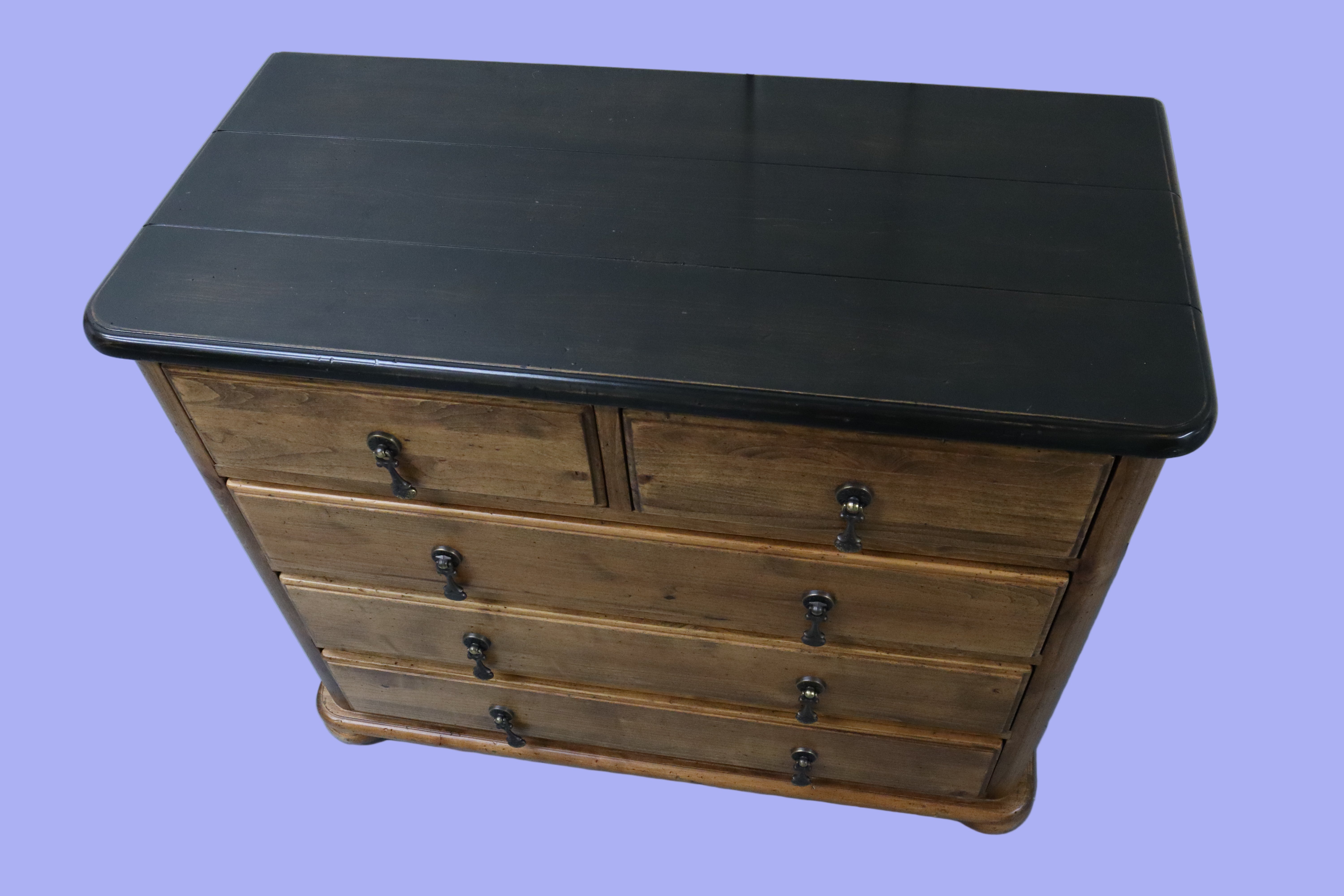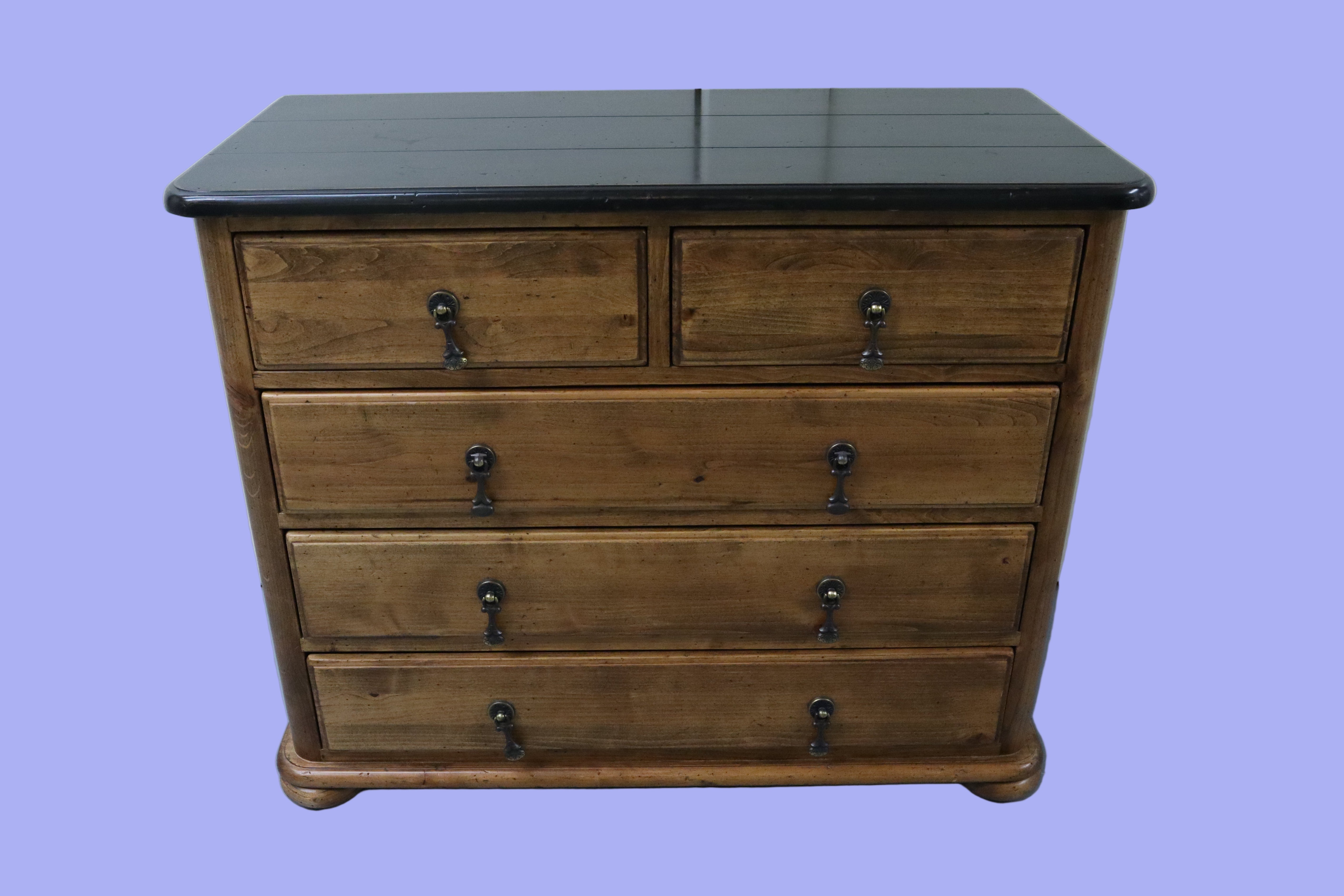 Gorgeous reproduction of a German style chest of drawers. Constructed using maple wood with a dark brown stain, the top face is painted black. top drawers are two evenly sized drawers, with three equally sized full length drawers below. Drawers handles are the same style as many antique German handles.