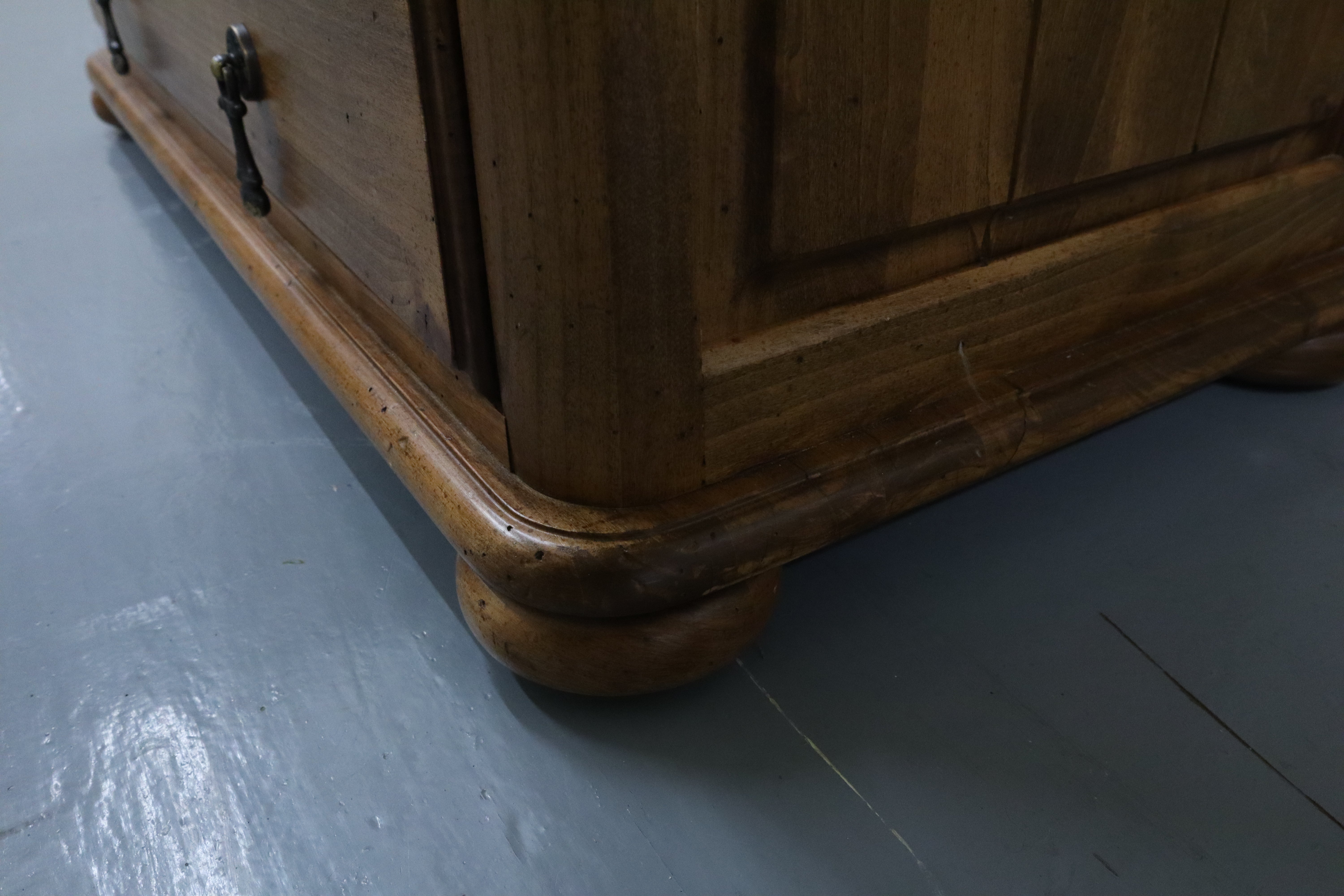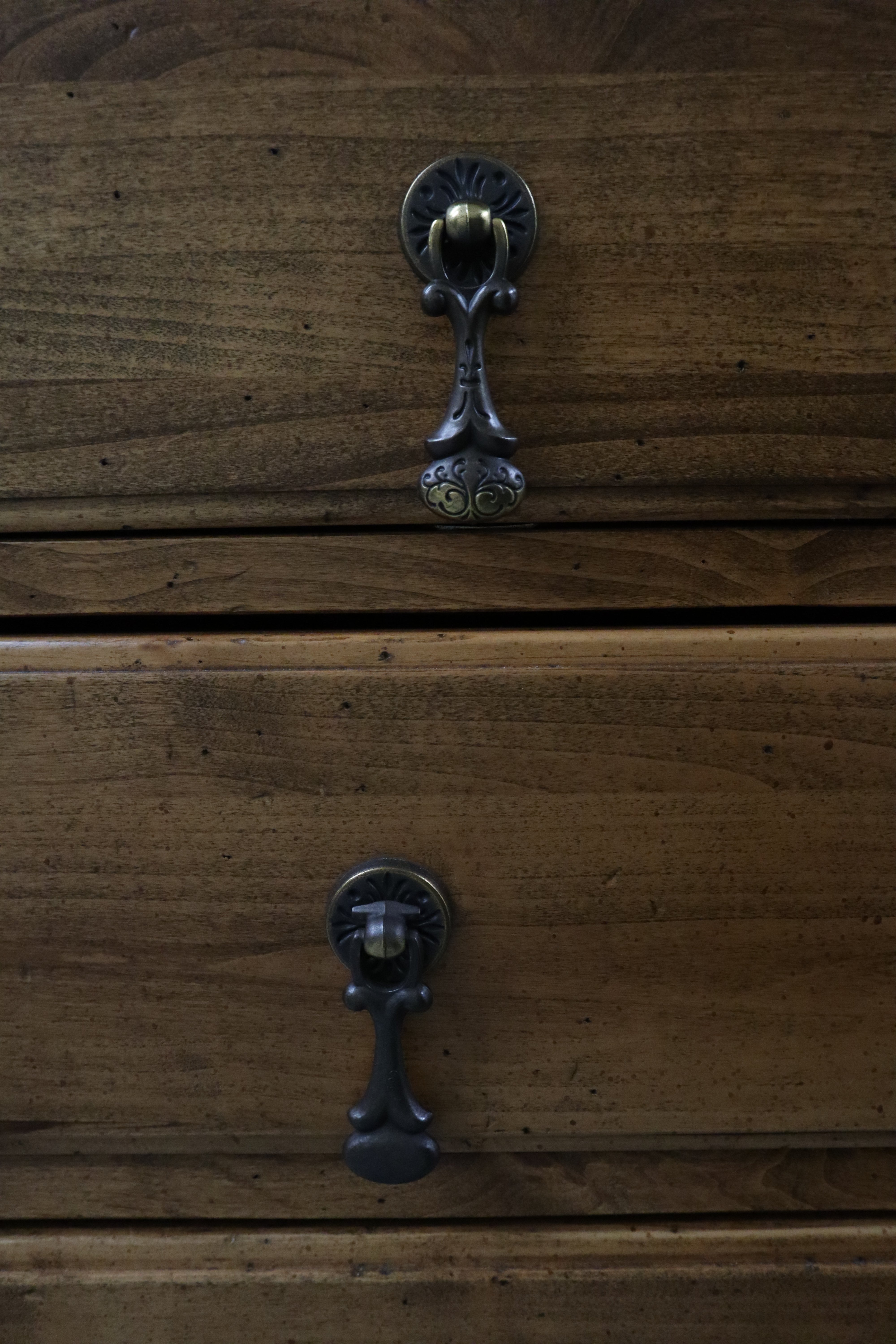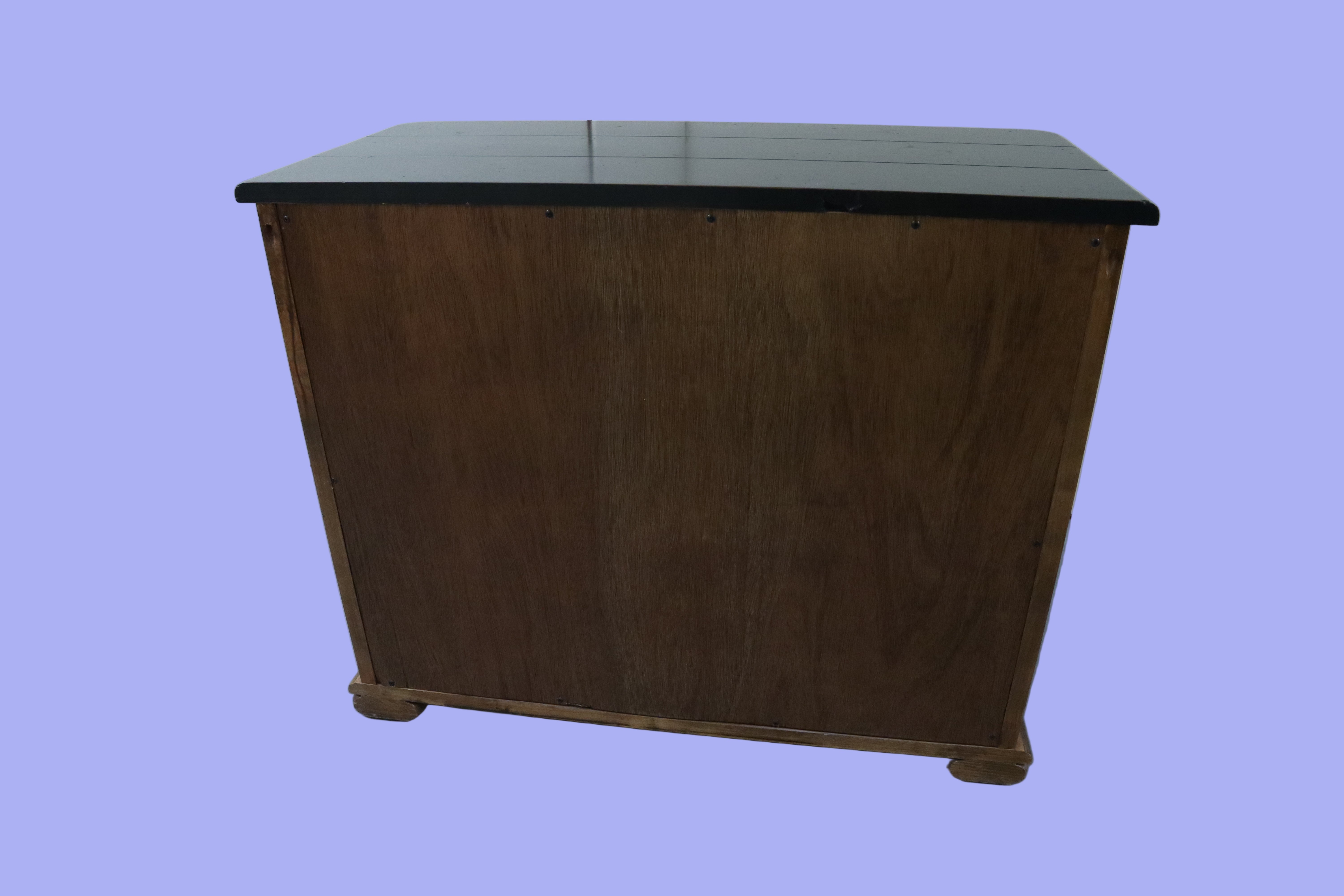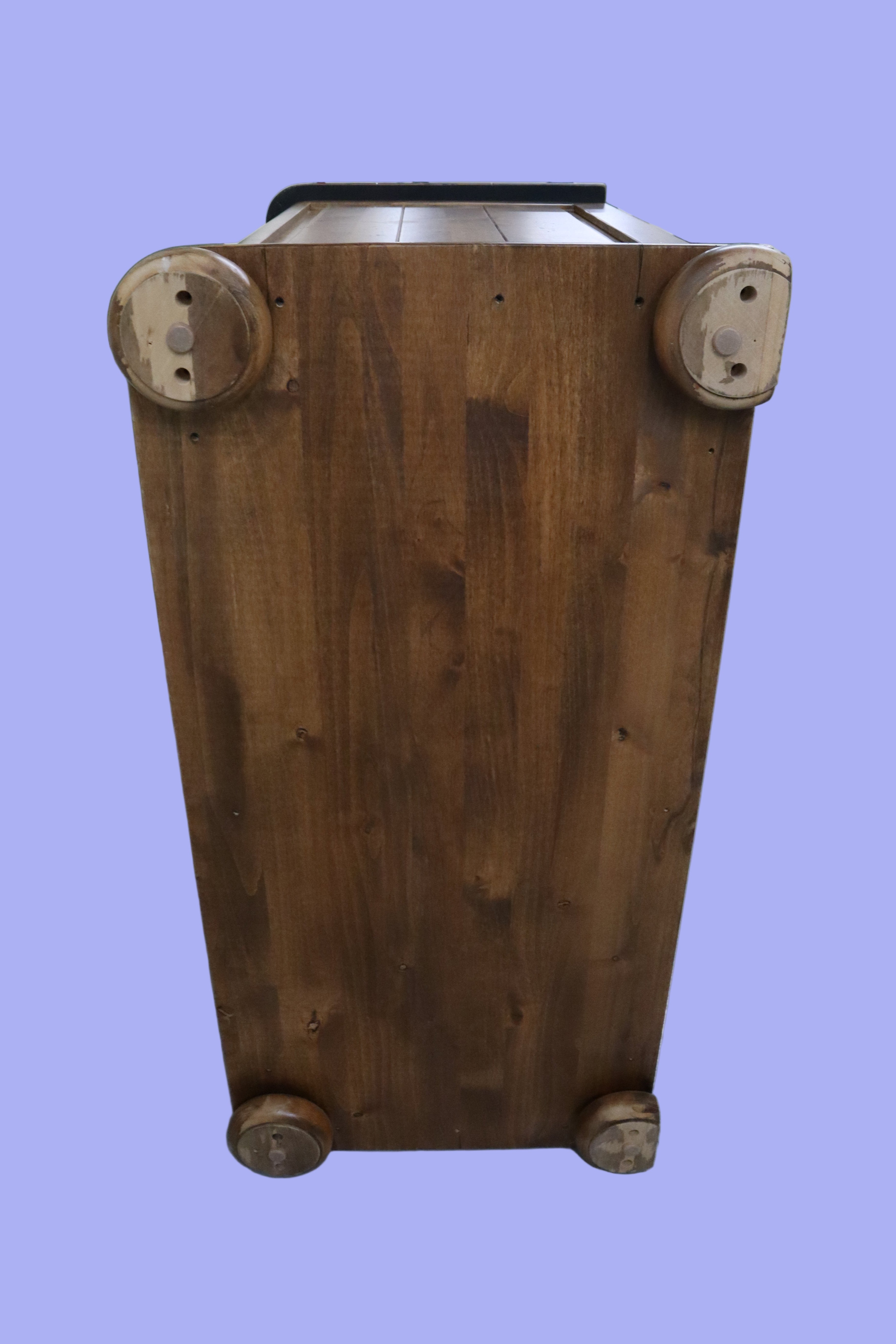 Gorgeous reproduction of a German style chest of drawers. Constructed using maple wood with a dark brown stain, the top face is painted black. top drawers are two evenly sized drawers, with three equally sized full length drawers below. Drawers handles are the same style as many antique German handles.