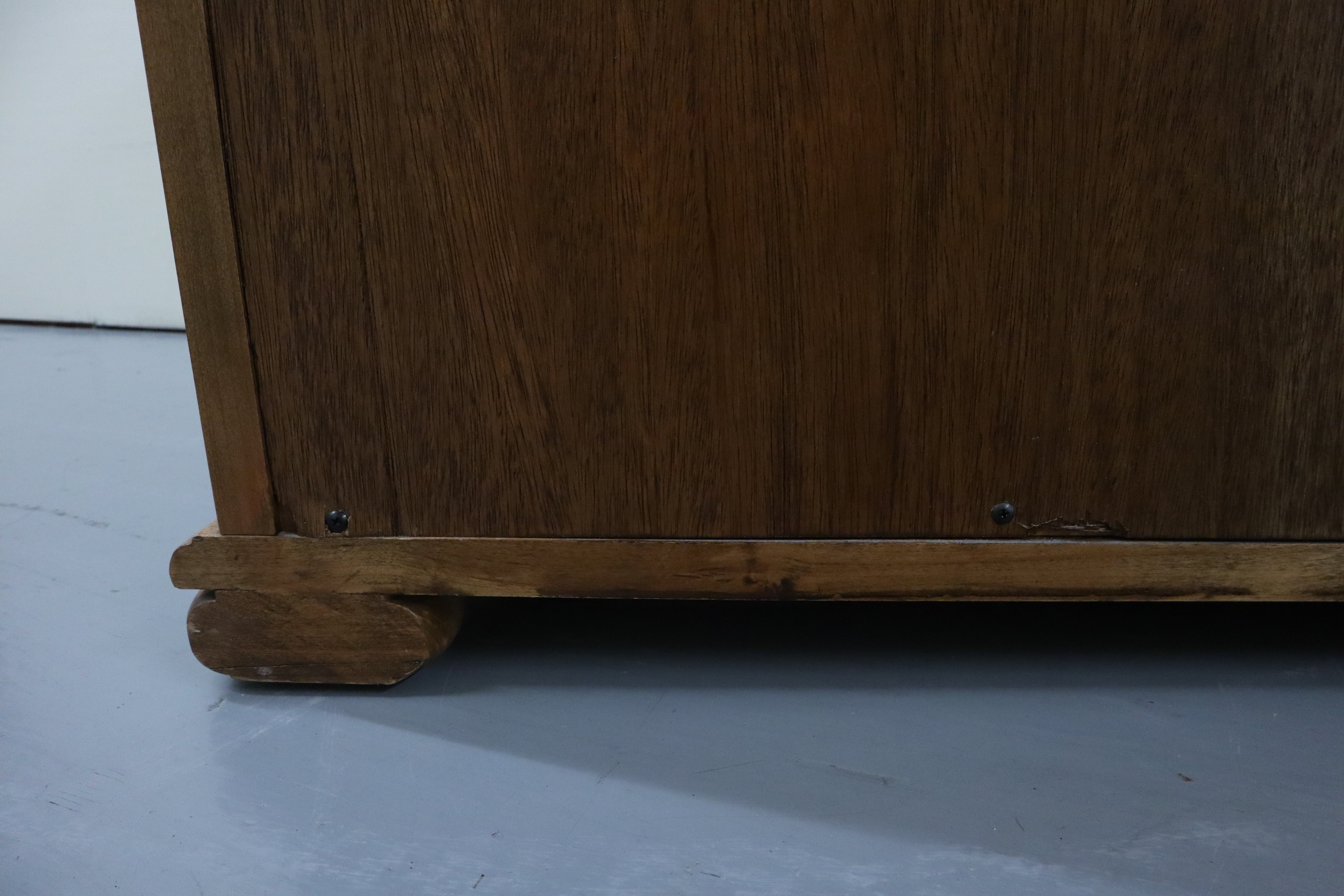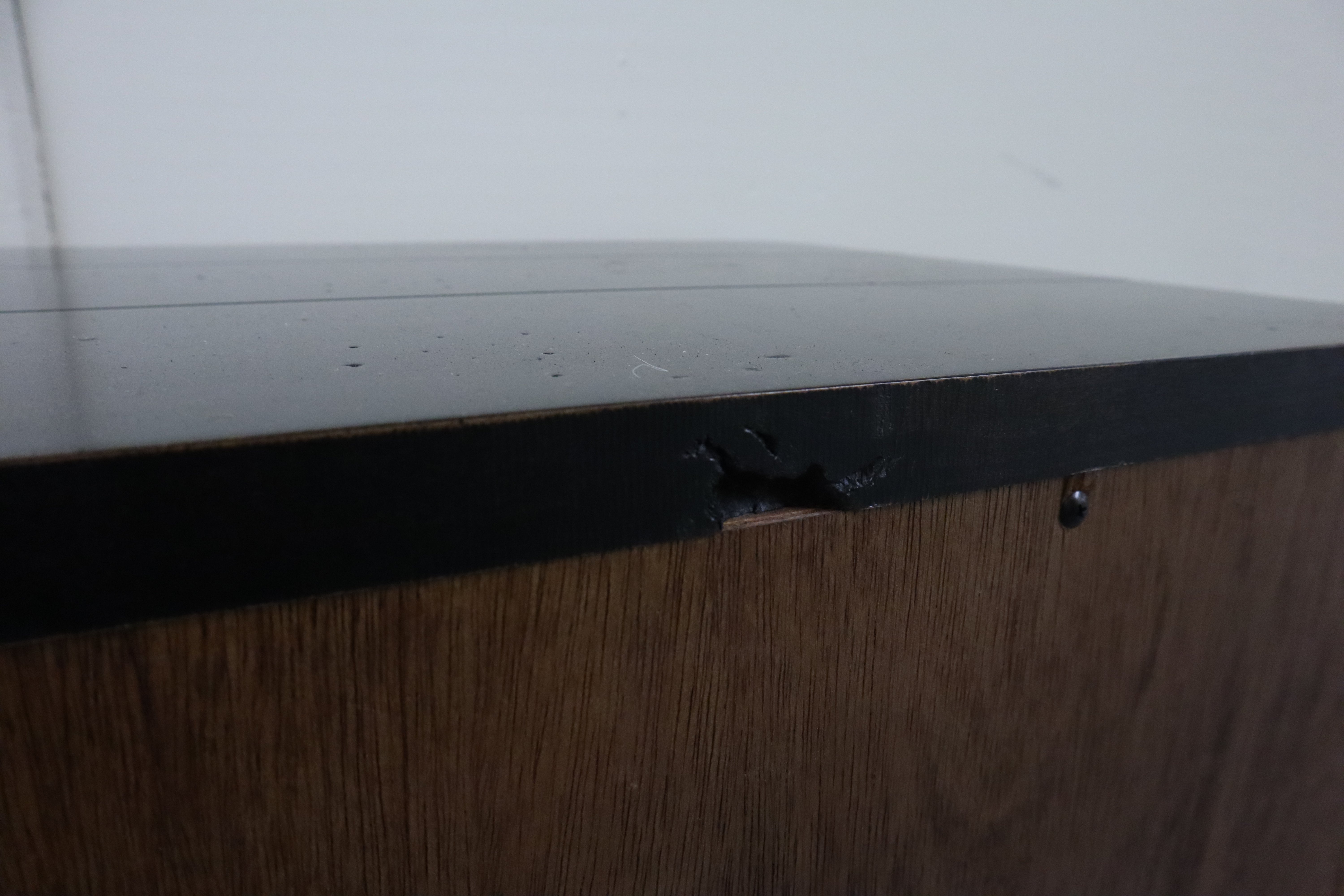 Great condition, all drawers open easily. No scratches or gouges. There is one very light water ring on the top face.