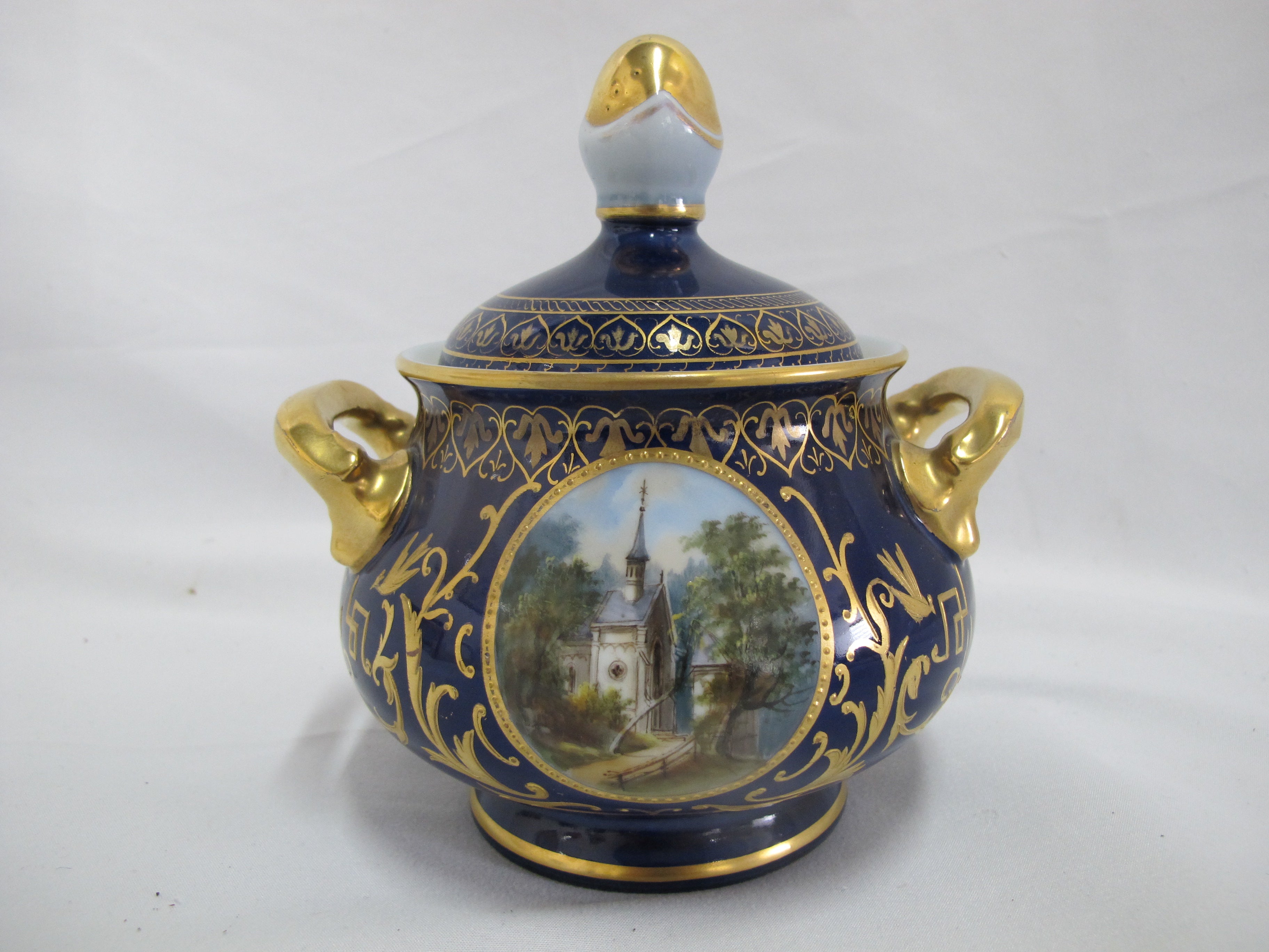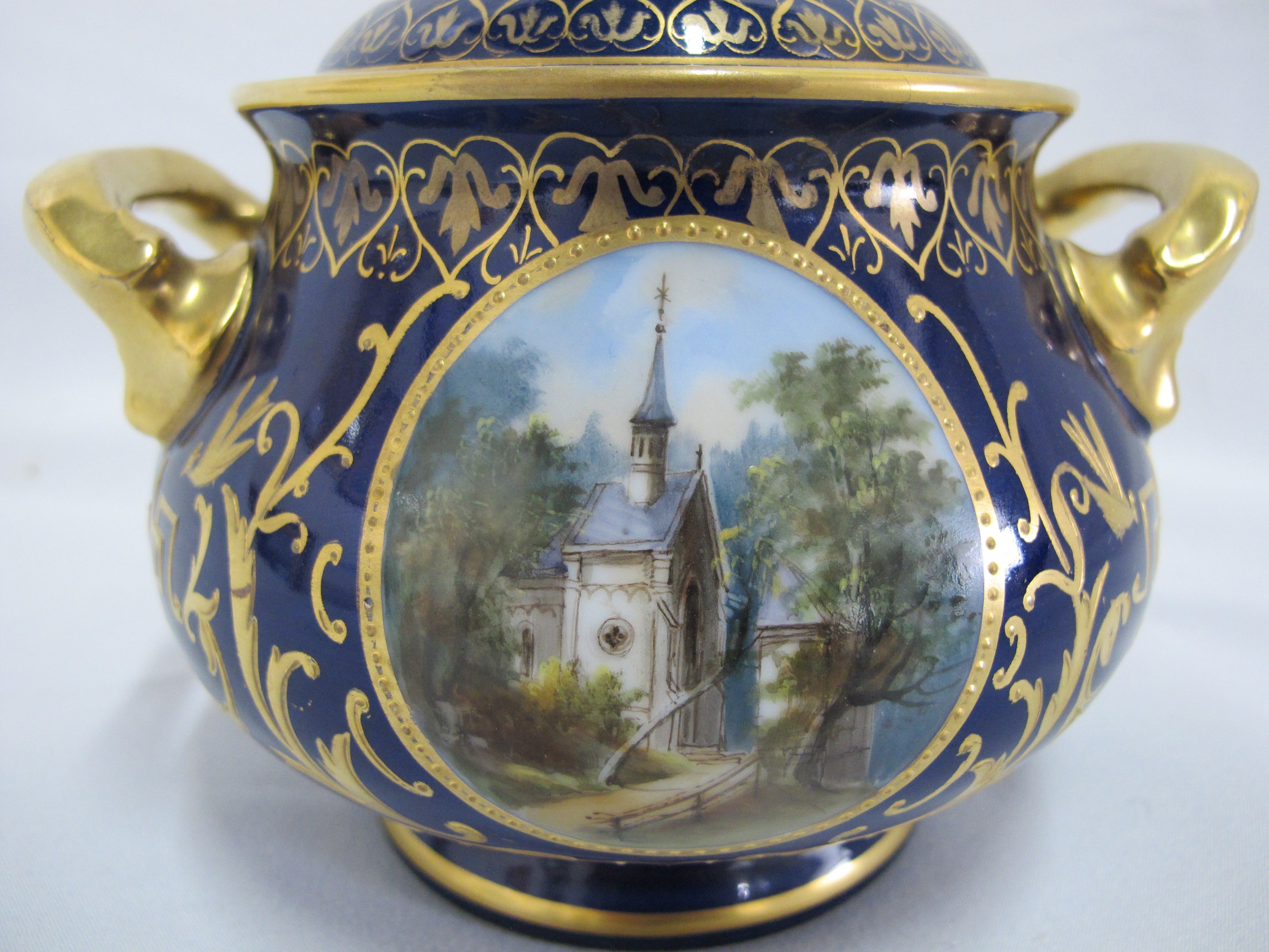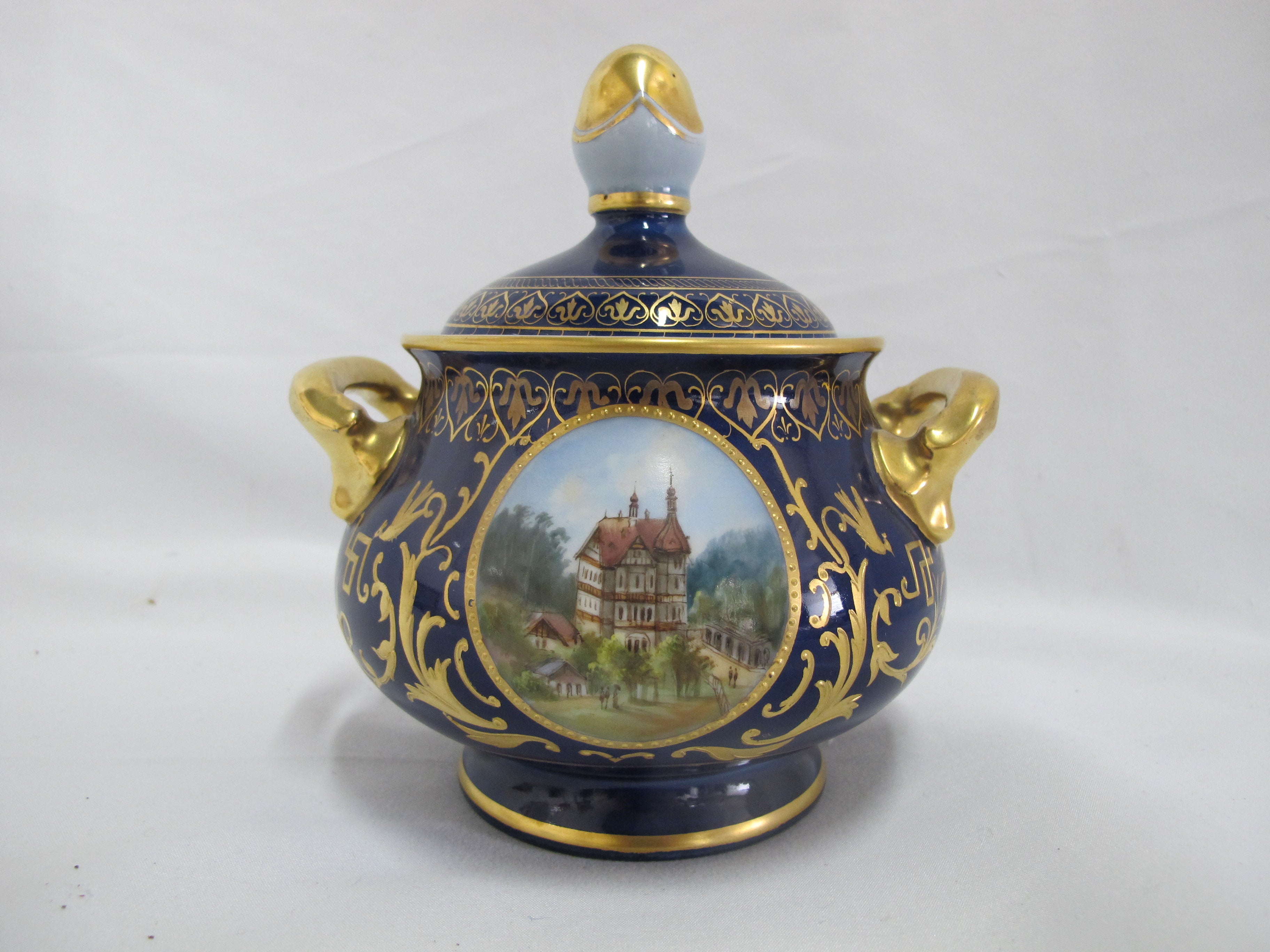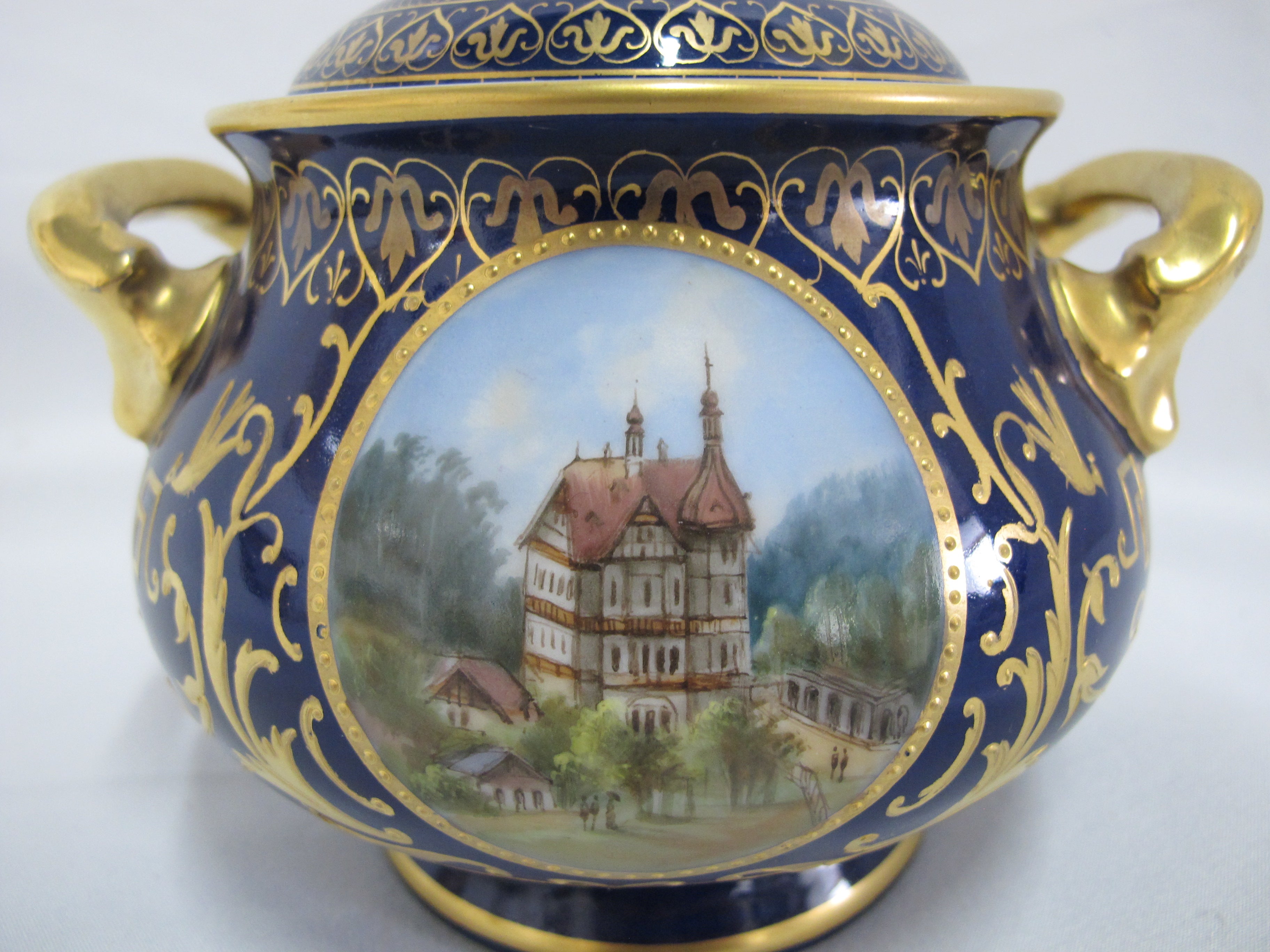 19th century, Karlsbad Hermann Voigt, Bohemia porcelain sugar bowl with lid. Cobalt blue with ornate gilt accents and finely hand painted architectural landscape showing 2 churches, Marien Kapelle and Tayer Haus (as marked on base). Absolutely stunning.